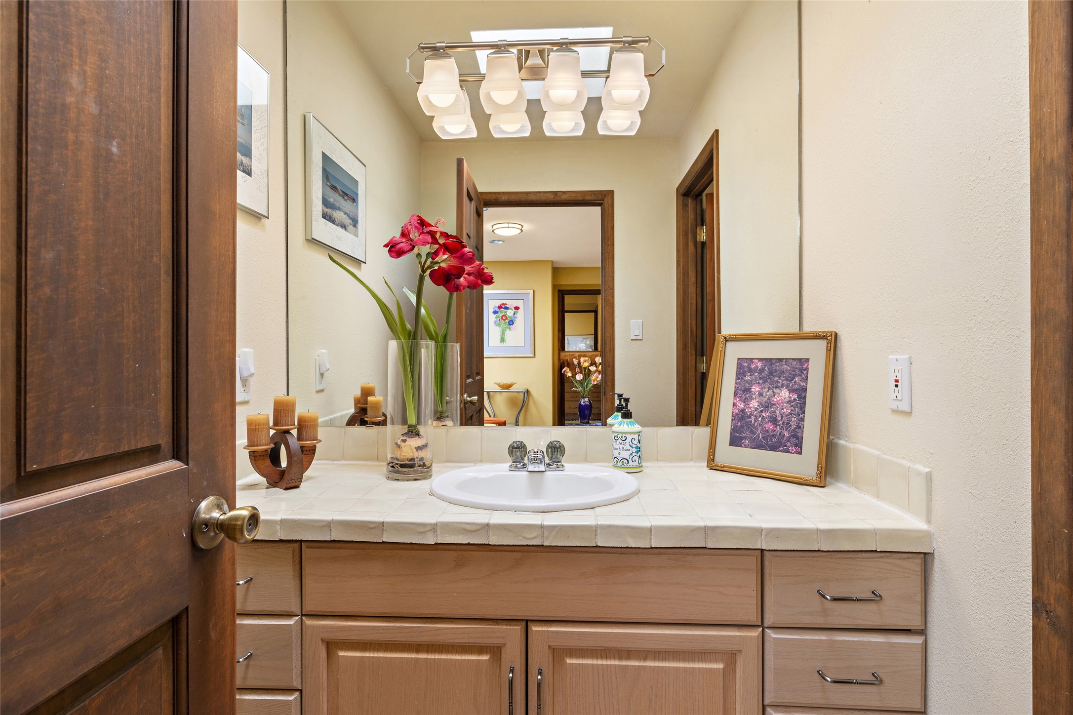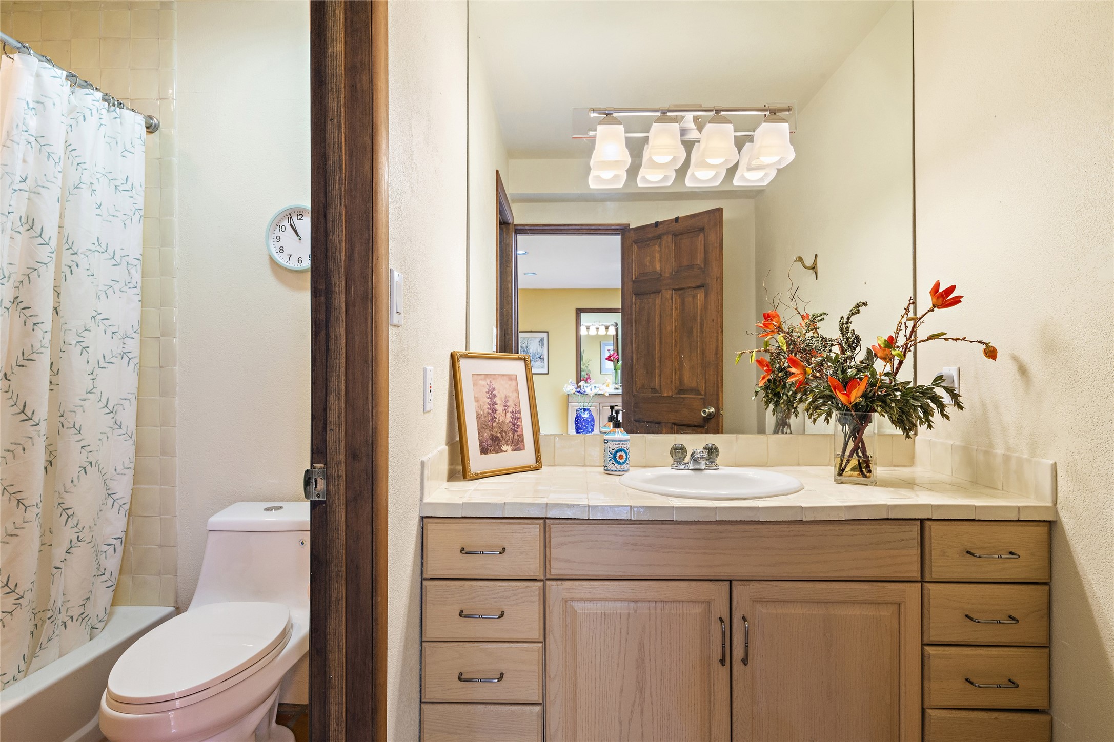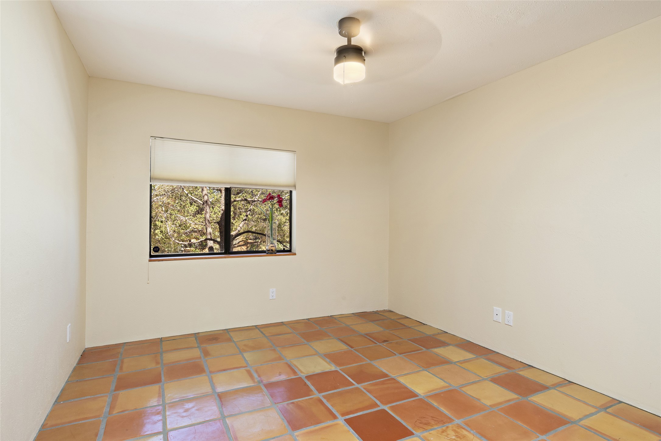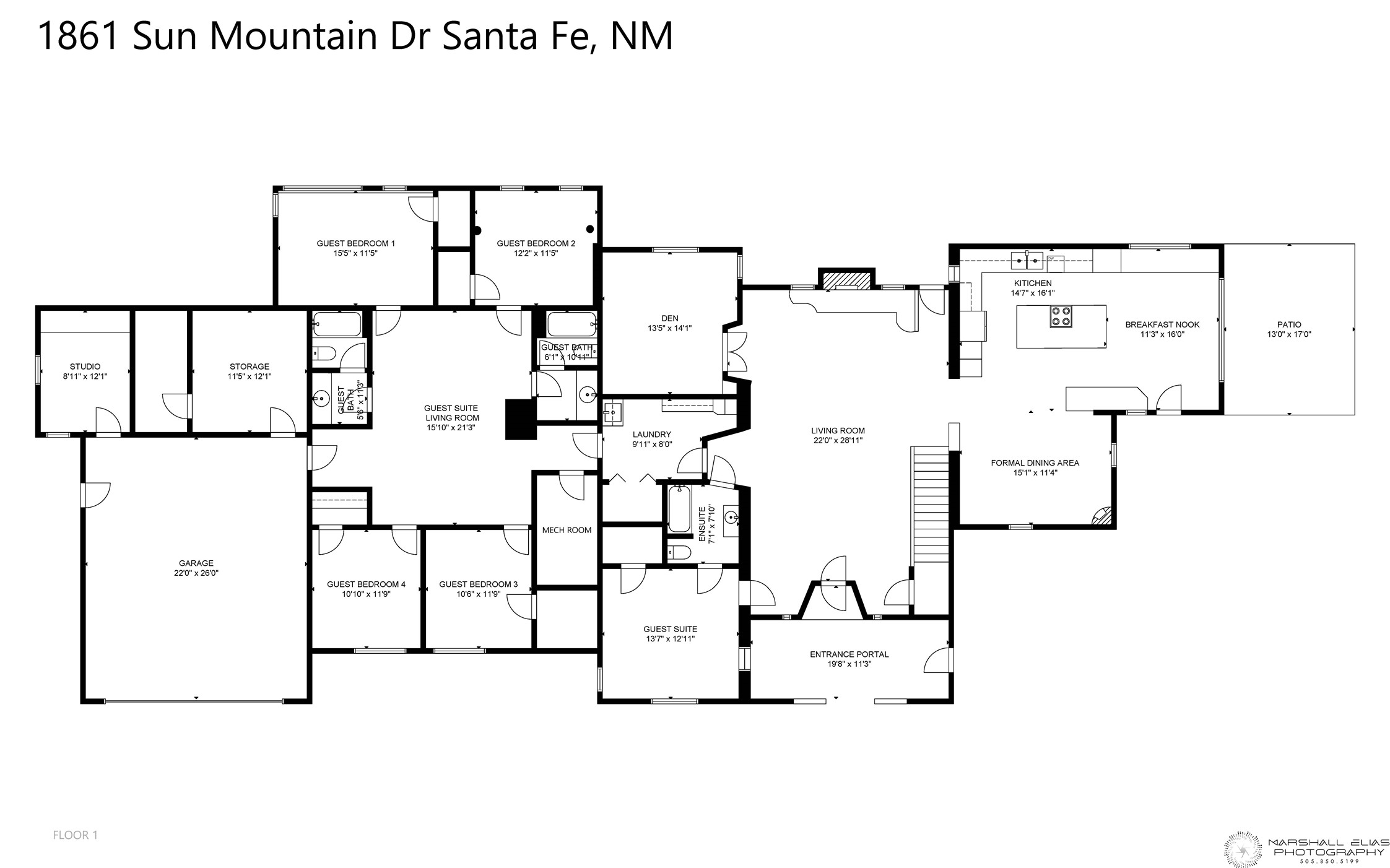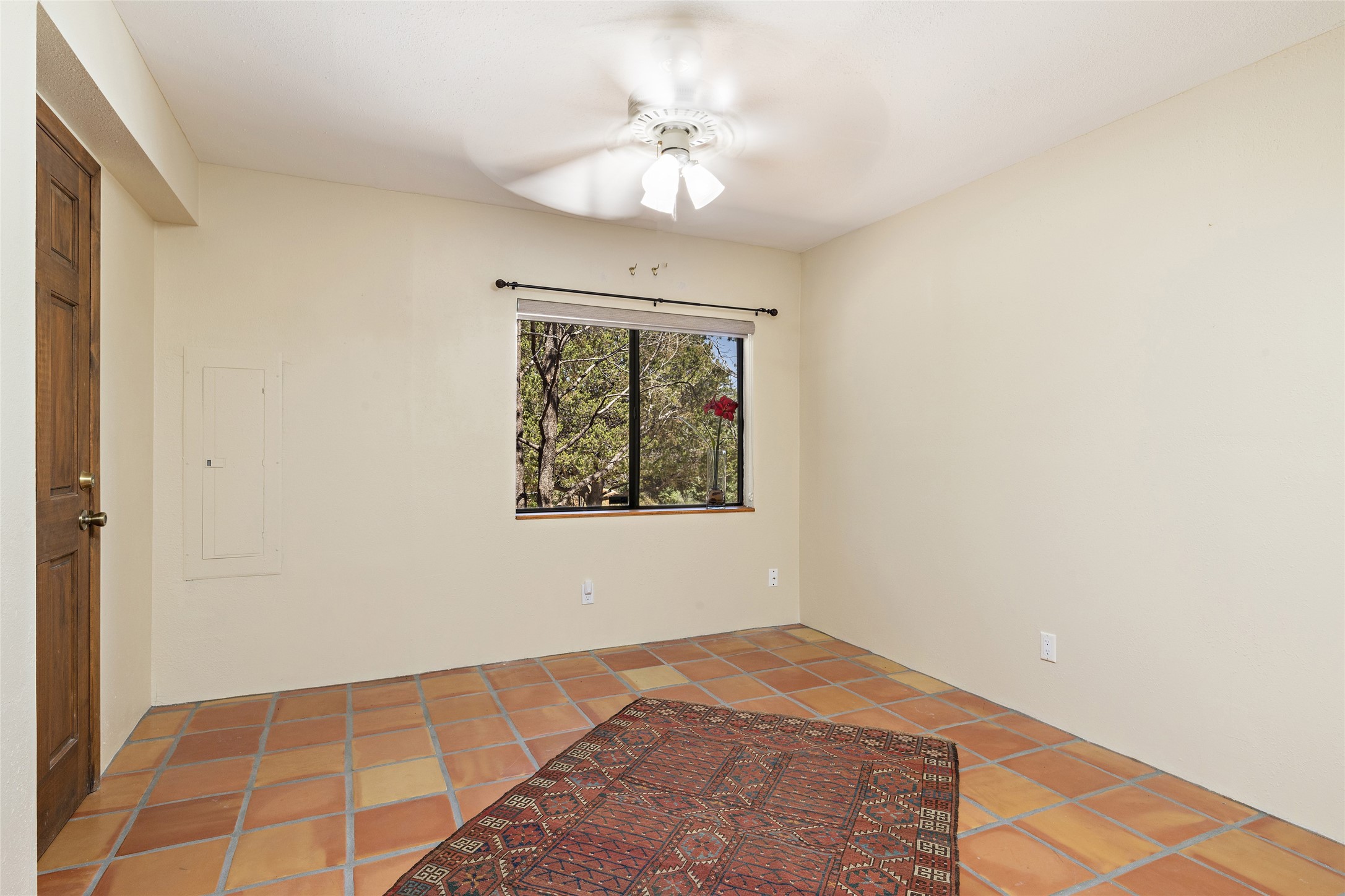 Just off the Old Santa Fe Trail, with the iconic Sun Mountain as the backdrop, this home is conveniently located close to Museum Hill and only 2.5 miles to the Plaza. There is ample space for flexibility in the residence with separate office, large den, storage rooms, and an oversized garage. The grand living room is graced by vaulted ceilings, spacious art walls, nichos and abundant natural light. The kitchen features granite countertops, Wolf cooktop and double-ovens, Subzero beverage cooler, and built-in buffet and china cabinet. The dining area has a kiva fireplace that is perfect for fireside meals. Set apart on the upper level is the gracious primary suite that features a balcony, coved viga ceiling, sitting area with fireplace, and a well-appointed closet with center island of drawers and a separate cedar-lined closet. On the main level is a guest bedroom with en suite bath. There is also a four-bedroom attached "live/work" space with two bathrooms and a large common area that provides privacy for guests or the flexibility for home offices. The outdoor entertainment spaces take full advantage of Santa Fe living: the expansive patio off the kitchen with a kiva fireplace, built-in grill, and a granite water feature by renowned sculptor Jesus Bautista Moroles, recipient of the 2008 Medal of Arts award. The garden beds are irrigated by an underground water catchment system. This is the perfect setting to entertain family and friends.