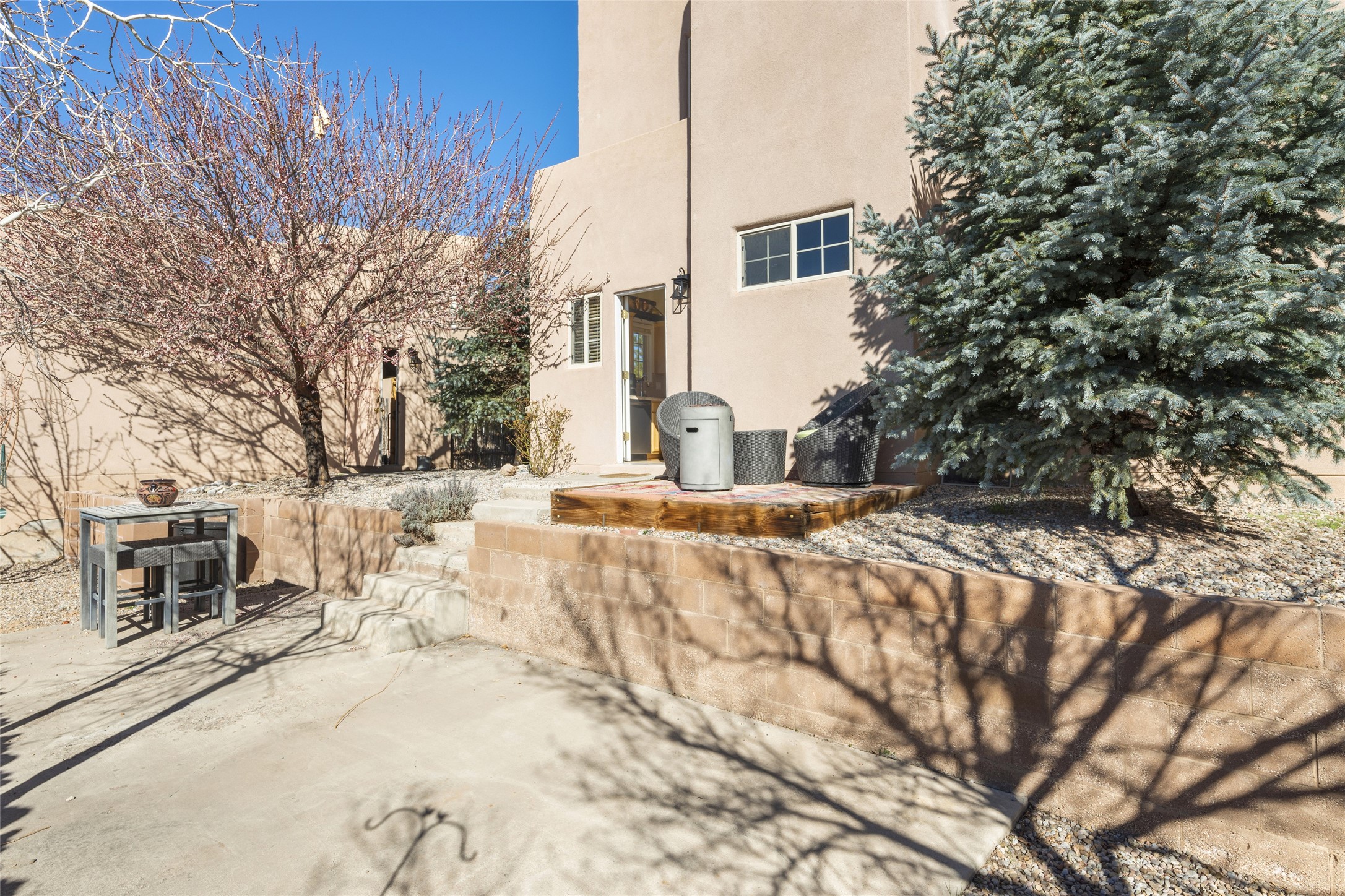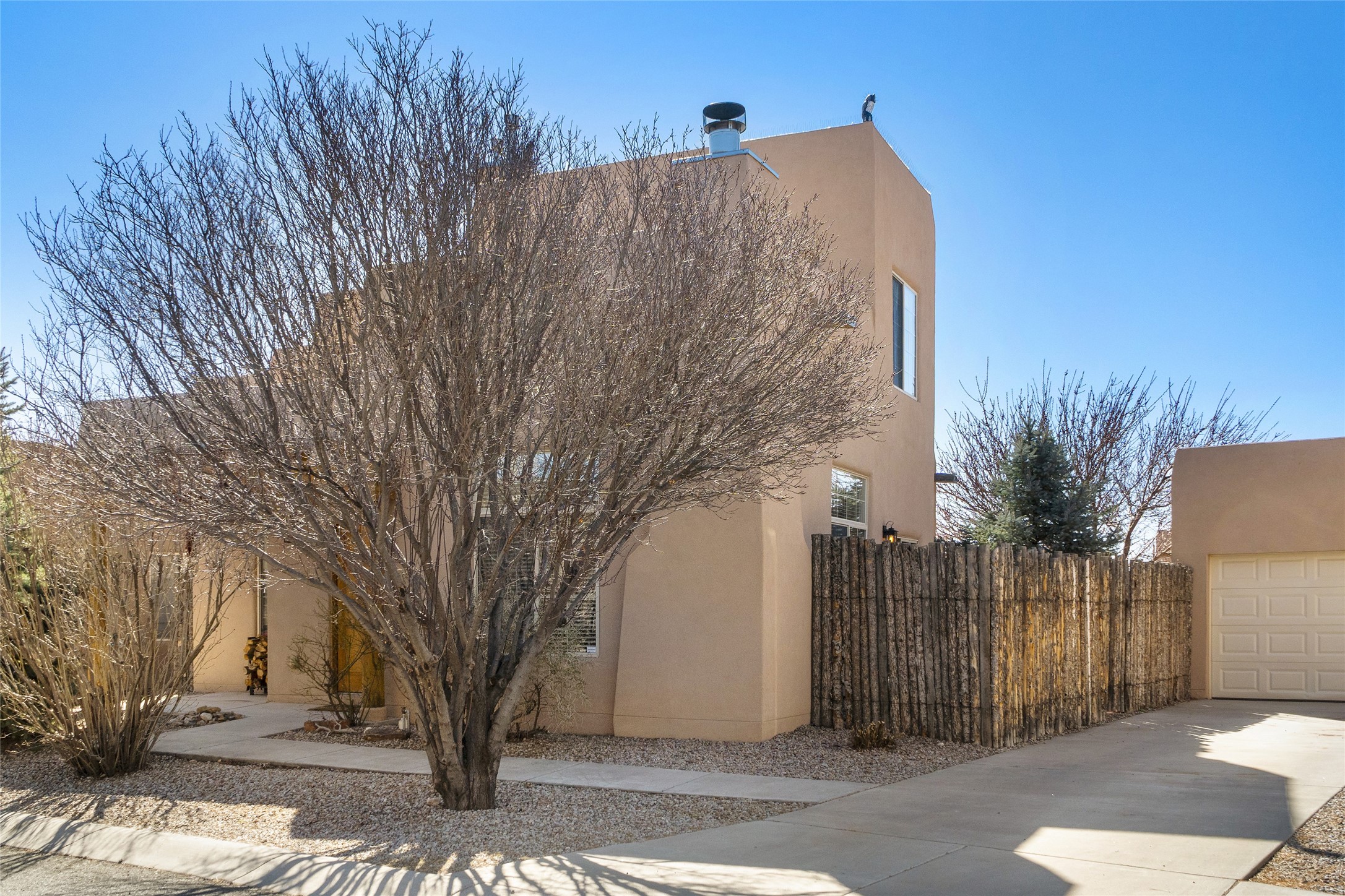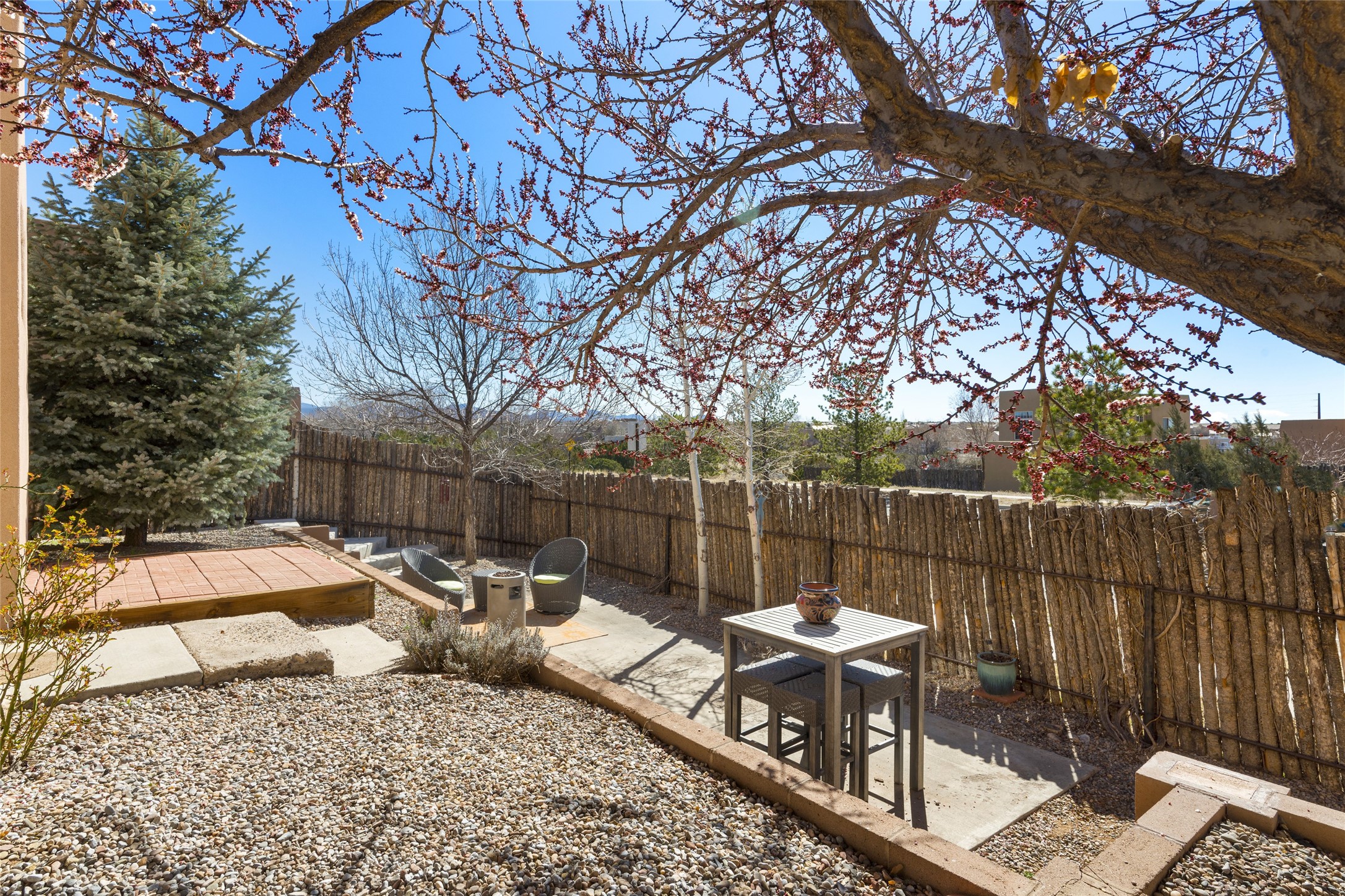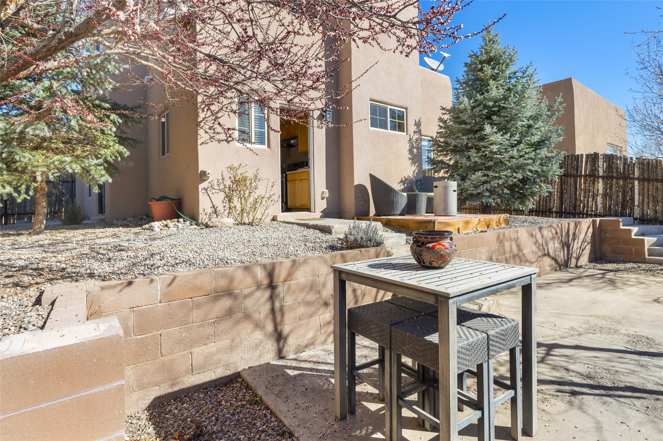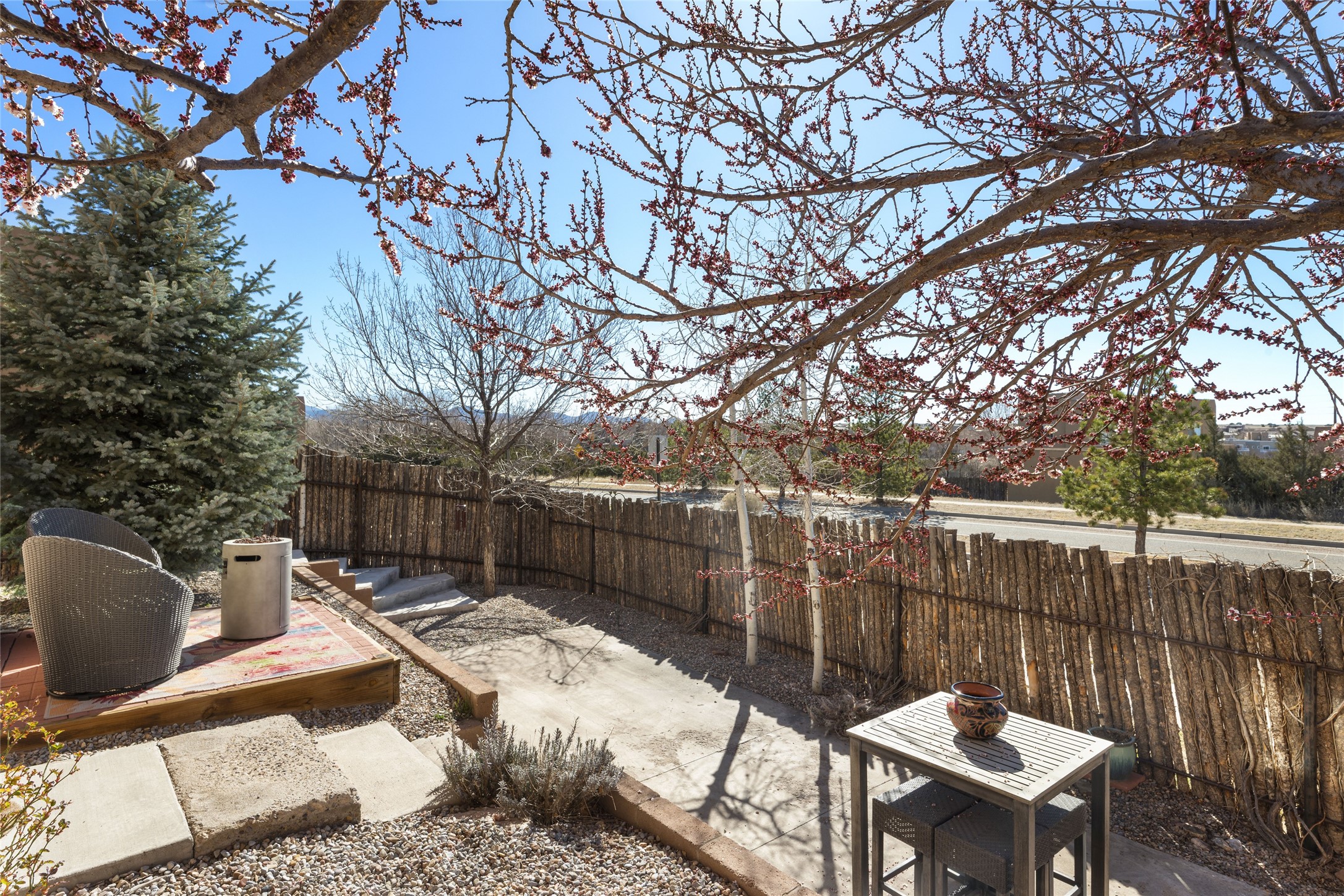 Nestled in the ever popular Nava Ade' community sits this very charming turn-key 3 bedroom, 2 bath single family home with a detached 1 car garage. Freshly painted and re-imagined with Metamorphosis staging, this darling Dream Catcher floorplan offers a generous living room and dining area with a soaring ceiling, fireplace with raised hearth, and huge, tall windows allowing for a beautiful light filled space. The galley kitchen is outfitted with stainless appliances, tile counters, and a French door leading you outside to a terraced back yard with mountain views surrounded by Coyote fencing. The 2 ground floor bedrooms have brand new Berber style carpeting and 1 full bath serving both bedrooms as well as the main floor. Upstairs is entirely dedicated to the Primary suite, with walk-in closet, generous full bath with a double vanity plus windows with tree top and views of the Sangre de Cristos. Adjoining the Primary suite is a French door just across the landing leading to a huge deck with spectacular 180 degree mountain views to the north. Roof maintenance has just been completed and comes with a transferable 2 year warranty. In addition, a new condenser for the AC was recently installed, plus all new exterior light fixtures. Nava Ade' is a highly desirable planned community offering many amenities such as a club house, gym, sauna, pool & spa. This sweet pride of ownership community is also conveniently located to shopping. What a great value! **Public Open House, this Sun, Mar 19th 1-4PM