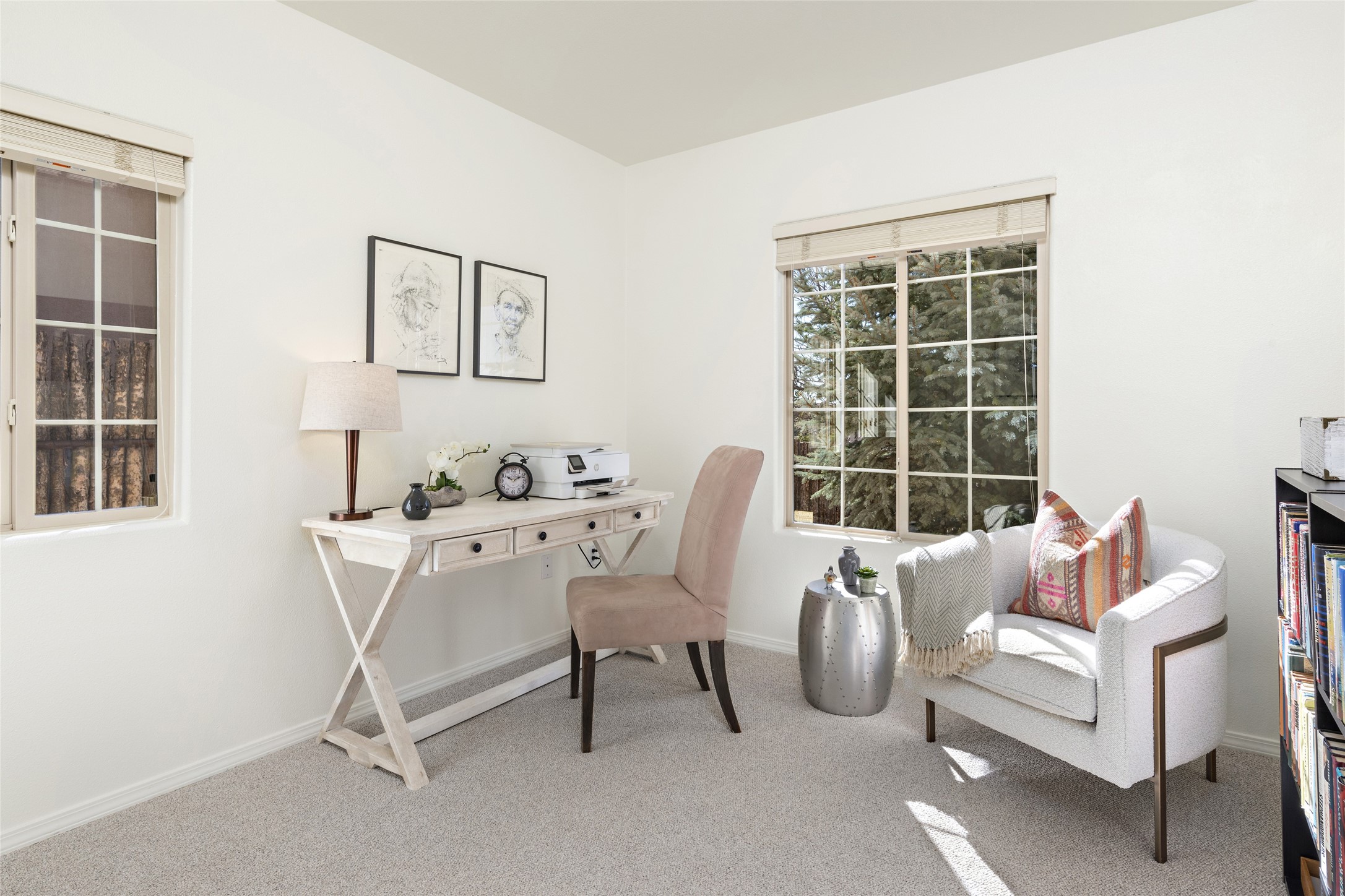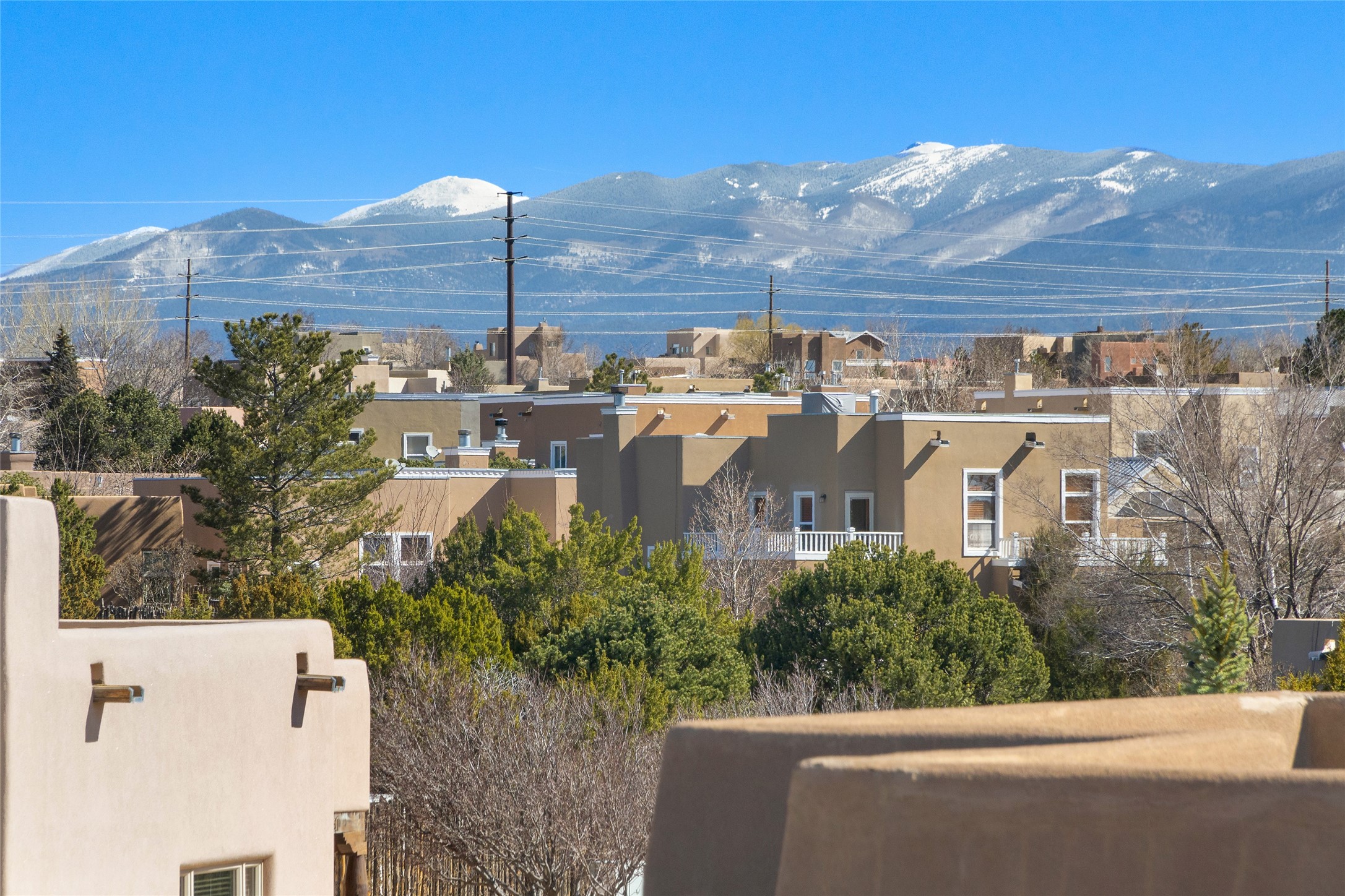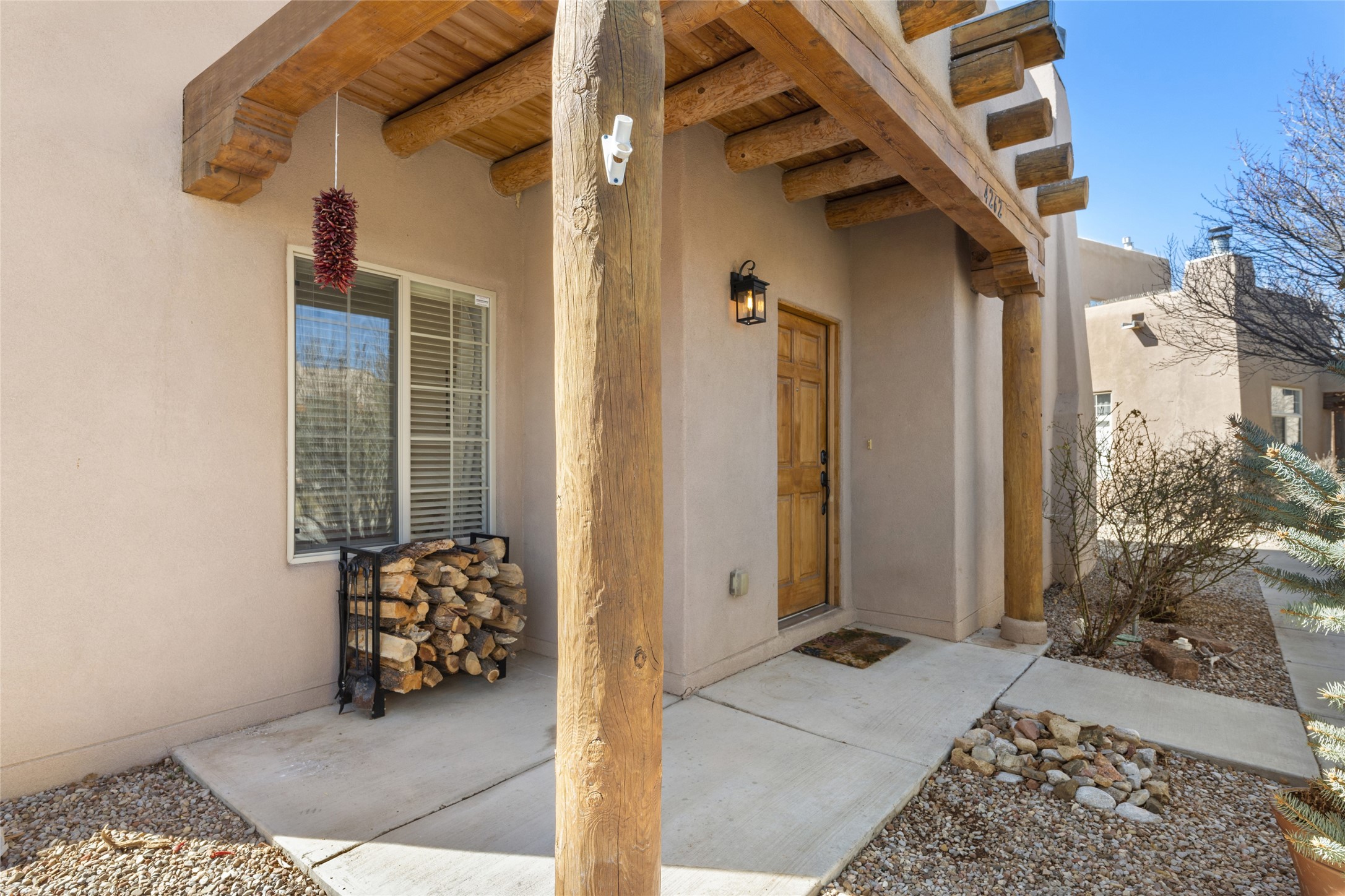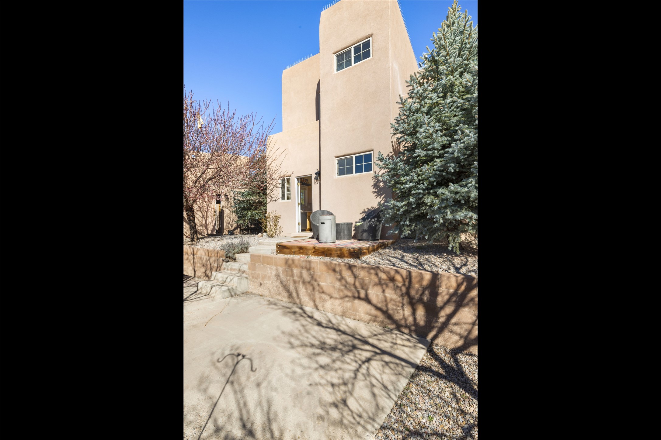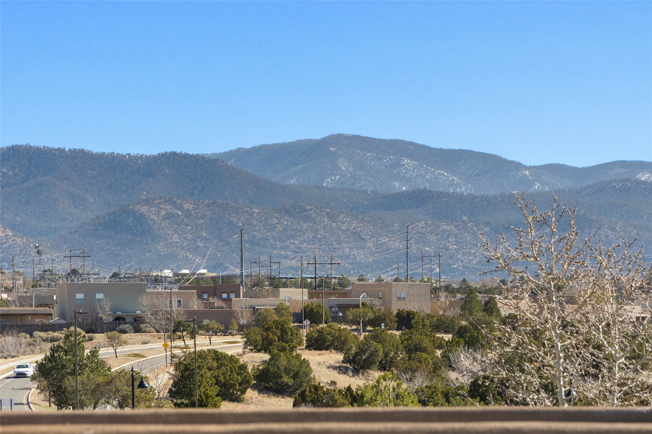 Nestled in the ever popular Nava Ade' community sits this very charming turn-key 3 bedroom, 2 bath single family home with a detached 1 car garage. Freshly painted and re-imagined with Metamorphosis staging, this darling Dream Catcher floorplan offers a generous living room and dining area with a soaring ceiling, fireplace with raised hearth, and huge, tall windows allowing for a beautiful light filled space. The galley kitchen is outfitted with stainless appliances, tile counters, and a French door leading you outside to a terraced back yard with mountain views surrounded by Coyote fencing. The 2 ground floor bedrooms have brand new Berber style carpeting and 1 full bath serving both bedrooms as well as the main floor. Upstairs is entirely dedicated to the Primary suite, with walk-in closet, generous full bath with a double vanity plus windows with tree top and views of the Sangre de Cristos. Adjoining the Primary suite is a French door just across the landing leading to a huge deck with spectacular 180 degree mountain views to the north. Roof maintenance has just been completed and comes with a transferable 2 year warranty. In addition, a new condenser for the AC was recently installed, plus all new exterior light fixtures. Nava Ade' is a highly desirable planned community offering many amenities such as a club house, gym, sauna, pool & spa. This sweet pride of ownership community is also conveniently located to shopping. What a great value! **Public Open House, this Sun, Mar 19th 1-4PM