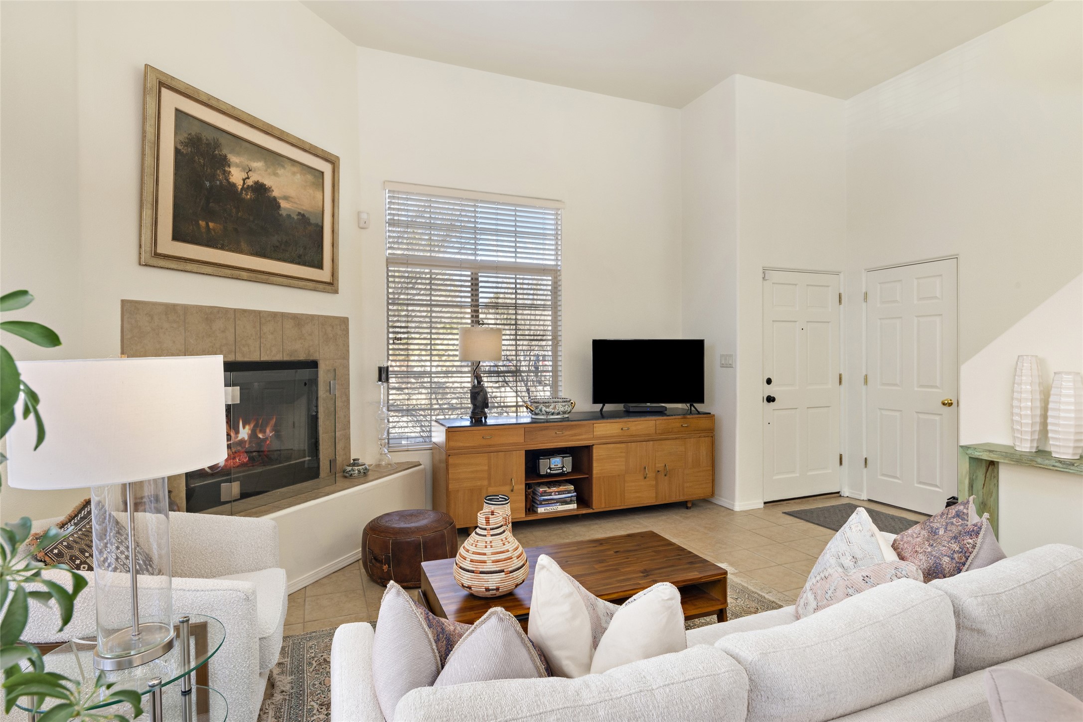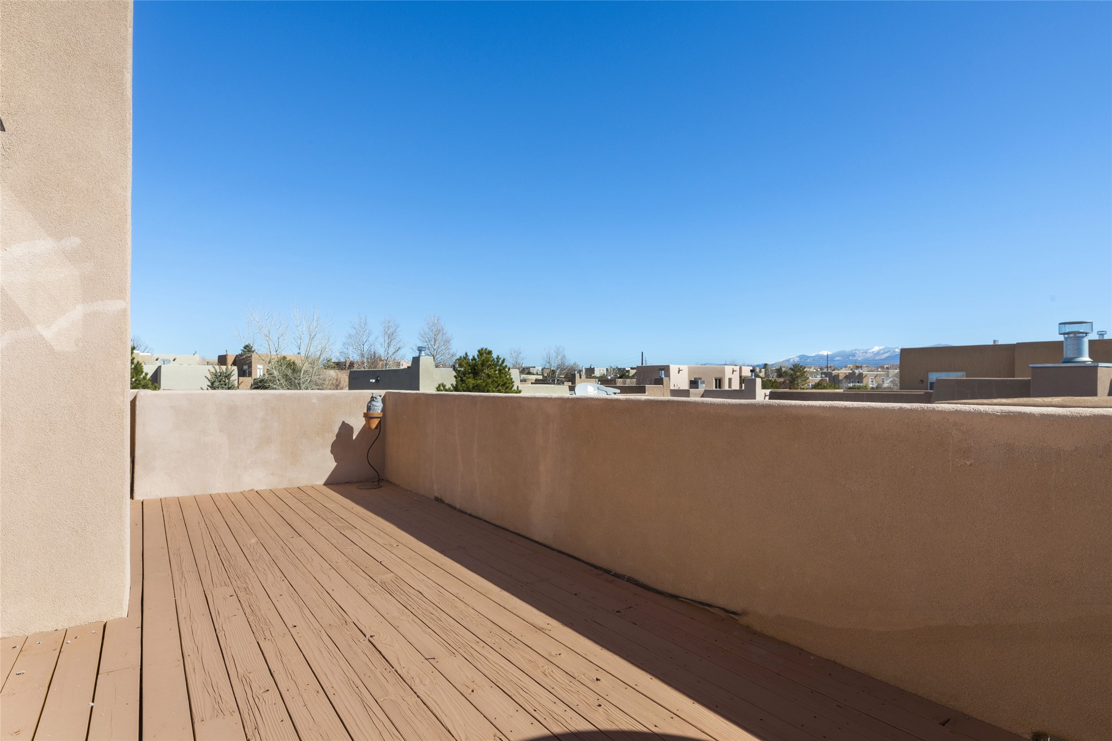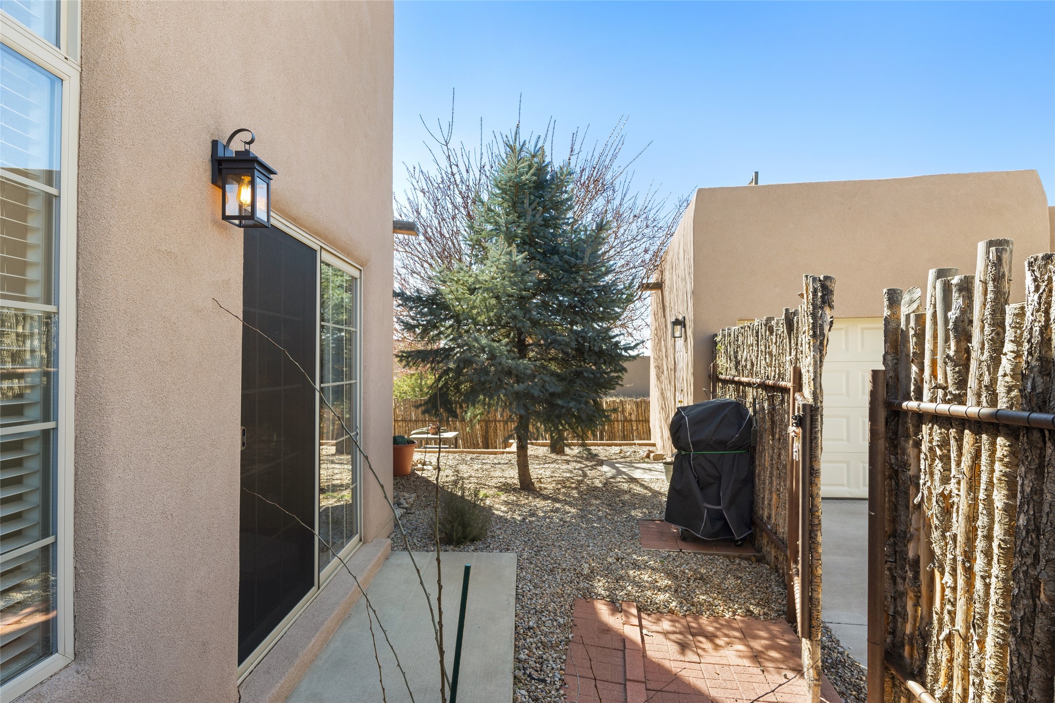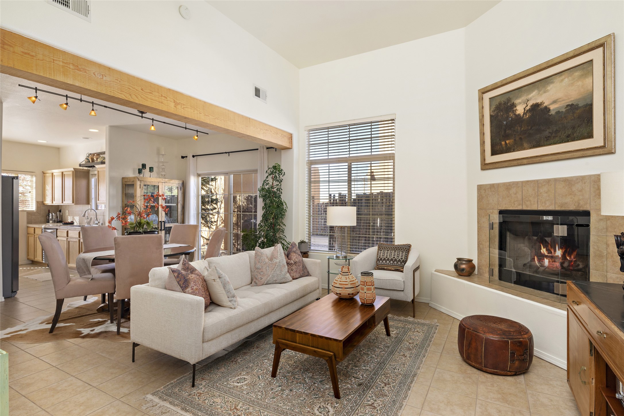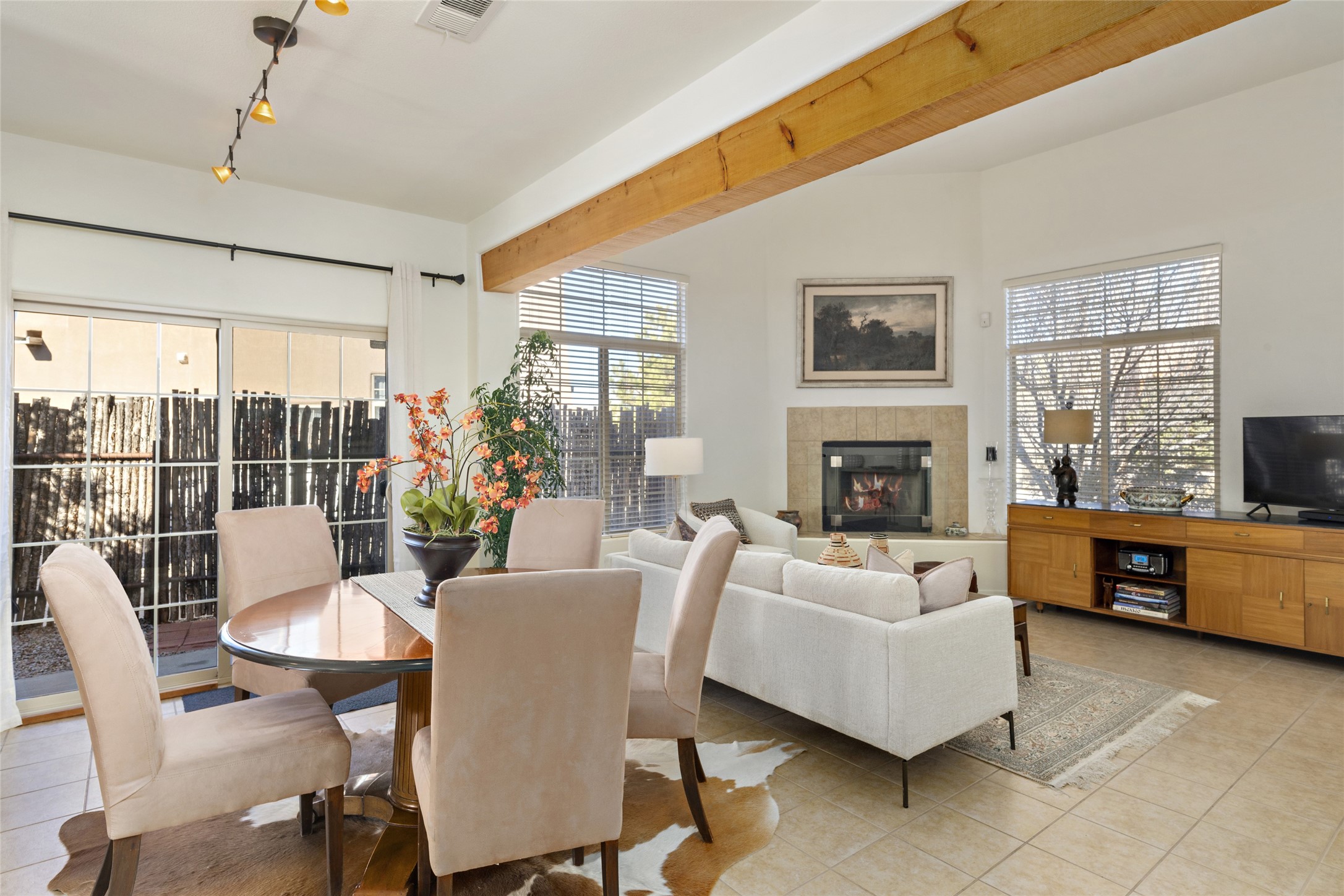 Nestled in the ever popular Nava Ade' community sits this very charming turn-key 3 bedroom, 2 bath single family home with a detached 1 car garage. Freshly painted and re-imagined with Metamorphosis staging, this darling Dream Catcher floorplan offers a generous living room and dining area with a soaring ceiling, fireplace with raised hearth, and huge, tall windows allowing for a beautiful light filled space. The galley kitchen is outfitted with stainless appliances, tile counters, and a French door leading you outside to a terraced back yard with mountain views surrounded by Coyote fencing. The 2 ground floor bedrooms have brand new Berber style carpeting and 1 full bath serving both bedrooms as well as the main floor. Upstairs is entirely dedicated to the Primary suite, with walk-in closet, generous full bath with a double vanity plus windows with tree top and views of the Sangre de Cristos. Adjoining the Primary suite is a French door just across the landing leading to a huge deck with spectacular 180 degree mountain views to the north. Roof maintenance has just been completed and comes with a transferable 2 year warranty. In addition, a new condenser for the AC was recently installed, plus all new exterior light fixtures. Nava Ade' is a highly desirable planned community offering many amenities such as a club house, gym, sauna, pool & spa. This sweet pride of ownership community is also conveniently located to shopping. What a great value! **Public Open House, this Sun, Mar 19th 1-4PM