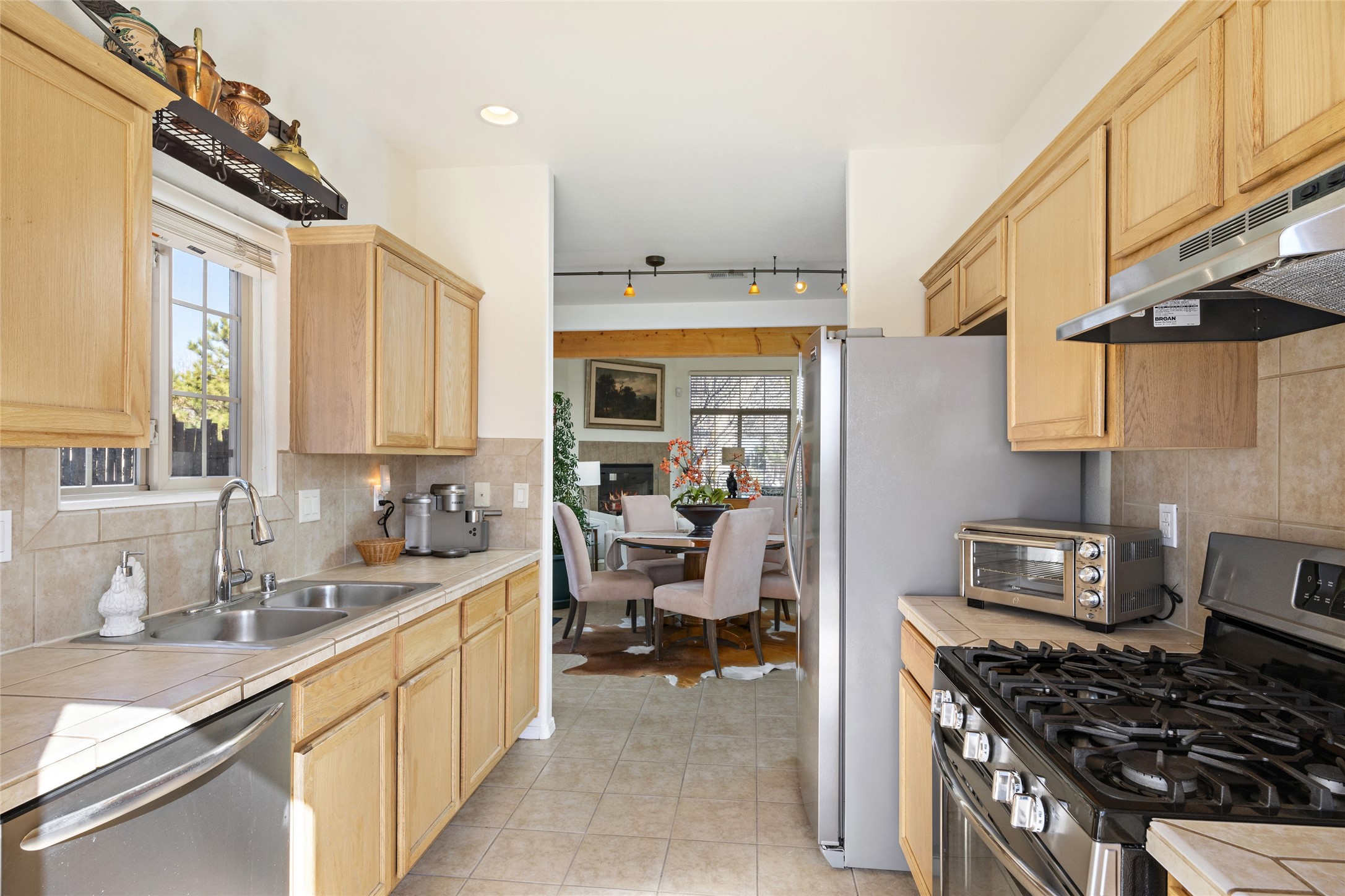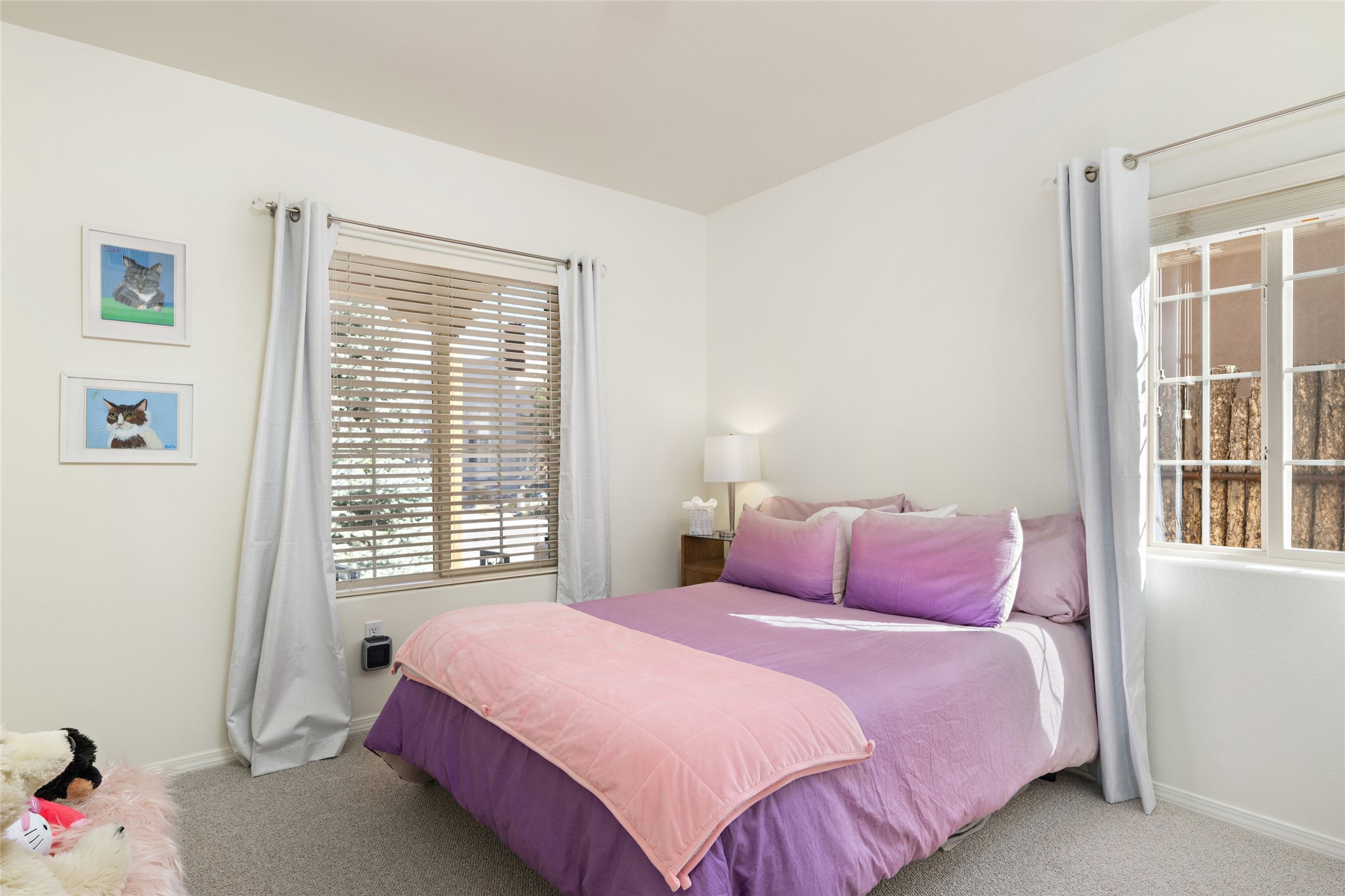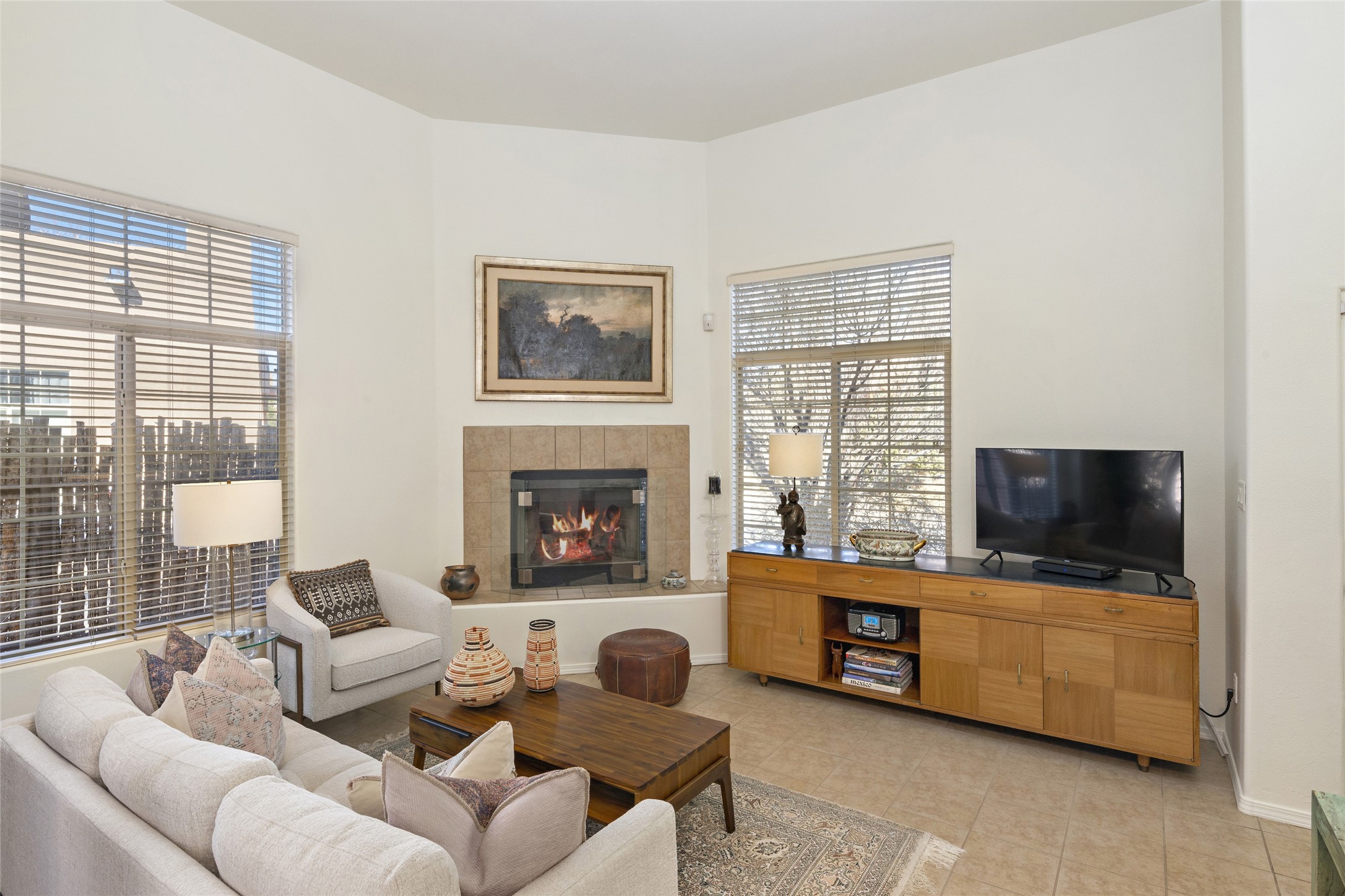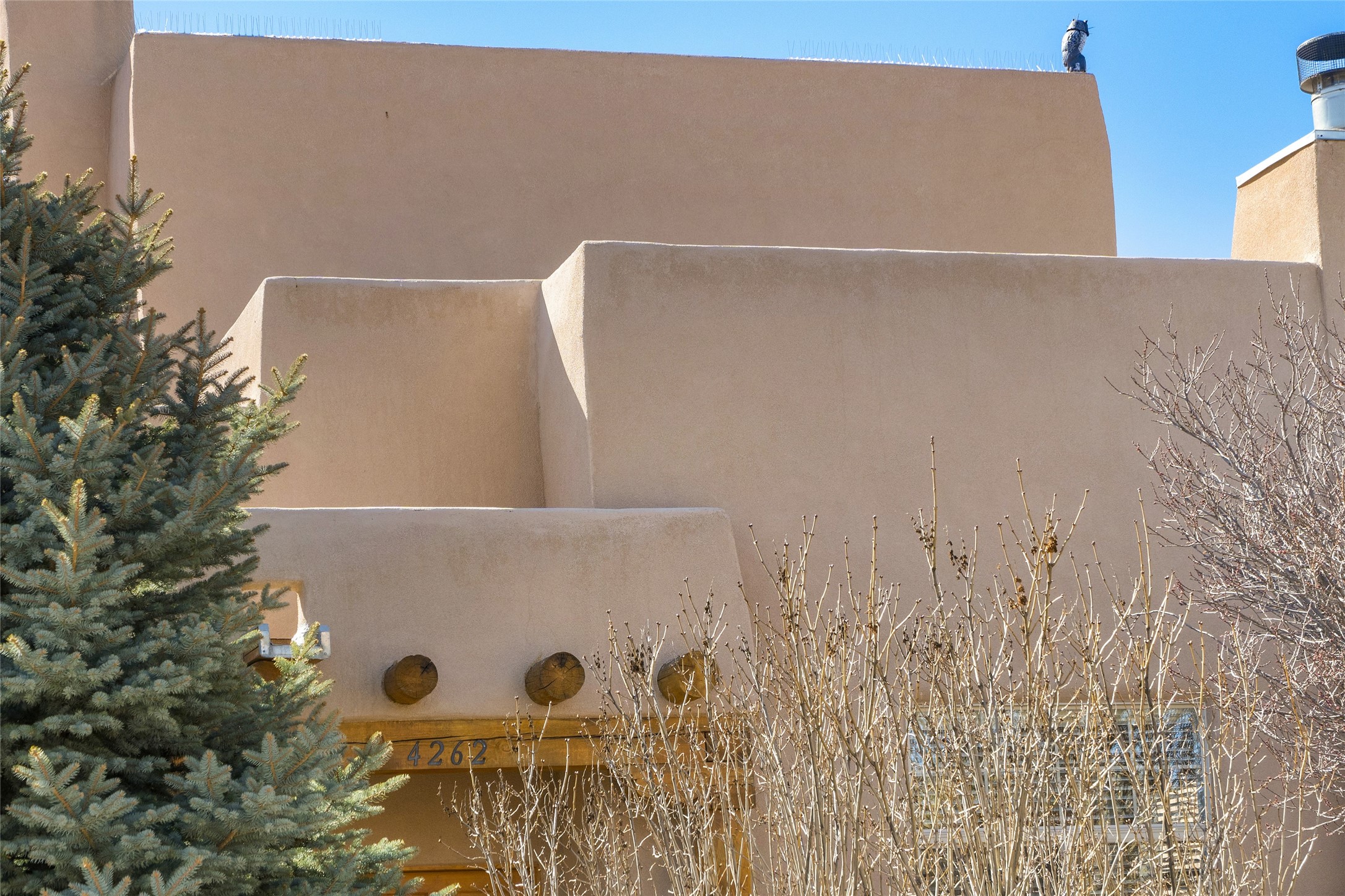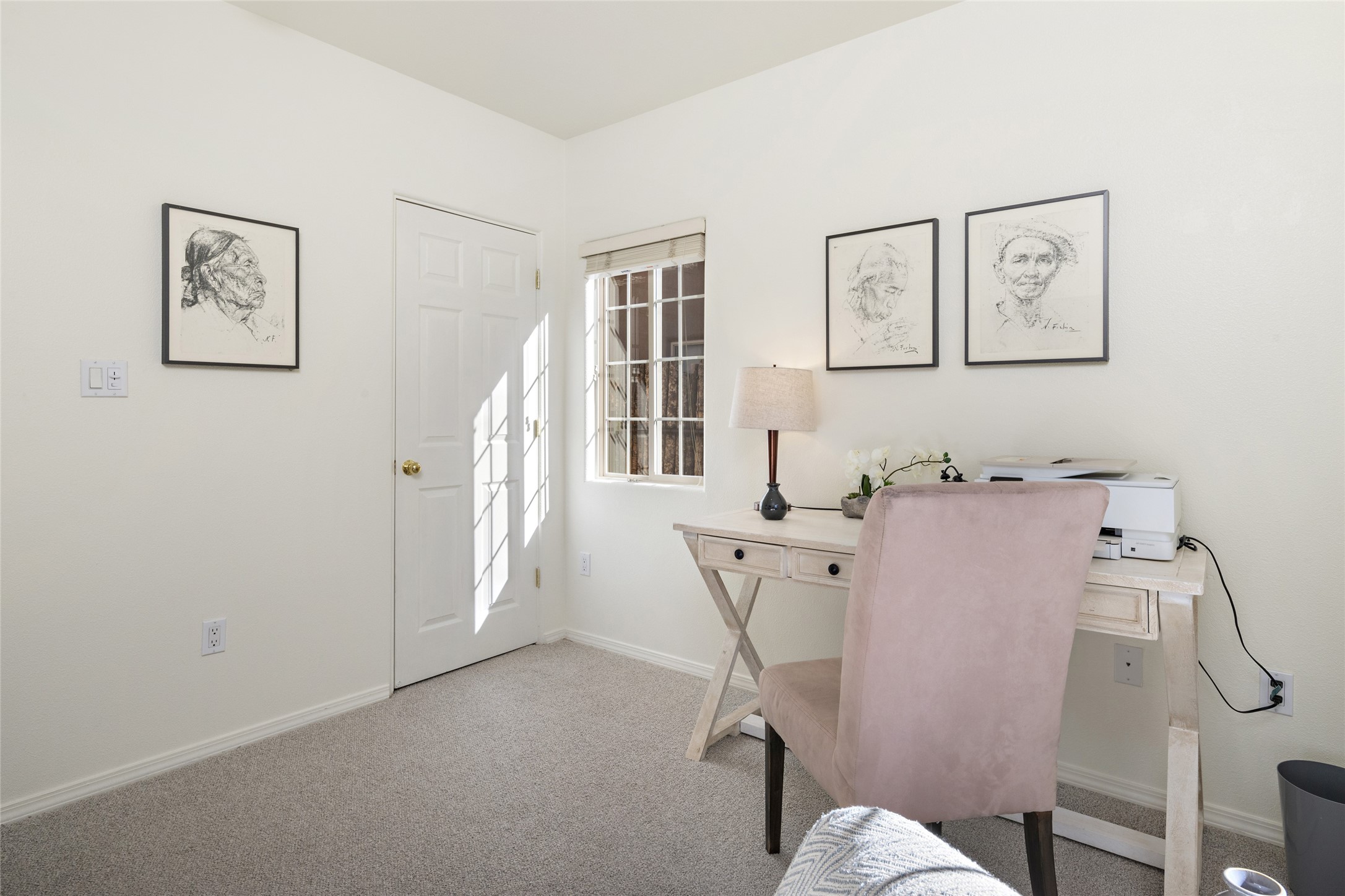 Nestled in the ever popular Nava Ade' community sits this very charming turn-key 3 bedroom, 2 bath single family home with a detached 1 car garage. Freshly painted and re-imagined with Metamorphosis staging, this darling Dream Catcher floorplan offers a generous living room and dining area with a soaring ceiling, fireplace with raised hearth, and huge, tall windows allowing for a beautiful light filled space. The galley kitchen is outfitted with stainless appliances, tile counters, and a French door leading you outside to a terraced back yard with mountain views surrounded by Coyote fencing. The 2 ground floor bedrooms have brand new Berber style carpeting and 1 full bath serving both bedrooms as well as the main floor. Upstairs is entirely dedicated to the Primary suite, with walk-in closet, generous full bath with a double vanity plus windows with tree top and views of the Sangre de Cristos. Adjoining the Primary suite is a French door just across the landing leading to a huge deck with spectacular 180 degree mountain views to the north. Roof maintenance has just been completed and comes with a transferable 2 year warranty. In addition, a new condenser for the AC was recently installed, plus all new exterior light fixtures. Nava Ade' is a highly desirable planned community offering many amenities such as a club house, gym, sauna, pool & spa. This sweet pride of ownership community is also conveniently located to shopping. What a great value! **Public Open House, this Sun, Mar 19th 1-4PM