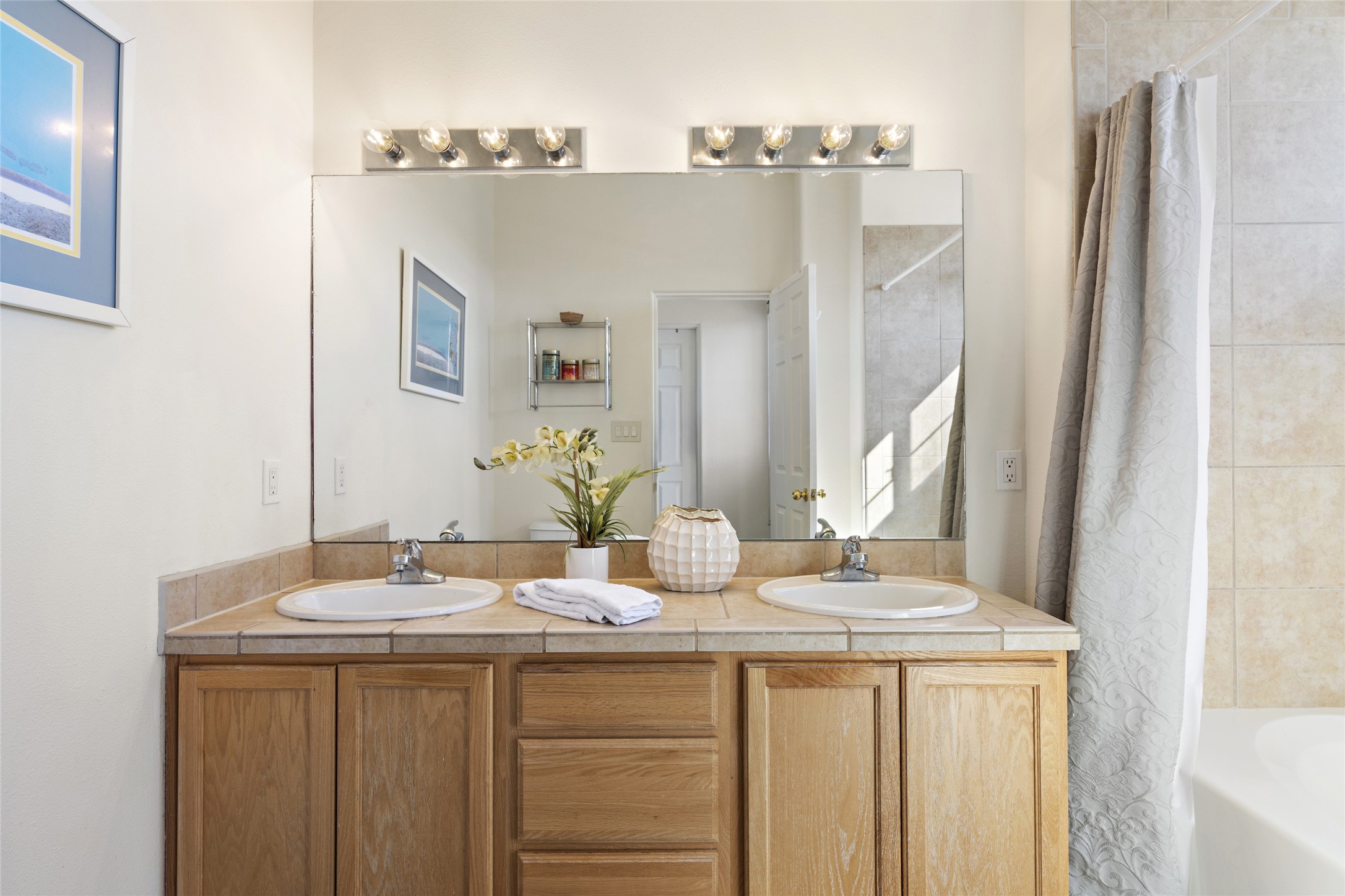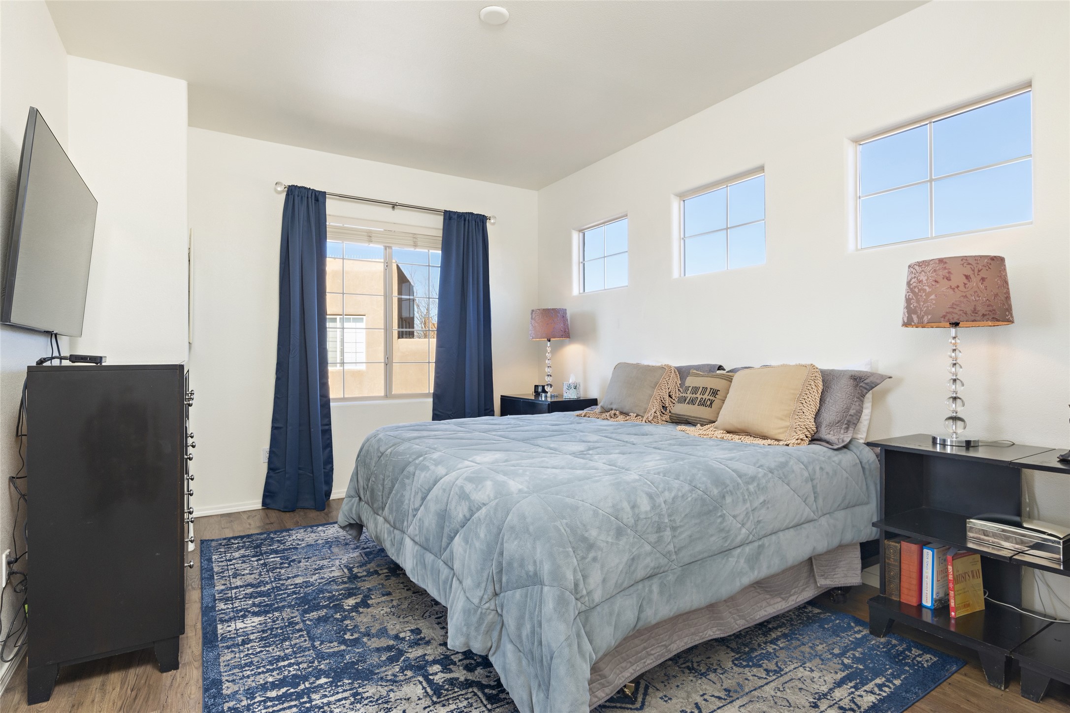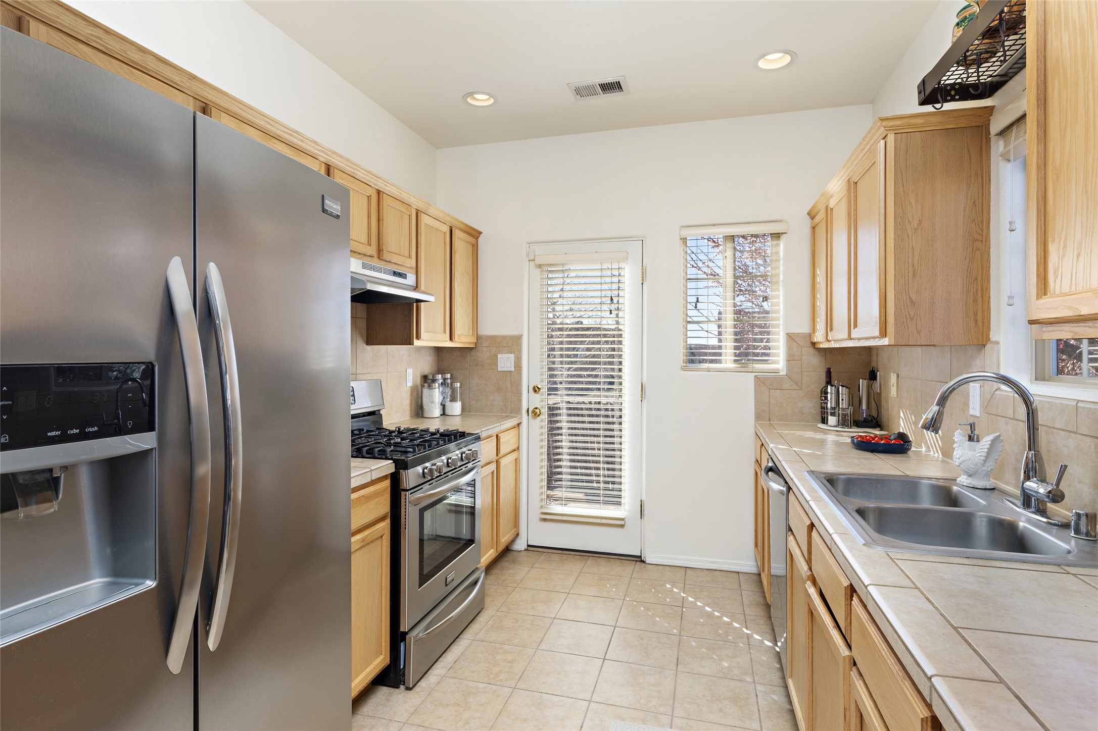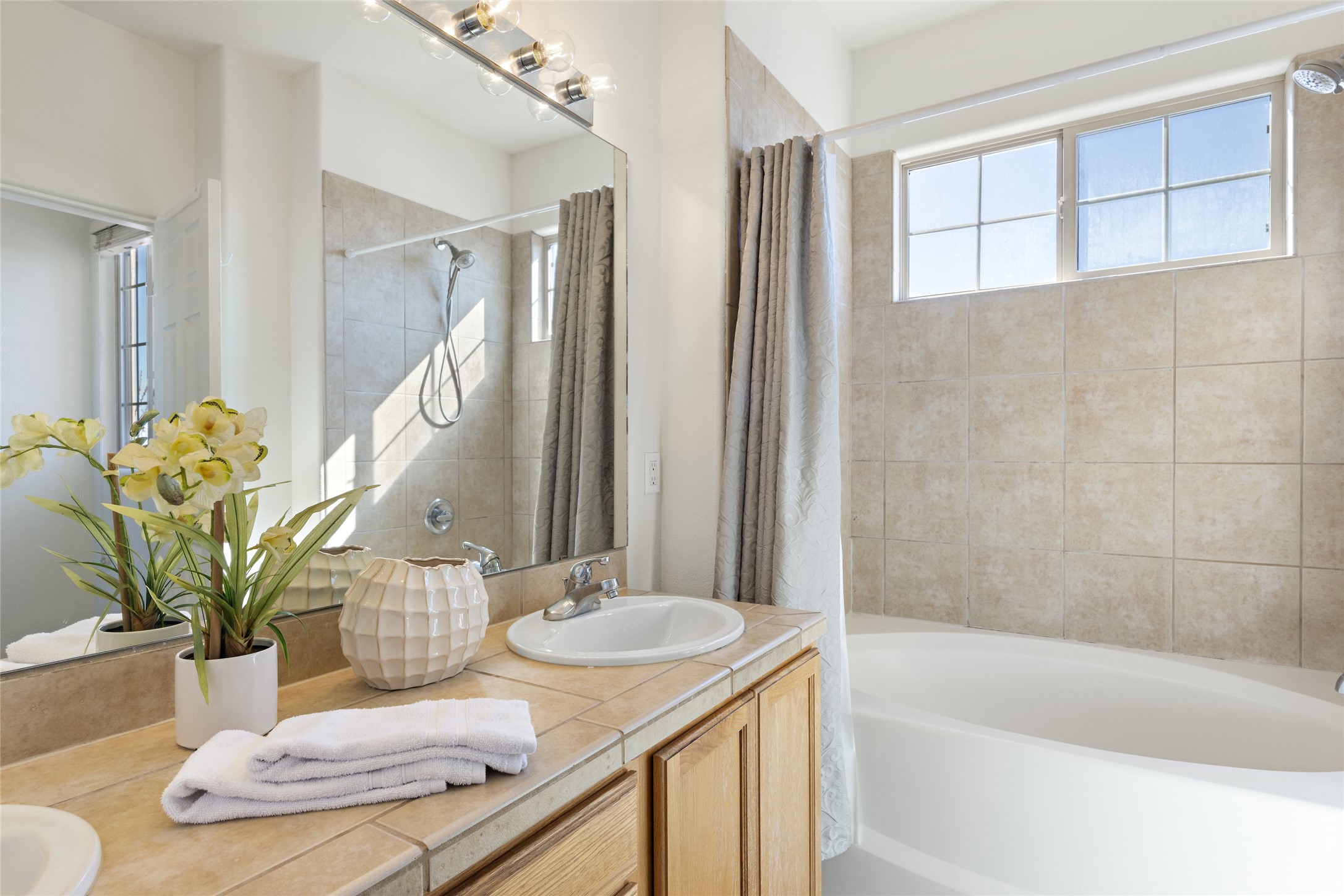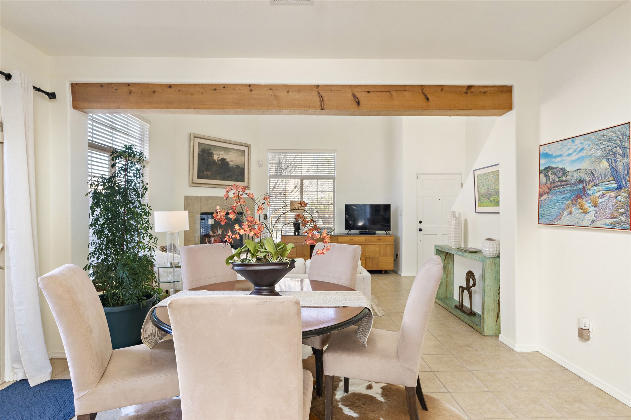Nestled in the ever popular Nava Ade' community sits this very charming turn-key 3 bedroom, 2 bath single family home with a detached 1 car garage. Freshly painted and re-imagined with Metamorphosis staging, this darling Dream Catcher floorplan offers a generous living room and dining area with a soaring ceiling, fireplace with raised hearth, and huge, tall windows allowing for a beautiful light filled space. The galley kitchen is outfitted with stainless appliances, tile counters, and a French door leading you outside to a terraced back yard with mountain views surrounded by Coyote fencing. The 2 ground floor bedrooms have brand new Berber style carpeting and 1 full bath serving both bedrooms as well as the main floor. Upstairs is entirely dedicated to the Primary suite, with walk-in closet, generous full bath with a double vanity plus windows with tree top and views of the Sangre de Cristos. Adjoining the Primary suite is a French door just across the landing leading to a huge deck with spectacular 180 degree mountain views to the north. Roof maintenance has just been completed and comes with a transferable 2 year warranty. In addition, a new condenser for the AC was recently installed, plus all new exterior light fixtures. Nava Ade' is a highly desirable planned community offering many amenities such as a club house, gym, sauna, pool & spa. This sweet pride of ownership community is also conveniently located to shopping. What a great value! **Public Open House, this Sun, Mar 19th 1-4PM