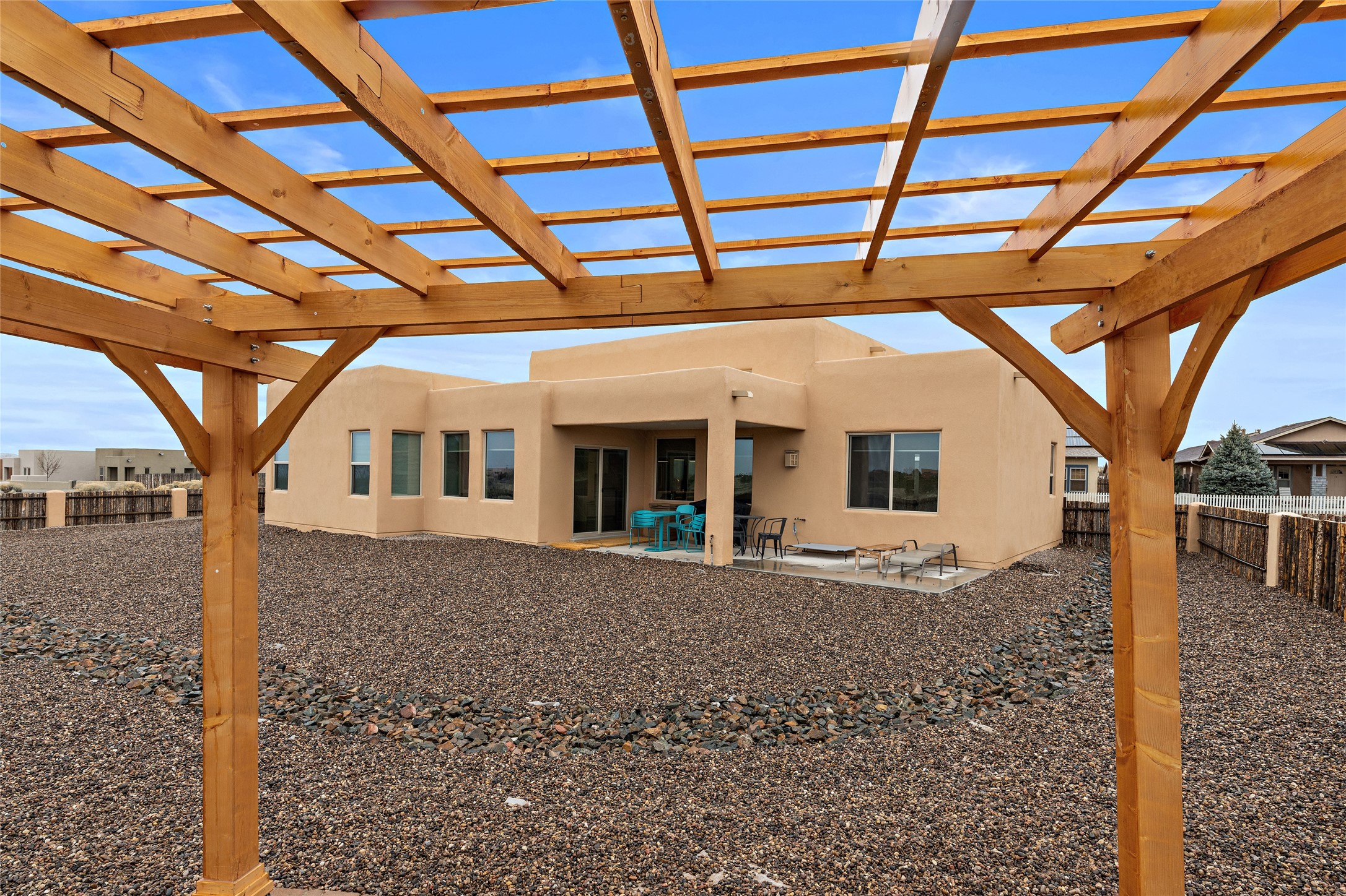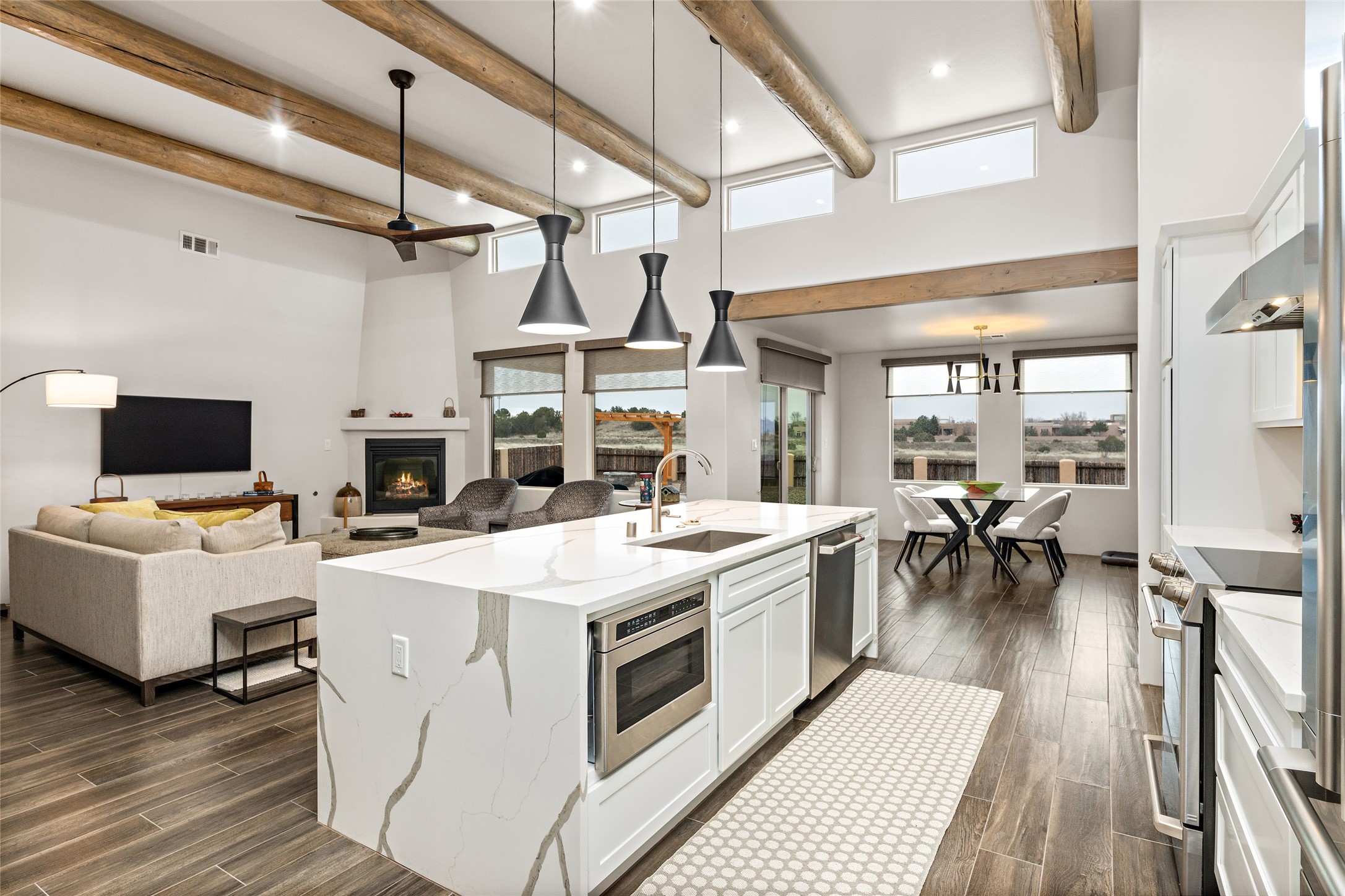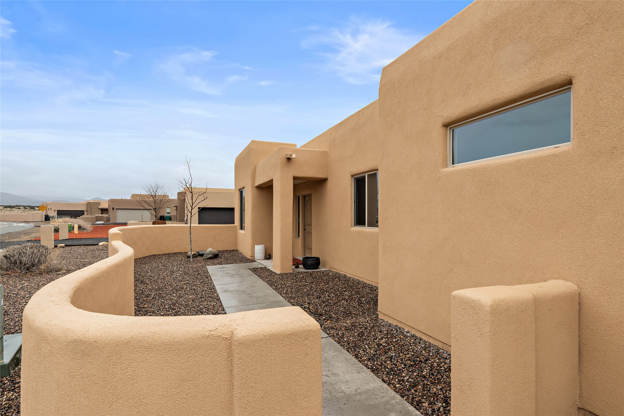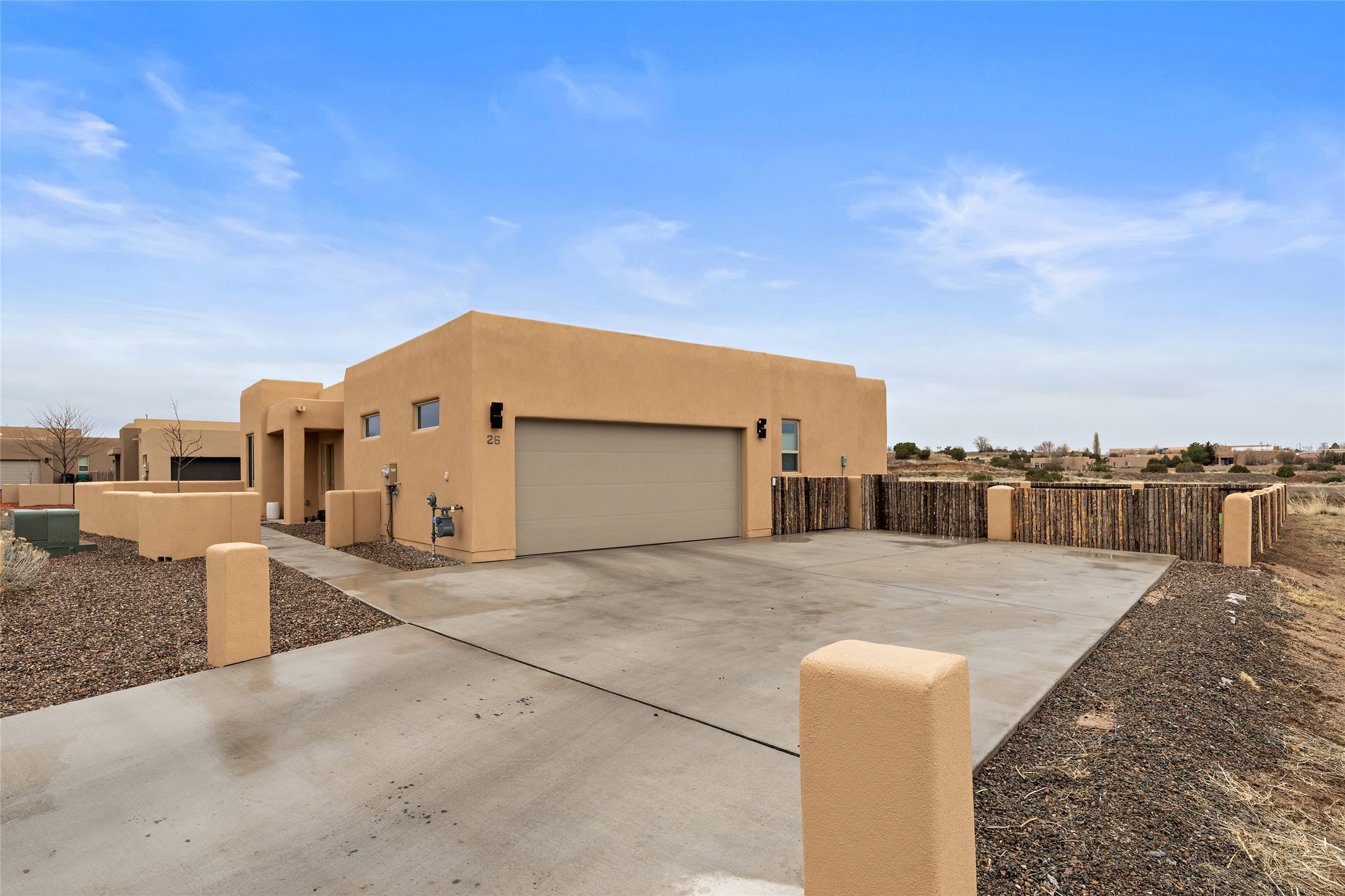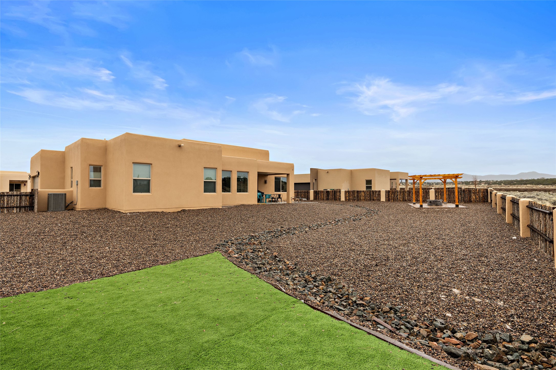 This nearly brand new 3 bedroom, 2 bathroom single level home in Oshara Village sits on nearly a third of an acre with views to the open space to the South, and easy access for walking in the arroyo. With wonderful light, high ceilings with clear story windows and a nice open floor plan, there is also perfect bedroom separation for privacy from guests or children! The main living spaces enjoy the gas kiva fireplace in the living room, a sunny dining room and fabulous kitchen with waterfall quartz countertops, Ann Sacks accent tile, big country sink, induction stove and a large walk in pantry with a wine cooler fridge. The laundry room is also adjacent to the kitchen with easy access to the garage. The two guest bedrooms share a full bath also with the upgraded quartz counter and accent tiles. The owner's bedroom has great light, en suite bath and enormous and enviable walk in closet by Elfa. The yard is fenced for your furry friends, and has a covered South face portal as well as a pergola to enjoy the sunsets by the cozy fire pit. The builder's warranty is good until mid-July and the home is a certified HERS-rated green home through energy efficiency, durability, healthy materials, sustainability and green practices. There are over $120,000 in upgrades including countertops and tile, water softener, bathroom mirrors, light fixtures, ceiling fans, appliance package and window coverings which protect from the sun to keep the house cool; as well as $35,000 of work to the yard with fencing, pergola and some plantings- plus there is also refrigerated air!