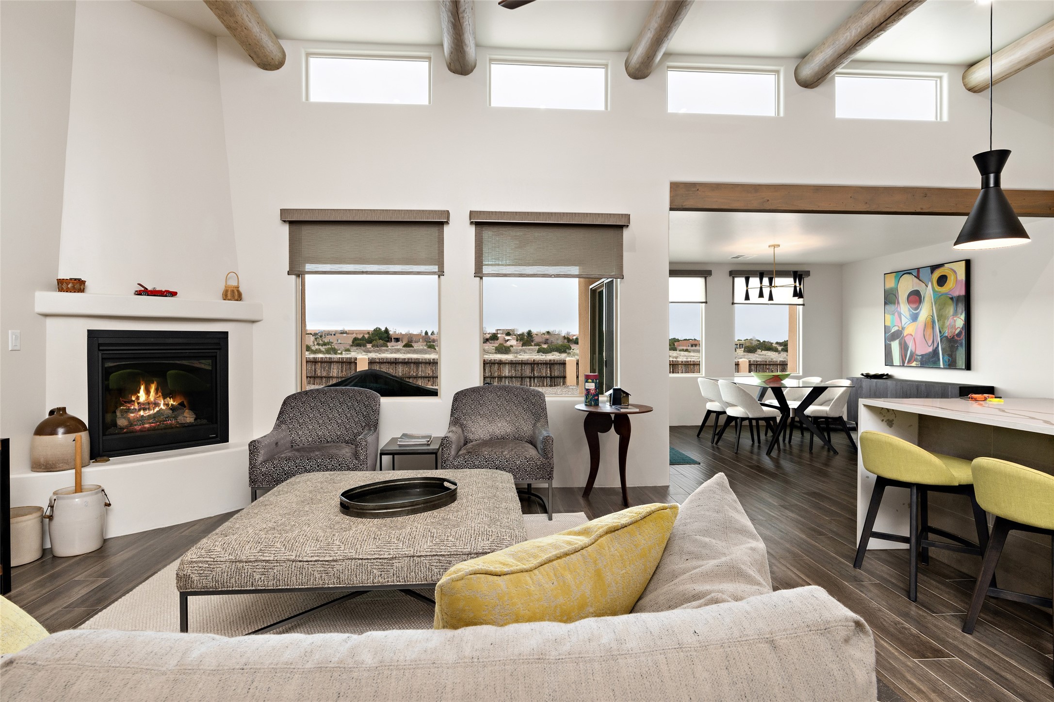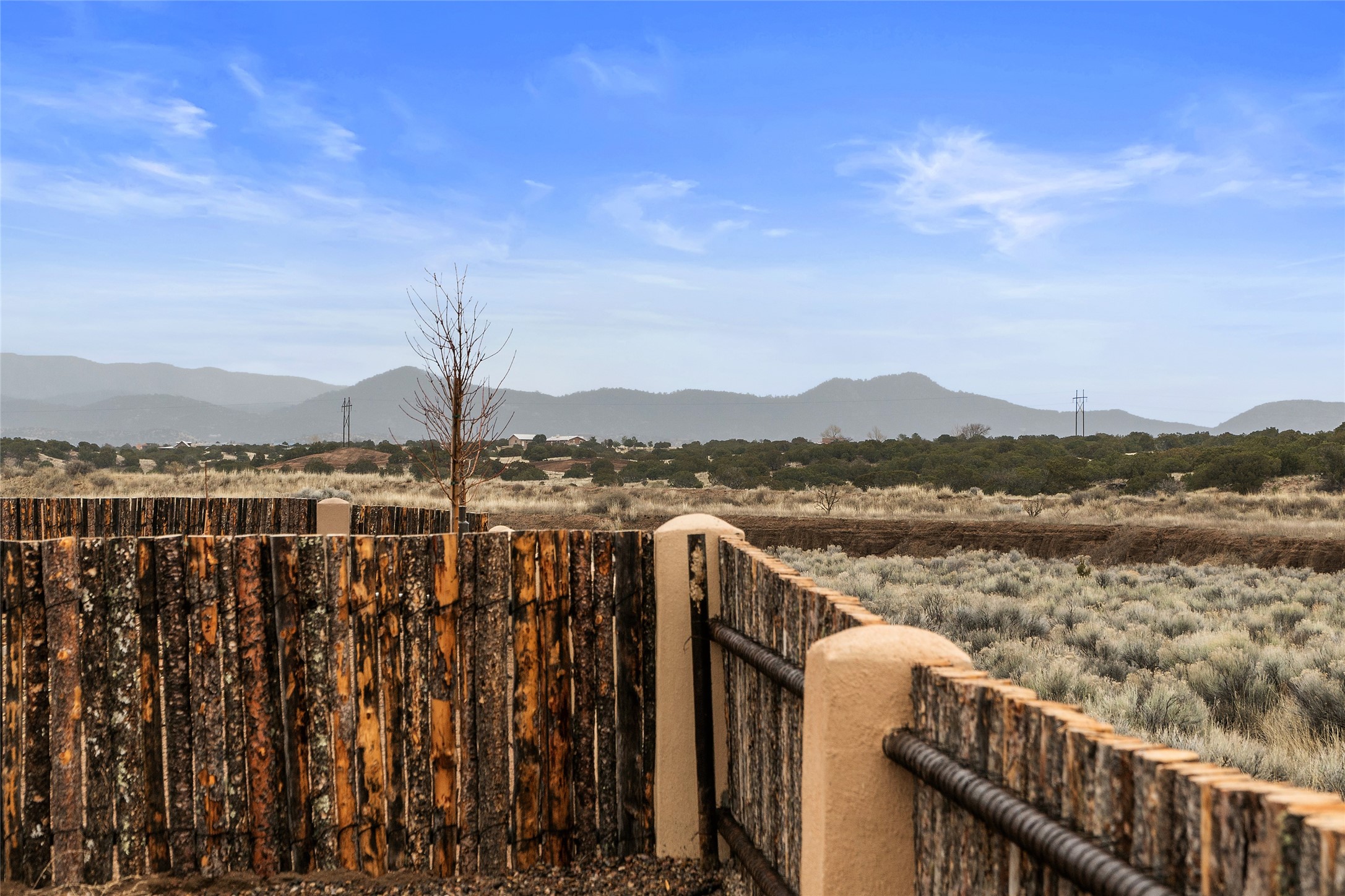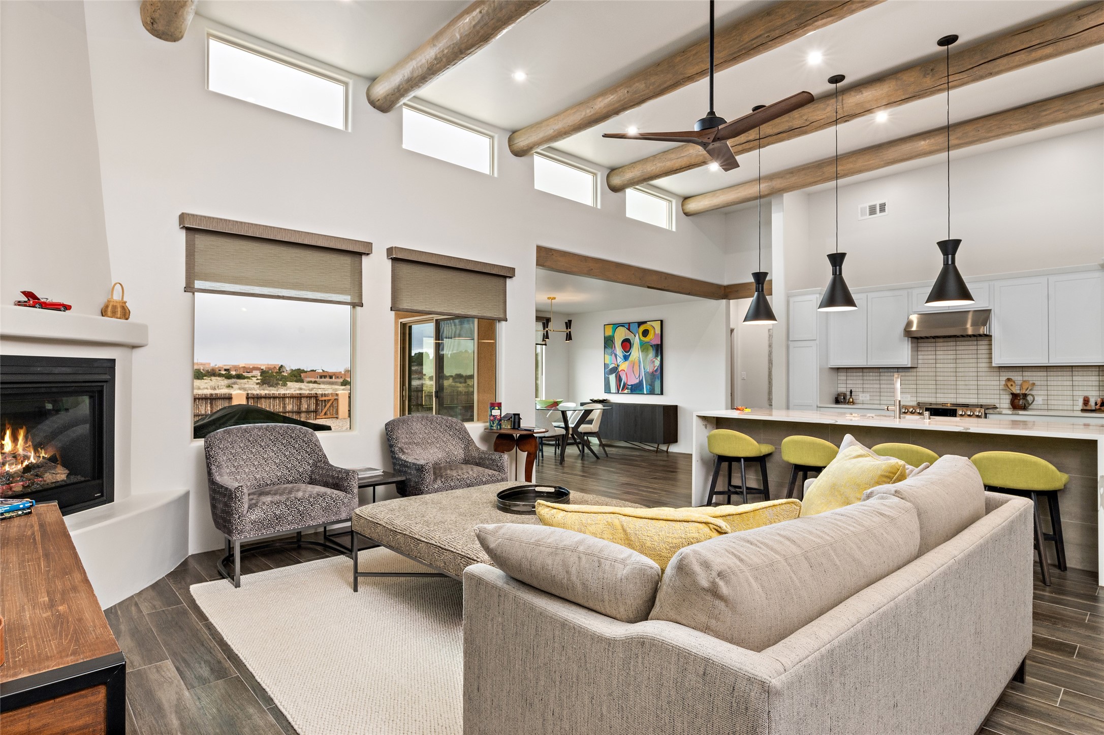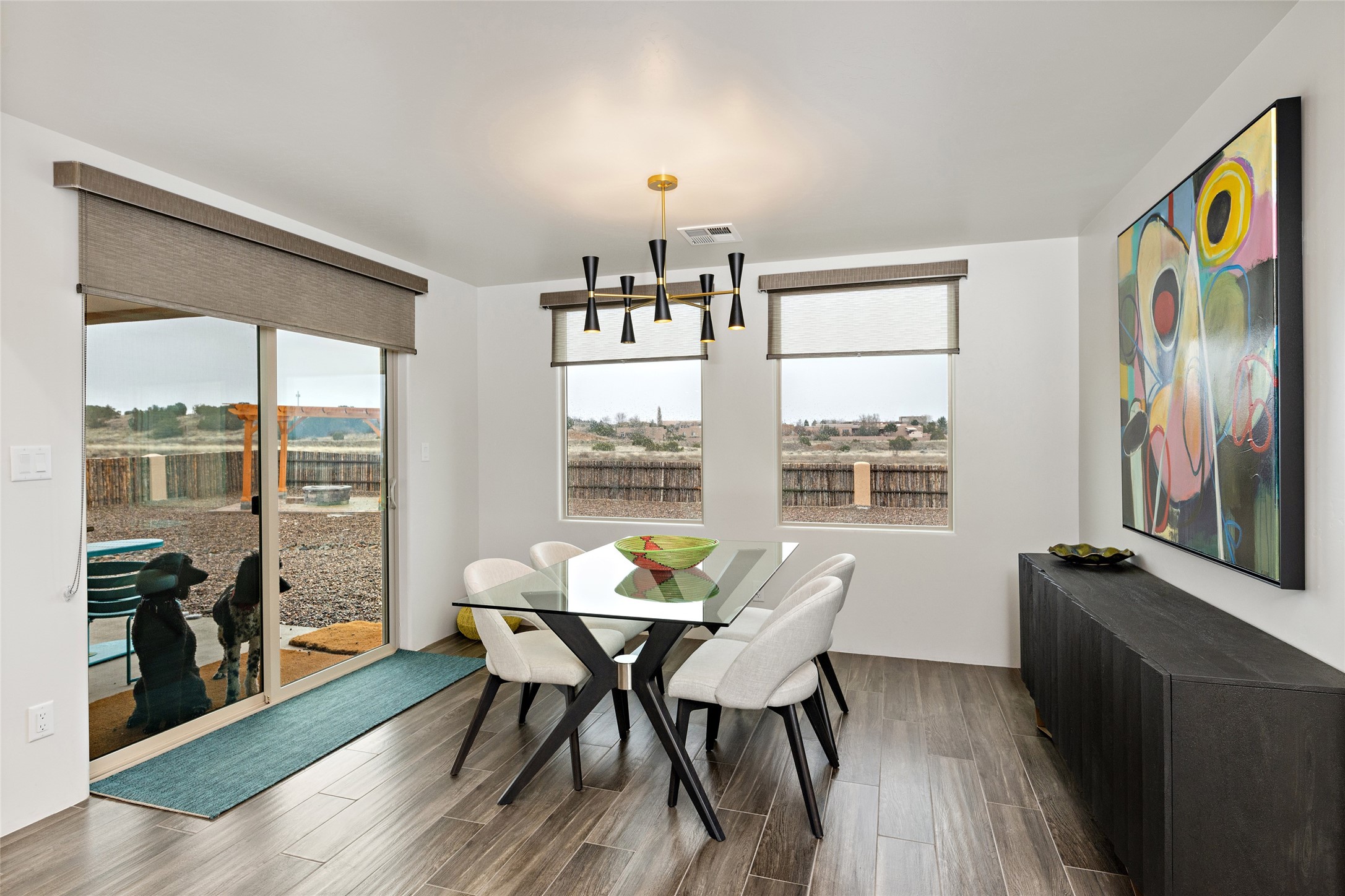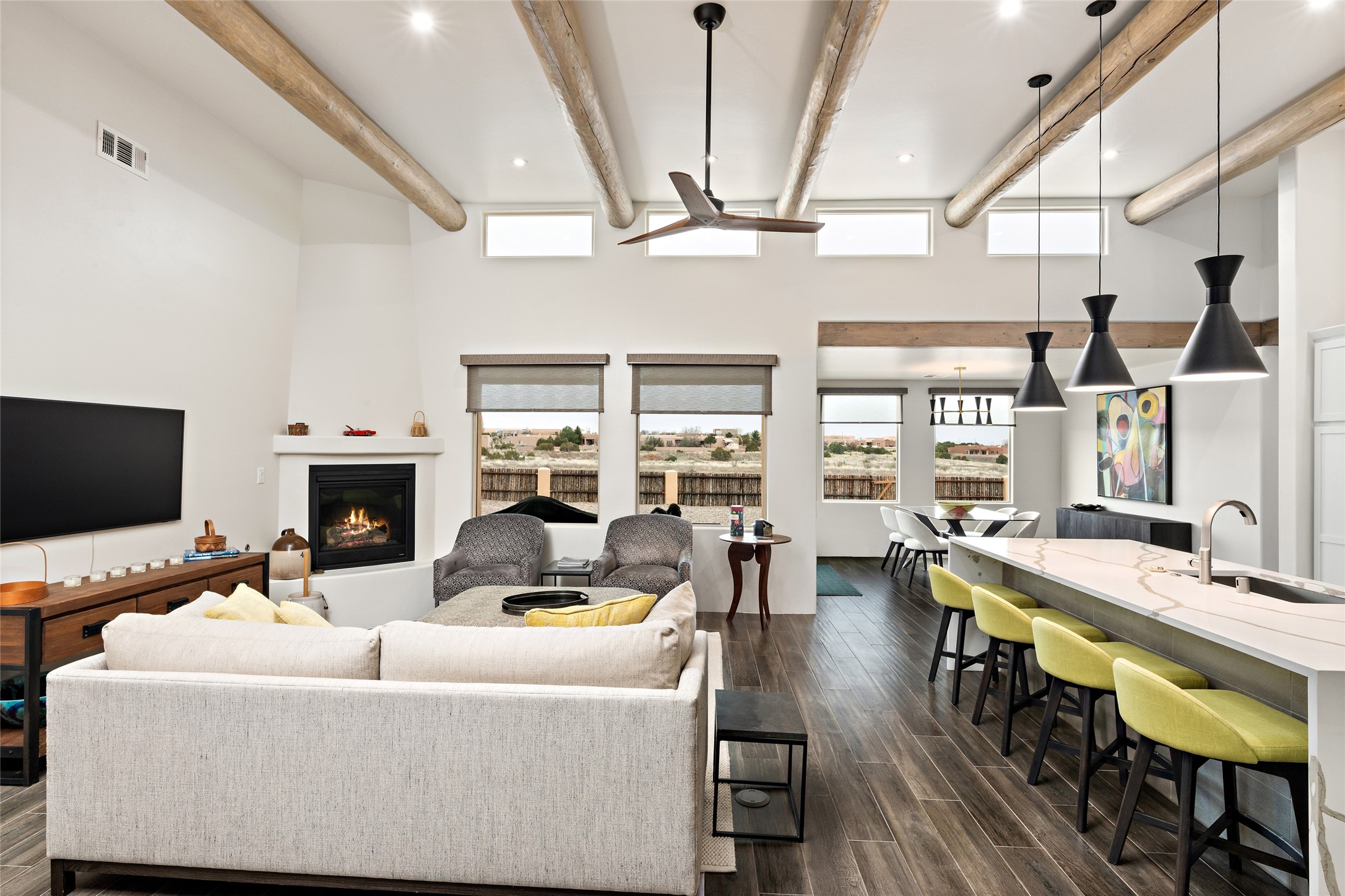 This nearly brand new 3 bedroom, 2 bathroom single level home in Oshara Village sits on nearly a third of an acre with views to the open space to the South, and easy access for walking in the arroyo. With wonderful light, high ceilings with clear story windows and a nice open floor plan, there is also perfect bedroom separation for privacy from guests or children! The main living spaces enjoy the gas kiva fireplace in the living room, a sunny dining room and fabulous kitchen with waterfall quartz countertops, Ann Sacks accent tile, big country sink, induction stove and a large walk in pantry with a wine cooler fridge. The laundry room is also adjacent to the kitchen with easy access to the garage. The two guest bedrooms share a full bath also with the upgraded quartz counter and accent tiles. The owner's bedroom has great light, en suite bath and enormous and enviable walk in closet by Elfa. The yard is fenced for your furry friends, and has a covered South face portal as well as a pergola to enjoy the sunsets by the cozy fire pit. The builder's warranty is good until mid-July and the home is a certified HERS-rated green home through energy efficiency, durability, healthy materials, sustainability and green practices. There are over $120,000 in upgrades including countertops and tile, water softener, bathroom mirrors, light fixtures, ceiling fans, appliance package and window coverings which protect from the sun to keep the house cool; as well as $35,000 of work to the yard with fencing, pergola and some plantings- plus there is also refrigerated air!