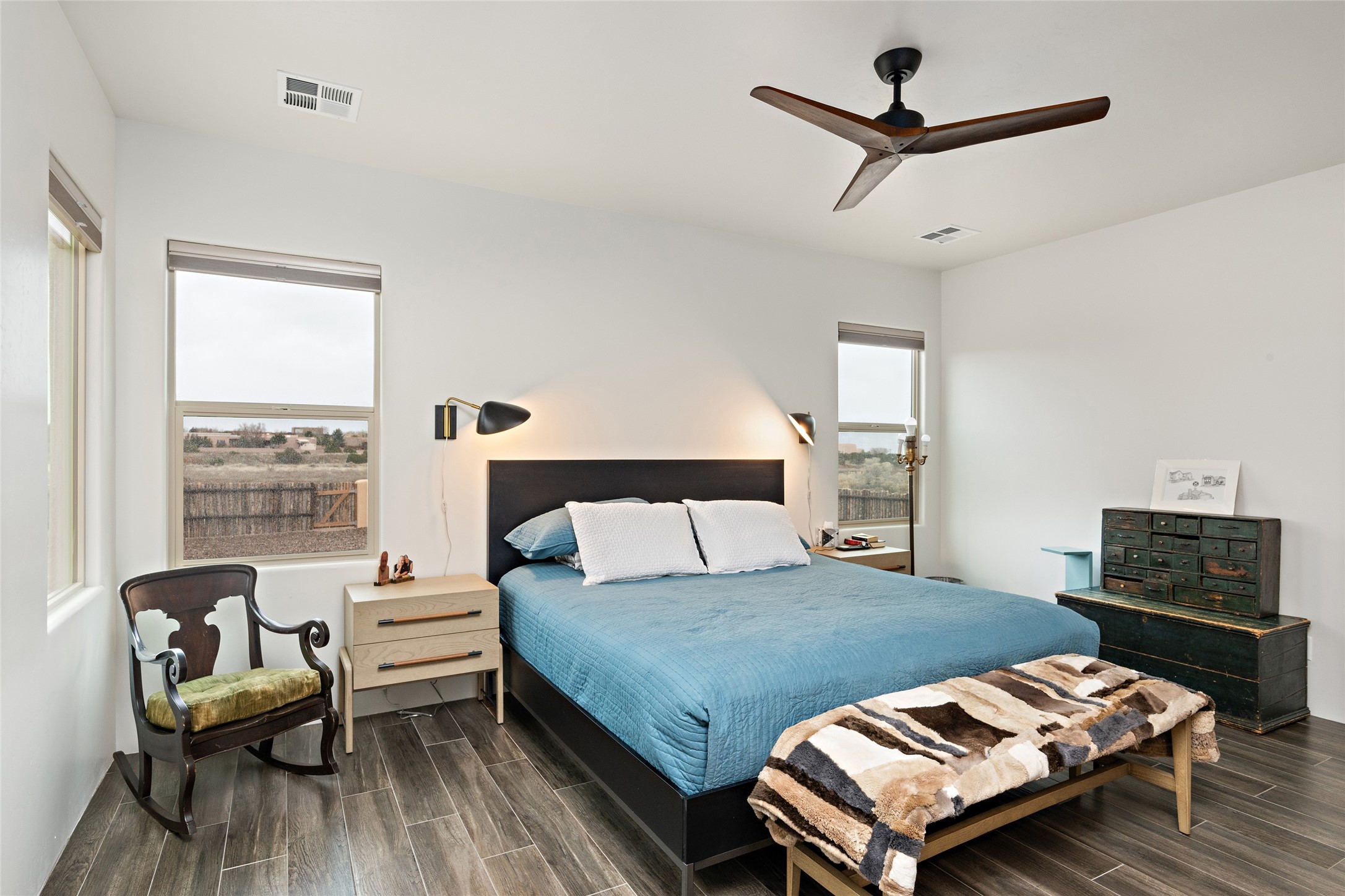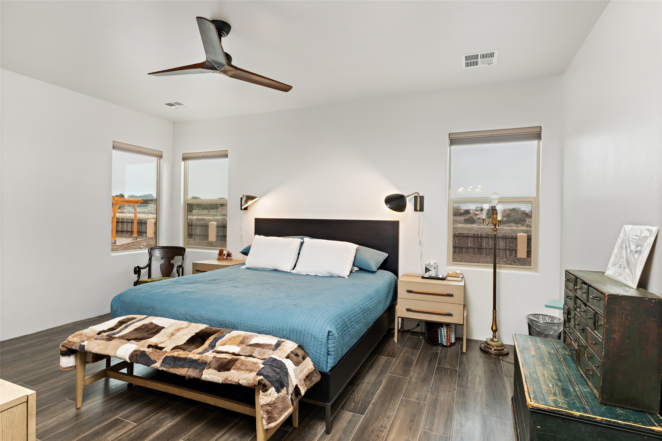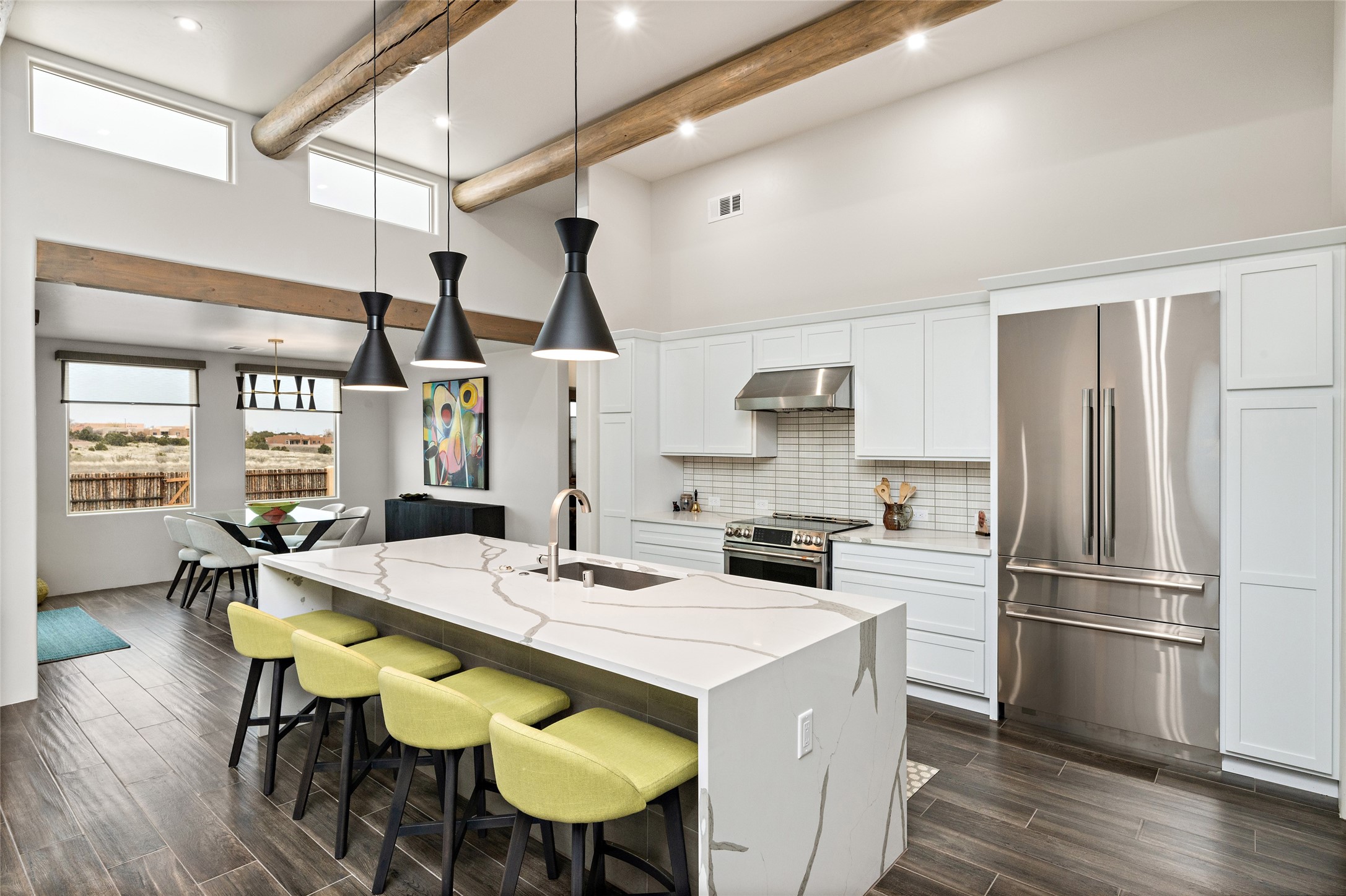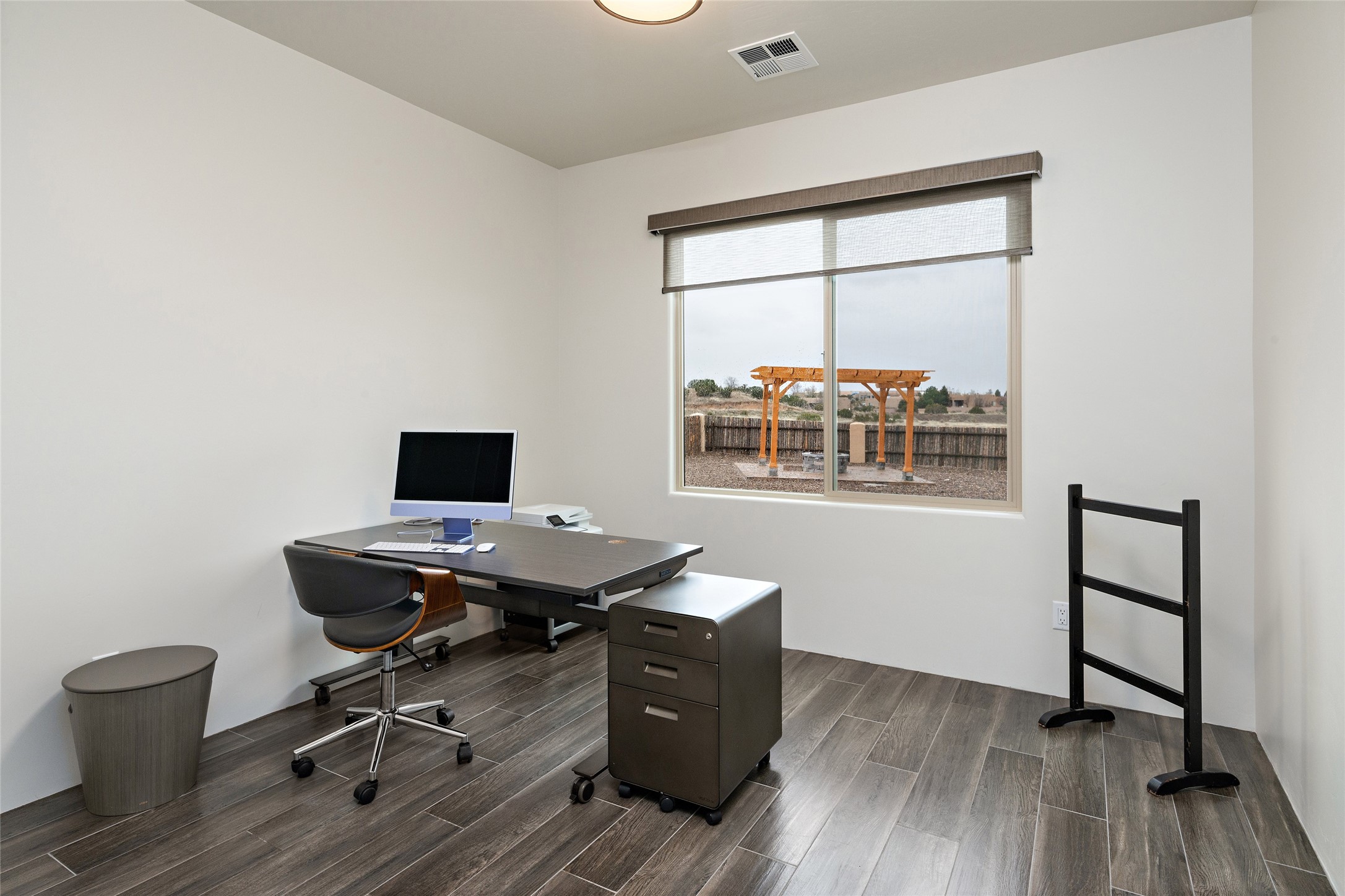 This nearly brand new 3 bedroom, 2 bathroom single level home in Oshara Village sits on nearly a third of an acre with views to the open space to the South, and easy access for walking in the arroyo. With wonderful light, high ceilings with clear story windows and a nice open floor plan, there is also perfect bedroom separation for privacy from guests or children! The main living spaces enjoy the gas kiva fireplace in the living room, a sunny dining room and fabulous kitchen with waterfall quartz countertops, Ann Sacks accent tile, big country sink, induction stove and a large walk in pantry with a wine cooler fridge. The laundry room is also adjacent to the kitchen with easy access to the garage. The two guest bedrooms share a full bath also with the upgraded quartz counter and accent tiles. The owner's bedroom has great light, en suite bath and enormous and enviable walk in closet by Elfa. The yard is fenced for your furry friends, and has a covered South face portal as well as a pergola to enjoy the sunsets by the cozy fire pit. The builder's warranty is good until mid-July and the home is a certified HERS-rated green home through energy efficiency, durability, healthy materials, sustainability and green practices. There are over $120,000 in upgrades including countertops and tile, water softener, bathroom mirrors, light fixtures, ceiling fans, appliance package and window coverings which protect from the sun to keep the house cool; as well as $35,000 of work to the yard with fencing, pergola and some plantings- plus there is also refrigerated air!