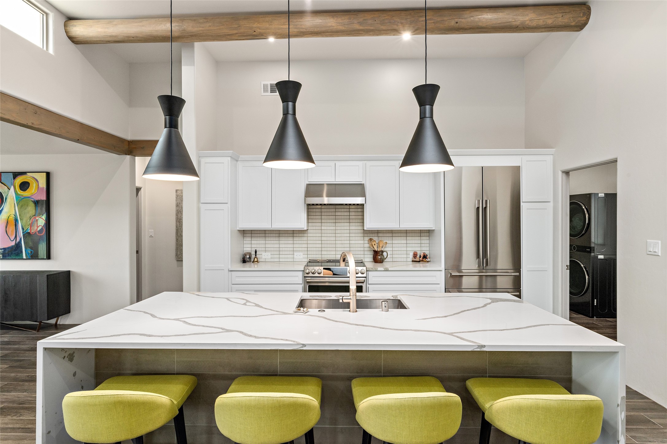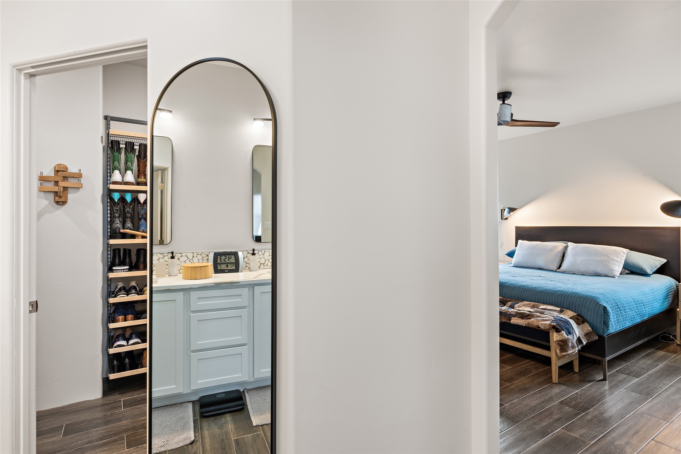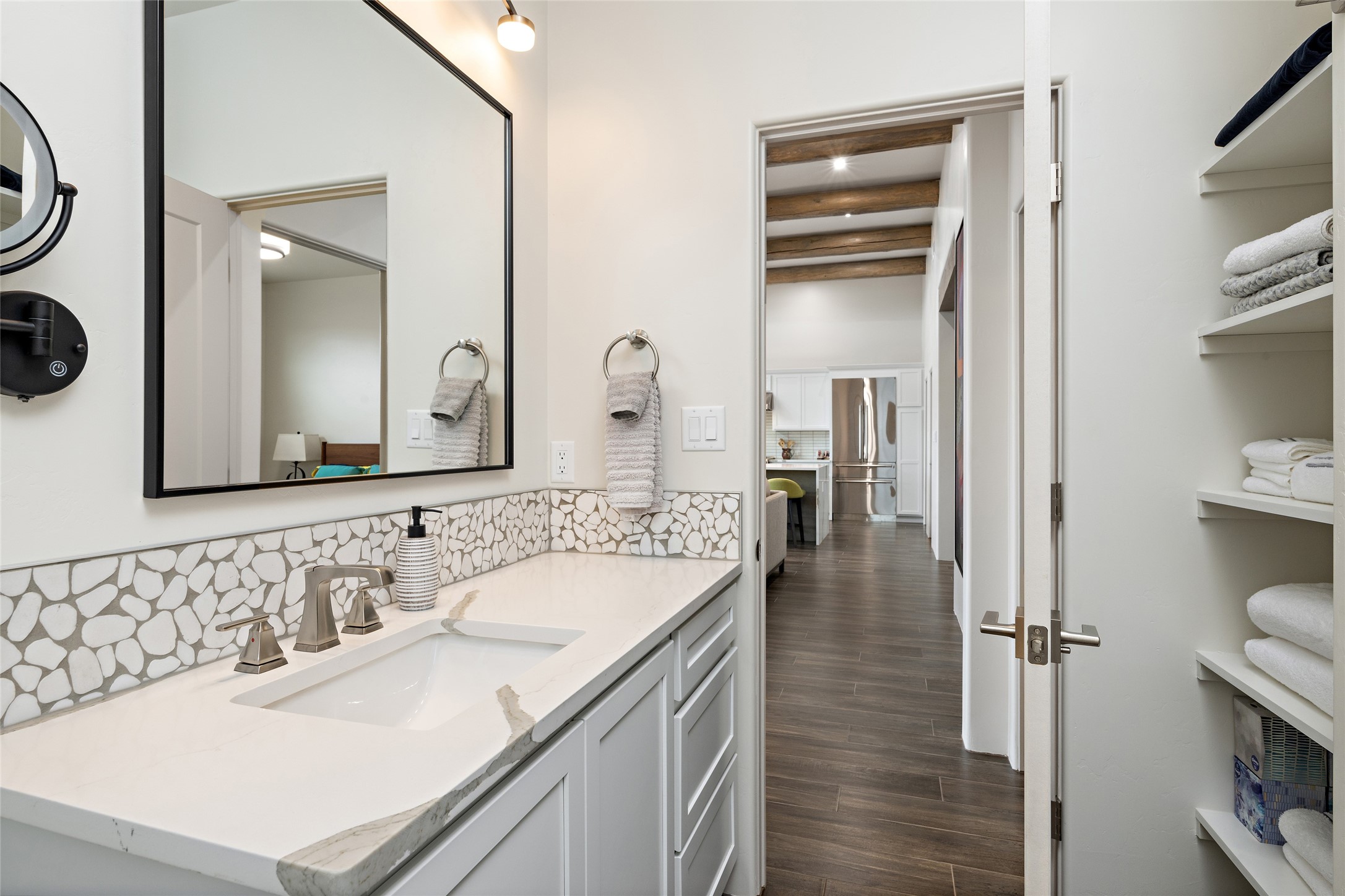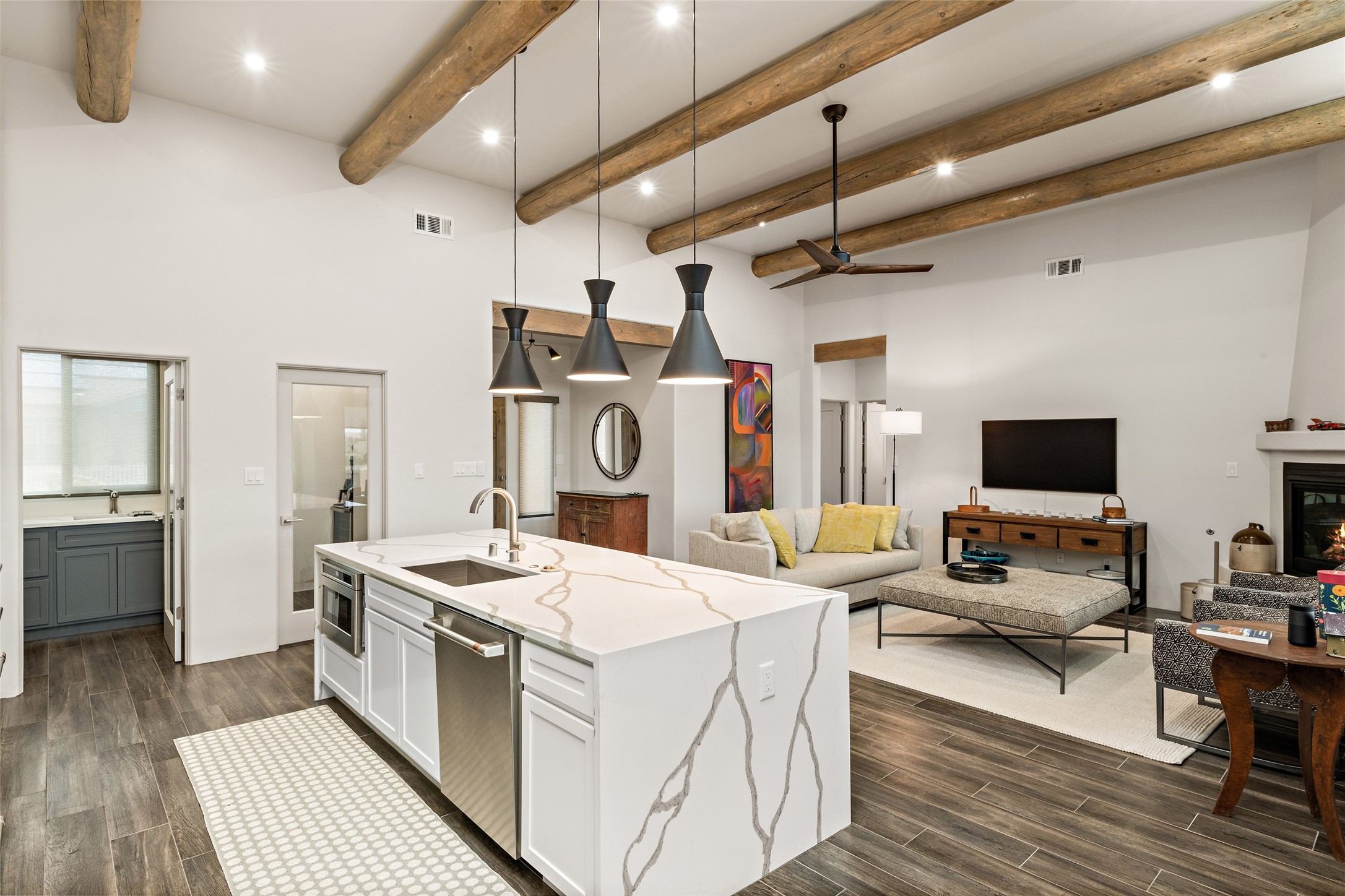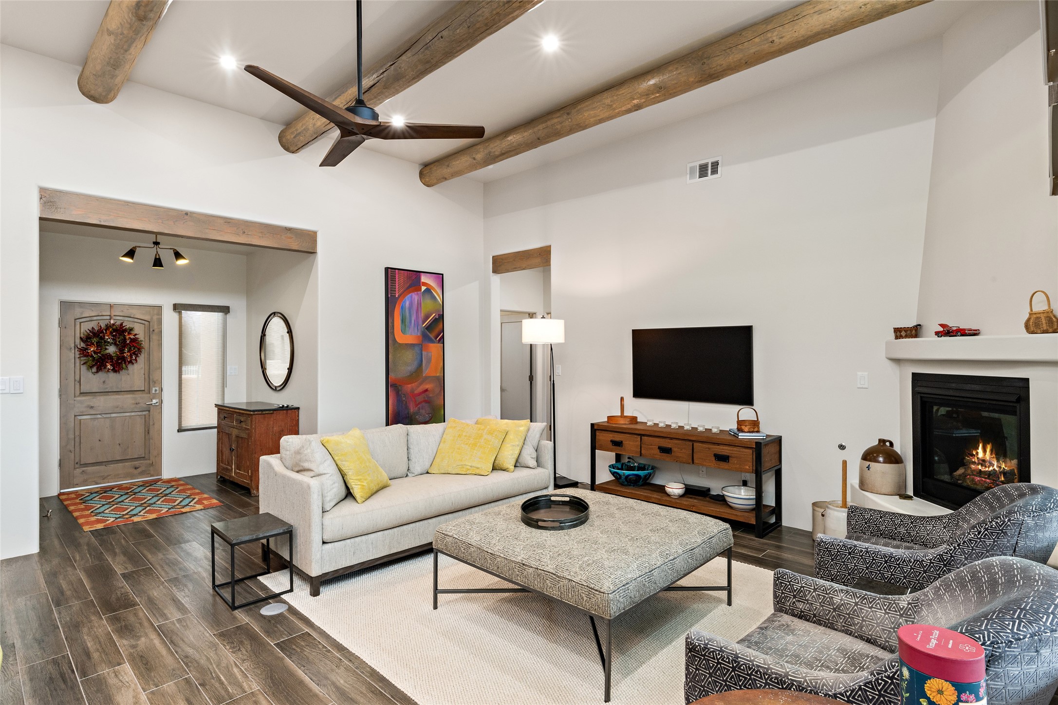 This nearly brand new 3 bedroom, 2 bathroom single level home in Oshara Village sits on nearly a third of an acre with views to the open space to the South, and easy access for walking in the arroyo. With wonderful light, high ceilings with clear story windows and a nice open floor plan, there is also perfect bedroom separation for privacy from guests or children! The main living spaces enjoy the gas kiva fireplace in the living room, a sunny dining room and fabulous kitchen with waterfall quartz countertops, Ann Sacks accent tile, big country sink, induction stove and a large walk in pantry with a wine cooler fridge. The laundry room is also adjacent to the kitchen with easy access to the garage. The two guest bedrooms share a full bath also with the upgraded quartz counter and accent tiles. The owner's bedroom has great light, en suite bath and enormous and enviable walk in closet by Elfa. The yard is fenced for your furry friends, and has a covered South face portal as well as a pergola to enjoy the sunsets by the cozy fire pit. The builder's warranty is good until mid-July and the home is a certified HERS-rated green home through energy efficiency, durability, healthy materials, sustainability and green practices. There are over $120,000 in upgrades including countertops and tile, water softener, bathroom mirrors, light fixtures, ceiling fans, appliance package and window coverings which protect from the sun to keep the house cool; as well as $35,000 of work to the yard with fencing, pergola and some plantings- plus there is also refrigerated air!