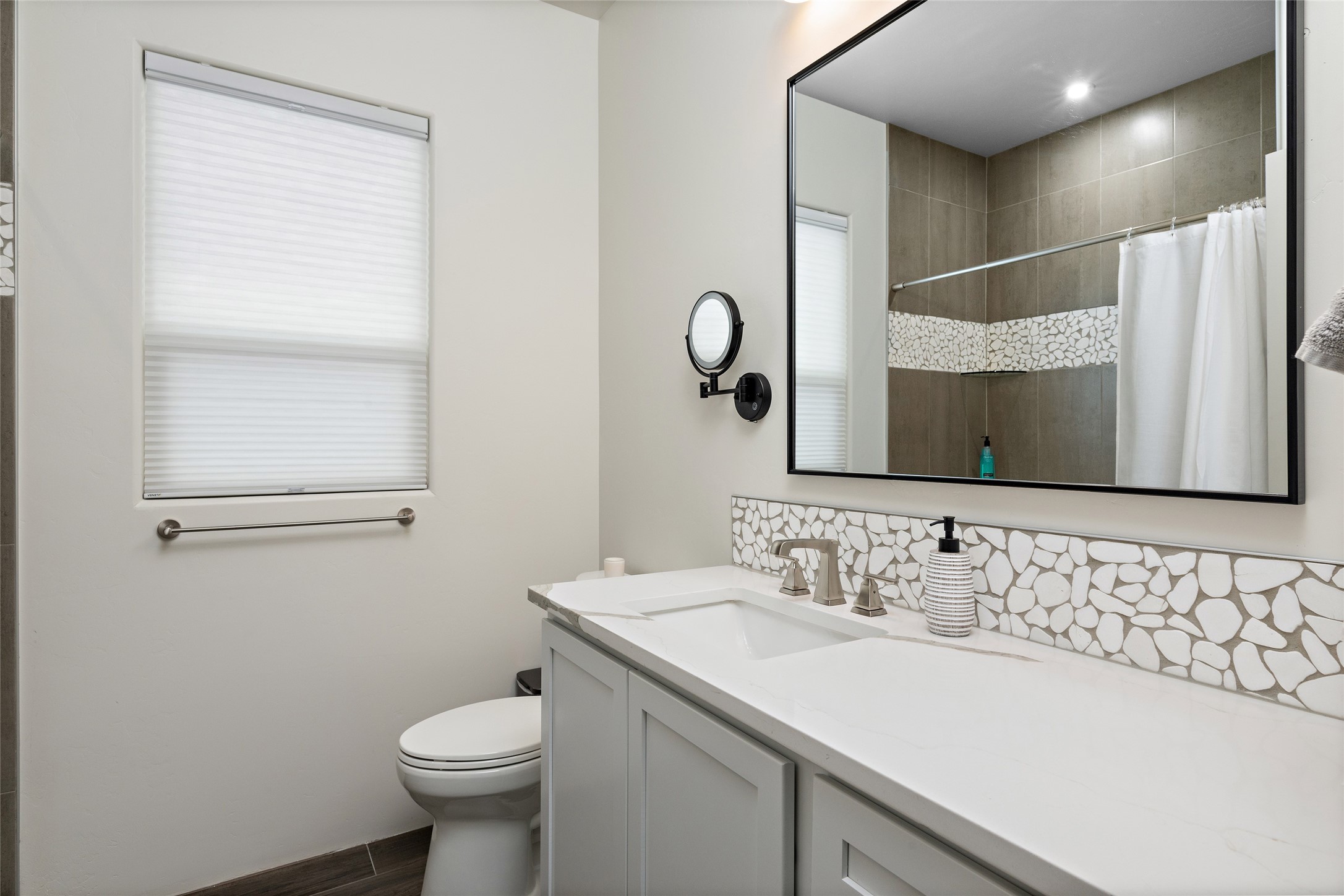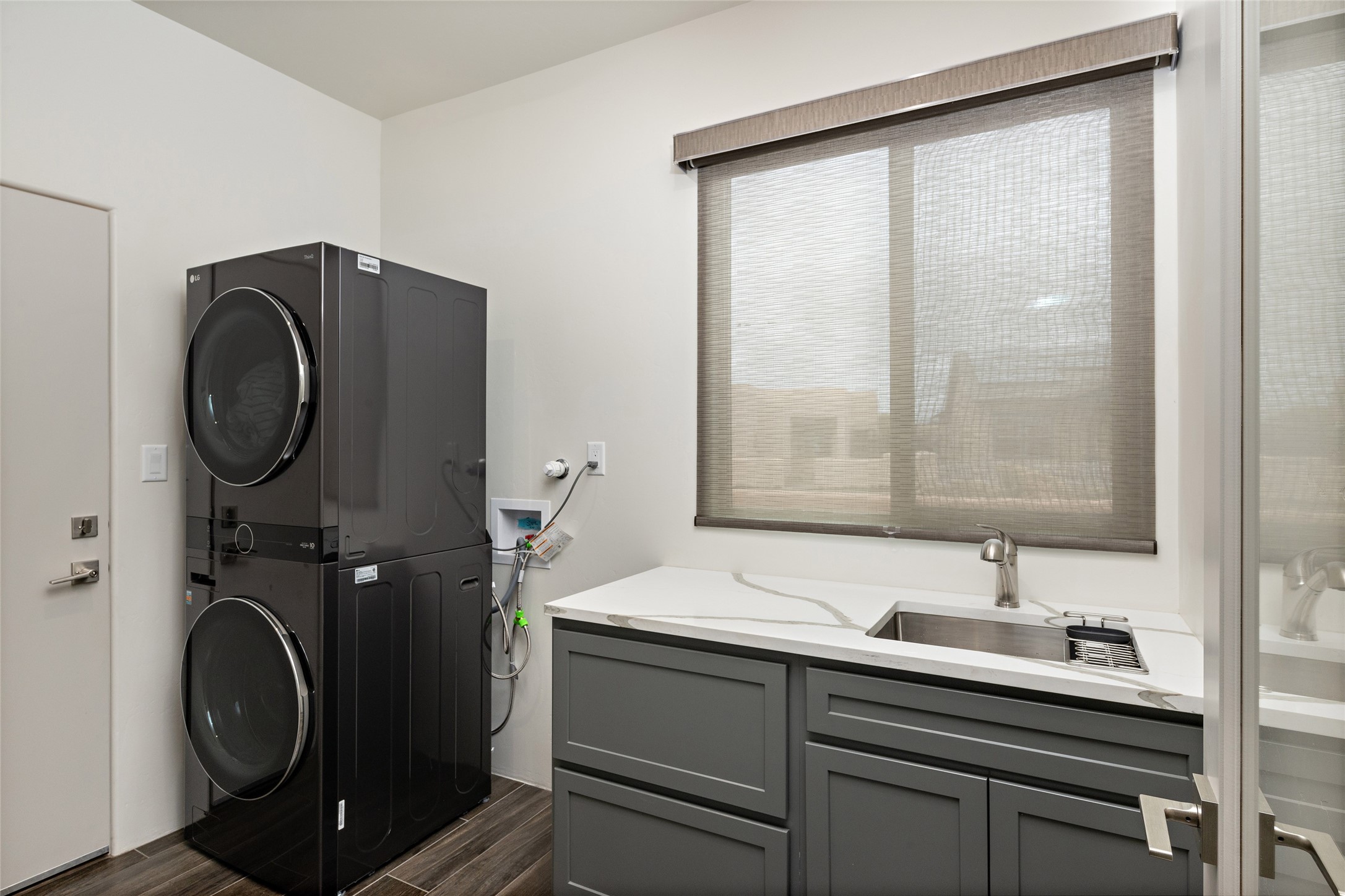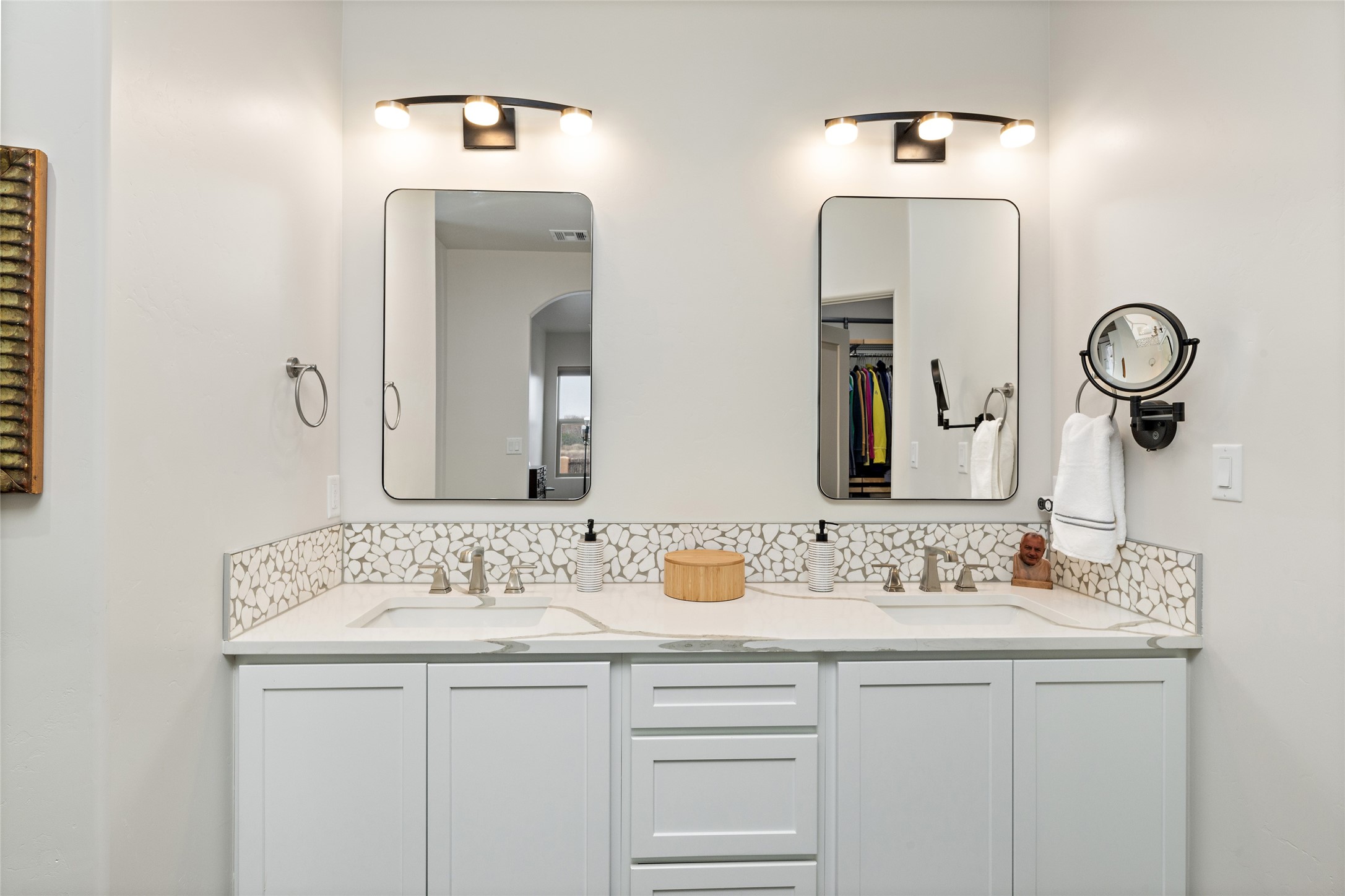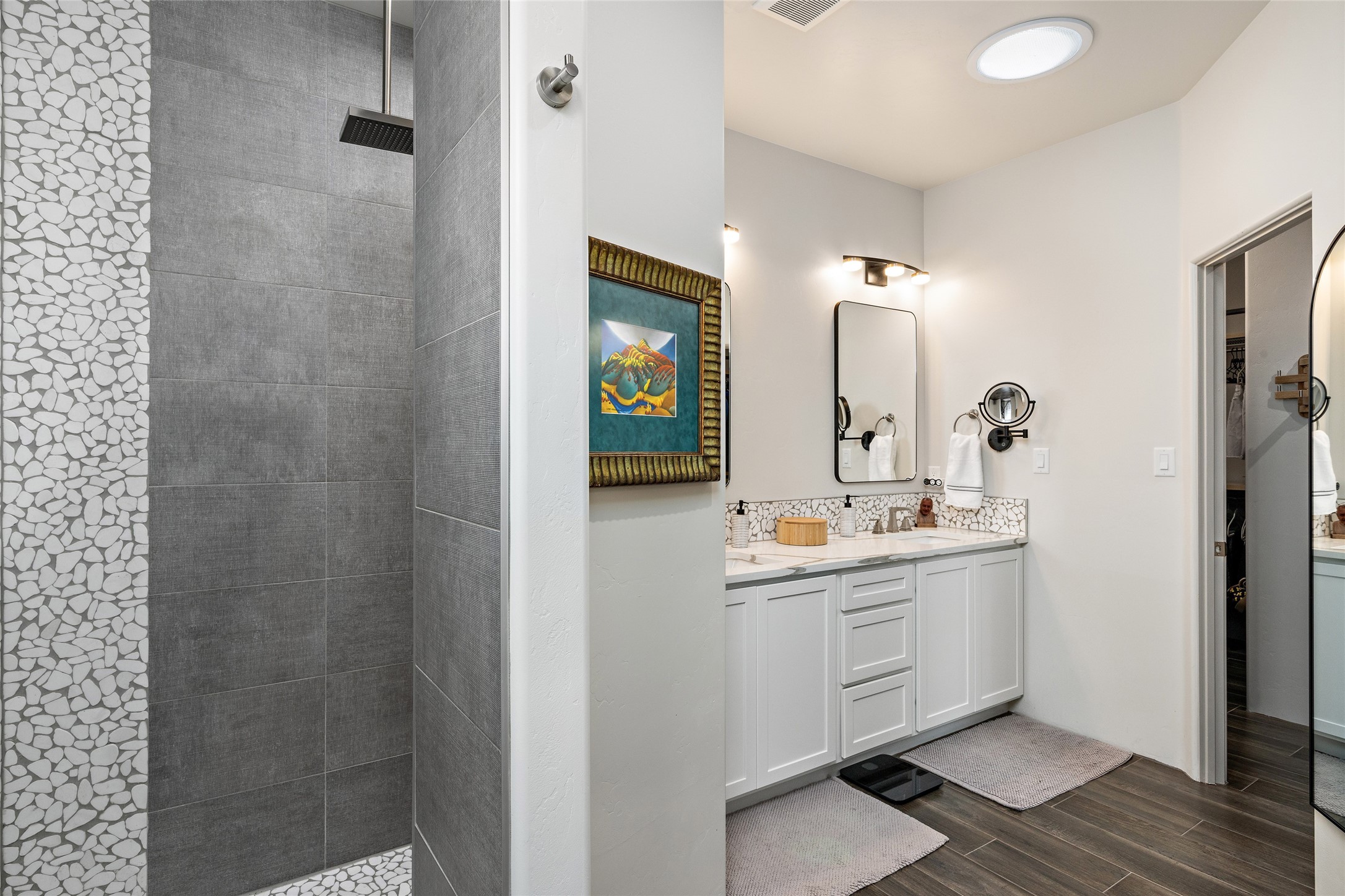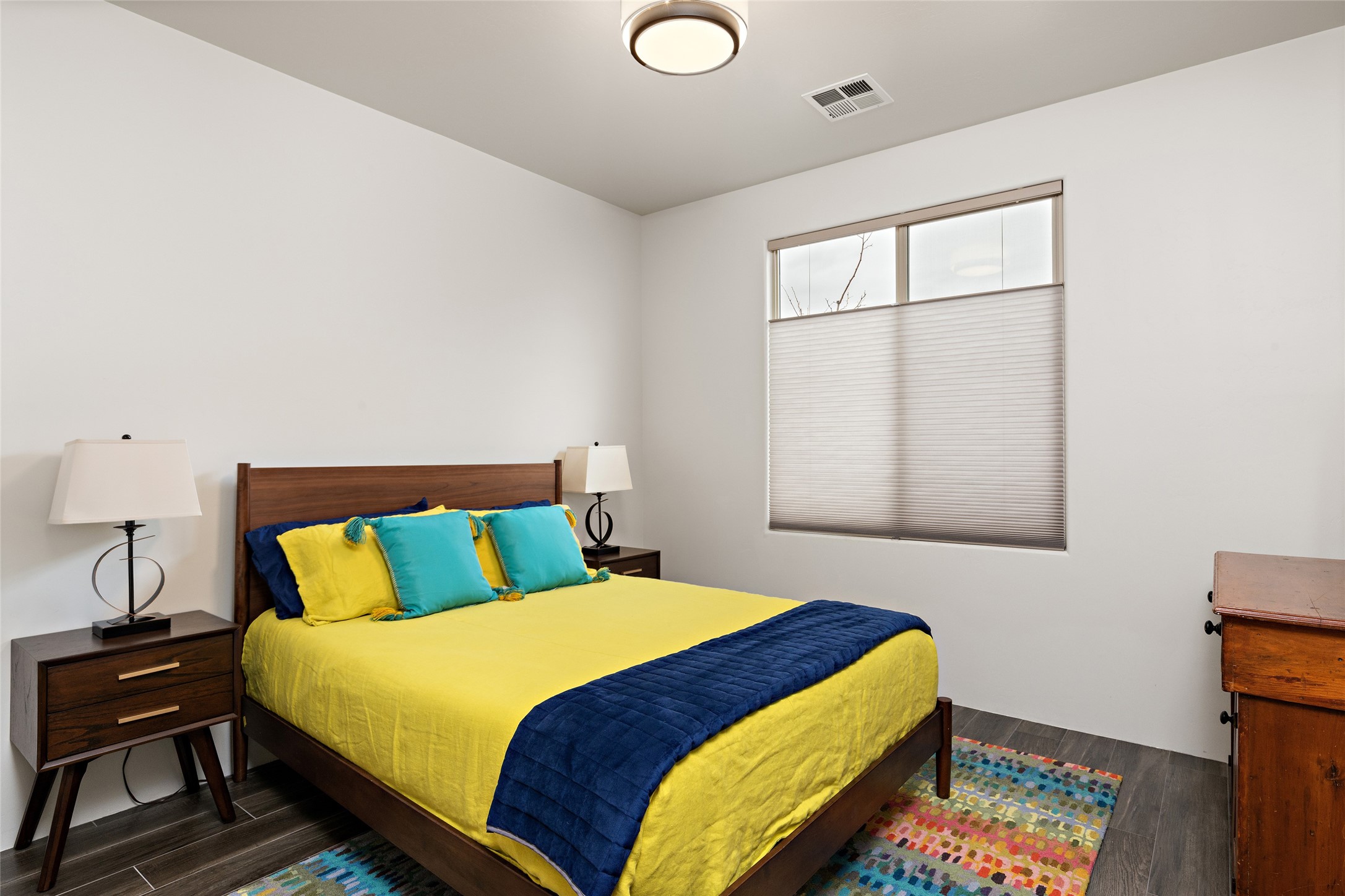 This nearly brand new 3 bedroom, 2 bathroom single level home in Oshara Village sits on nearly a third of an acre with views to the open space to the South, and easy access for walking in the arroyo. With wonderful light, high ceilings with clear story windows and a nice open floor plan, there is also perfect bedroom separation for privacy from guests or children! The main living spaces enjoy the gas kiva fireplace in the living room, a sunny dining room and fabulous kitchen with waterfall quartz countertops, Ann Sacks accent tile, big country sink, induction stove and a large walk in pantry with a wine cooler fridge. The laundry room is also adjacent to the kitchen with easy access to the garage. The two guest bedrooms share a full bath also with the upgraded quartz counter and accent tiles. The owner's bedroom has great light, en suite bath and enormous and enviable walk in closet by Elfa. The yard is fenced for your furry friends, and has a covered South face portal as well as a pergola to enjoy the sunsets by the cozy fire pit. The builder's warranty is good until mid-July and the home is a certified HERS-rated green home through energy efficiency, durability, healthy materials, sustainability and green practices. There are over $120,000 in upgrades including countertops and tile, water softener, bathroom mirrors, light fixtures, ceiling fans, appliance package and window coverings which protect from the sun to keep the house cool; as well as $35,000 of work to the yard with fencing, pergola and some plantings- plus there is also refrigerated air!