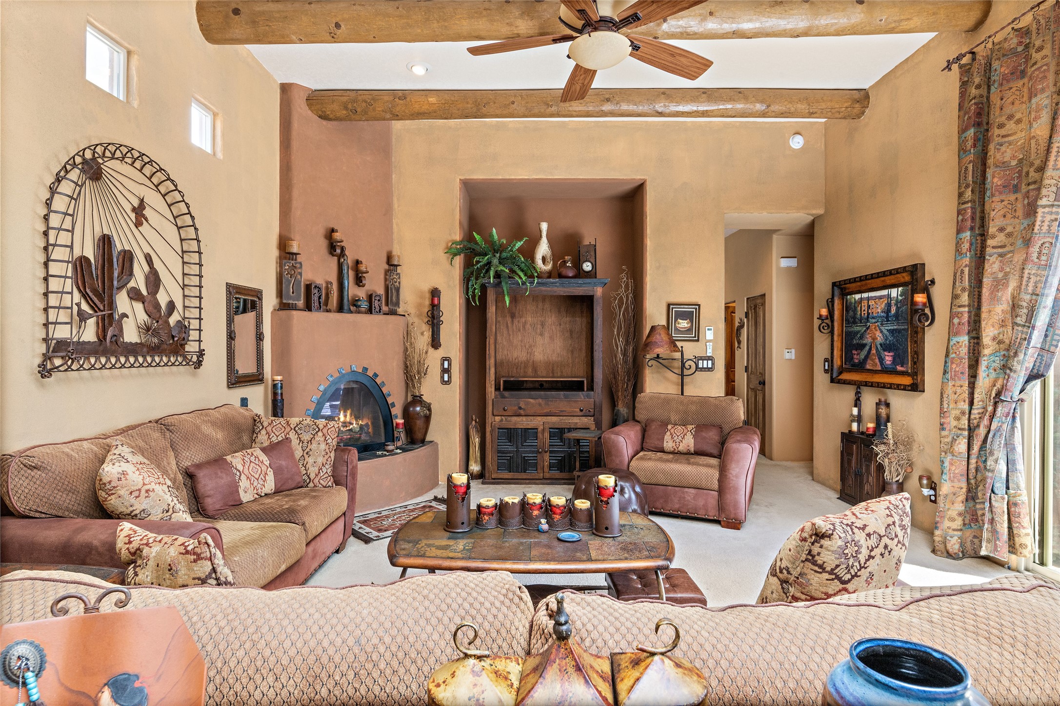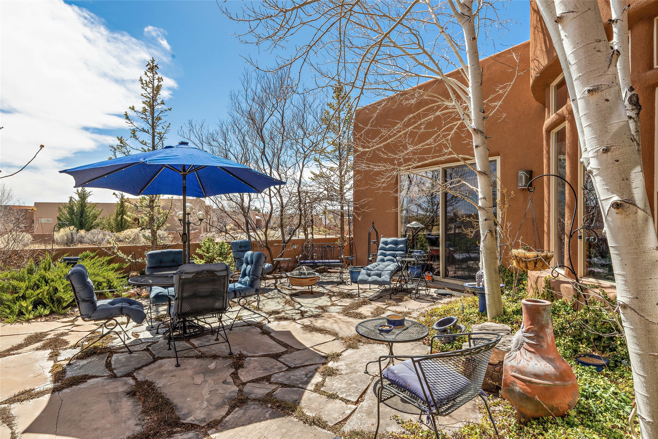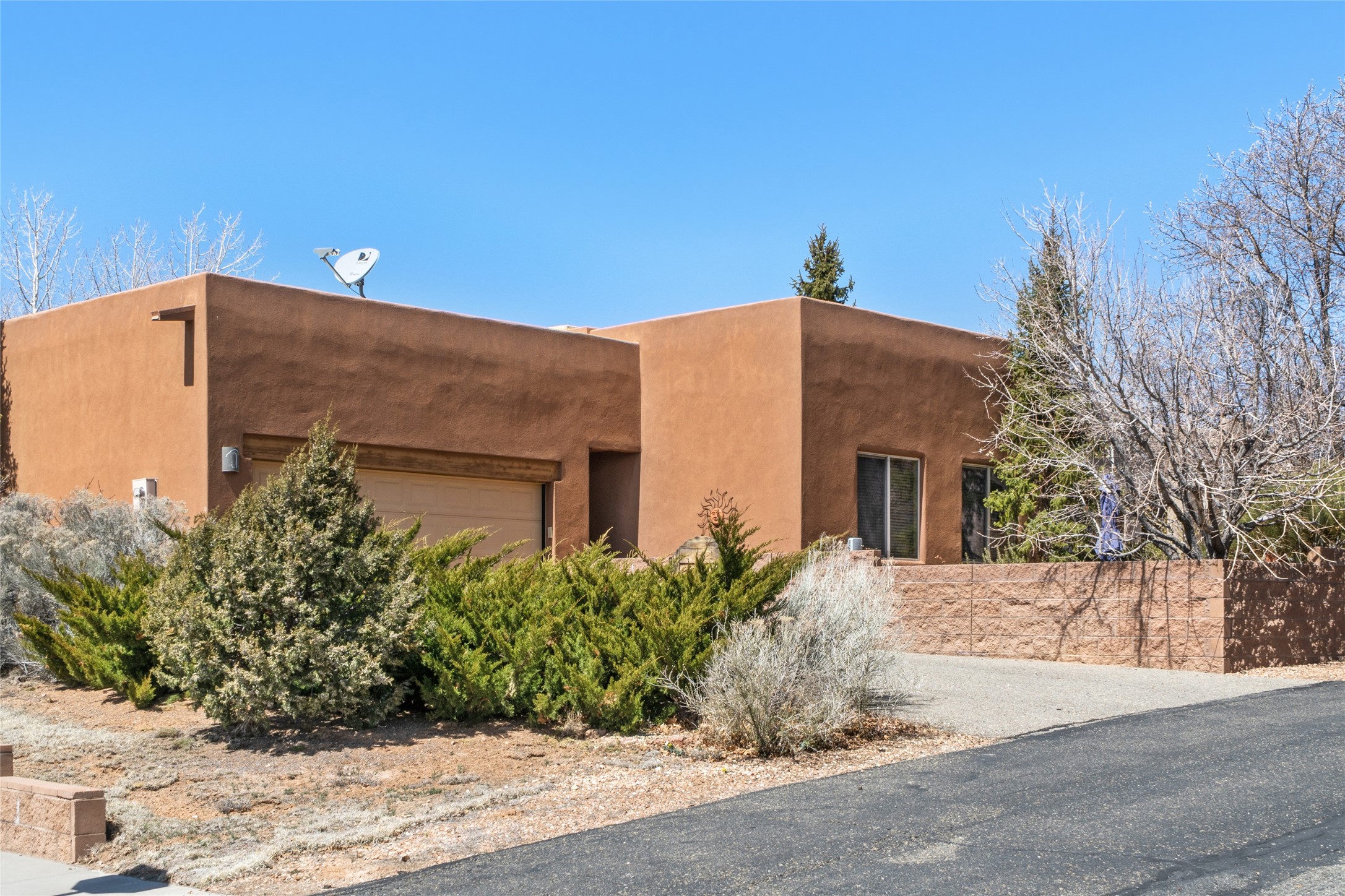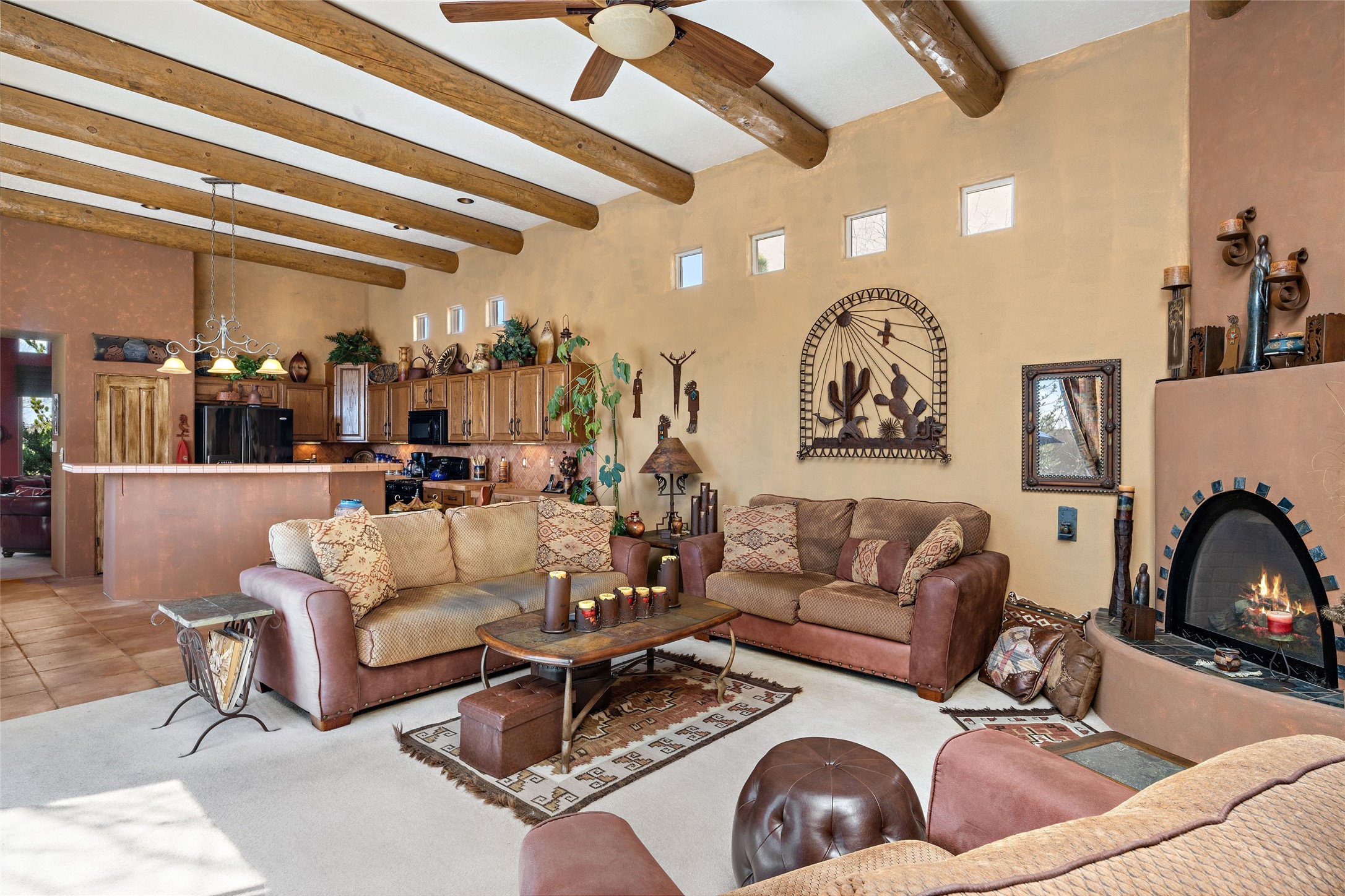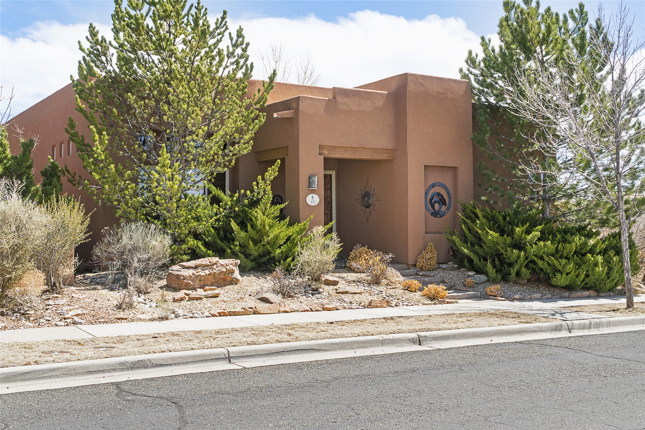 This Rancho Viejo home sits on a corner South facing lot just a block from a large green space, and has the walking trails right out your door! With 3 bedrooms and 2 full baths, it is the perfect size and has wonderful bedroom separation, and a nice office space. The main bedroom has ensuite bath with large tub and grand walk in closet, as well as doors to the lovely landscaped flagstone patio. With both a formal living room and a family room with a kiva fireplace that is open and adjacent to the kitchen, a fun circular dining room as well as a breakfast nook in the kitchen/family room; there are many options for places to sit, read, eat and entertain! The kitchen/family room opens also to the South facing patio for indoor/outdoor living nearly year round! At the back of the house is the multipurpose study, office or media room; as well as the two guest bedrooms which share a large full bath with double sinks. Leading to the attached garage is the laundry room and also access to the rear flagstone patio facing East and South. There are no steps in the home and the high ceilings, vigas and Southern exposure provide a nice light, bright atmosphere with a Southwestern vibe. MOTIVATED SELLER!