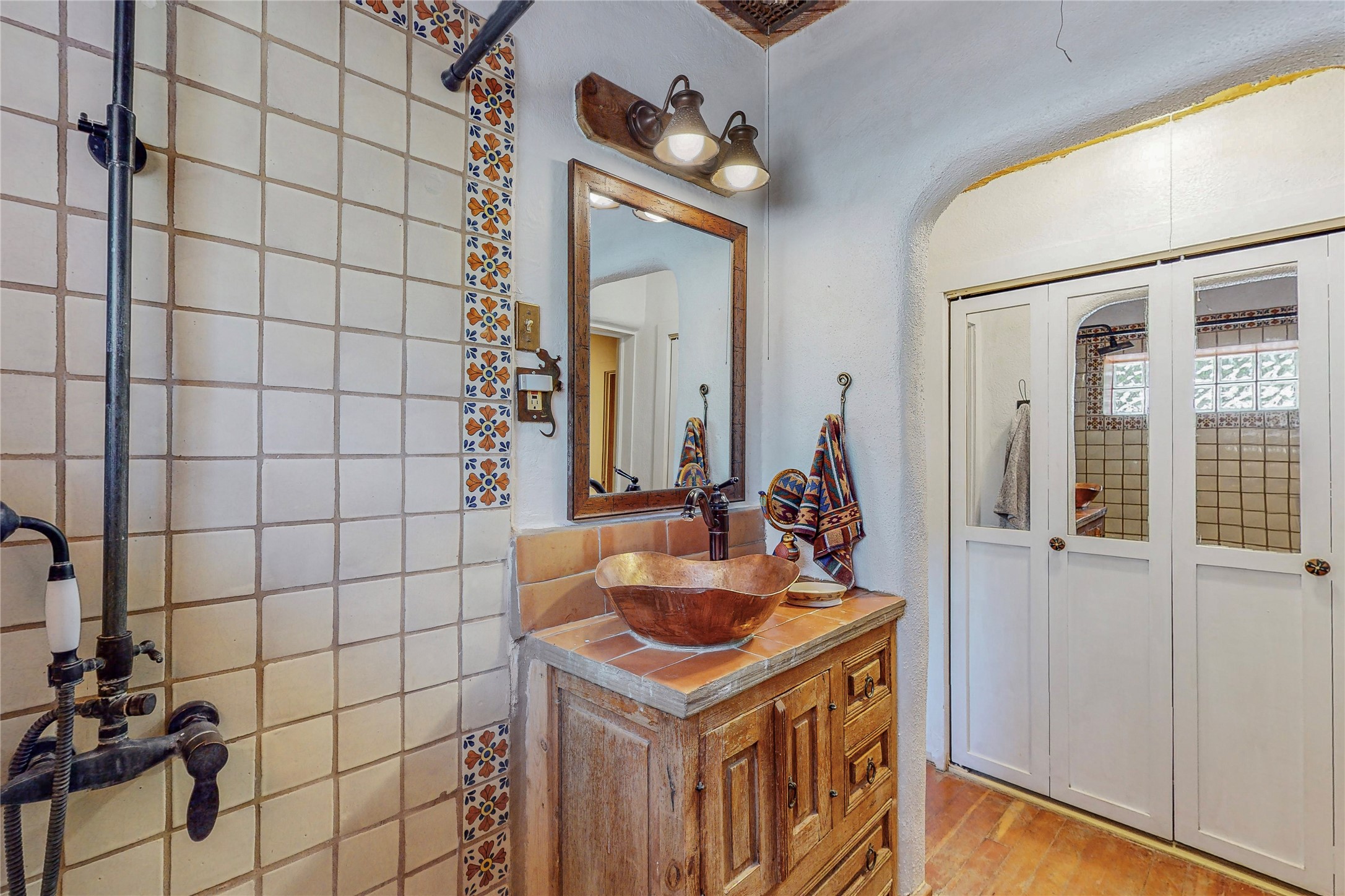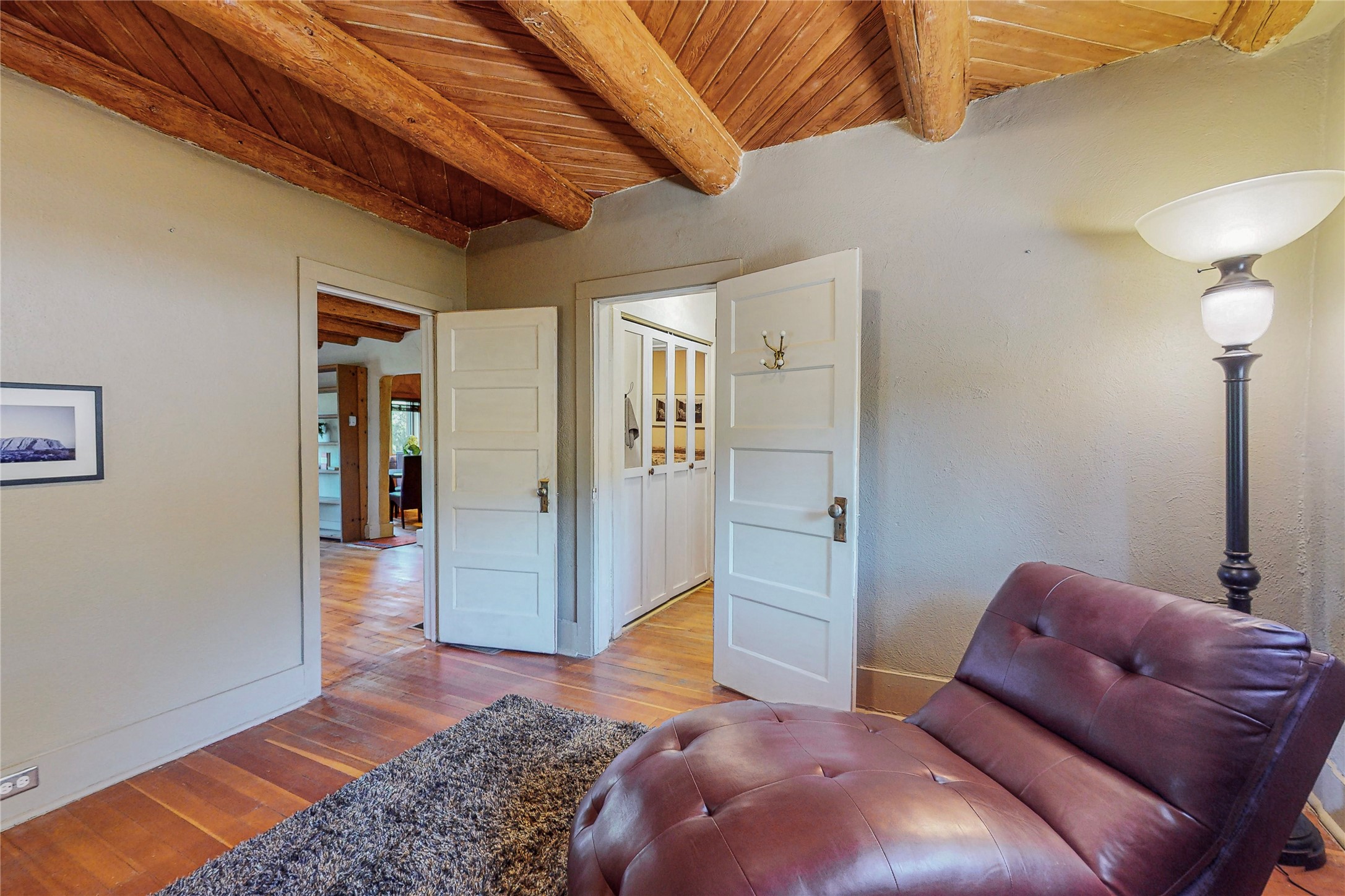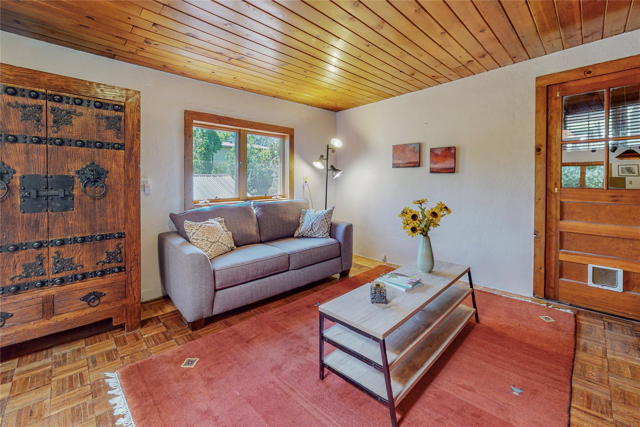 Classic Northern New Mexico style adobe gem listed for sale. The property features many upgrades including a fully fenced/walled lot with two access gates from paved NM Hwy 63, vigas and beams, tongue and groove ceilings, extensive landscaping, a fountain, an horno, a bricked terrace with great views, and a carport. Entering from the graveled driveway to covered porch overlooking one of the gardens and fountain one enters the home through a custom wooden door. The living room has recently sanded and sealed floors, corner kiva fireplace, views to the ridge above the Pecos River, bookshelf and openings to the office/2nd bedroom and dining room. The bathroom has be renovated and adjoins both bedrooms. The large recently remodeled country kitchen has stainless steel appliances - refrigerator/dishwasher/stove, copper sink, expansive seating area, new cabinets and adjoins the laundry room. There is a lower level with a den, bath, a small room that with a closet could be a bedroom or an office, separate entrance as well as a large unfinished "basement" for ample storage or renovation possibilities. There is radon mitigation in place. There is a stand alone shed/work shop that is a bonus. Come see this beautiful property today!