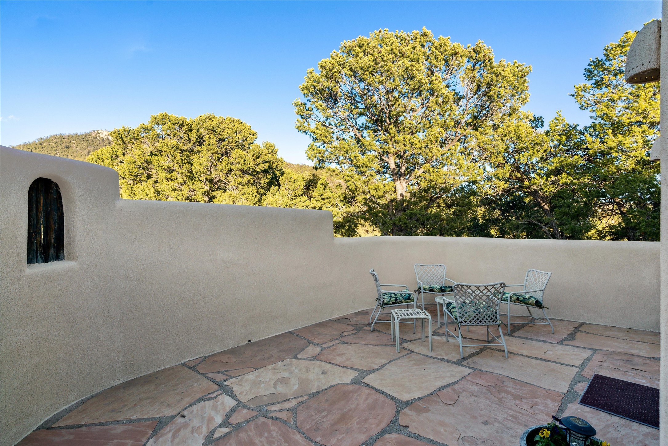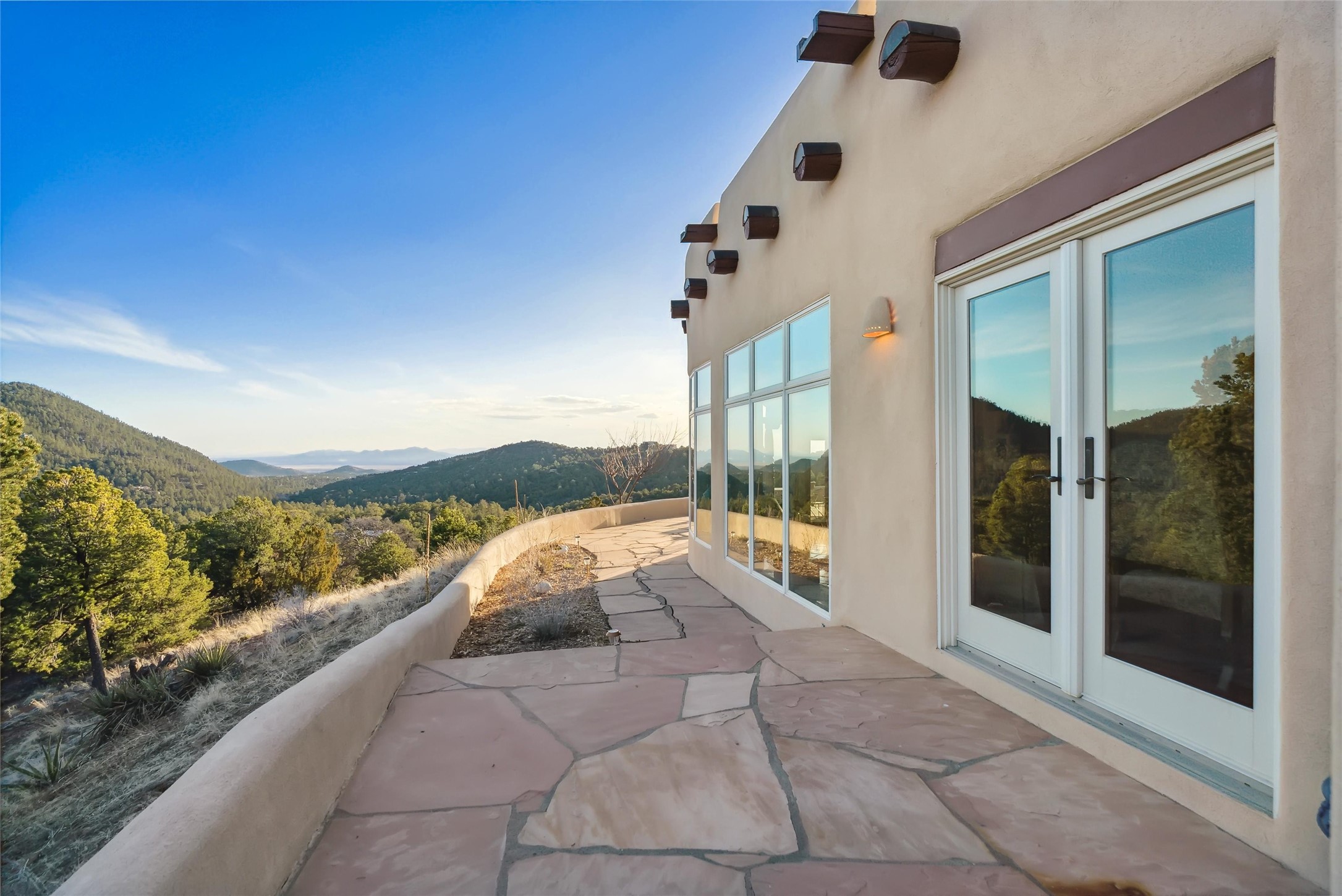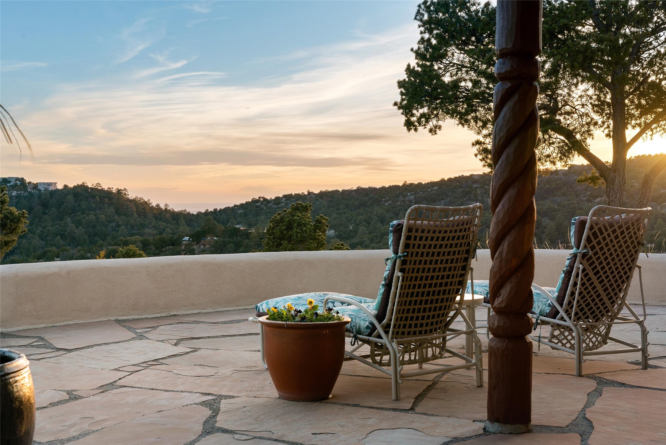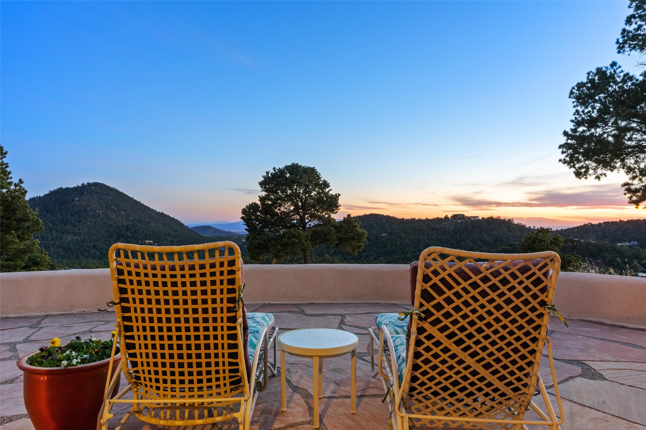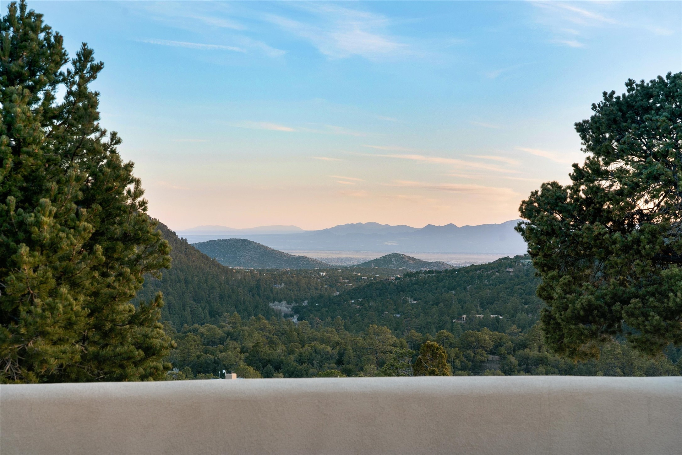 With Breathtaking Views, and Peace and Quiet inside and out, you may never want to leave your Mountain Paradise in this Old Santa Fe Trail neighborhood! As you step inside, you'll be greeted by a Wall of Windows beckoning you out to the Grand Patio that extends across the home. But wait! The Warm Glow of the Viga & Latilla ceilings, and the lavish, recently refinished Diamond Plaster walls, and Banco Seating encourage you to cocoon inside. Here, the open floor plan is perfect for entertaining guests, relaxing with family, or in the solitude of your retreat.The four Spacious Bedrooms present a host of possibilities. The Primary Suite is in its own wing, and features your personal Jetted Spa Tub that looks out onto Forever. The smart design anticipated the possibility of a Guest Wing or Attached Casita at the other side of the home. Here, two rooms share a bathroom. Yes, both could be bedrooms, or, add a kitchenette, small table, and sofa to the room currently featured as an office and it is Private Living Space. A Private Courtyard with a Separate Entrance off that side of the home is the perfect spot to enjoy morning coffee or unwind after a long day. Your guests, mom, or kids may never want to leave! In fact, you may want to build them a separate casita of their own, and plans were made for that too. This home is truly a masterpiece, with every detail carefully crafted to create a luxurious AND comfortable living space. Escape to Home. And if you do decide to venture off Mountain, it's just 10 minutes from two iconic Santa Fe restaurants, and a short drive to the Santa Fe Plaza!