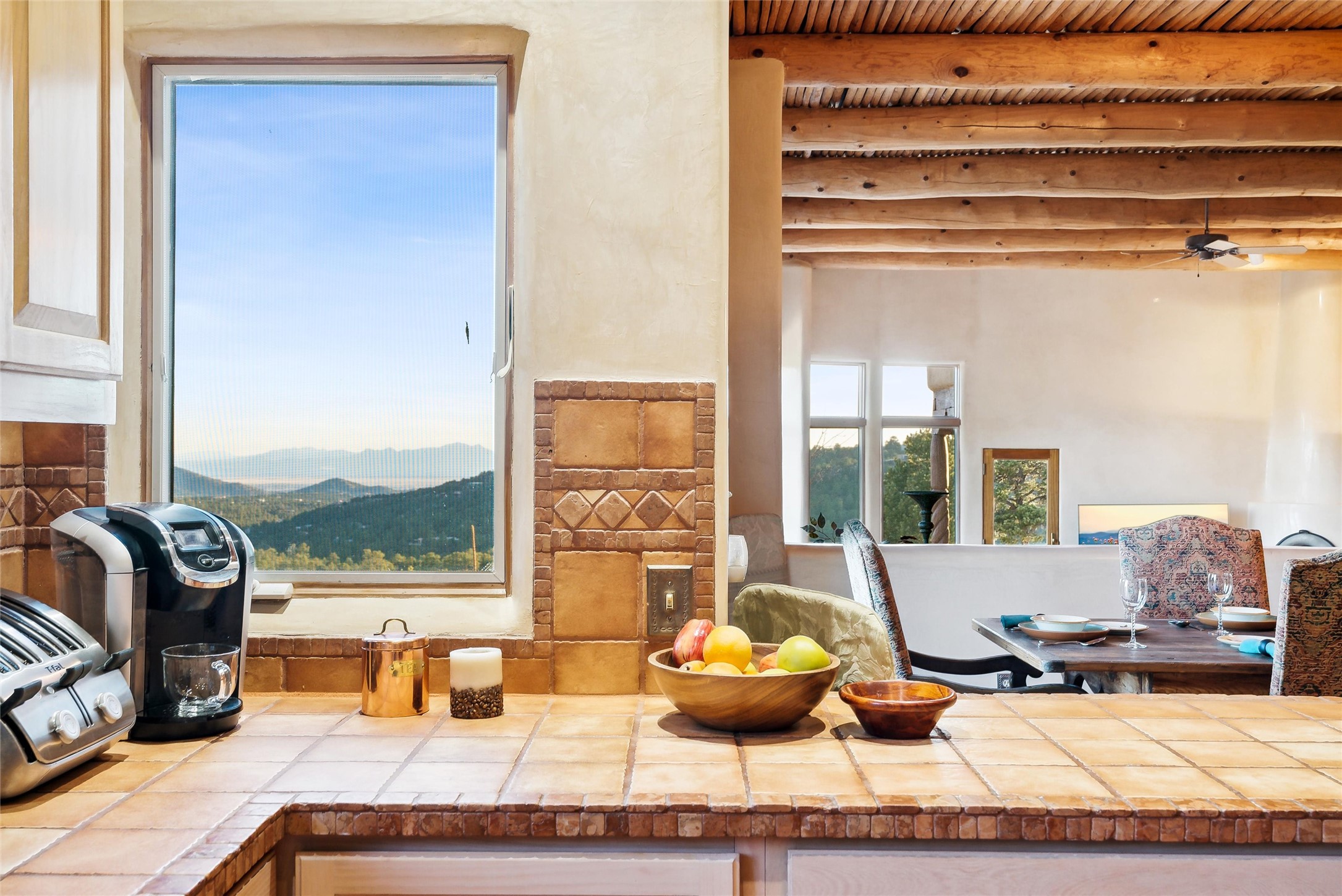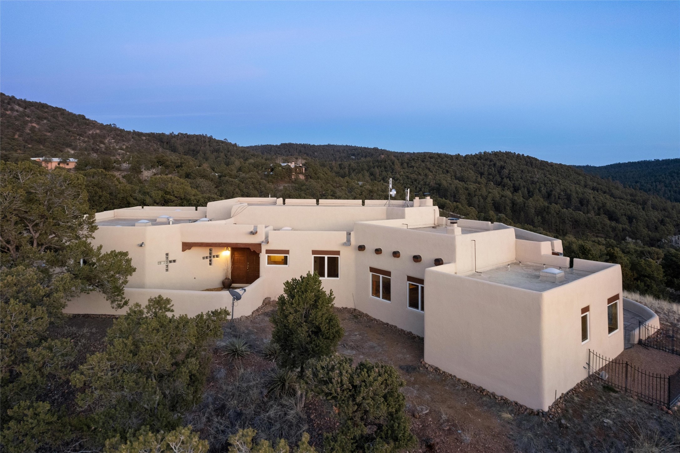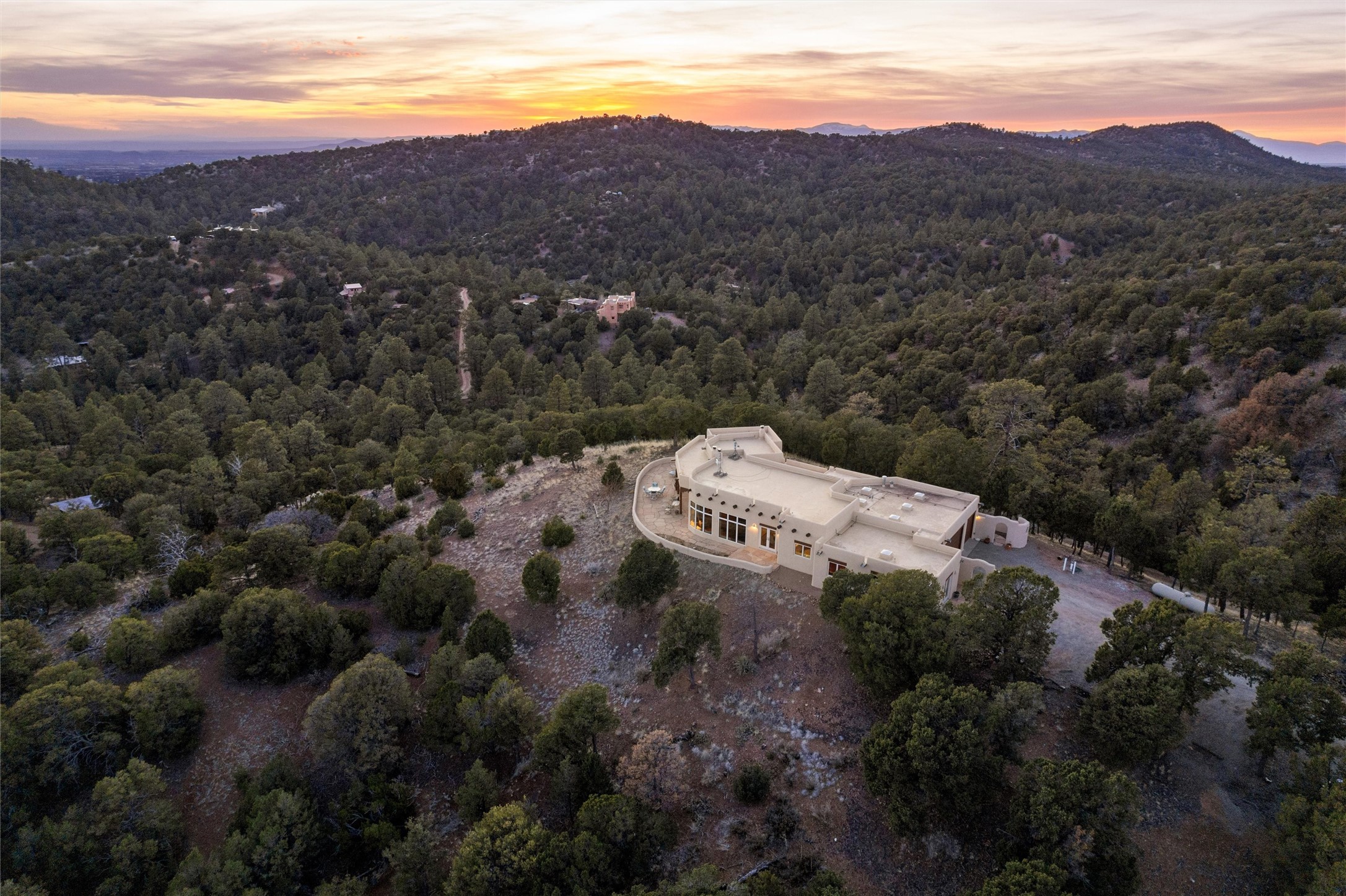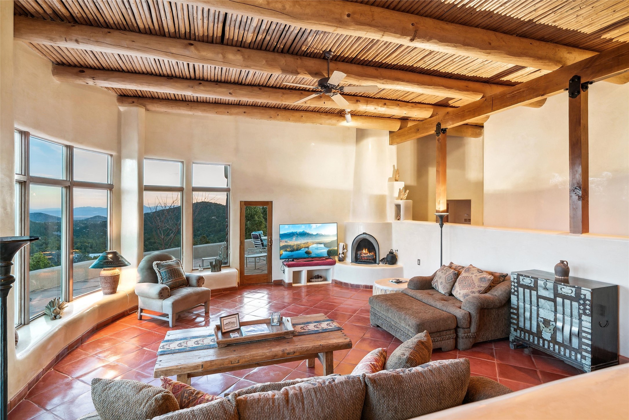 With Breathtaking Views, and Peace and Quiet inside and out, you may never want to leave your Mountain Paradise in this Old Santa Fe Trail neighborhood! As you step inside, you'll be greeted by a Wall of Windows beckoning you out to the Grand Patio that extends across the home. But wait! The Warm Glow of the Viga & Latilla ceilings, and the lavish, recently refinished Diamond Plaster walls, and Banco Seating encourage you to cocoon inside. Here, the open floor plan is perfect for entertaining guests, relaxing with family, or in the solitude of your retreat.The four Spacious Bedrooms present a host of possibilities. The Primary Suite is in its own wing, and features your personal Jetted Spa Tub that looks out onto Forever. The smart design anticipated the possibility of a Guest Wing or Attached Casita at the other side of the home. Here, two rooms share a bathroom. Yes, both could be bedrooms, or, add a kitchenette, small table, and sofa to the room currently featured as an office and it is Private Living Space. A Private Courtyard with a Separate Entrance off that side of the home is the perfect spot to enjoy morning coffee or unwind after a long day. Your guests, mom, or kids may never want to leave! In fact, you may want to build them a separate casita of their own, and plans were made for that too. This home is truly a masterpiece, with every detail carefully crafted to create a luxurious AND comfortable living space. Escape to Home. And if you do decide to venture off Mountain, it's just 10 minutes from two iconic Santa Fe restaurants, and a short drive to the Santa Fe Plaza!