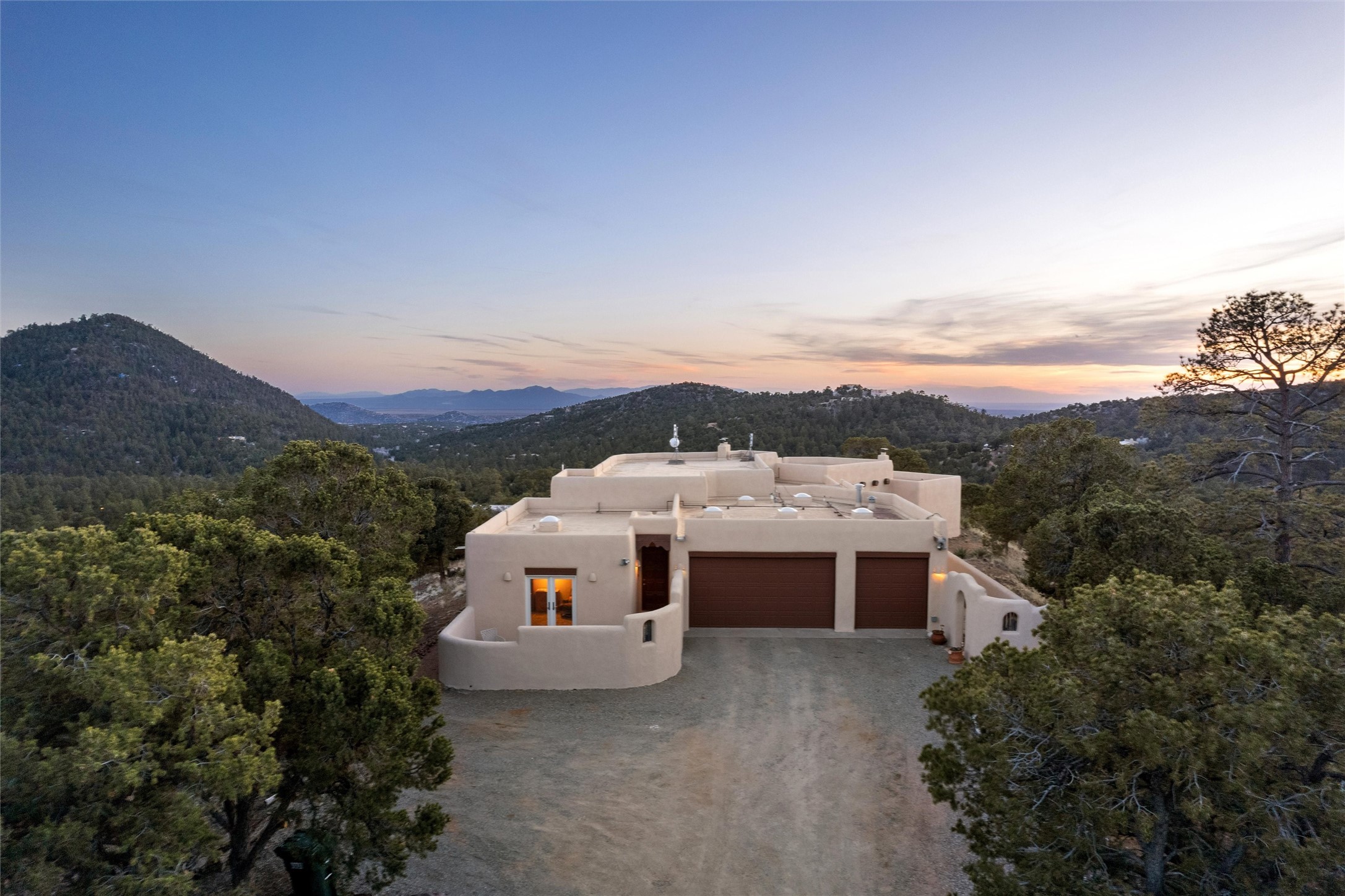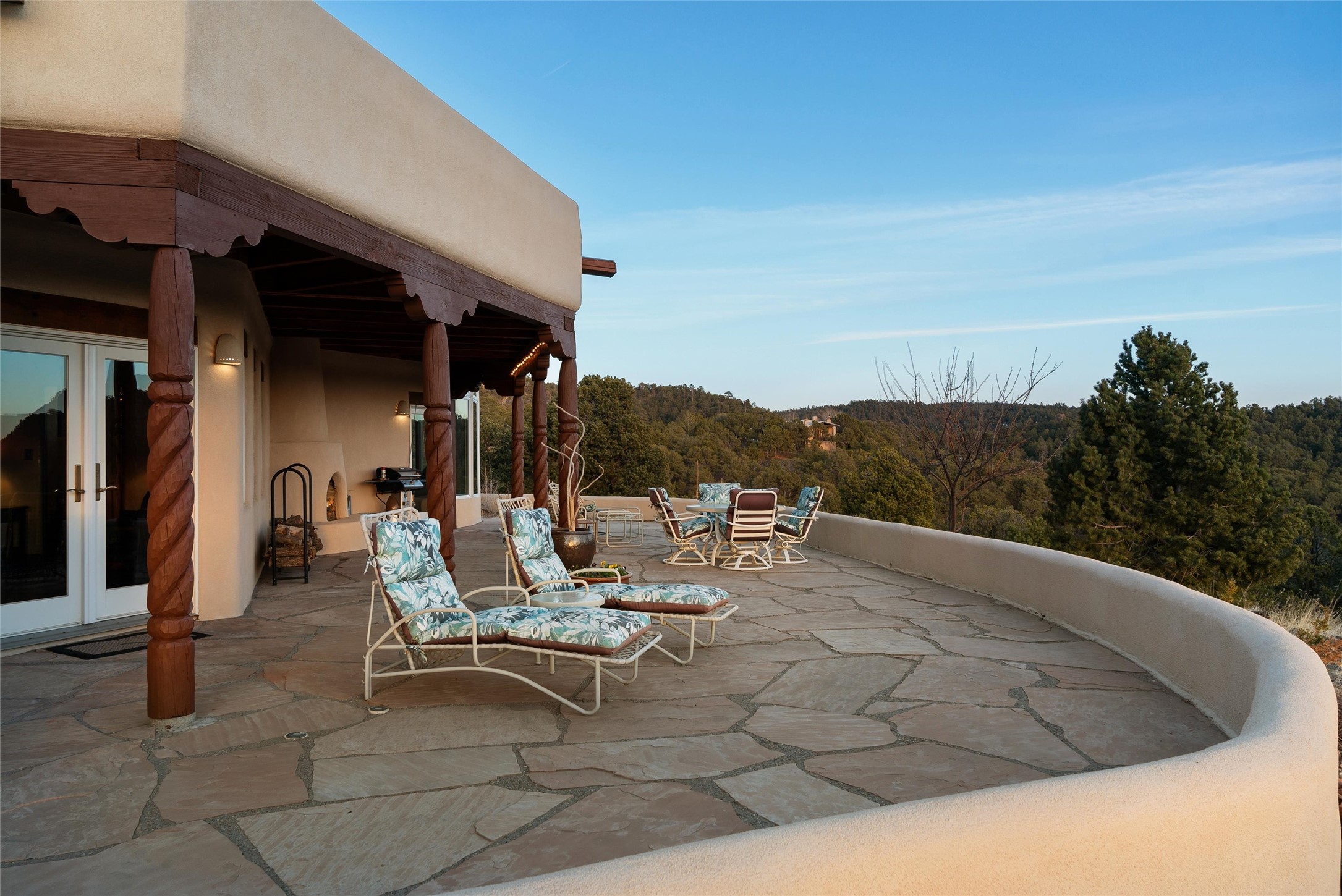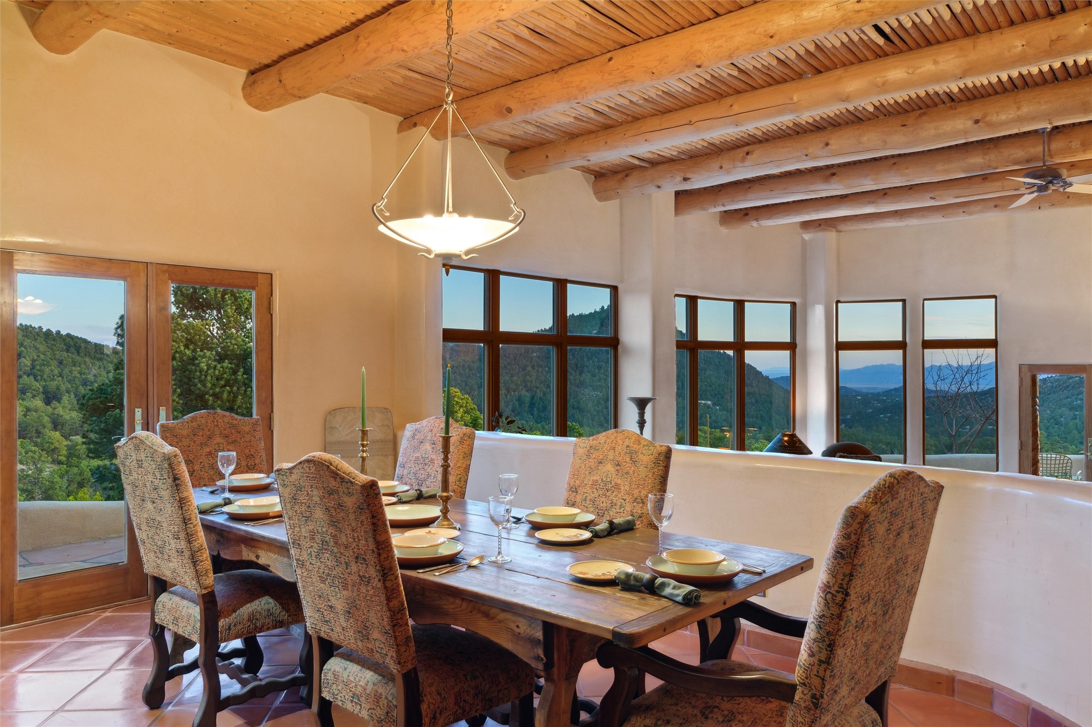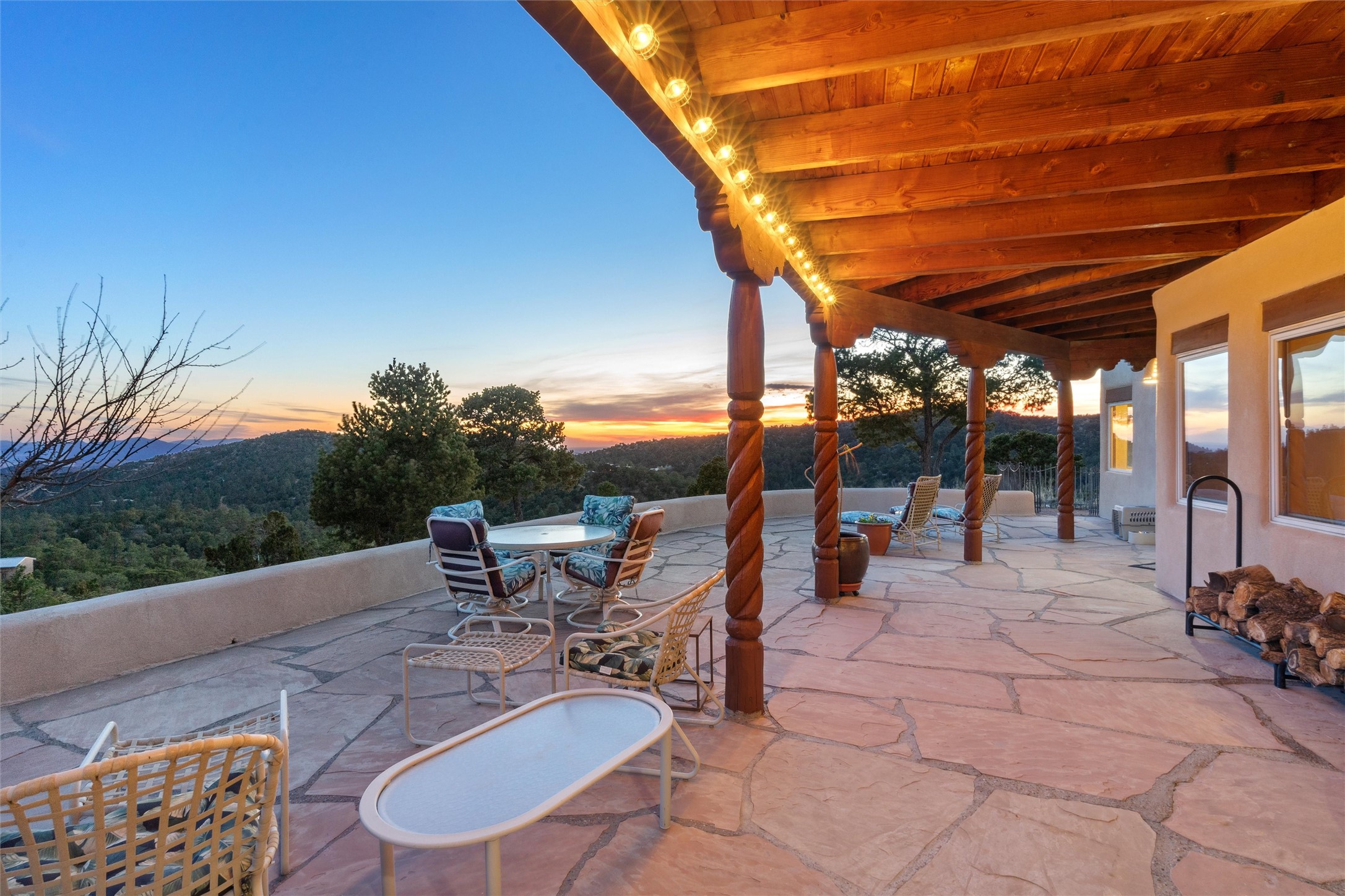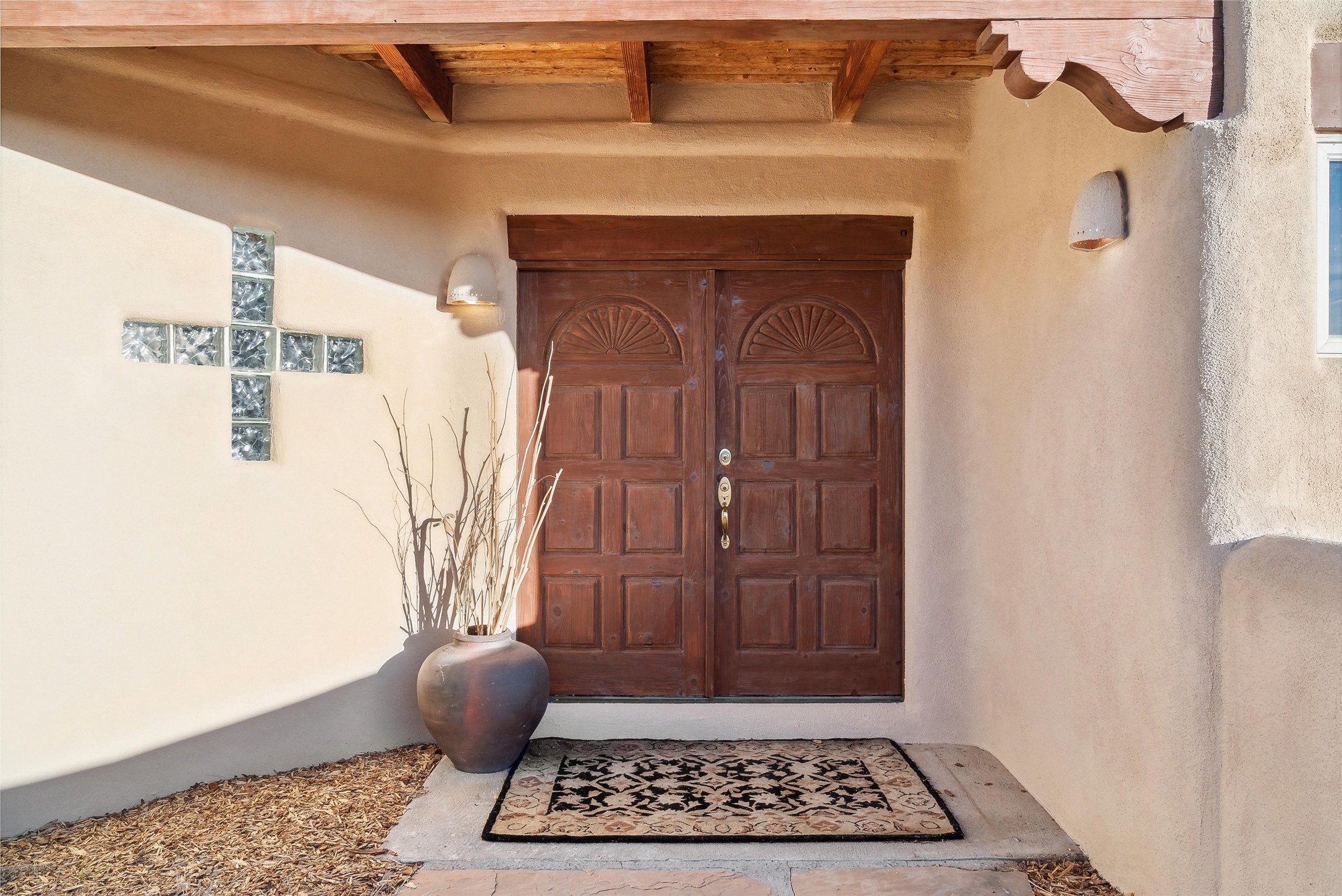 With Breathtaking Views, and Peace and Quiet inside and out, you may never want to leave your Mountain Paradise in this Old Santa Fe Trail neighborhood! As you step inside, you'll be greeted by a Wall of Windows beckoning you out to the Grand Patio that extends across the home. But wait! The Warm Glow of the Viga & Latilla ceilings, and the lavish, recently refinished Diamond Plaster walls, and Banco Seating encourage you to cocoon inside. Here, the open floor plan is perfect for entertaining guests, relaxing with family, or in the solitude of your retreat.The four Spacious Bedrooms present a host of possibilities. The Primary Suite is in its own wing, and features your personal Jetted Spa Tub that looks out onto Forever. The smart design anticipated the possibility of a Guest Wing or Attached Casita at the other side of the home. Here, two rooms share a bathroom. Yes, both could be bedrooms, or, add a kitchenette, small table, and sofa to the room currently featured as an office and it is Private Living Space. A Private Courtyard with a Separate Entrance off that side of the home is the perfect spot to enjoy morning coffee or unwind after a long day. Your guests, mom, or kids may never want to leave! In fact, you may want to build them a separate casita of their own, and plans were made for that too. This home is truly a masterpiece, with every detail carefully crafted to create a luxurious AND comfortable living space. Escape to Home. And if you do decide to venture off Mountain, it's just 10 minutes from two iconic Santa Fe restaurants, and a short drive to the Santa Fe Plaza!