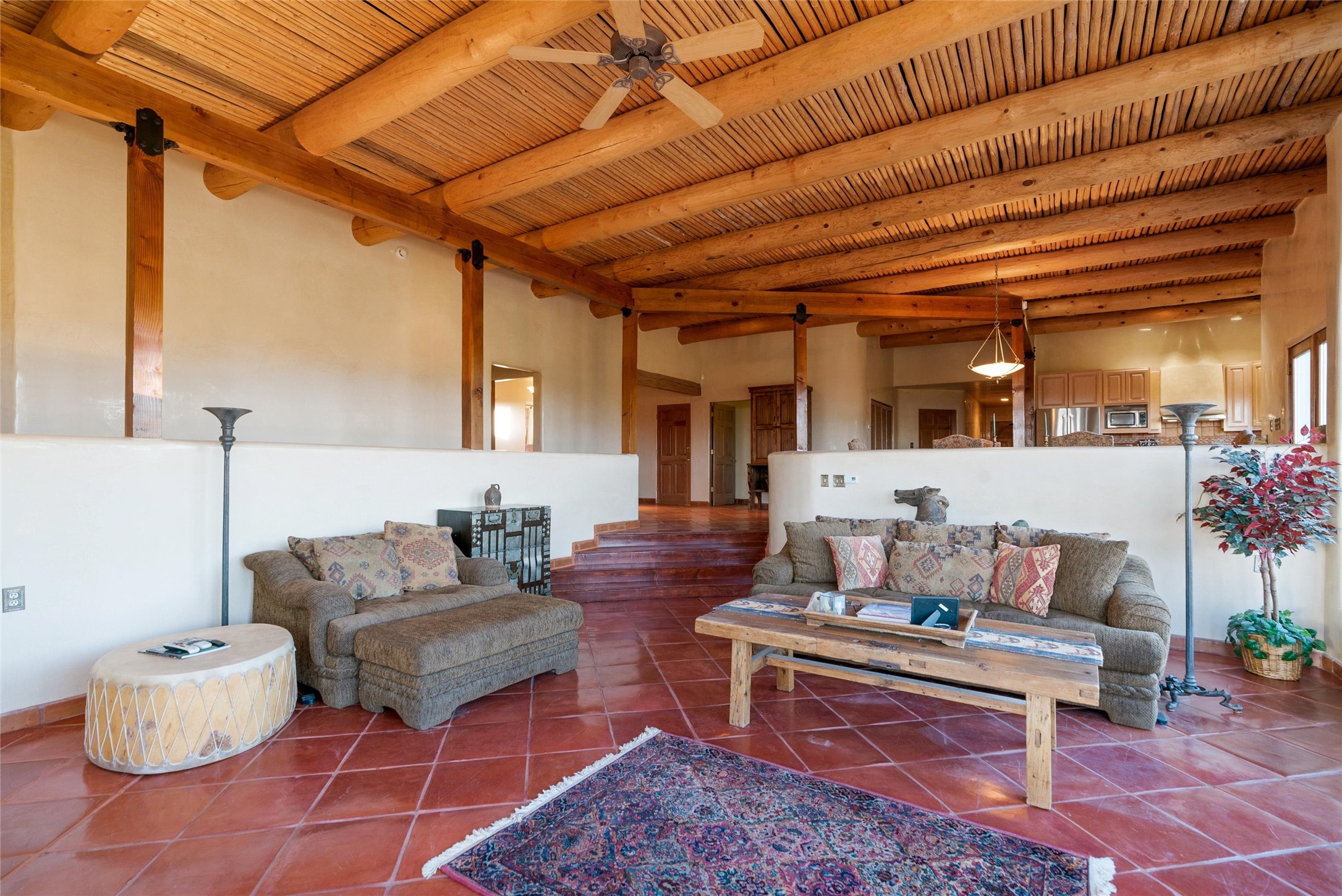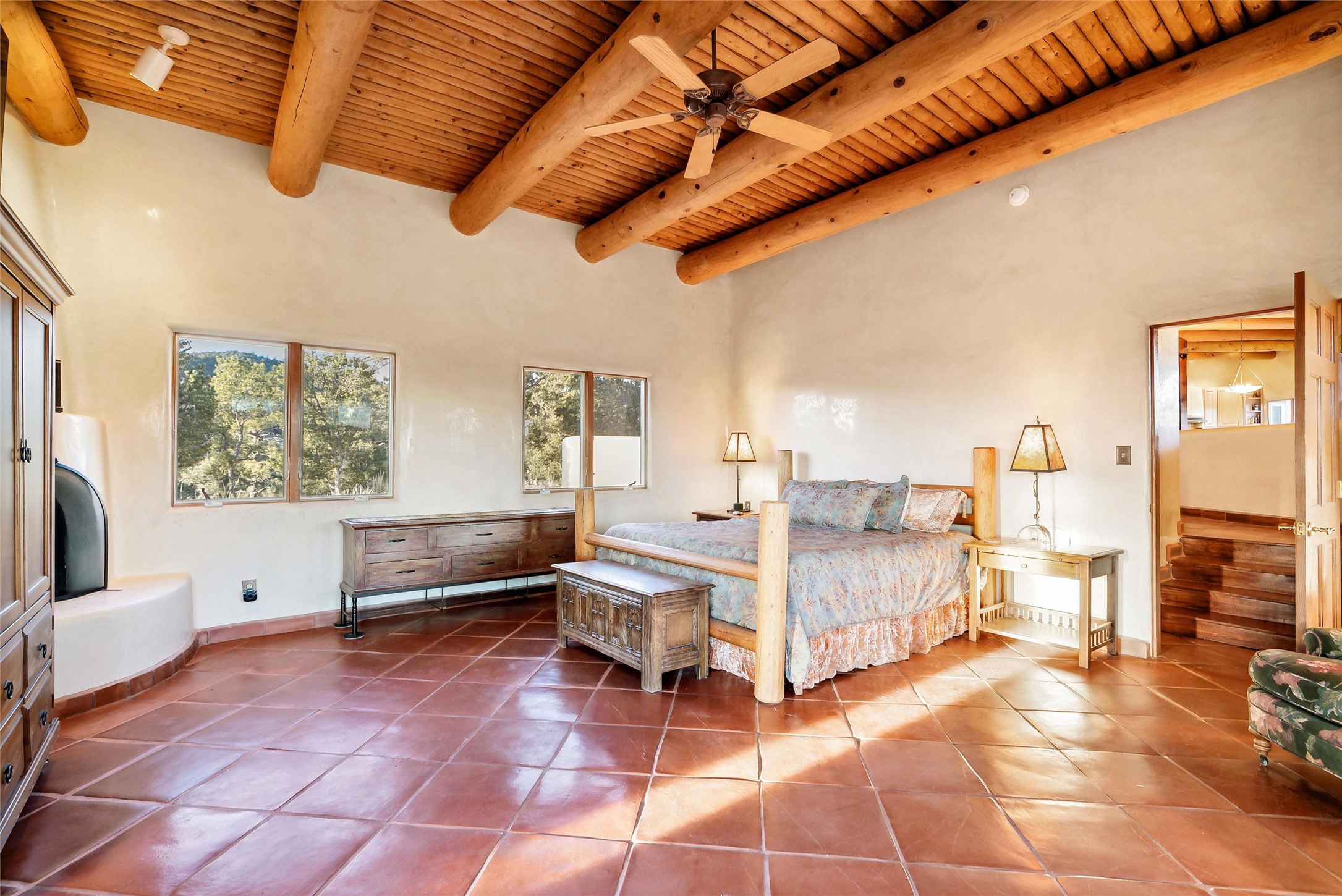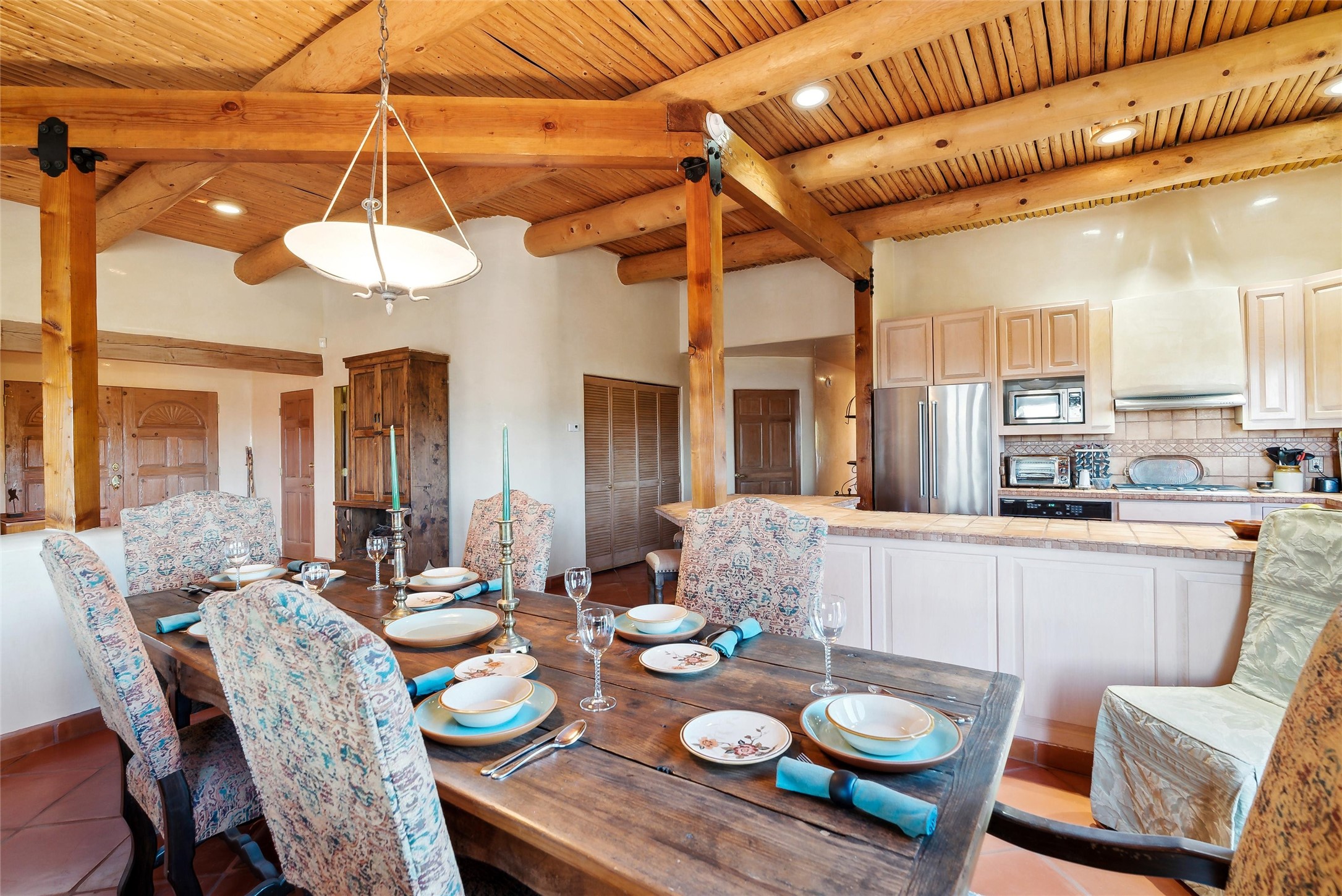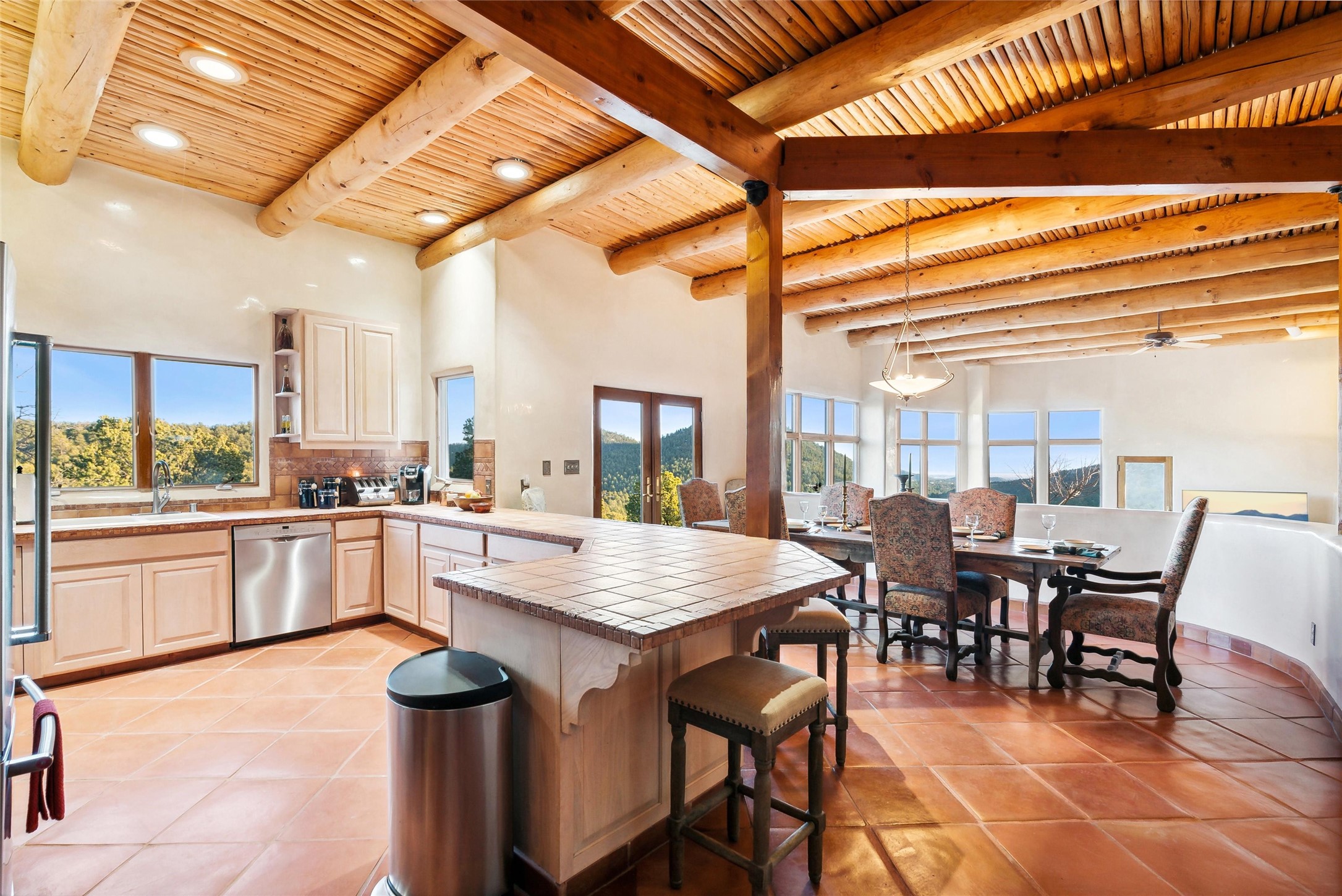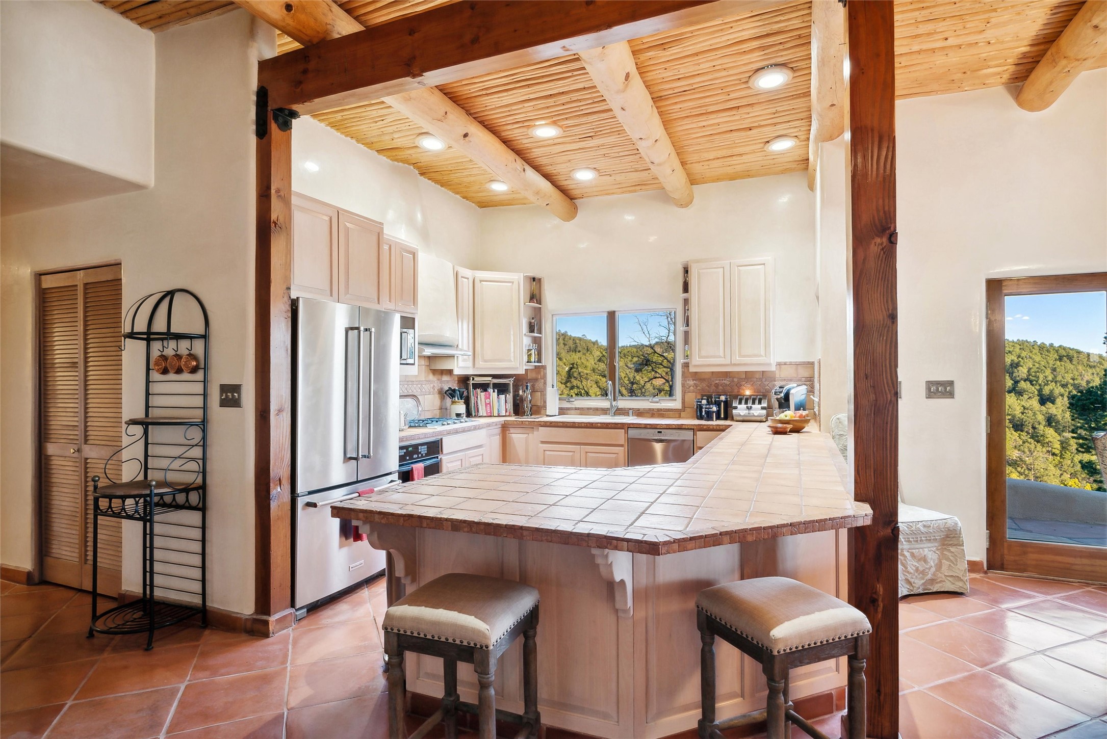 With Breathtaking Views, and Peace and Quiet inside and out, you may never want to leave your Mountain Paradise in this Old Santa Fe Trail neighborhood! As you step inside, you'll be greeted by a Wall of Windows beckoning you out to the Grand Patio that extends across the home. But wait! The Warm Glow of the Viga & Latilla ceilings, and the lavish, recently refinished Diamond Plaster walls, and Banco Seating encourage you to cocoon inside. Here, the open floor plan is perfect for entertaining guests, relaxing with family, or in the solitude of your retreat.The four Spacious Bedrooms present a host of possibilities. The Primary Suite is in its own wing, and features your personal Jetted Spa Tub that looks out onto Forever. The smart design anticipated the possibility of a Guest Wing or Attached Casita at the other side of the home. Here, two rooms share a bathroom. Yes, both could be bedrooms, or, add a kitchenette, small table, and sofa to the room currently featured as an office and it is Private Living Space. A Private Courtyard with a Separate Entrance off that side of the home is the perfect spot to enjoy morning coffee or unwind after a long day. Your guests, mom, or kids may never want to leave! In fact, you may want to build them a separate casita of their own, and plans were made for that too. This home is truly a masterpiece, with every detail carefully crafted to create a luxurious AND comfortable living space. Escape to Home. And if you do decide to venture off Mountain, it's just 10 minutes from two iconic Santa Fe restaurants, and a short drive to the Santa Fe Plaza!