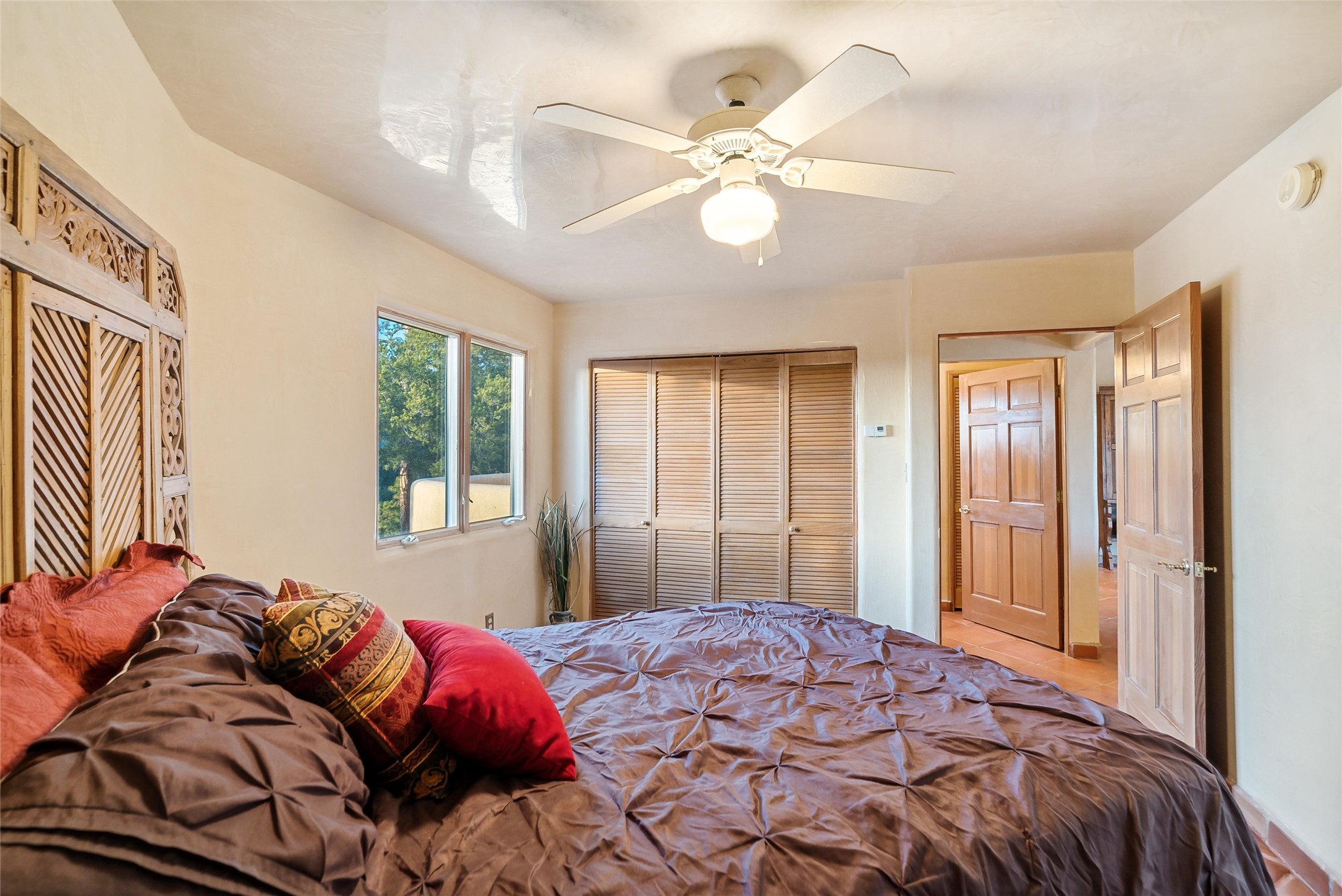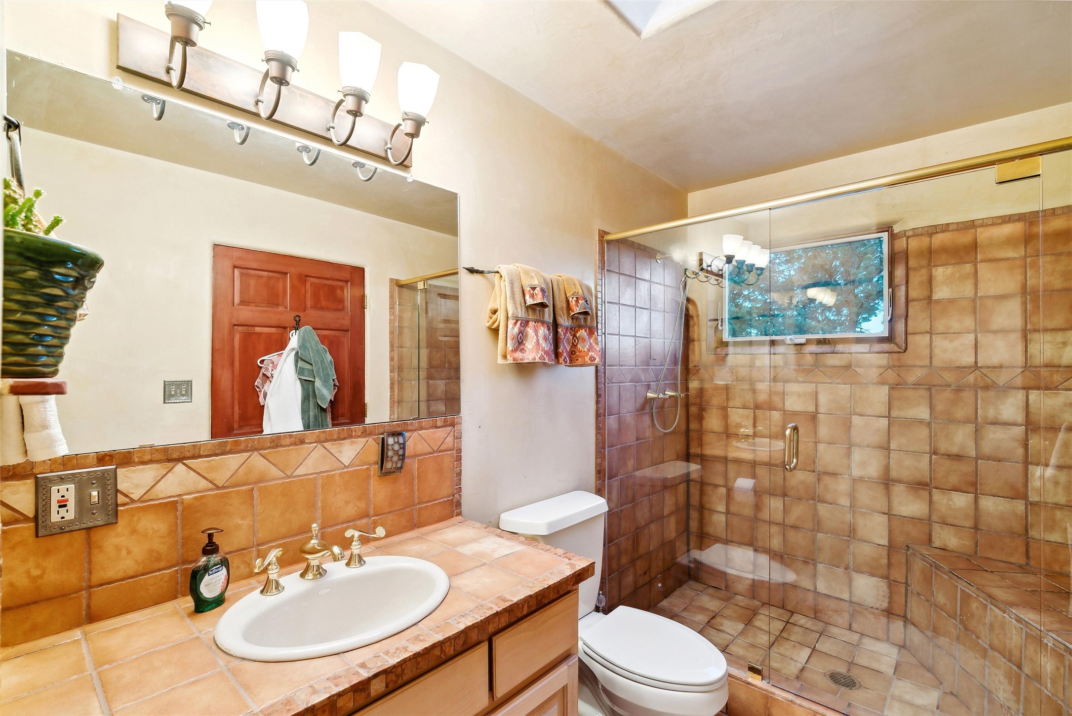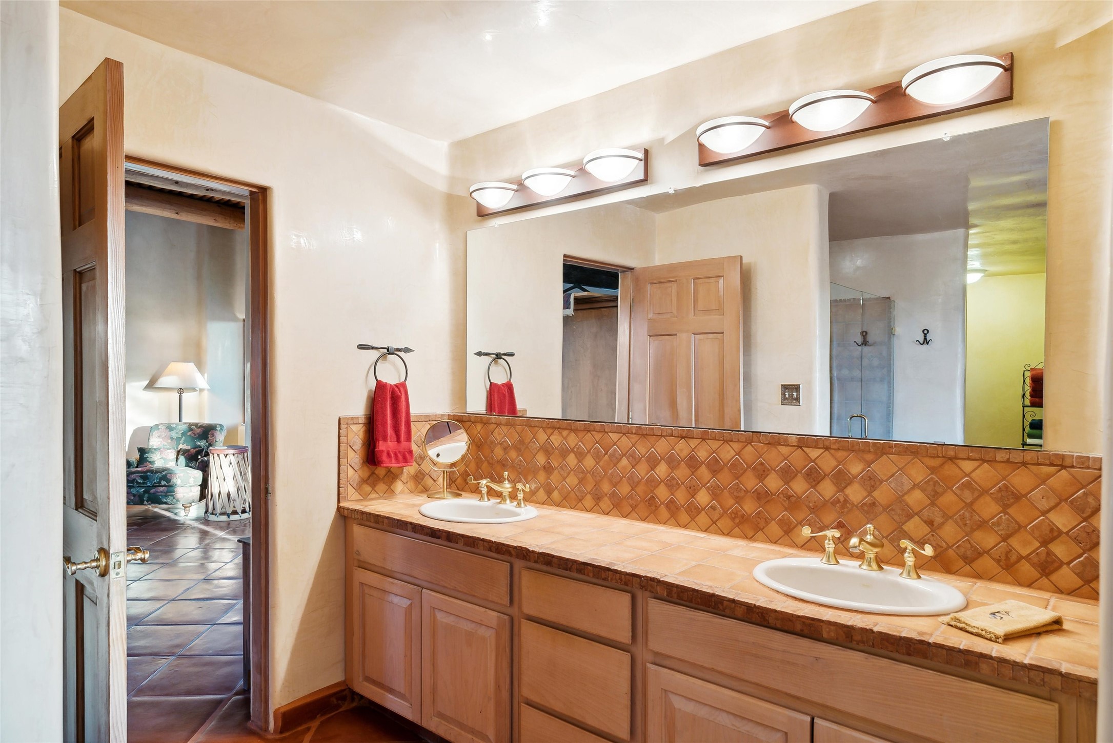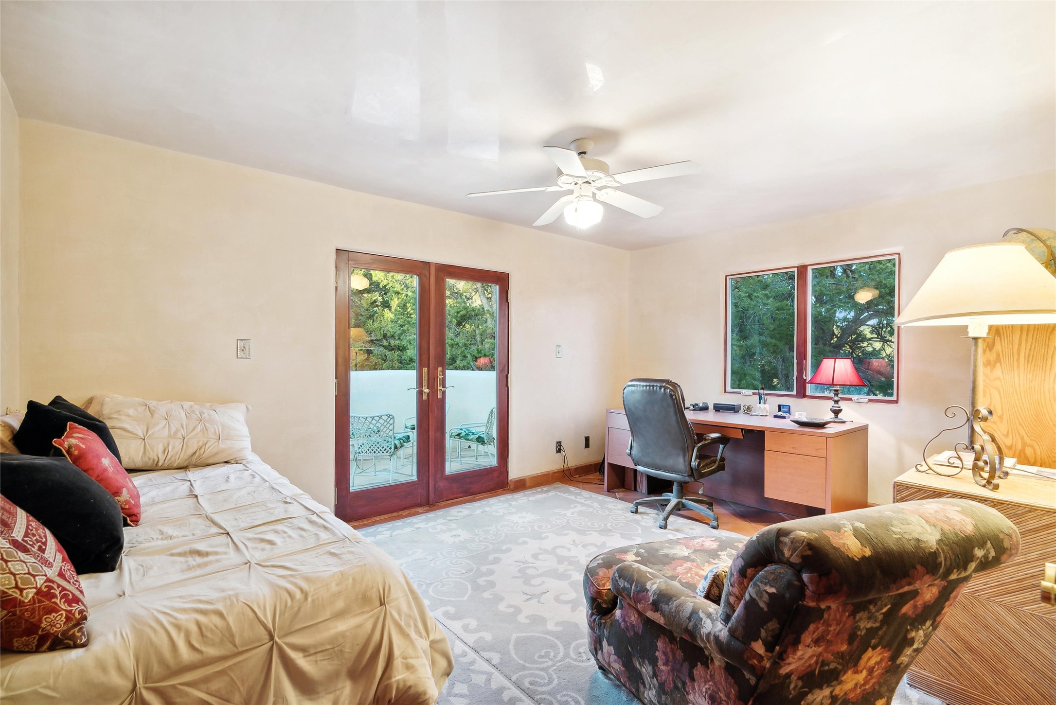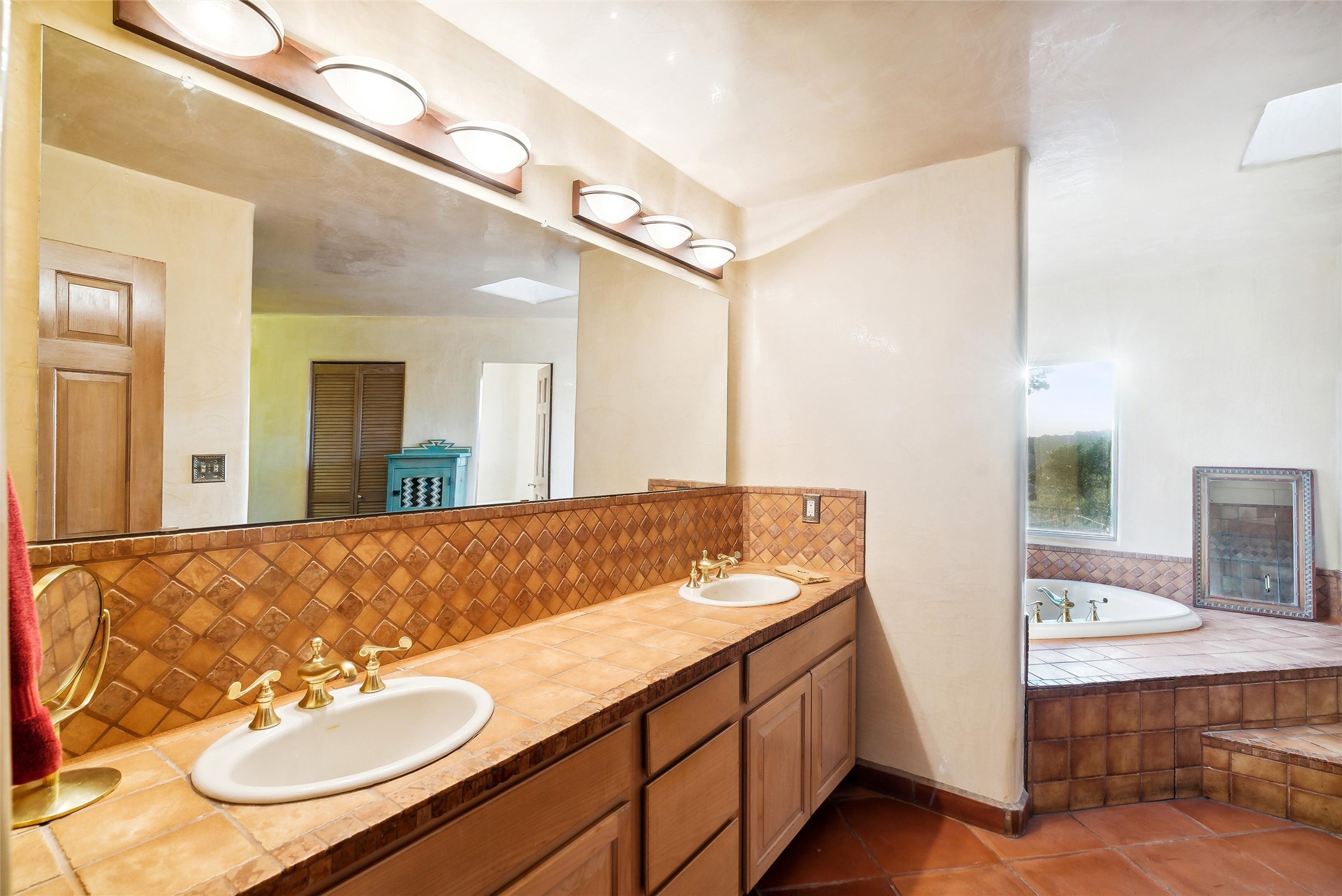With Breathtaking Views, and Peace and Quiet inside and out, you may never want to leave your Mountain Paradise in this Old Santa Fe Trail neighborhood! As you step inside, you'll be greeted by a Wall of Windows beckoning you out to the Grand Patio that extends across the home. But wait! The Warm Glow of the Viga & Latilla ceilings, and the lavish, recently refinished Diamond Plaster walls, and Banco Seating encourage you to cocoon inside. Here, the open floor plan is perfect for entertaining guests, relaxing with family, or in the solitude of your retreat.The four Spacious Bedrooms present a host of possibilities. The Primary Suite is in its own wing, and features your personal Jetted Spa Tub that looks out onto Forever. The smart design anticipated the possibility of a Guest Wing or Attached Casita at the other side of the home. Here, two rooms share a bathroom. Yes, both could be bedrooms, or, add a kitchenette, small table, and sofa to the room currently featured as an office and it is Private Living Space. A Private Courtyard with a Separate Entrance off that side of the home is the perfect spot to enjoy morning coffee or unwind after a long day. Your guests, mom, or kids may never want to leave! In fact, you may want to build them a separate casita of their own, and plans were made for that too. This home is truly a masterpiece, with every detail carefully crafted to create a luxurious AND comfortable living space. Escape to Home. And if you do decide to venture off Mountain, it's just 10 minutes from two iconic Santa Fe restaurants, and a short drive to the Santa Fe Plaza!