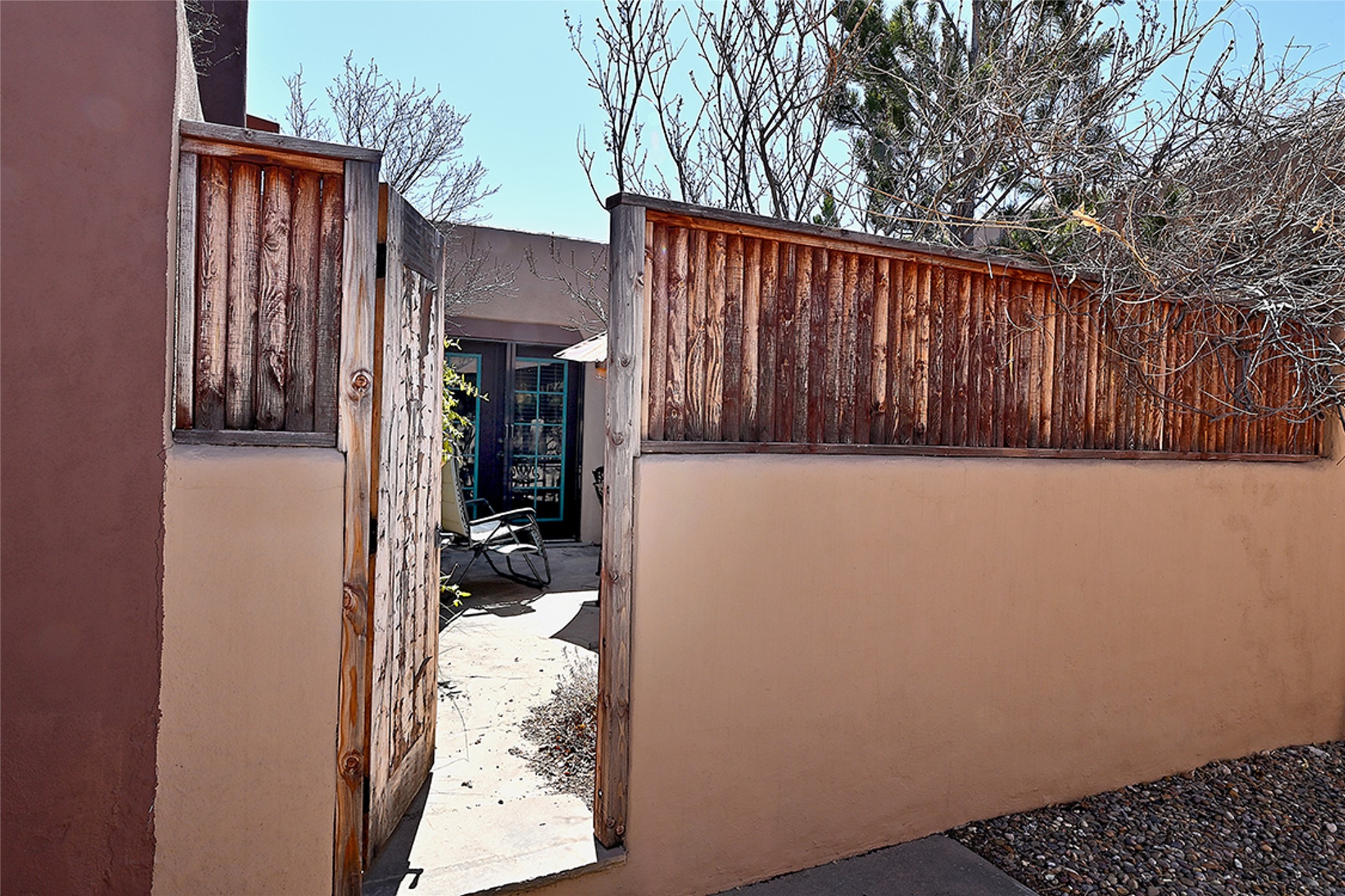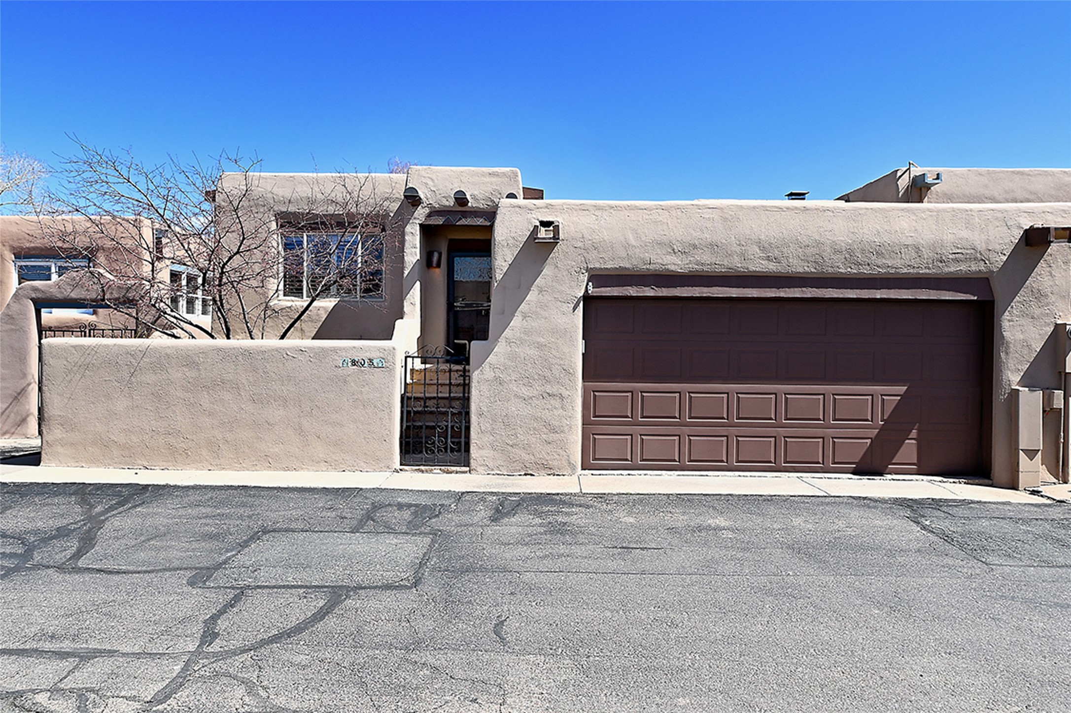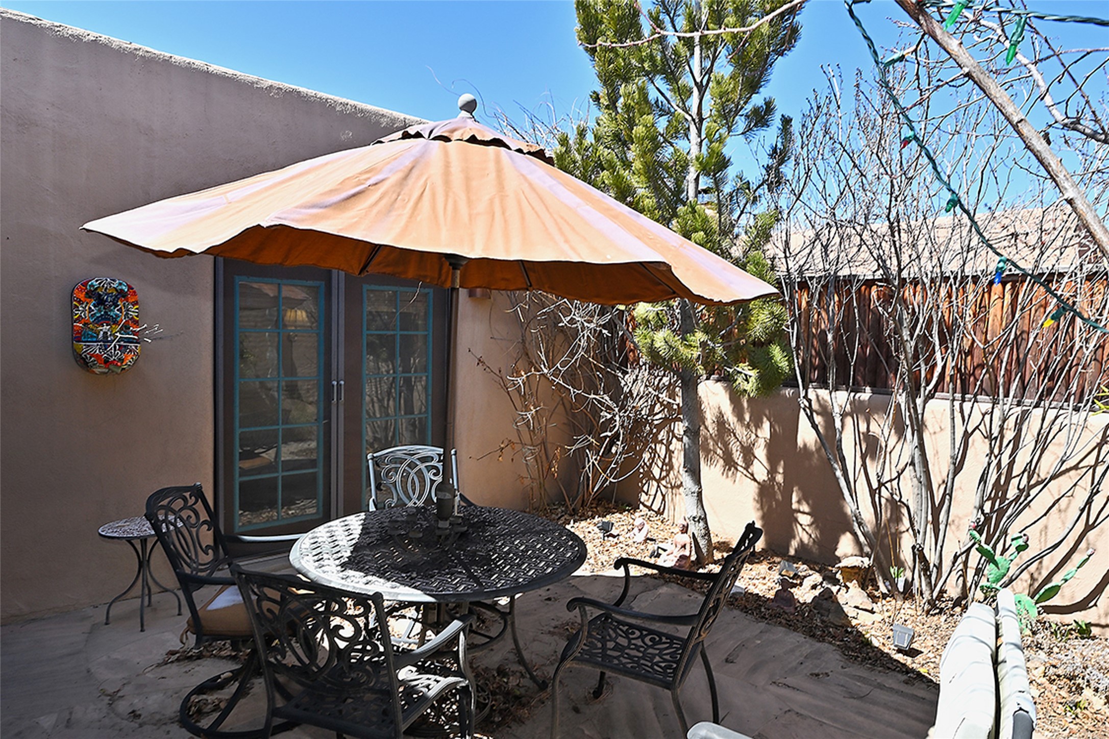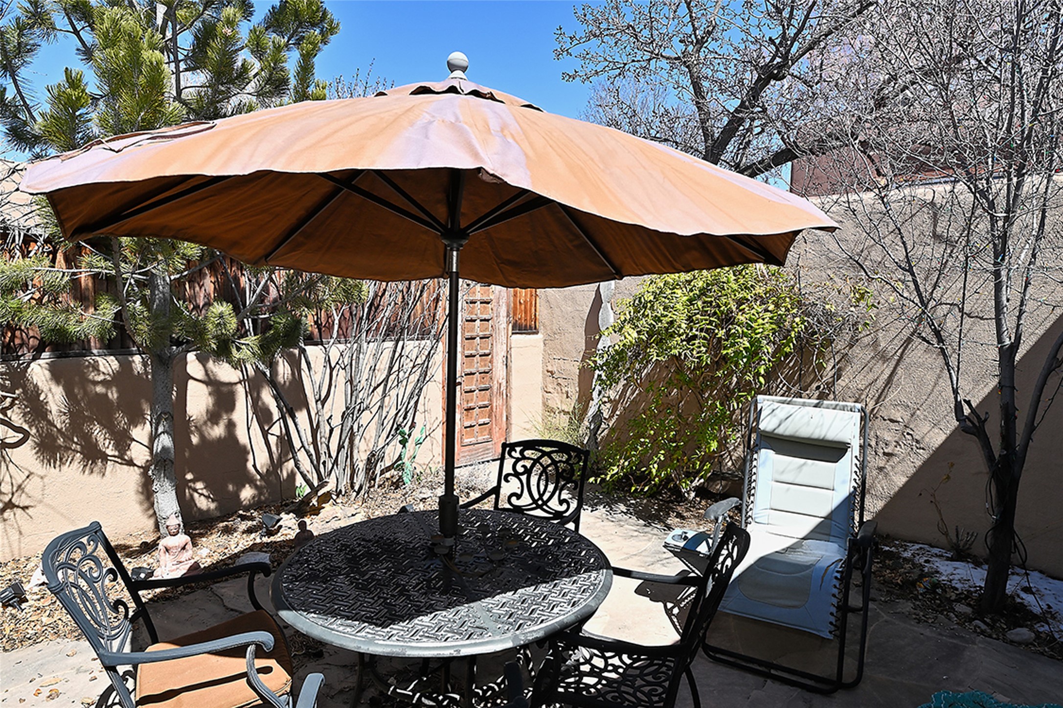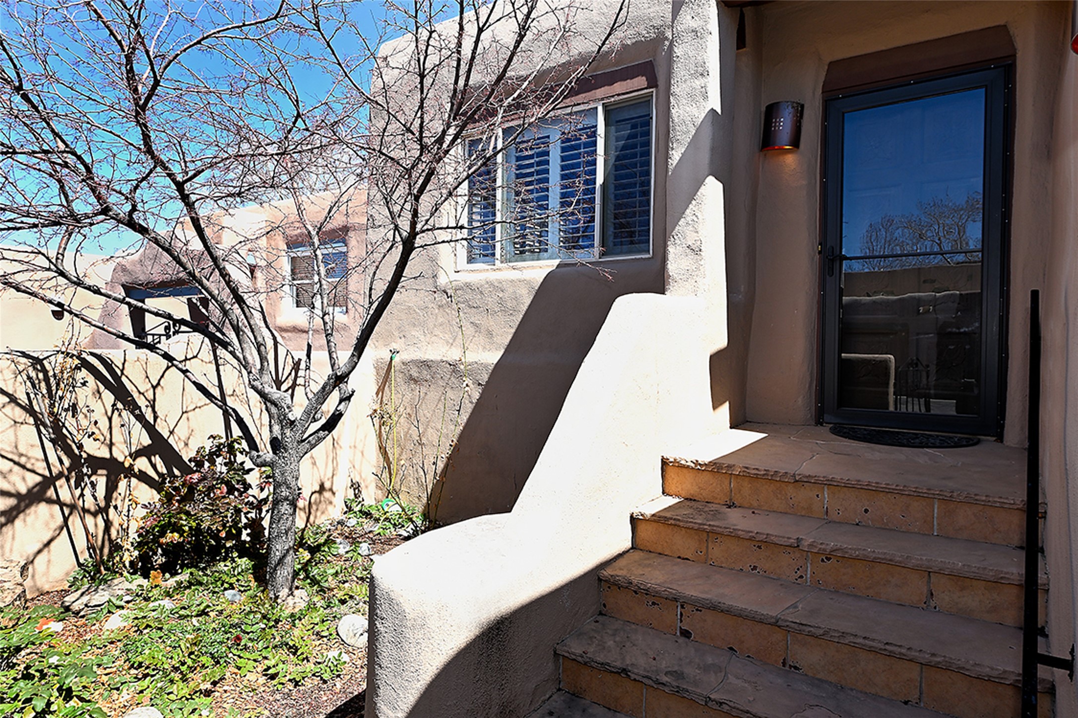 Attractive 2 bedroom 2 bath single level townhome in convenient location. Open concept living, dining and kitchen. Updated kitchen is appointed with stainless-steel appliances, granite countertops and skylight. Owner's bedroom has a corner kiva fireplace for extra warmth on cold, snowy nights. Guest bedroom offers flex space as an office or studio. Both bedrooms open to a lovely, private, landscaped and gated patio, which expands living space outside. 2-car garage. Minutes to the historic Santa Fe Plaza, Ft. Marcy Park, and Canyon Road.