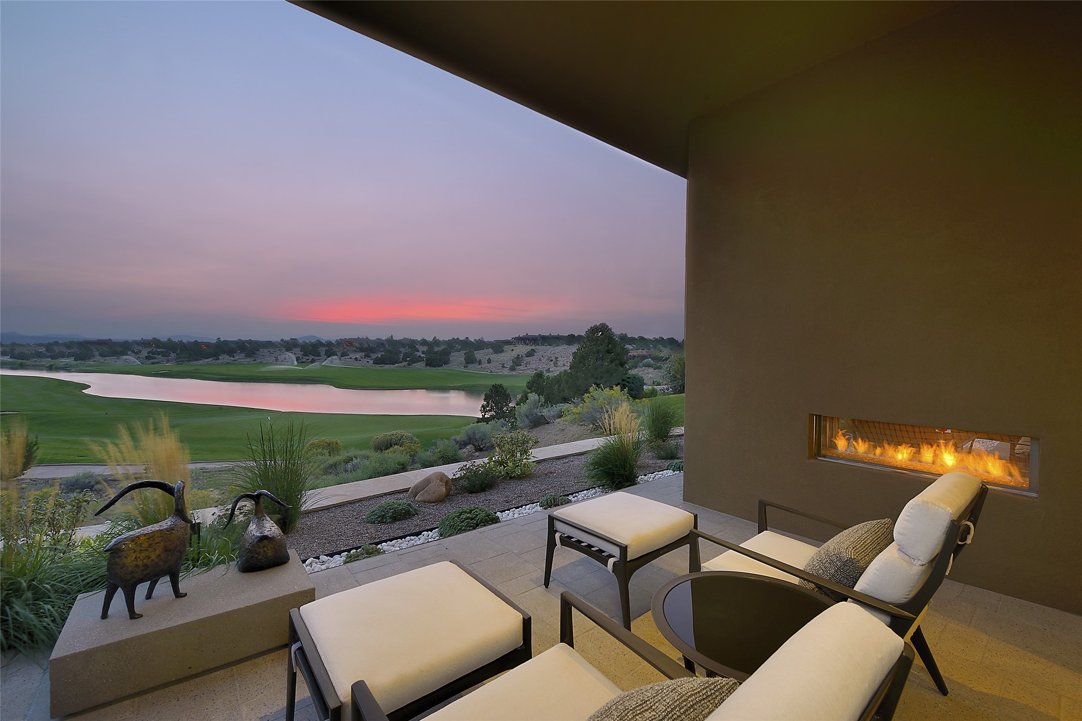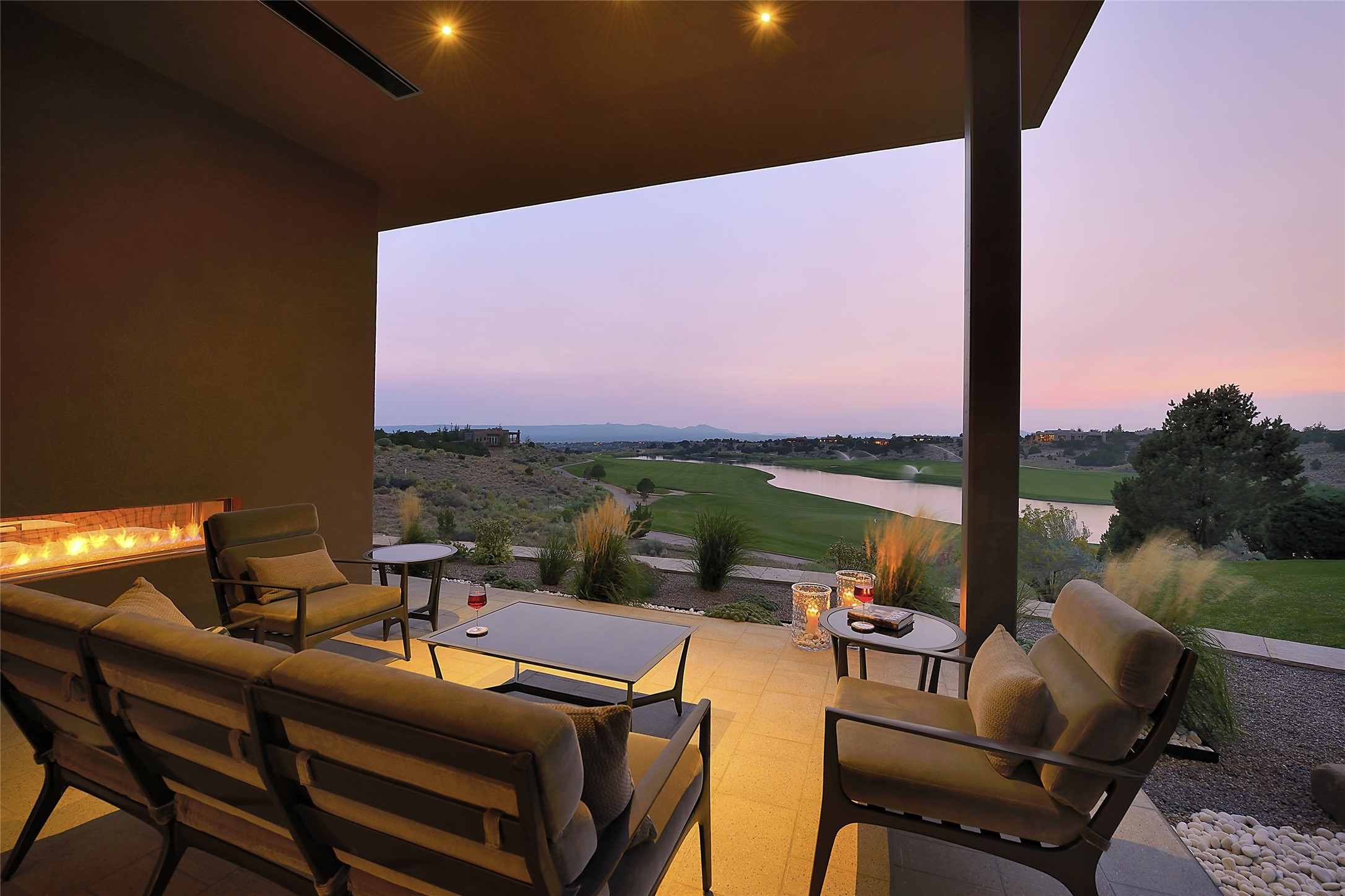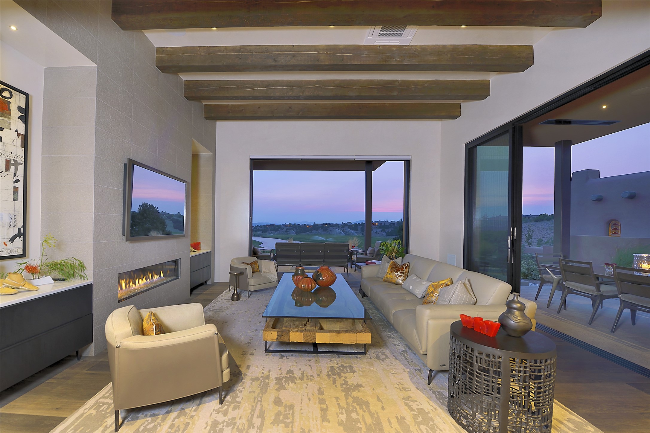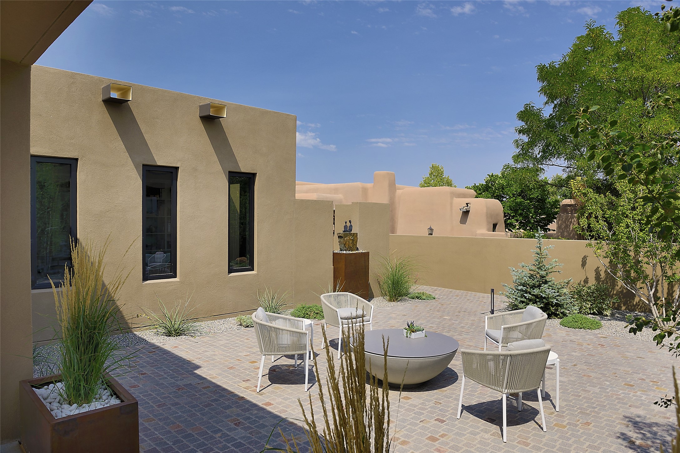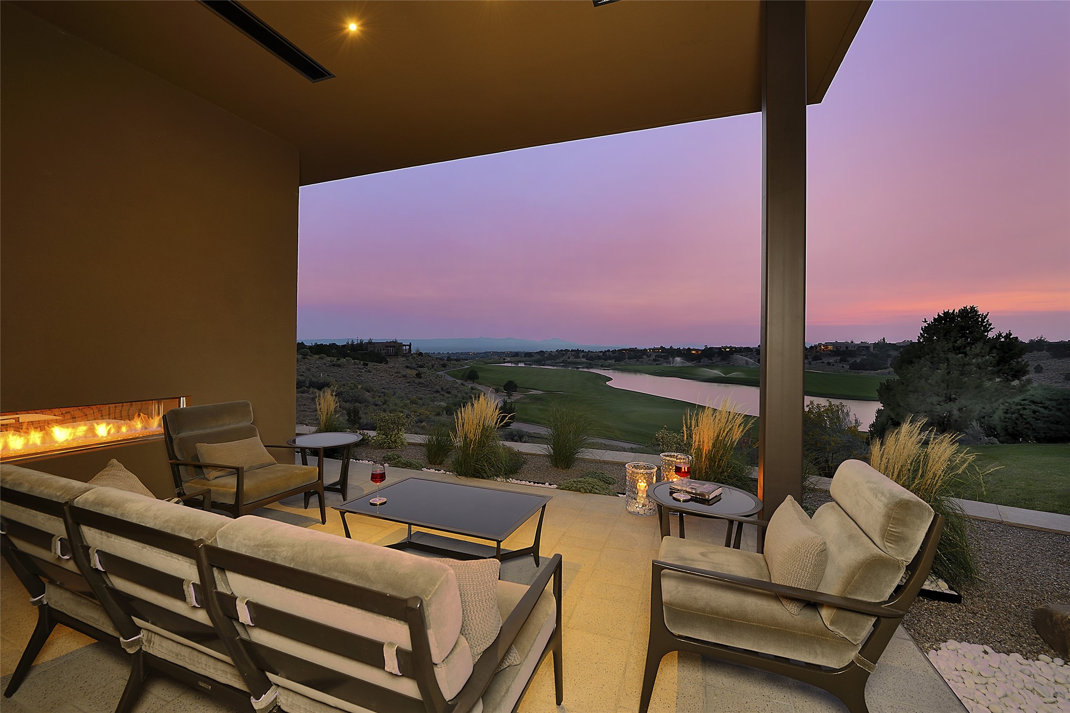 Experience the ultimate Las Campanas lifestyle with this Tour de Force, 2020-built House and Guest House masterpiece by Zachary and Sons. Perched high above both 18th greens of the Las Campanas Sunset and Sunrise golf courses, this state-of-the-art home, designed by the Lisa Samuel, with the most lavish level of luxury finishes, and walking distance to The Club at Las Campanas, masterfully incorporates seamless indoor/outdoor at its finest. The main house excites with a spacious open concept great room which offers the ultimate entertainer's island kitchen with Wolf/Subzero appliances and a wine dispenser, which opens to the formal dining area, living room, and the custom wet bar, all of which enjoy the stunning views and access to the infinity view portal, gas fireplace, and retractable doors. Directly off the living room is a media room, ideal office, or a fourth bedroom which opens to a tranquil zen garden. The owner's suite boasts one of the finest views in all of Santa Fe with a fireplace, sliding glass doors, portal access, and an exceptional bath with designer finishes and soaking tub. The independent secondary ensuite is private, with interior courtyard access, and a spa-like bath. Guests enjoy the well-appointed detached one bedroom guest house offers complete privacy with a full kitchen, living room and full bath. Luxury finishes include crisp white plaster, white oak flooring, exquisite landscape by Solange Serquis, and natural stones selected from around the world.