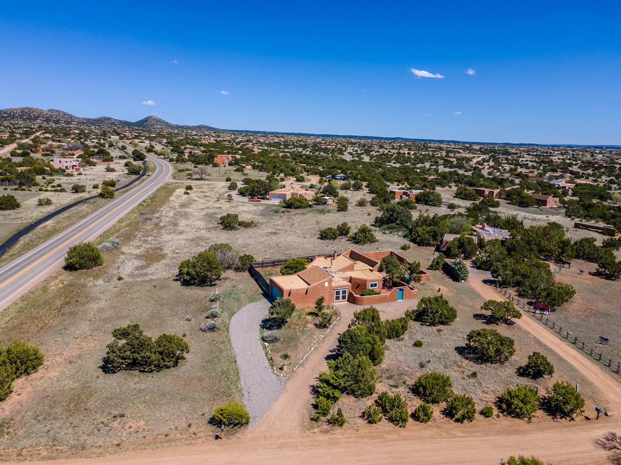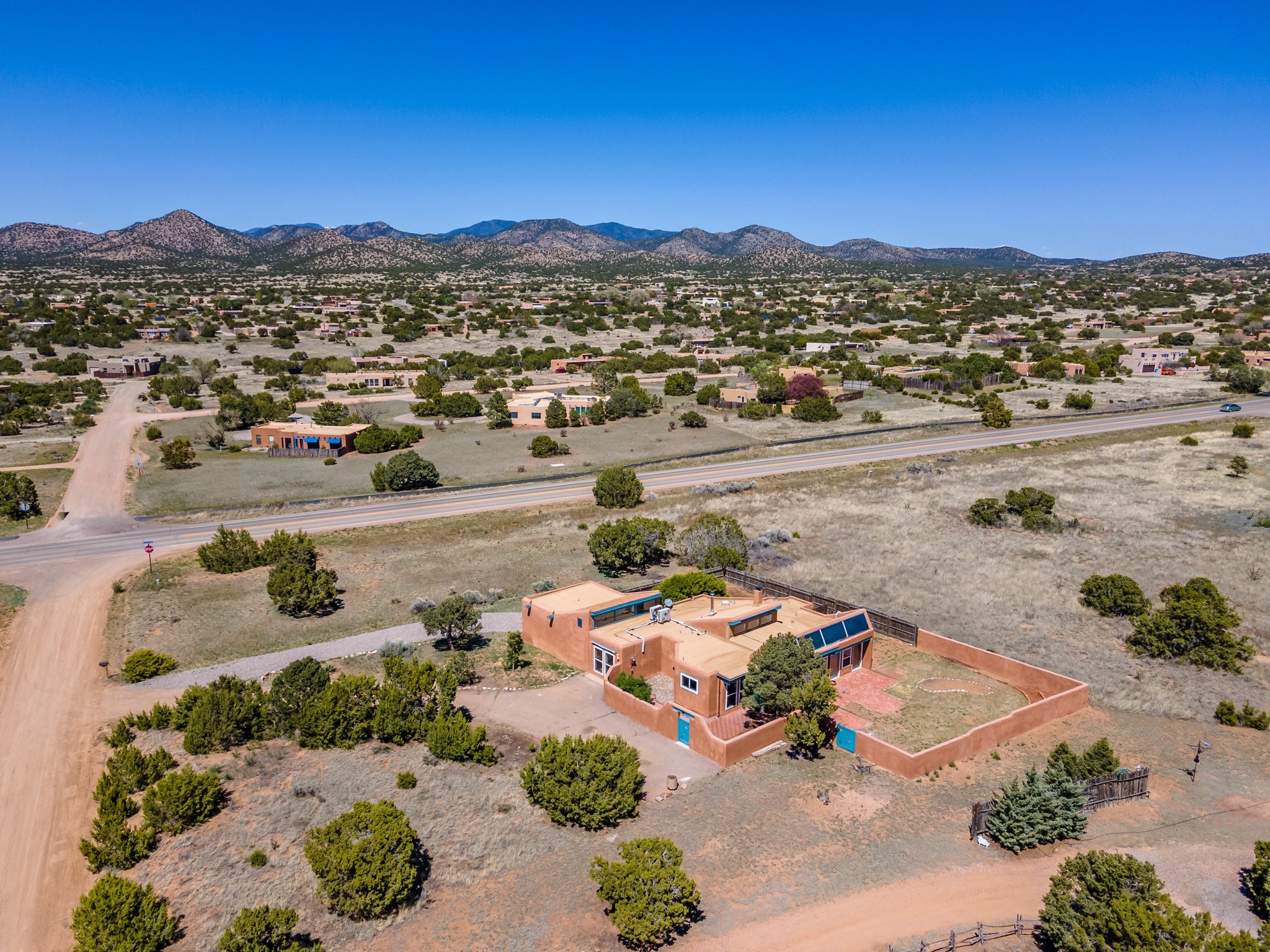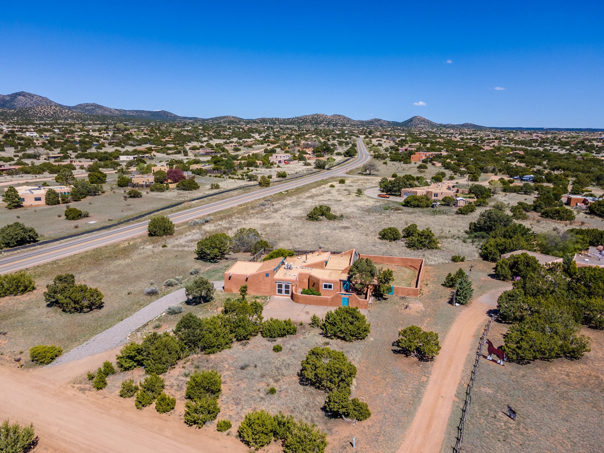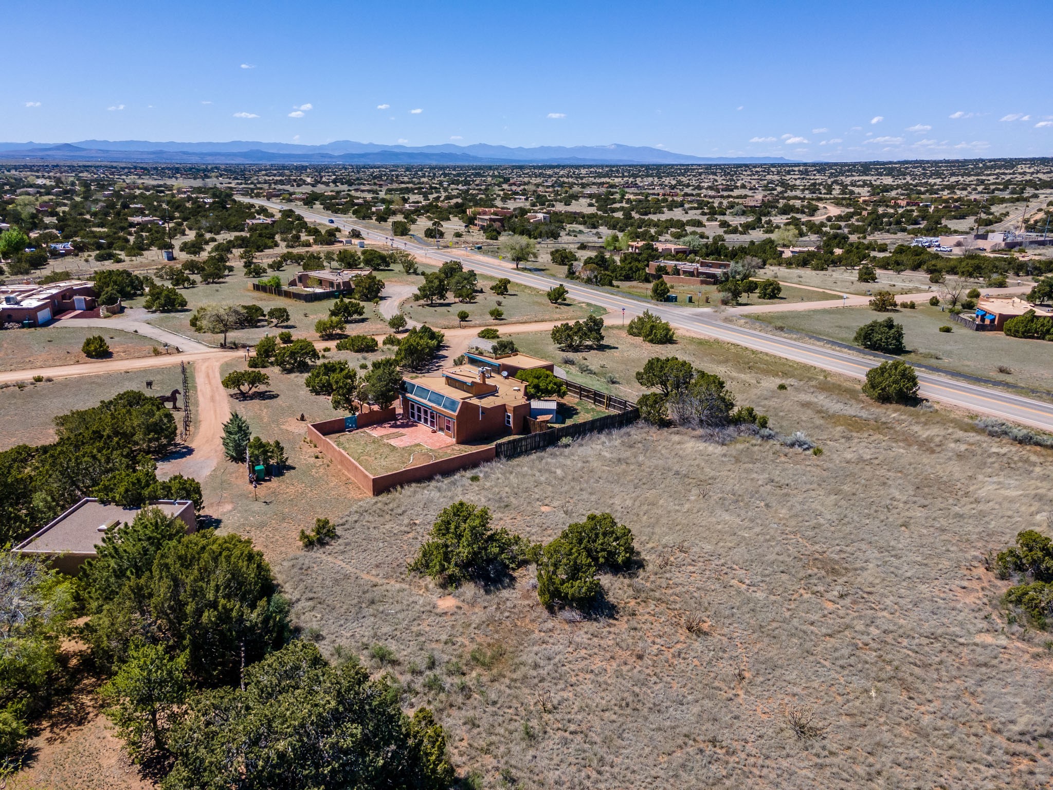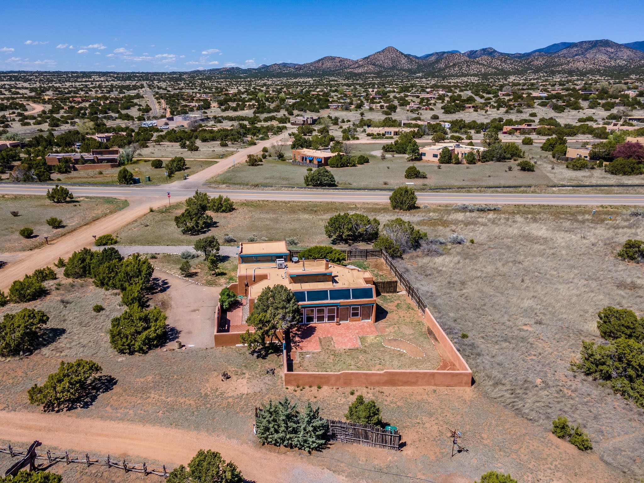 This artfully designed home appears to be nearly sculpted out of the beautiful skies and land of ElDorado. Upon stepping inside, don't be surprised if an utterance of "wow!" escapes you! Thewonderfully open floorplan is simply flooded with beautiful, welcoming New Mexico sunlight that playsupon the fine wood beamed ceiling and classic kiva fireplace. With new windows, passive solar and new mini split units - and you'll be hard pressed not to notice the phenomenal open views in each direction. The spacious, generously cabineted kitchen and bar seating area is bound to be the center of entertainment or relaxation. Stay cozy in the winter with the wood burning stove in the living area. A large backyard is beckoning for your creative designs or uses.