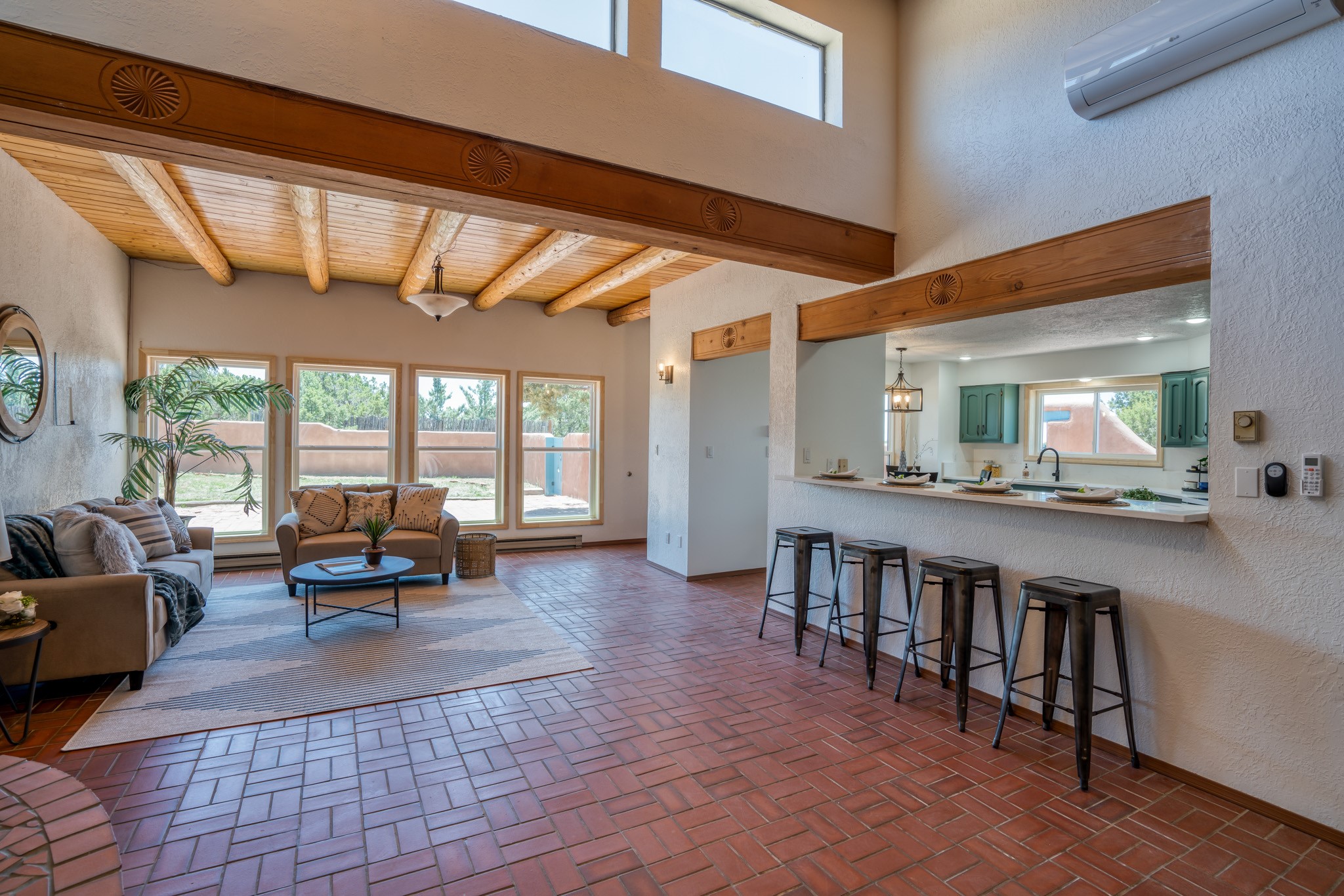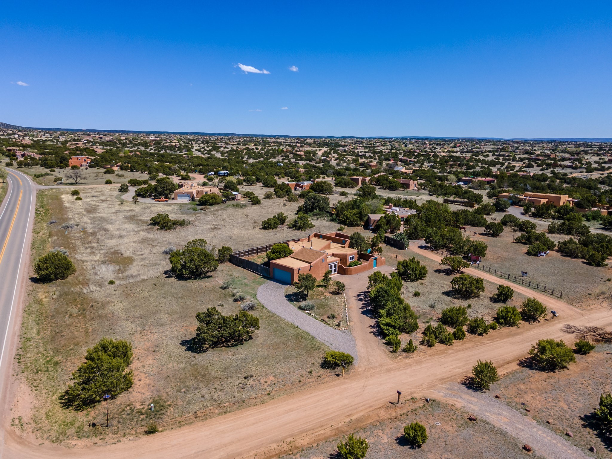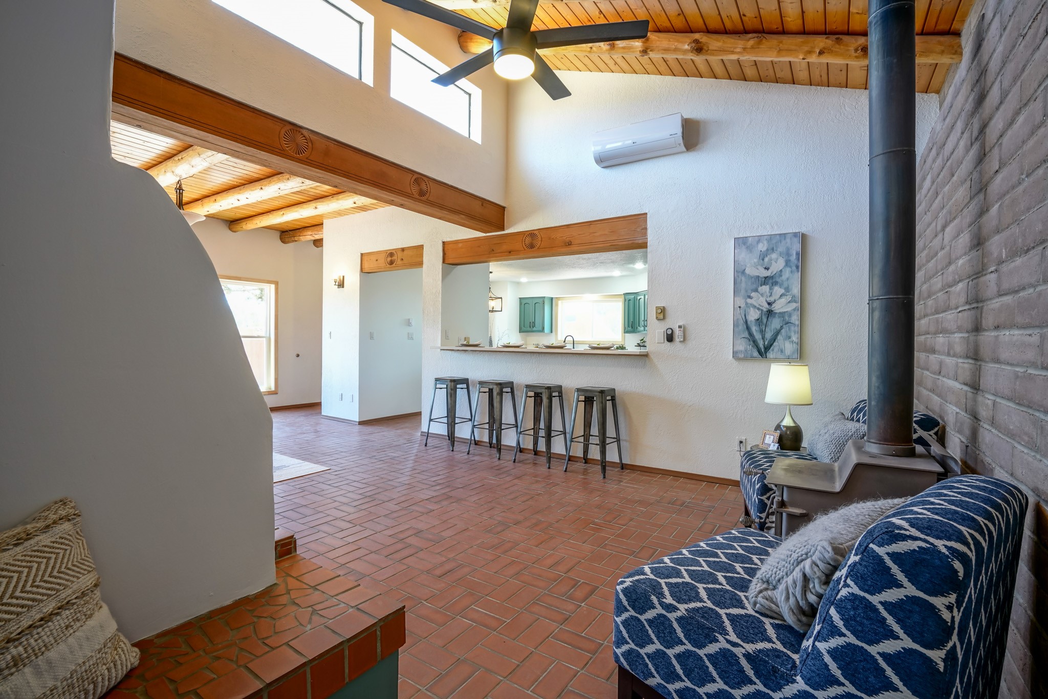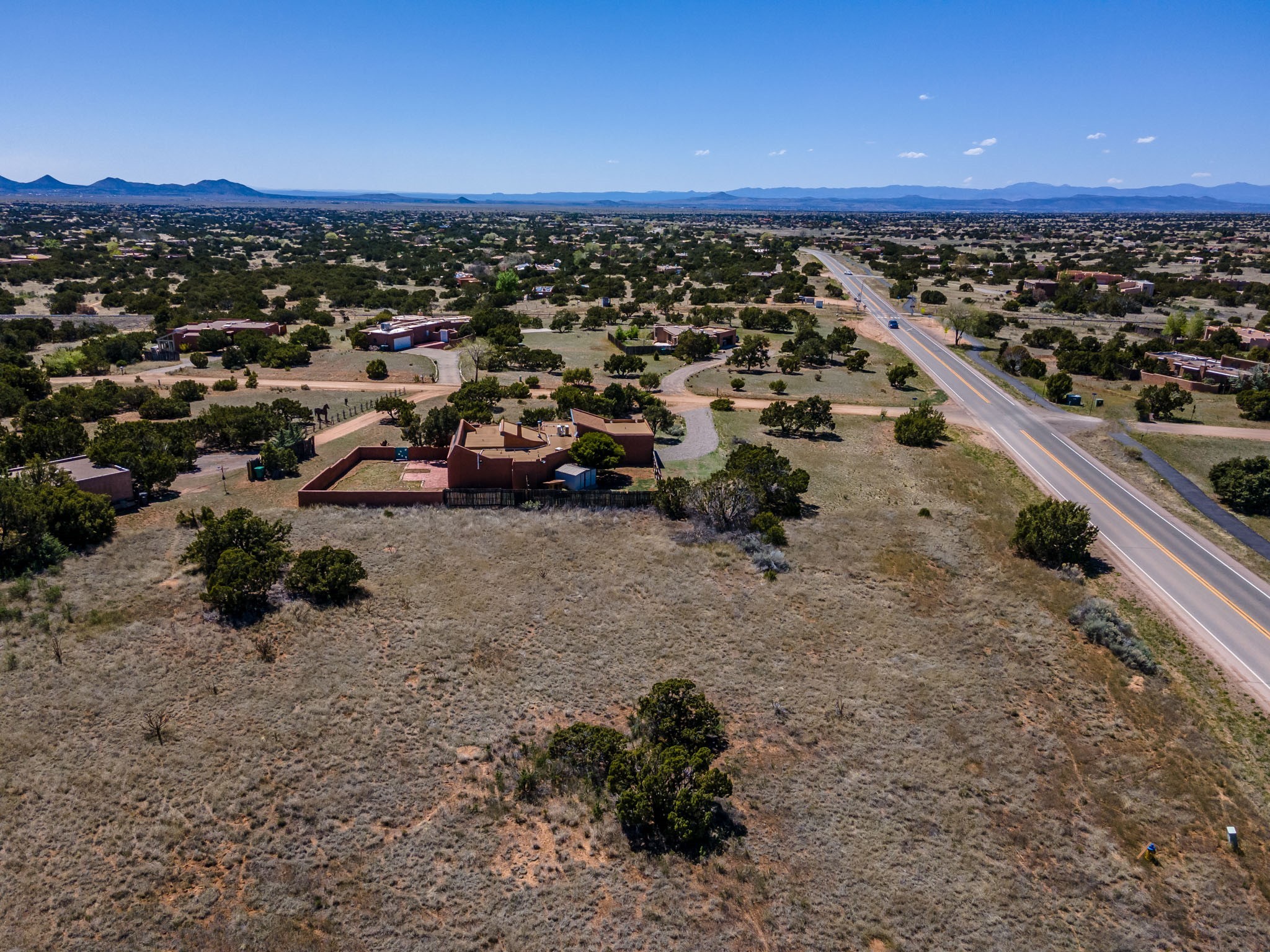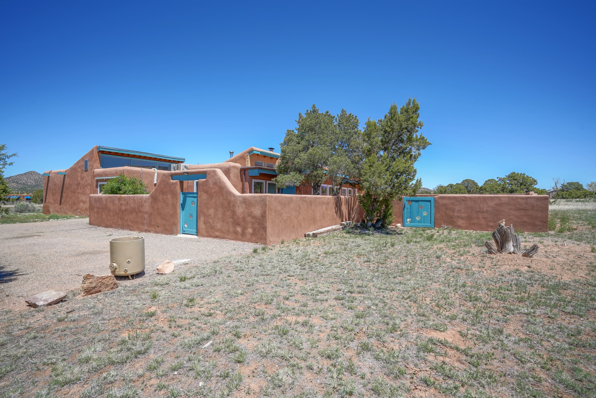 This artfully designed home appears to be nearly sculpted out of the beautiful skies and land of ElDorado. Upon stepping inside, don't be surprised if an utterance of "wow!" escapes you! Thewonderfully open floorplan is simply flooded with beautiful, welcoming New Mexico sunlight that playsupon the fine wood beamed ceiling and classic kiva fireplace. With new windows, passive solar and new mini split units - and you'll be hard pressed not to notice the phenomenal open views in each direction. The spacious, generously cabineted kitchen and bar seating area is bound to be the center of entertainment or relaxation. Stay cozy in the winter with the wood burning stove in the living area. A large backyard is beckoning for your creative designs or uses.