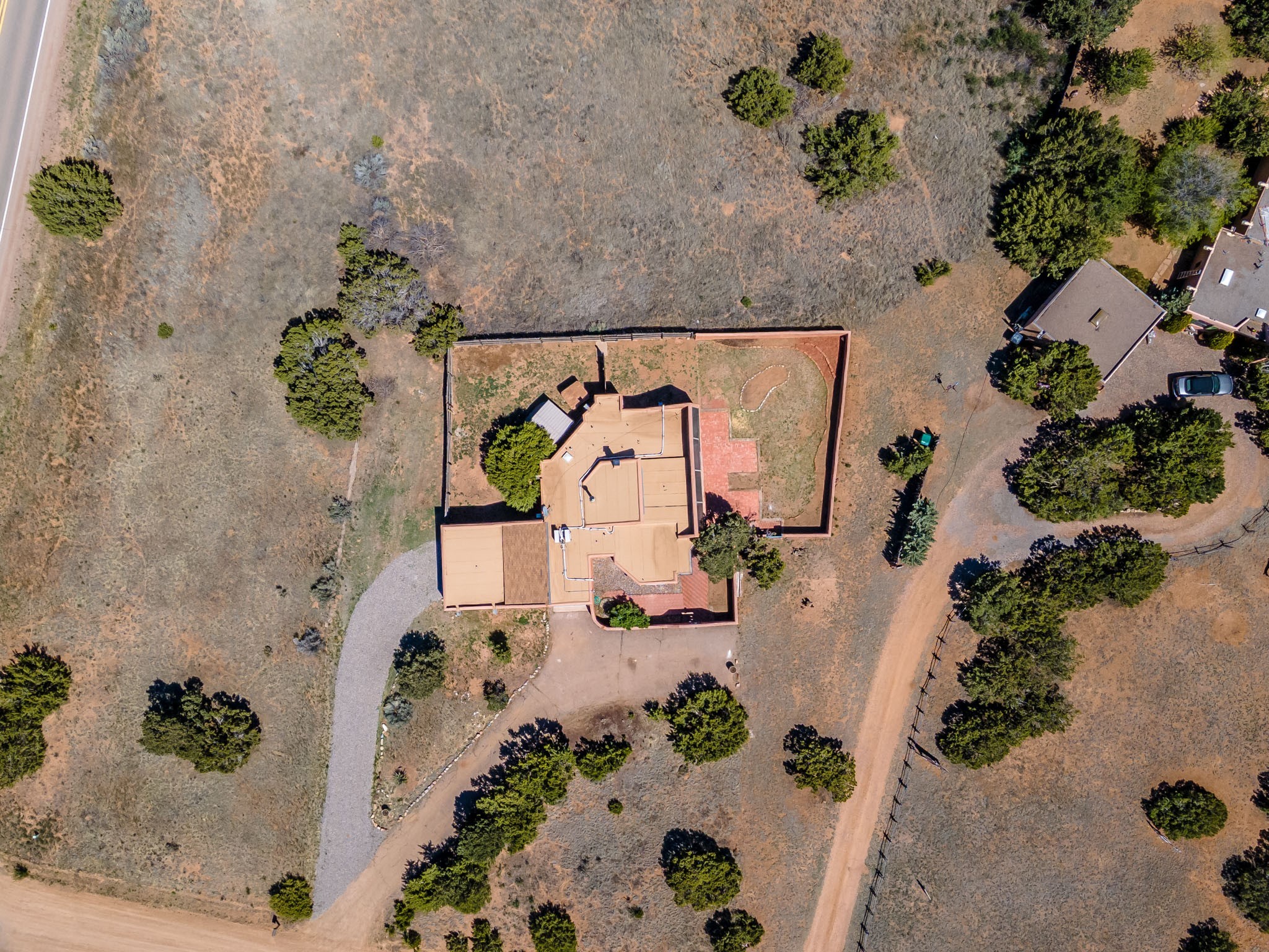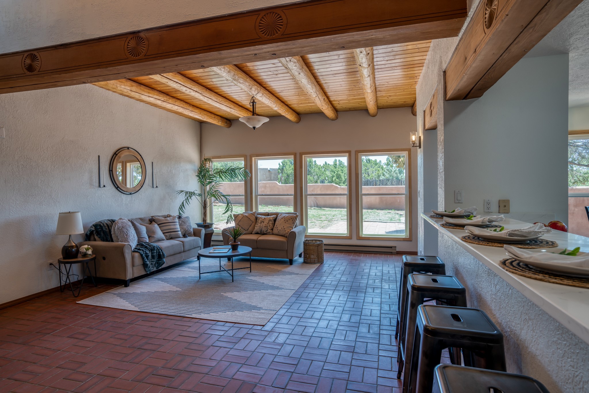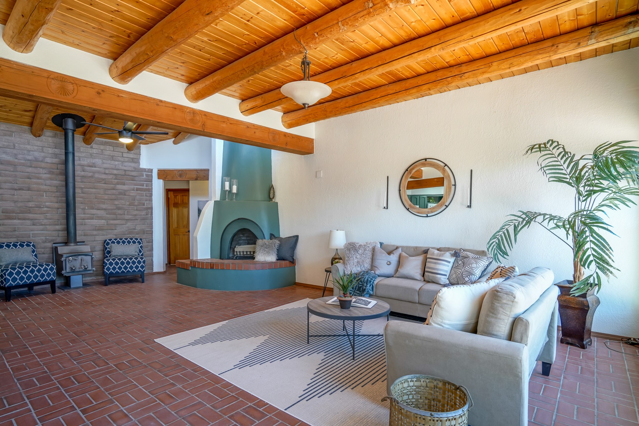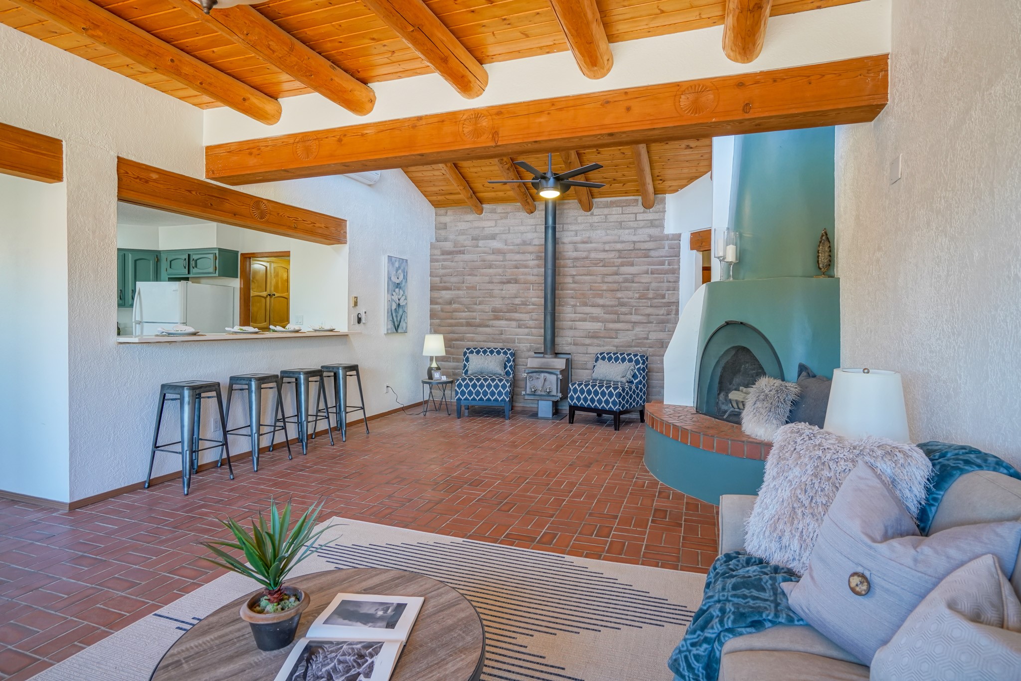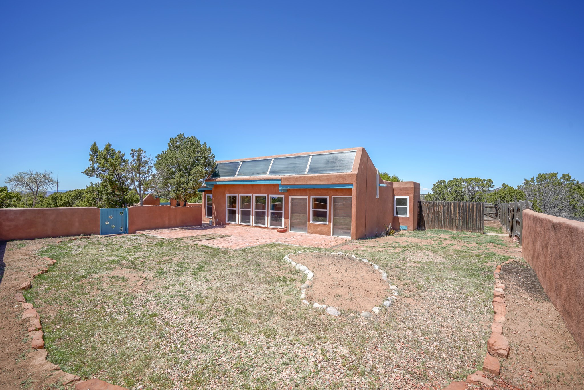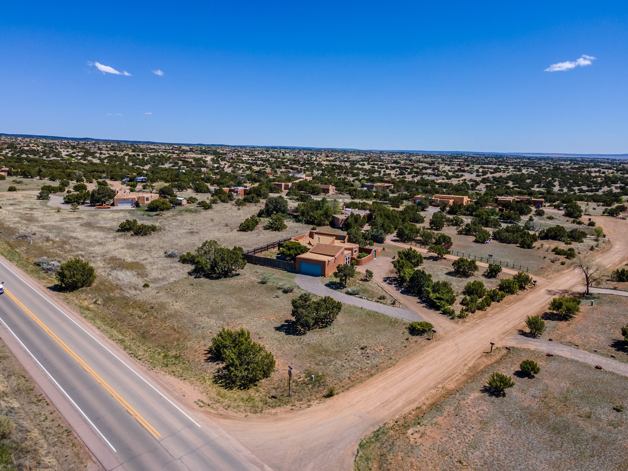 This artfully designed home appears to be nearly sculpted out of the beautiful skies and land of ElDorado. Upon stepping inside, don't be surprised if an utterance of "wow!" escapes you! Thewonderfully open floorplan is simply flooded with beautiful, welcoming New Mexico sunlight that playsupon the fine wood beamed ceiling and classic kiva fireplace. With new windows, passive solar and new mini split units - and you'll be hard pressed not to notice the phenomenal open views in each direction. The spacious, generously cabineted kitchen and bar seating area is bound to be the center of entertainment or relaxation. Stay cozy in the winter with the wood burning stove in the living area. A large backyard is beckoning for your creative designs or uses.