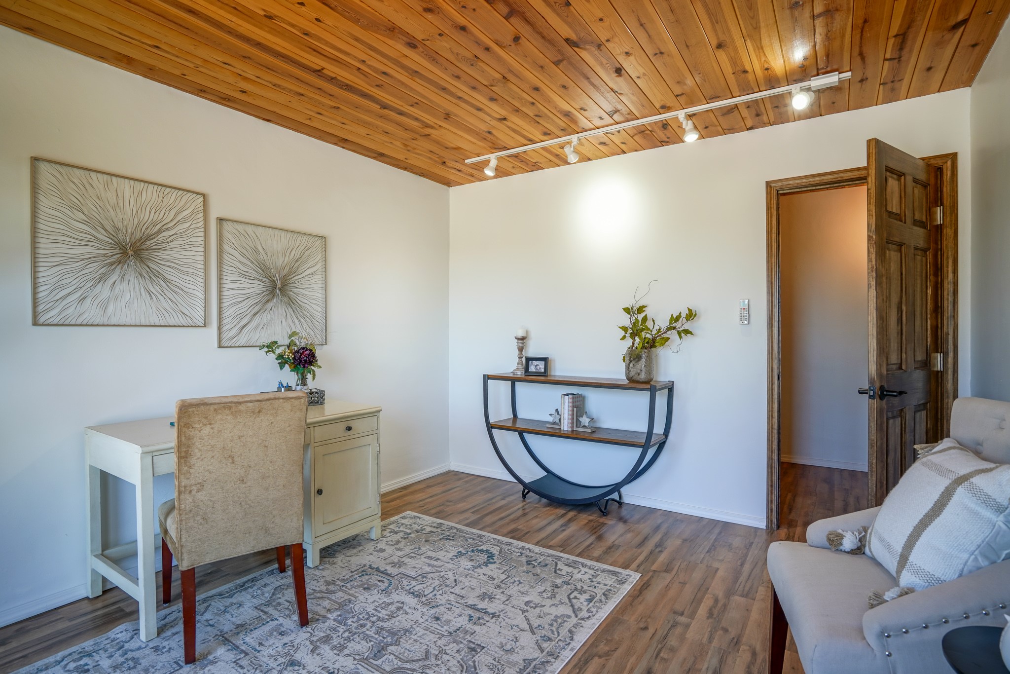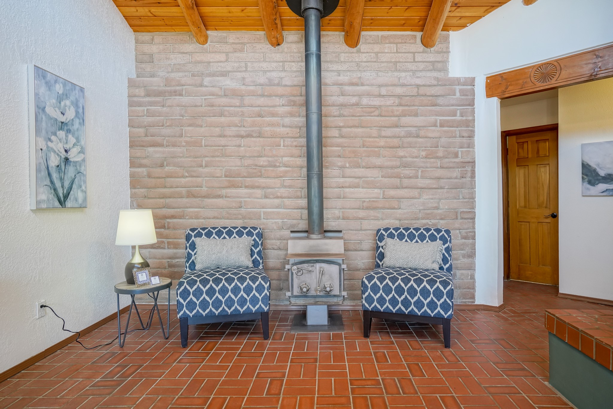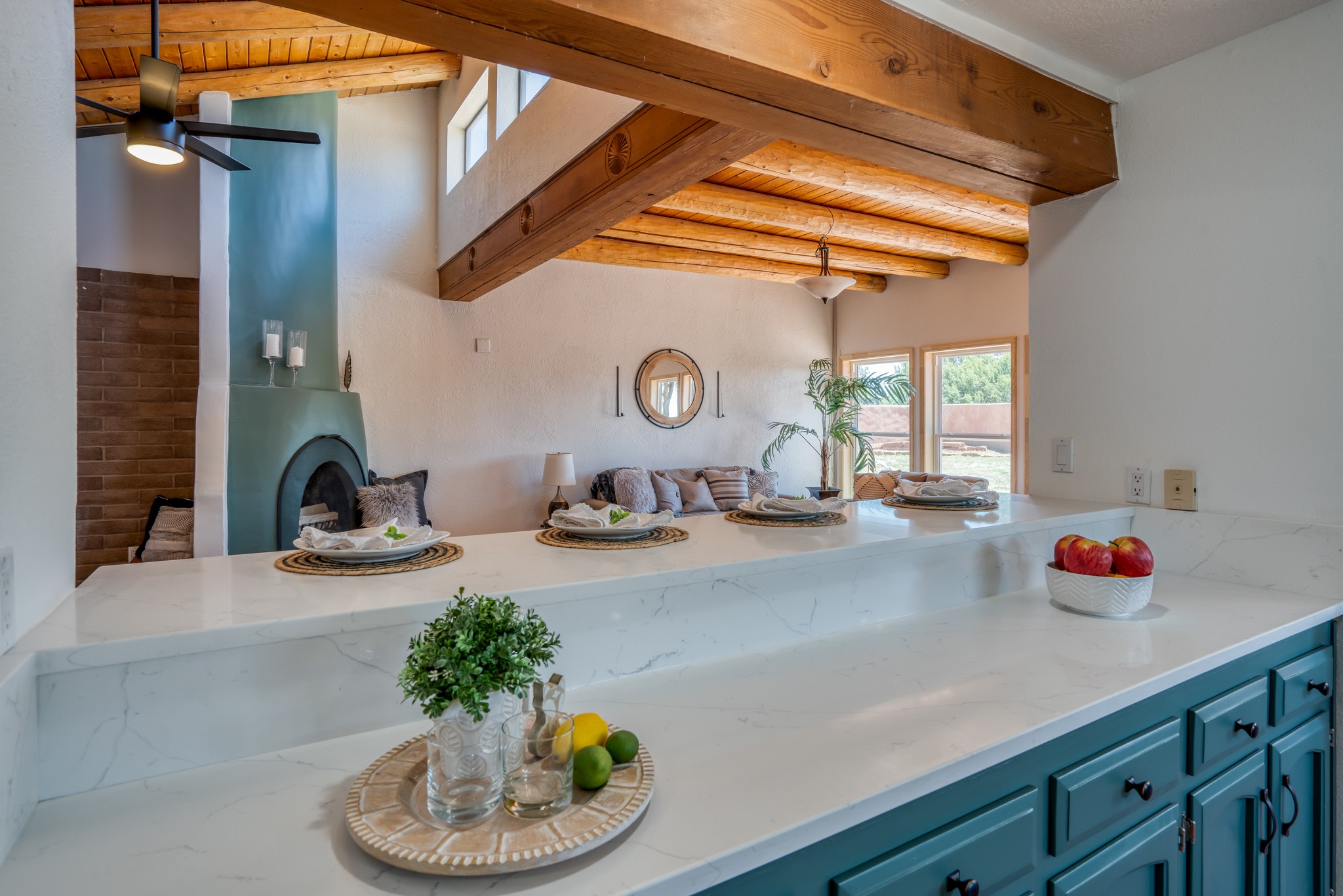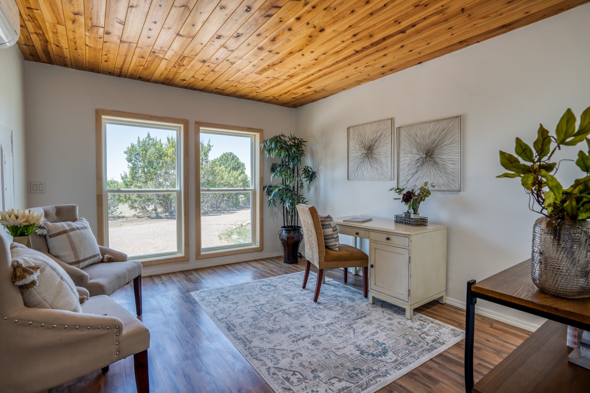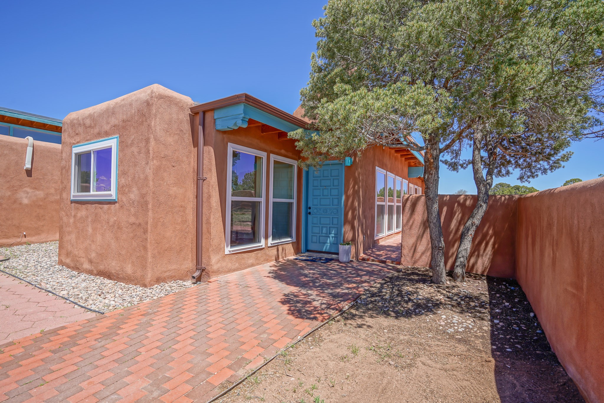 This artfully designed home appears to be nearly sculpted out of the beautiful skies and land of ElDorado. Upon stepping inside, don't be surprised if an utterance of "wow!" escapes you! Thewonderfully open floorplan is simply flooded with beautiful, welcoming New Mexico sunlight that playsupon the fine wood beamed ceiling and classic kiva fireplace. With new windows, passive solar and new mini split units - and you'll be hard pressed not to notice the phenomenal open views in each direction. The spacious, generously cabineted kitchen and bar seating area is bound to be the center of entertainment or relaxation. Stay cozy in the winter with the wood burning stove in the living area. A large backyard is beckoning for your creative designs or uses.