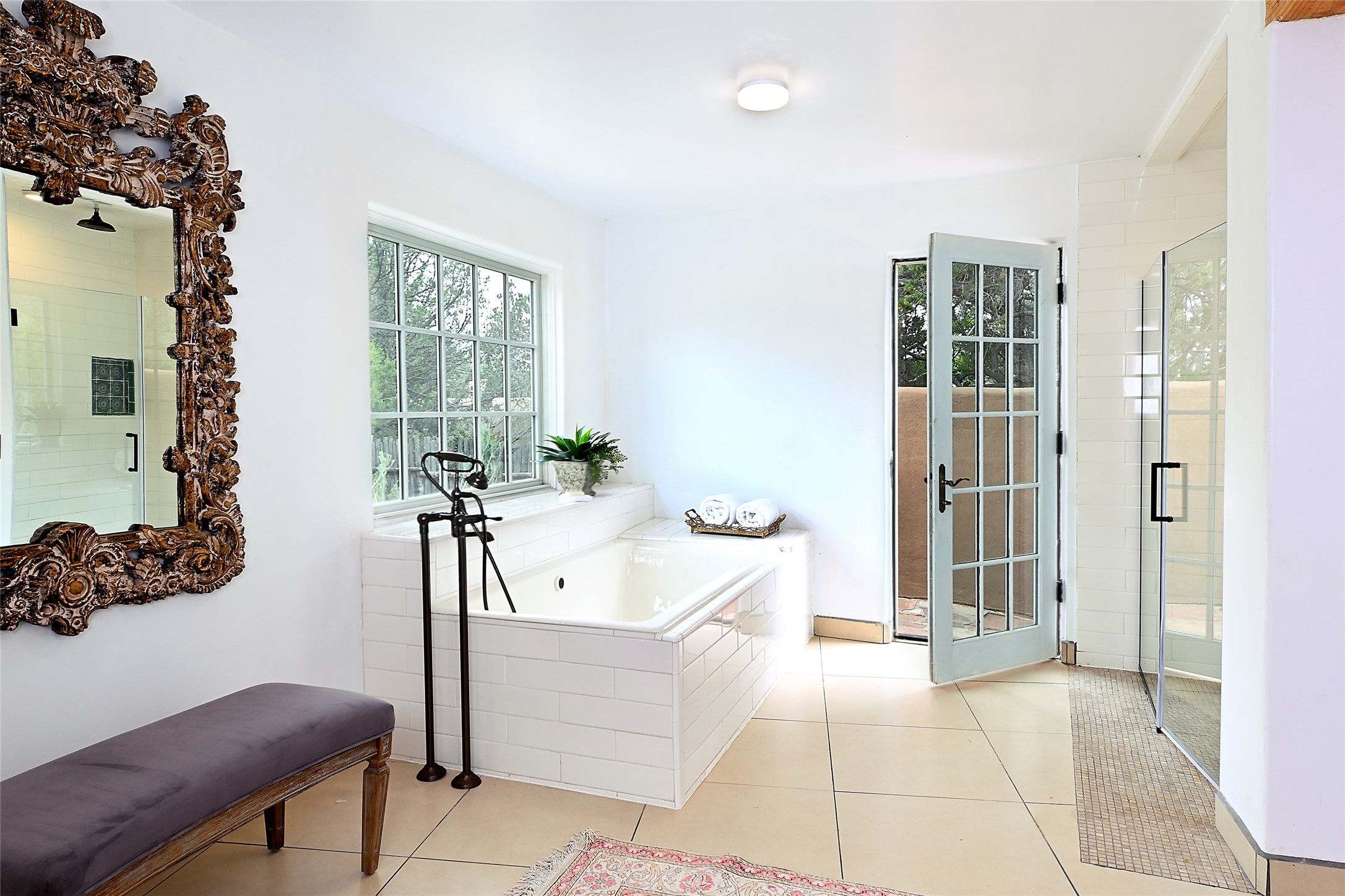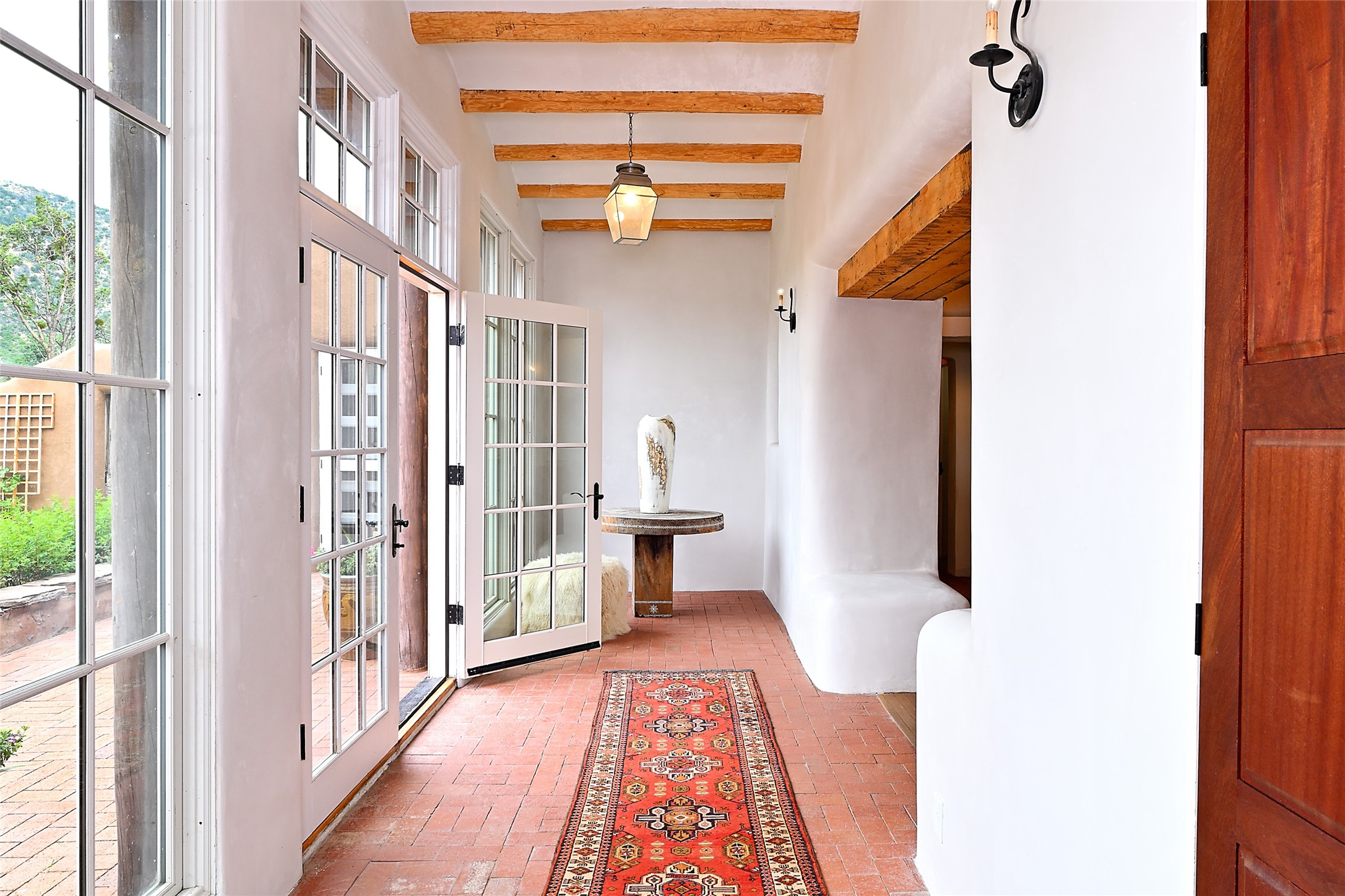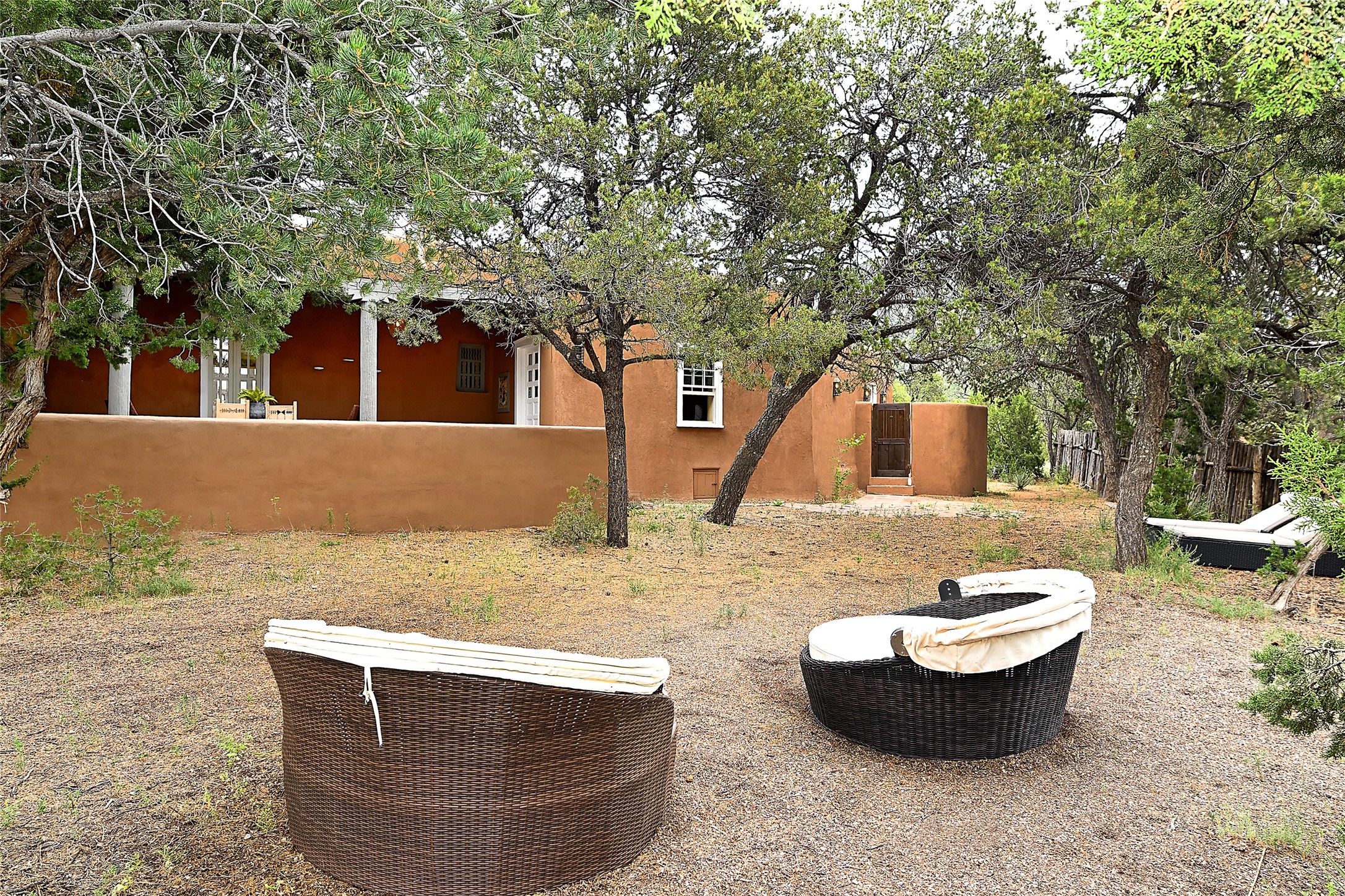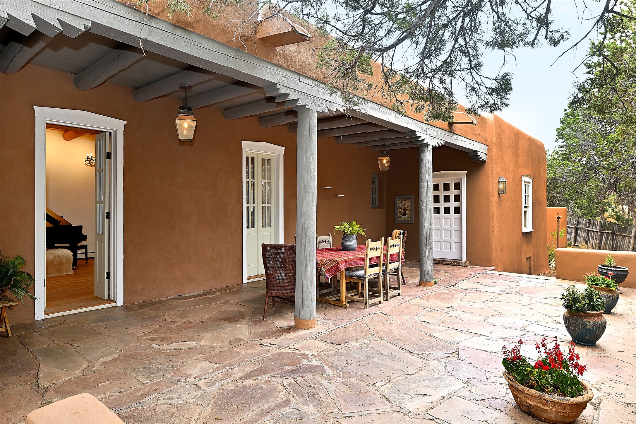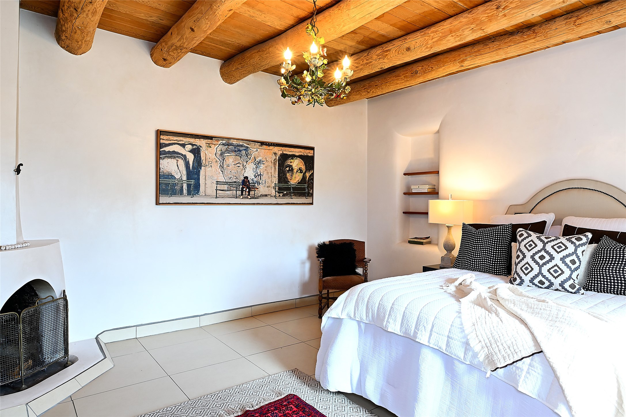 Designed by renowned architect John Gaw Meem and built in 1929, the historic Proctor Compound is sited on two acres in Sun Mountain Estates, on the edge of Museum Hill, and comprises a primary residence, a two-bedroom casita, and a spacious studio. The approximately 6,500-square-foot home is introduced by a courtyard with a classical fountain, a vintage fresco, flagstone terraces, and stunning mountain views. It features four bedrooms, six baths, five portals, a media room, a grand sala, formal dining room, spacious kitchen with superior appliances, a breakfast area, and two offices, laundry rooms, and sunrooms. The two-bedroom casita--which provides two baths, laundry facilities, a private courtyard, and the studio--which offers a full bath, a kitchen, and laundry facilities--lie across a second courtyard with fruit trees. While retaining the 1929 Pueblo Revival design elements and understated elegance for which Meem was known, the property has been carefully rejuvenated with updated systems: plumbing, electrical--including an 11.5 kilowatt solar array--heating, and cooling as well as a new roof, stucco, and windows. Contributing to the distinctive aesthetic are eight fireplaces, bancos, hand-carved doors, oak floors, vigas, beams, corbels, and replastered interior walls with original contours and soft edges. The skylit three-car garage could also serve as a workshop or studio. This is a rare opportunity not to be missed.