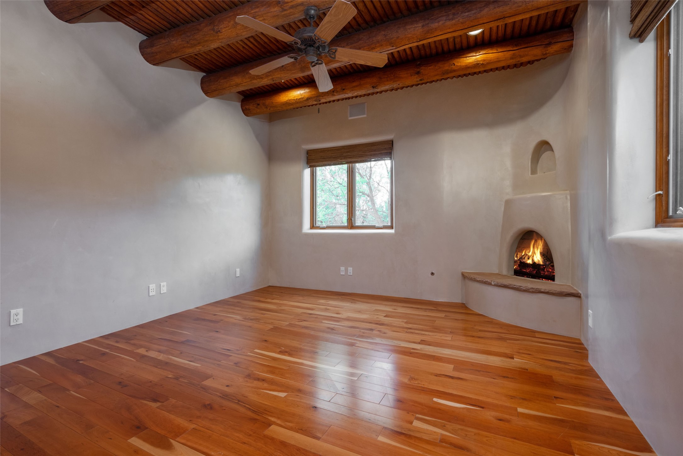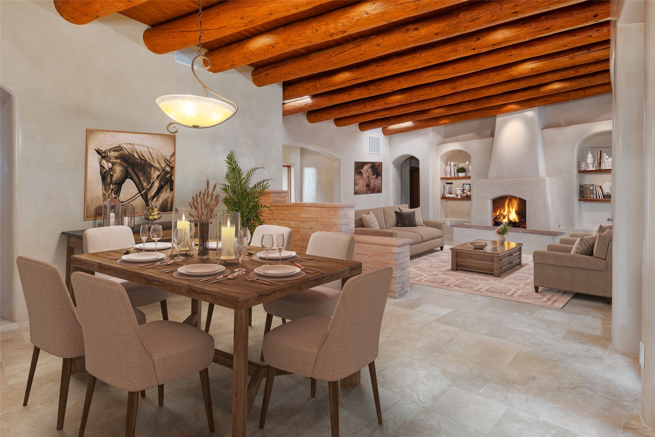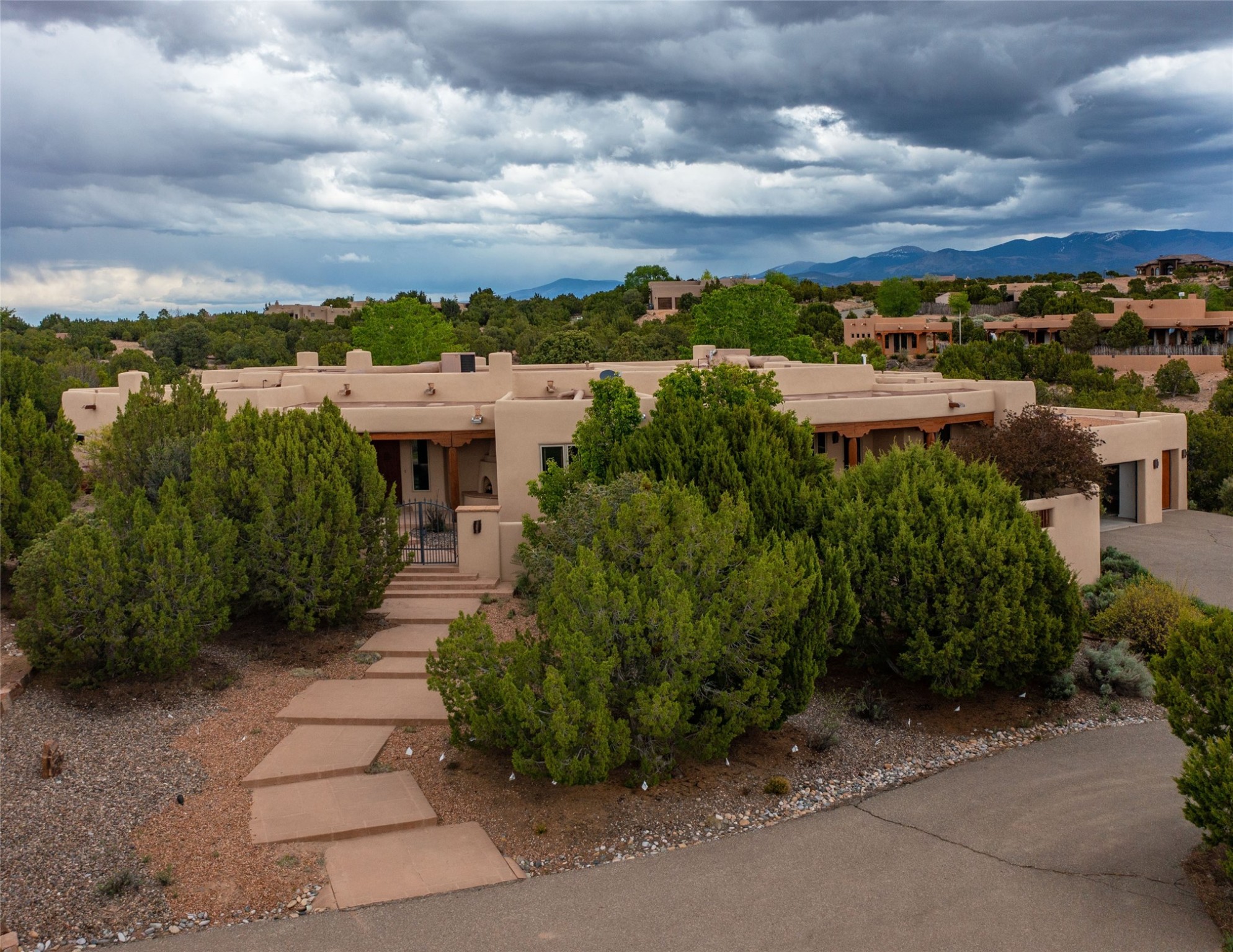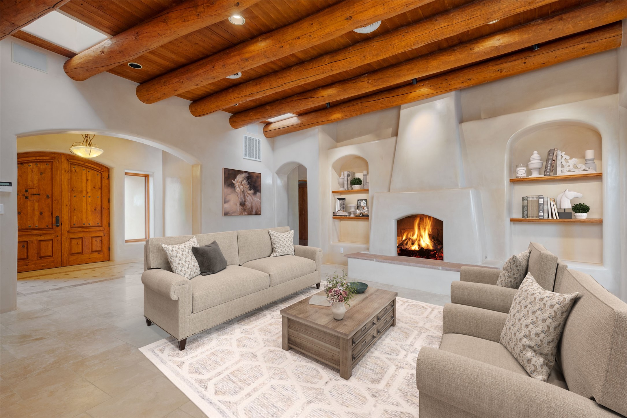 Minutes to downtown Santa Fe, this 4393 sqft single level 4 bedroom 3 1/2 bath home is sited on 2.5 acres. The open floor plan, plaster walls, vigas, and high ceilings welcome you into this traditional Santa Fe style home. A wine room, 4 interior and 2 exterior gas viga fireplaces, as well as skylights throughout, add to its charm. The covered portal is designed as an extension of the living areas and is accessible through multiple glass doors along the north side of the home. It includes a kiva fireplace, built-in Bar-B-Q, and refrigerator. The kitchen is spacious, open, and bright with a south-facing window that overlooks a private courtyard with forever views. This home also has a 9 ft bar that adjoins the family room with additional beautiful built-in custom cabinetry. The walk-in pantry has floor-to-ceiling shelving and is conveniently located off the kitchen. The primary bedroom suite includes a large bath with his & her vanities, jetted tub, oversized shower and walk-in closet. The suite also has a fully walled courtyard for a private retreat. There are two ensuite bedrooms with private baths and walk-in closets, as well as an additional bedroom that can be used as an office. This solar-powered home includes a 3 car garage, radiant heat and two HVAC units for additional heating and refrigerated air. County Assessor shows the square footage at 4393 which differs from the floor plan provided. Neither Listing Brokers nor Seller warrant the square footage of the home or lot. If size of the home or lot are of material consideration to the Buyer, then the Buyer should have them measured. Tax Levy is from the Assessor website. All fires depicted are photo-shopped. Buyer to verify functionality of the fireplaces.