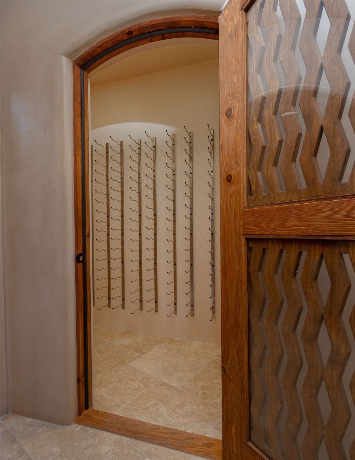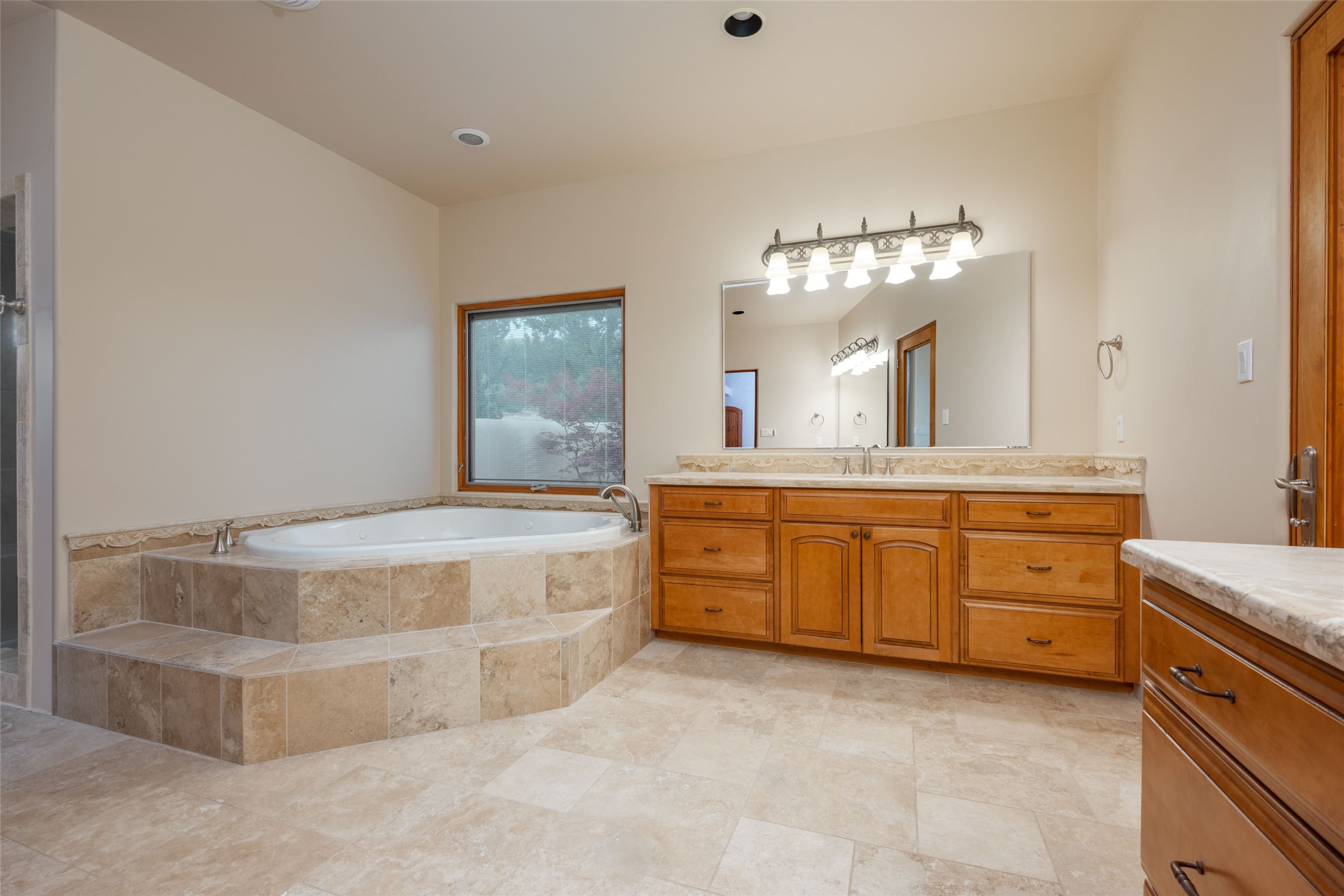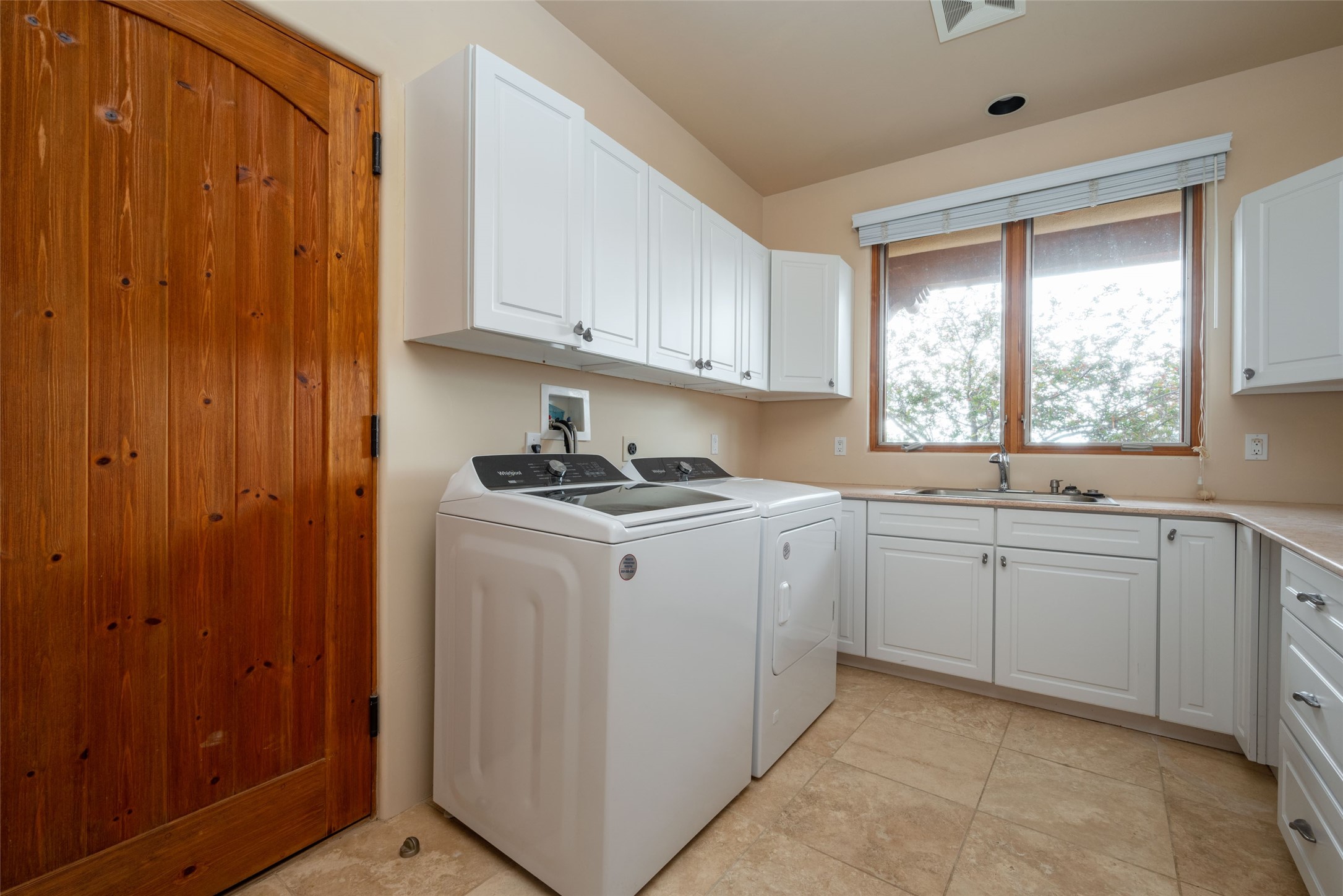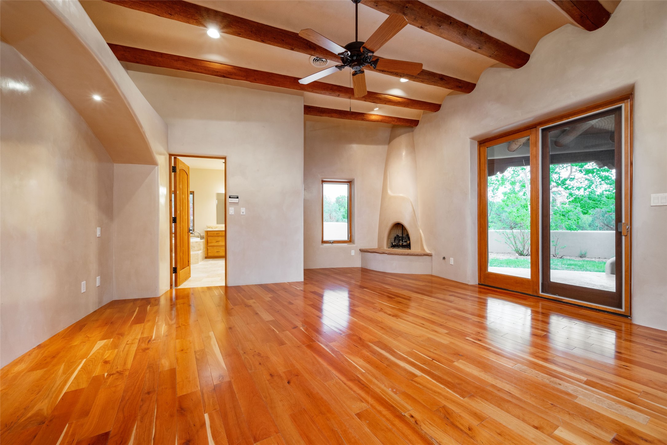 Minutes to downtown Santa Fe, this 4393 sqft single level 4 bedroom 3 1/2 bath home is sited on 2.5 acres. The open floor plan, plaster walls, vigas, and high ceilings welcome you into this traditional Santa Fe style home. A wine room, 4 interior and 2 exterior gas viga fireplaces, as well as skylights throughout, add to its charm. The covered portal is designed as an extension of the living areas and is accessible through multiple glass doors along the north side of the home. It includes a kiva fireplace, built-in Bar-B-Q, and refrigerator. The kitchen is spacious, open, and bright with a south-facing window that overlooks a private courtyard with forever views. This home also has a 9 ft bar that adjoins the family room with additional beautiful built-in custom cabinetry. The walk-in pantry has floor-to-ceiling shelving and is conveniently located off the kitchen. The primary bedroom suite includes a large bath with his & her vanities, jetted tub, oversized shower and walk-in closet. The suite also has a fully walled courtyard for a private retreat. There are two ensuite bedrooms with private baths and walk-in closets, as well as an additional bedroom that can be used as an office. This solar-powered home includes a 3 car garage, radiant heat and two HVAC units for additional heating and refrigerated air. County Assessor shows the square footage at 4393 which differs from the floor plan provided. Neither Listing Brokers nor Seller warrant the square footage of the home or lot. If size of the home or lot are of material consideration to the Buyer, then the Buyer should have them measured. Tax Levy is from the Assessor website. All fires depicted are photo-shopped. Buyer to verify functionality of the fireplaces.