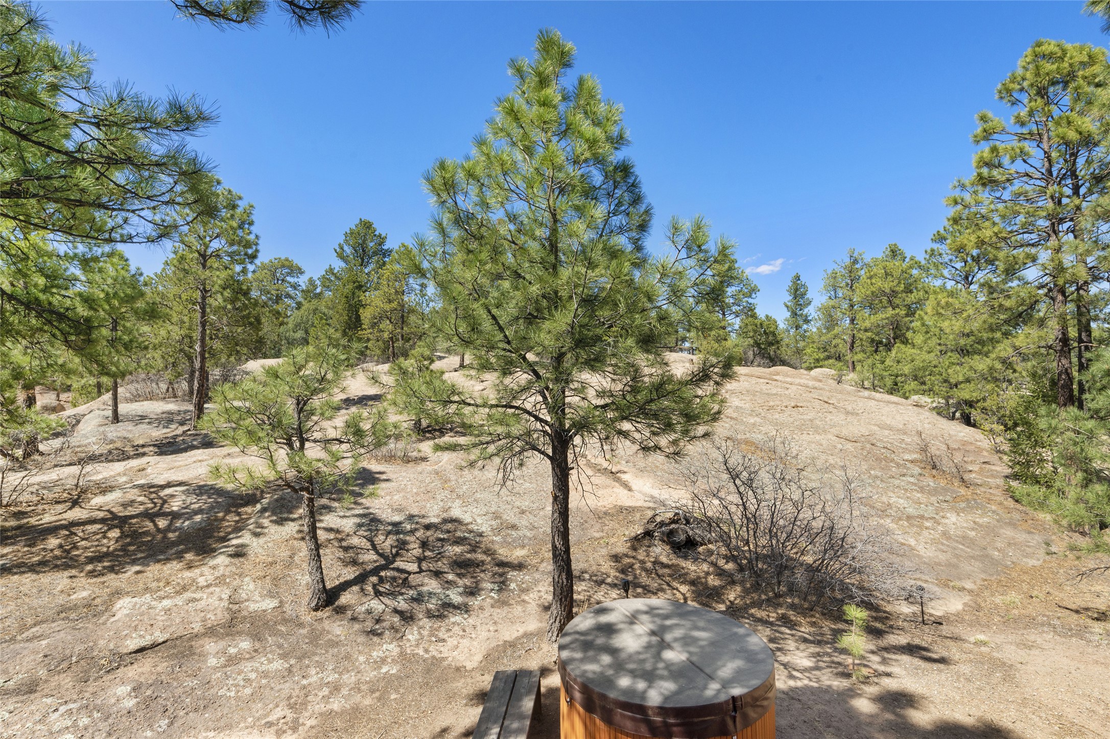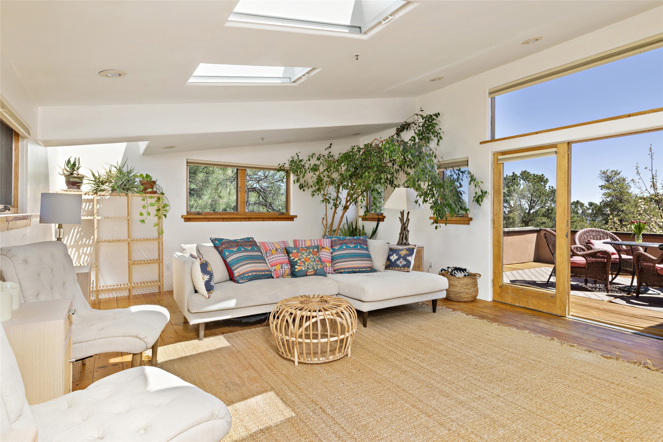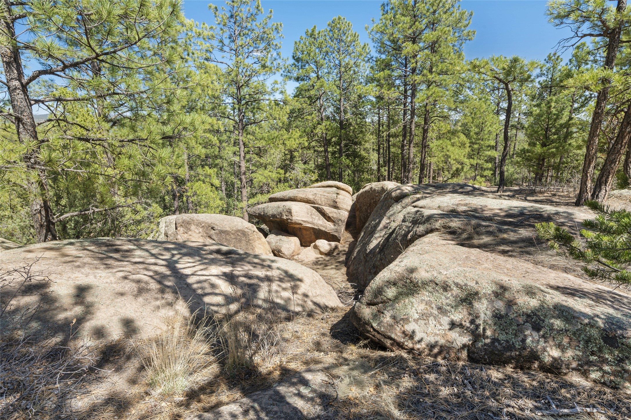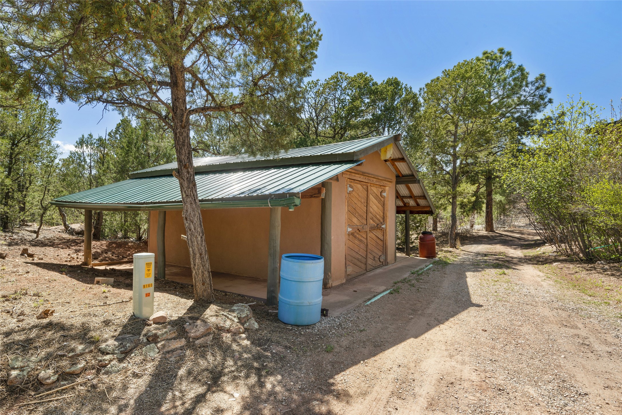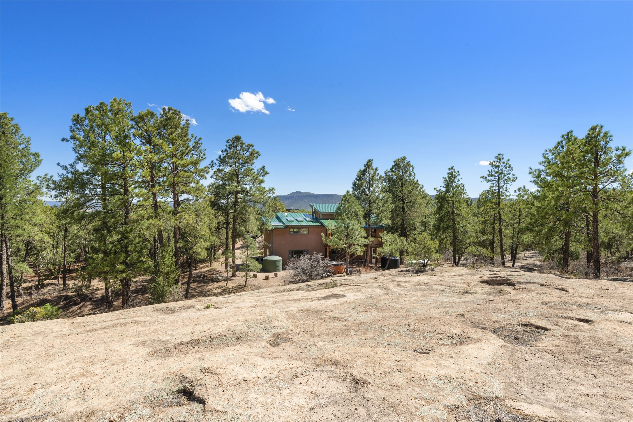 Located at the top of the hill amid Ponderosa pines and incredible rock outcroppings, this magical 4-acre property with income producing rental, is a single family residence with two completely separate living spaces of 1700 sq ft and 1500 sq ft which are separately metered and have two bedrooms each. This passive solar home was owner built with lumber from the surrounding forest and has loads of light, skylights, and views, as well as a front garden planted by a master gardener with fruit trees and perennials. The pro-panel roof is 7 years old, the eco-septic system by AAA is 3 years old and there is also fire suppression system; as well as a garage/workshop. Peaceful and quiet, with incredible starry night skies, there is amazing hiking and wildlife watching. Perfect for those desiring to be immersed in nature and close to Santa Fe!