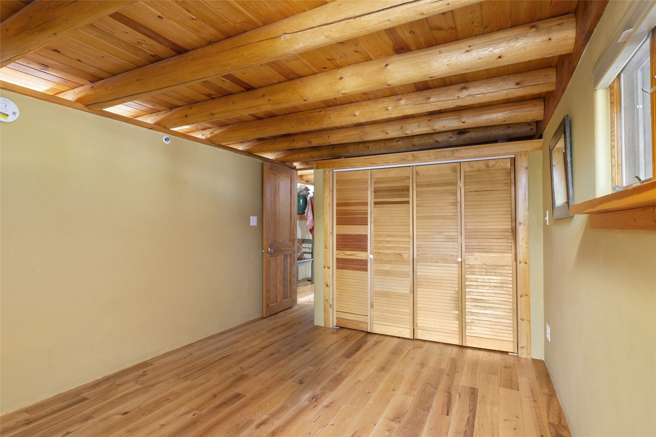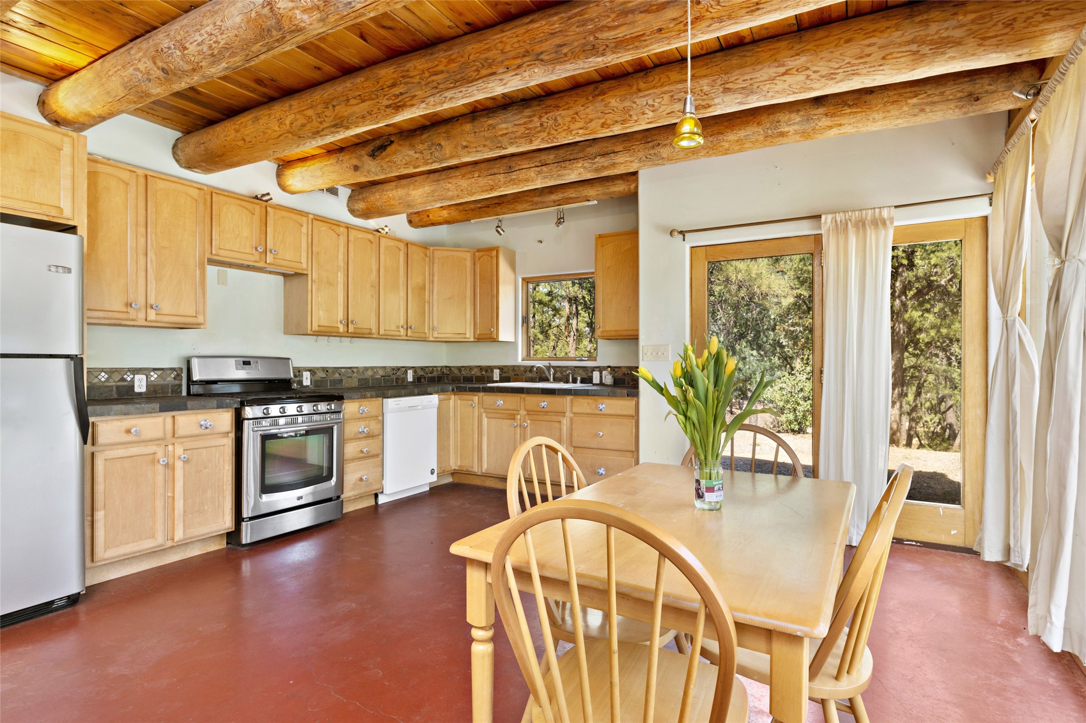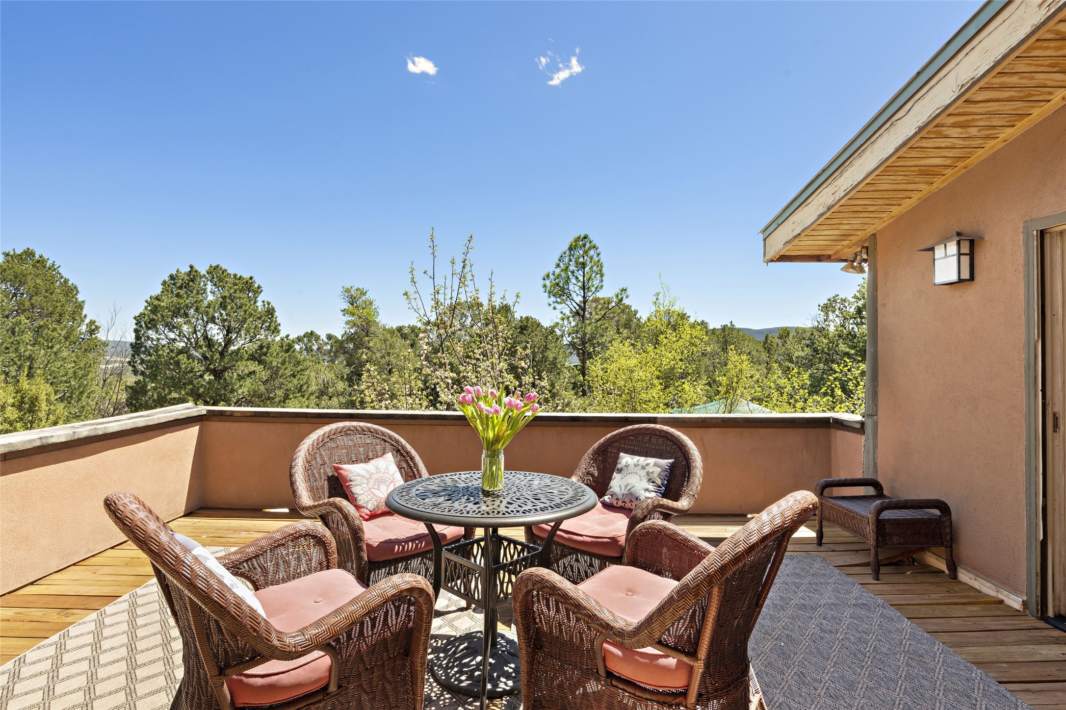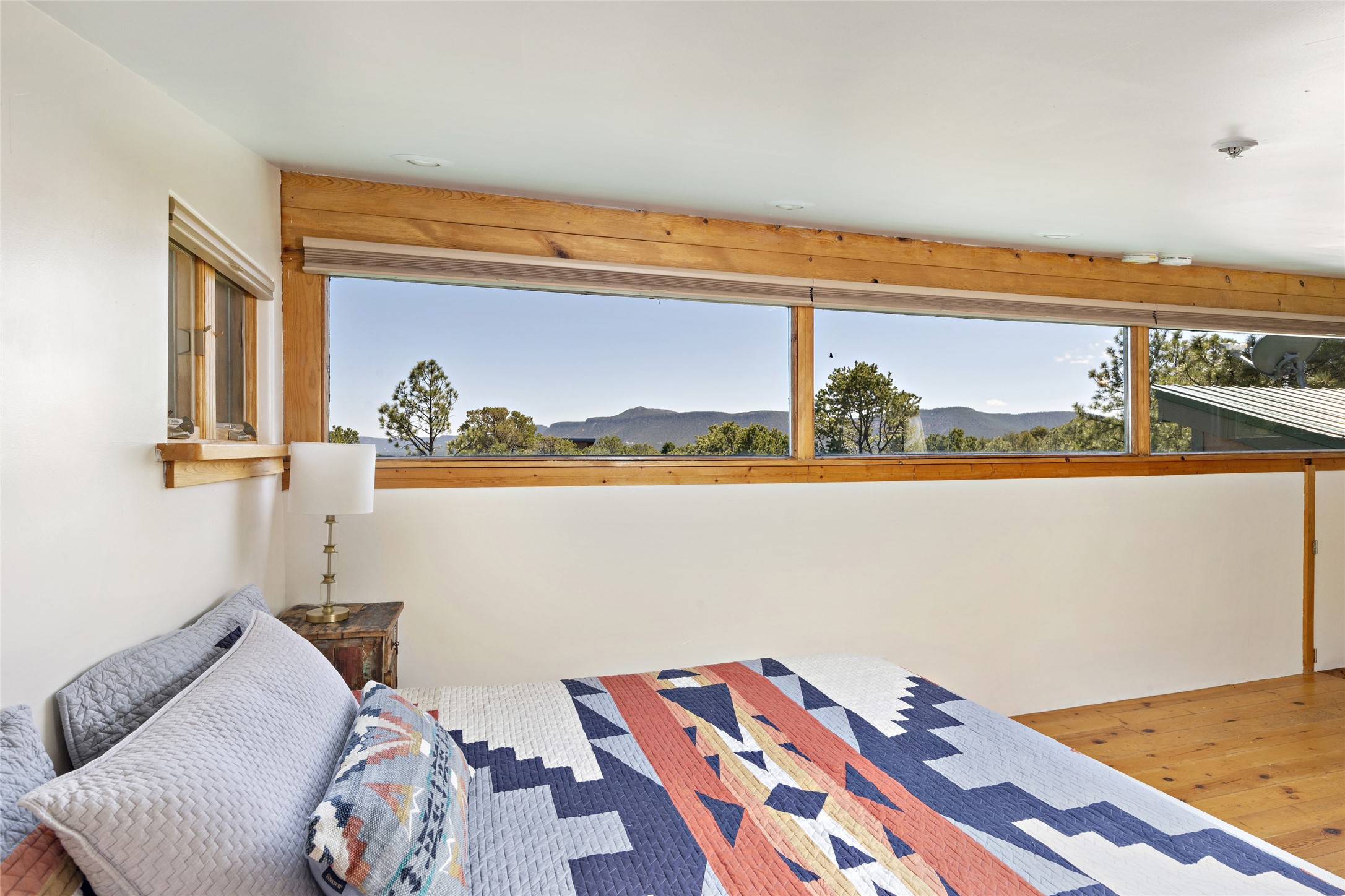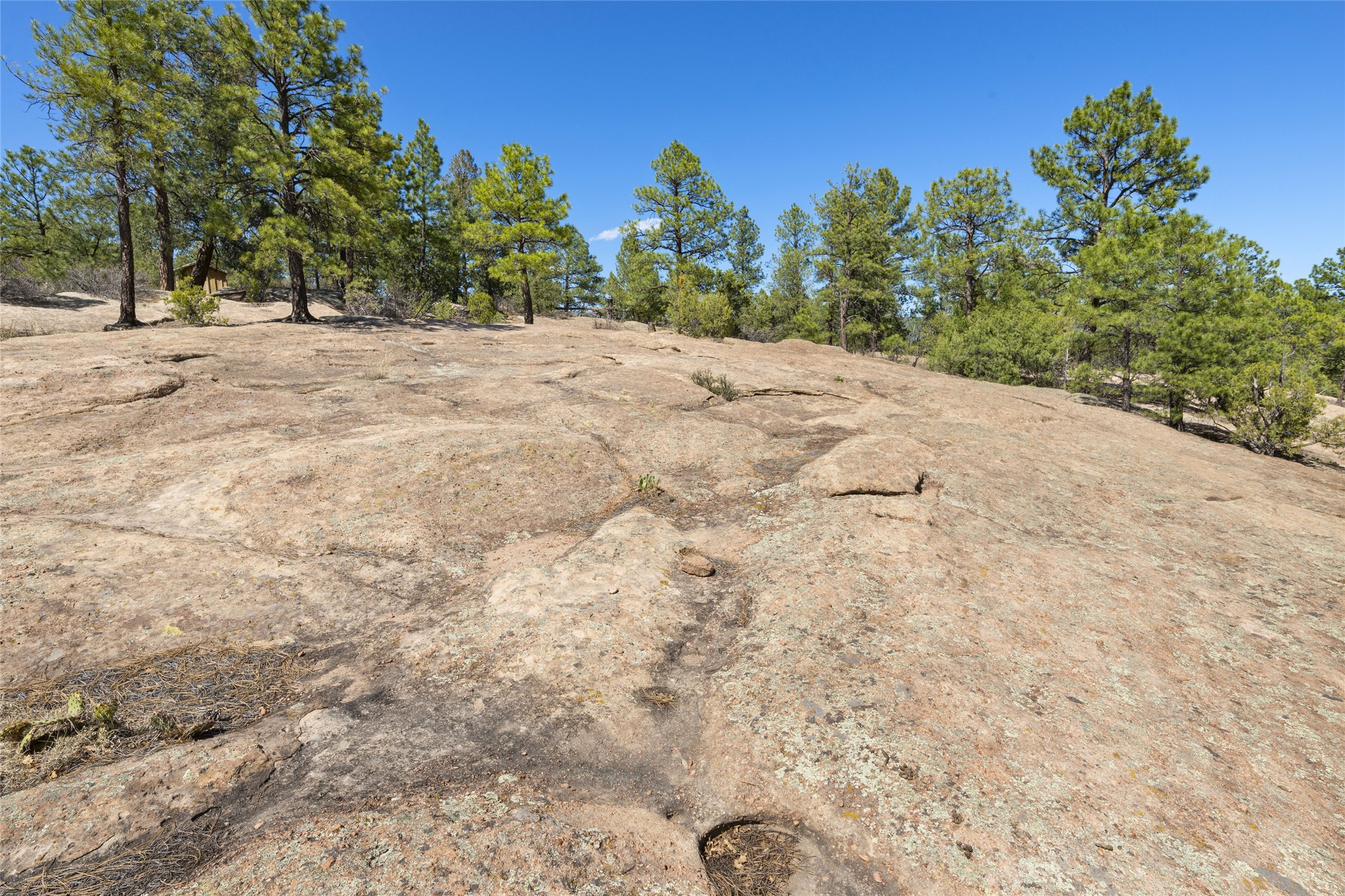 Located at the top of the hill amid Ponderosa pines and incredible rock outcroppings, this magical 4-acre property with income producing rental, is a single family residence with two completely separate living spaces of 1700 sq ft and 1500 sq ft which are separately metered and have two bedrooms each. This passive solar home was owner built with lumber from the surrounding forest and has loads of light, skylights, and views, as well as a front garden planted by a master gardener with fruit trees and perennials. The pro-panel roof is 7 years old, the eco-septic system by AAA is 3 years old and there is also fire suppression system; as well as a garage/workshop. Peaceful and quiet, with incredible starry night skies, there is amazing hiking and wildlife watching. Perfect for those desiring to be immersed in nature and close to Santa Fe!
