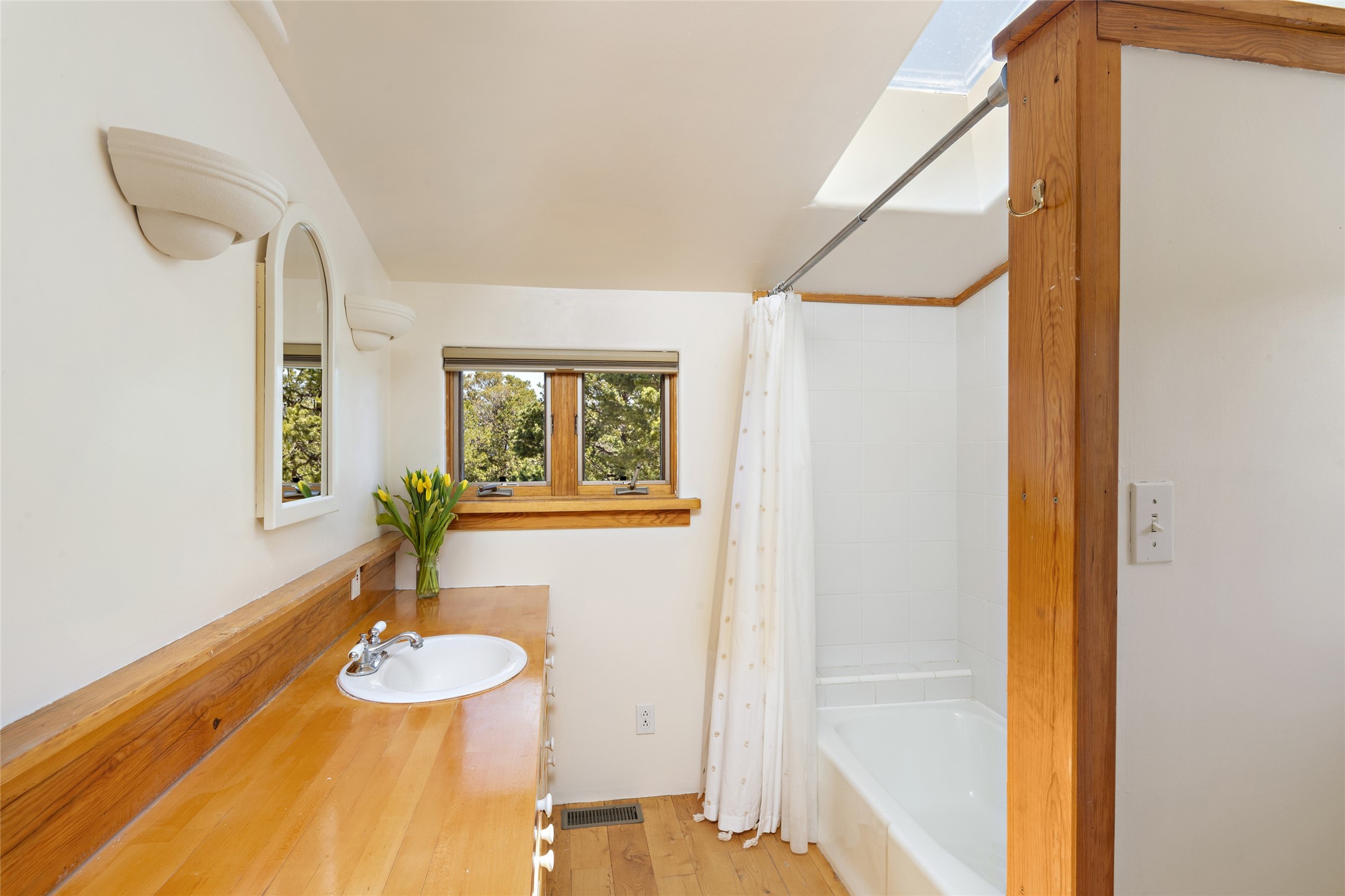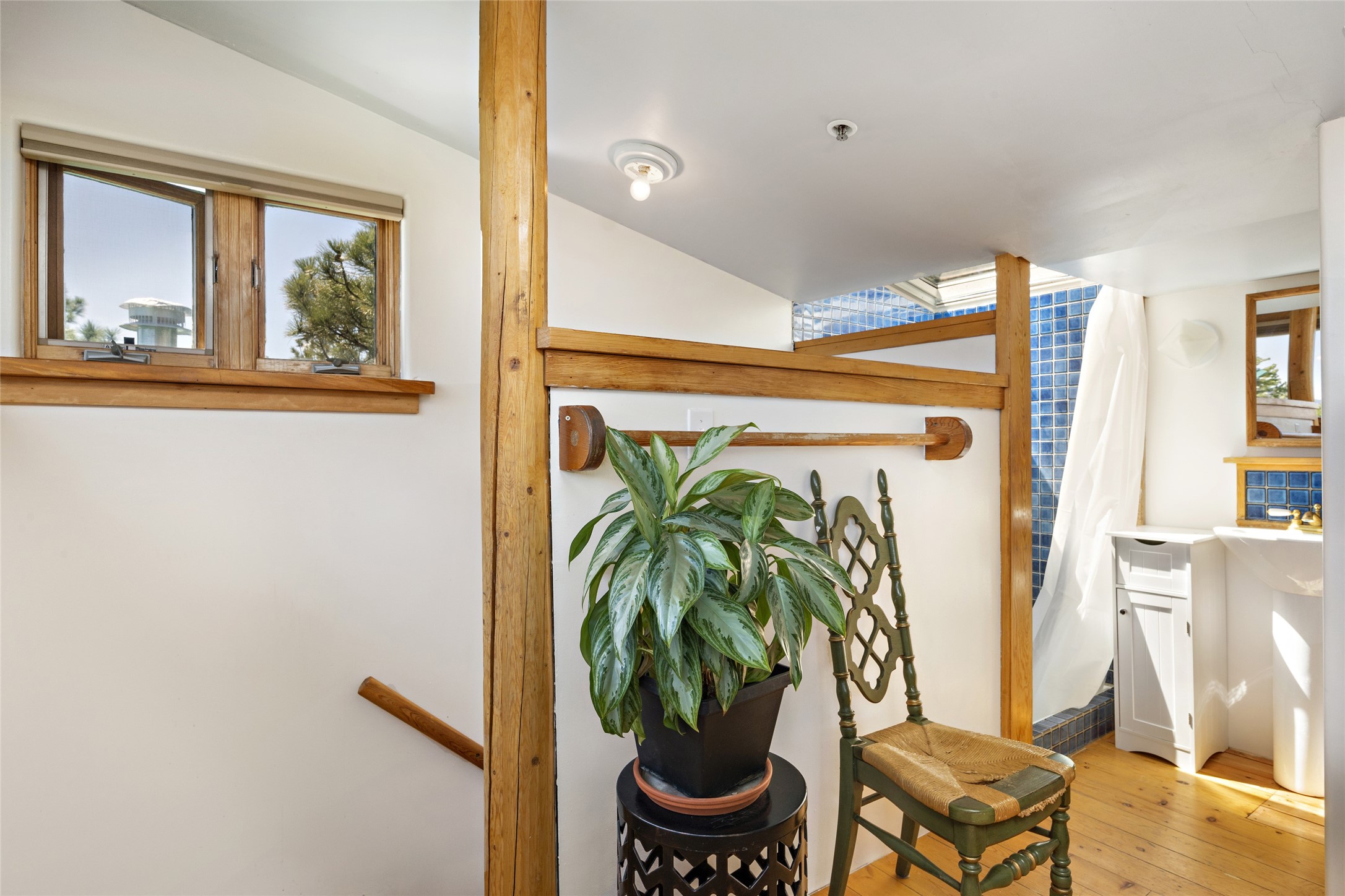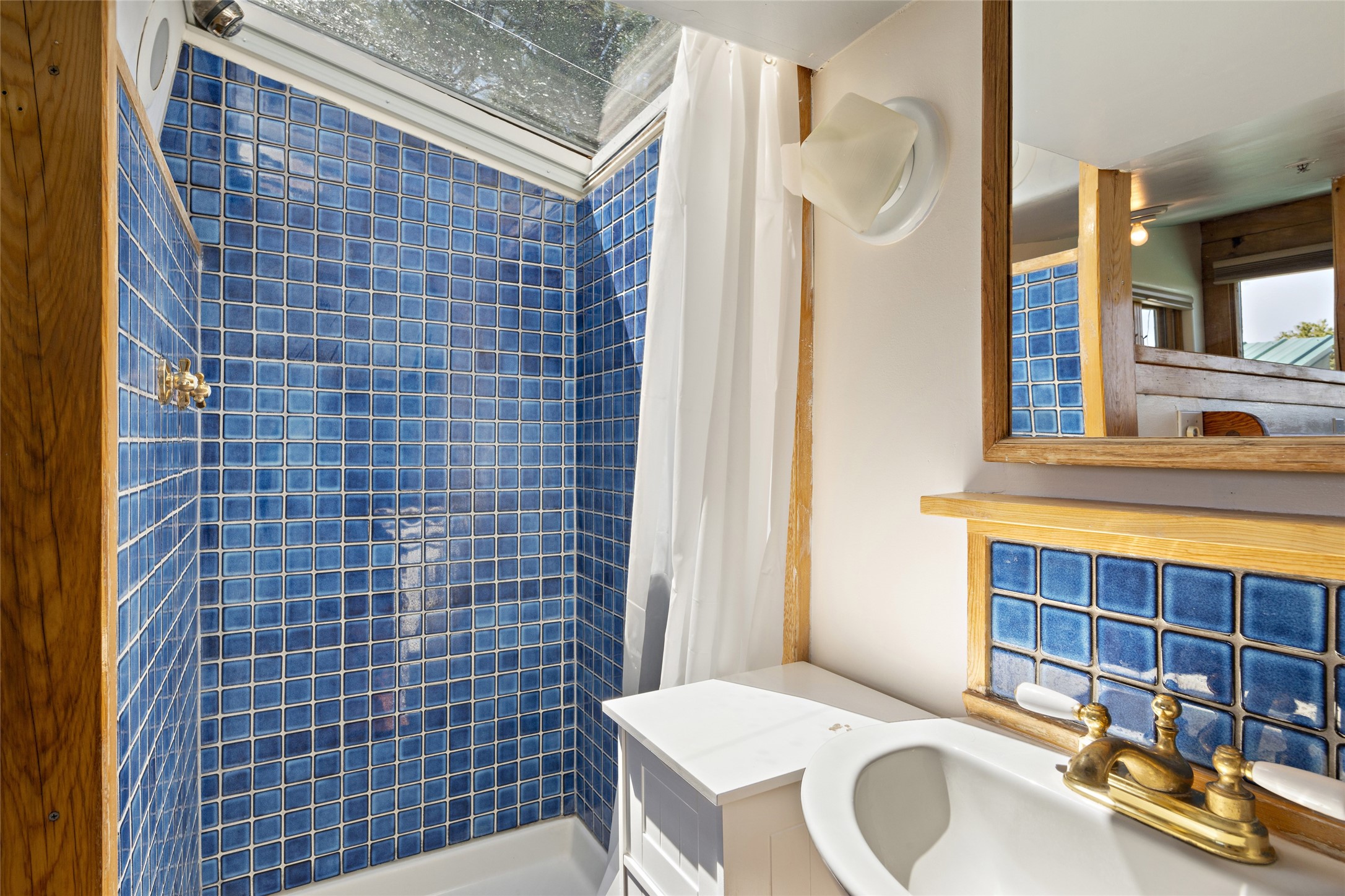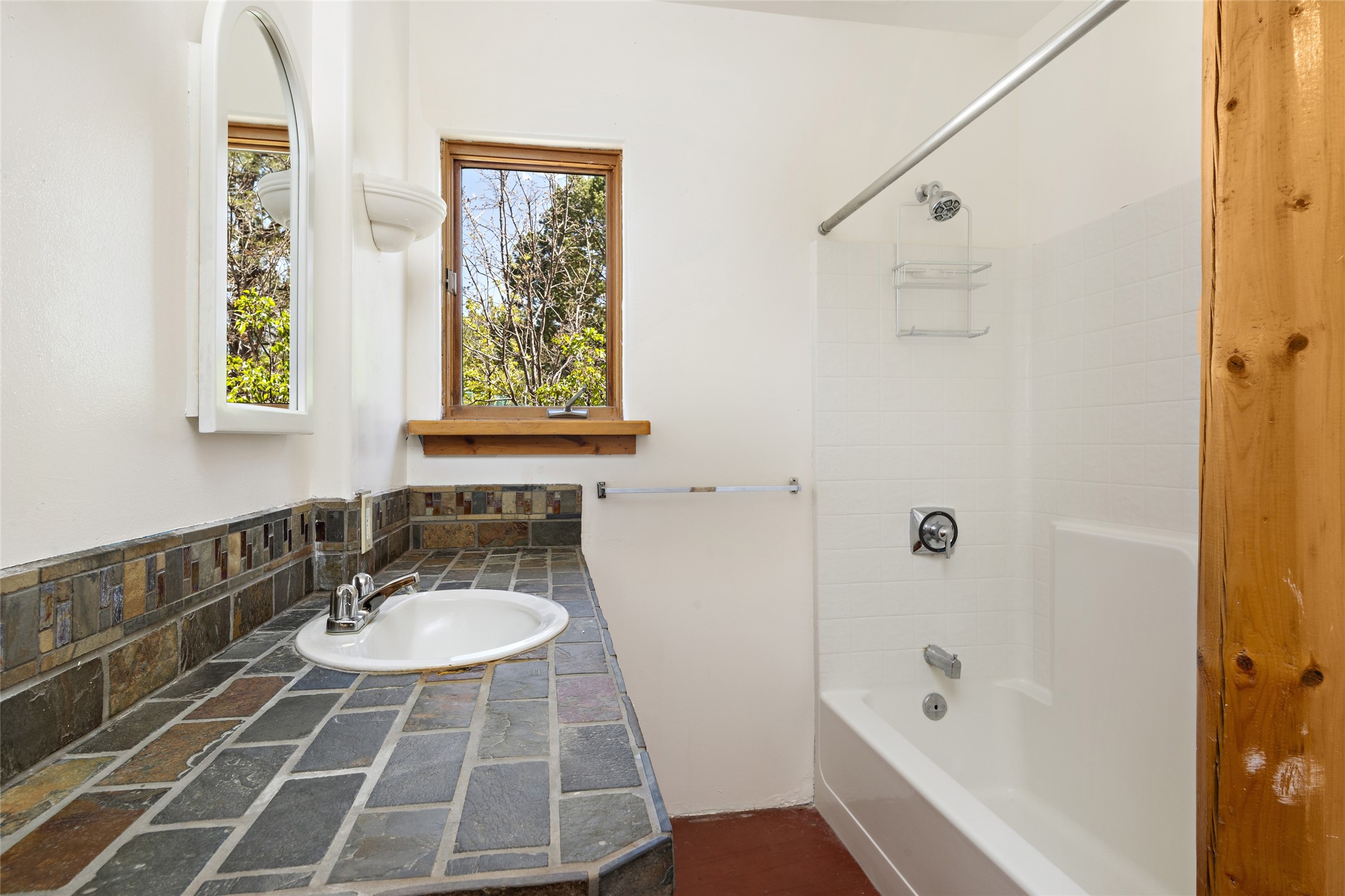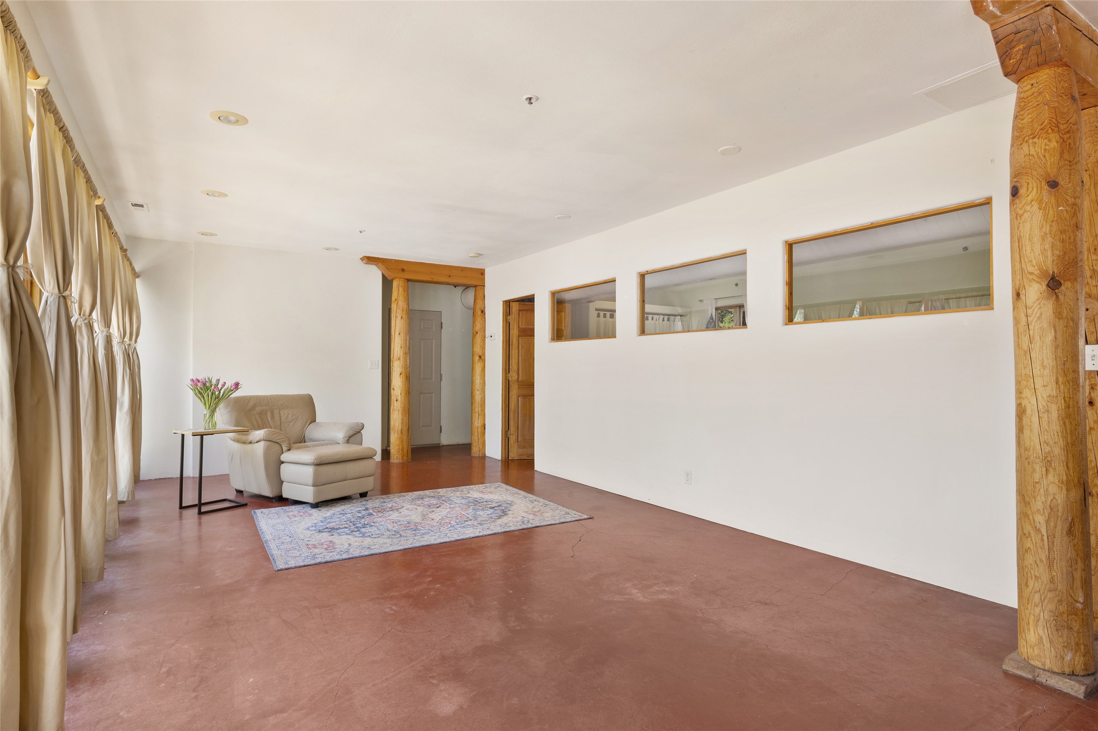 Located at the top of the hill amid Ponderosa pines and incredible rock outcroppings, this magical 4-acre property with income producing rental, is a single family residence with two completely separate living spaces of 1700 sq ft and 1500 sq ft which are separately metered and have two bedrooms each. This passive solar home was owner built with lumber from the surrounding forest and has loads of light, skylights, and views, as well as a front garden planted by a master gardener with fruit trees and perennials. The pro-panel roof is 7 years old, the eco-septic system by AAA is 3 years old and there is also fire suppression system; as well as a garage/workshop. Peaceful and quiet, with incredible starry night skies, there is amazing hiking and wildlife watching. Perfect for those desiring to be immersed in nature and close to Santa Fe!