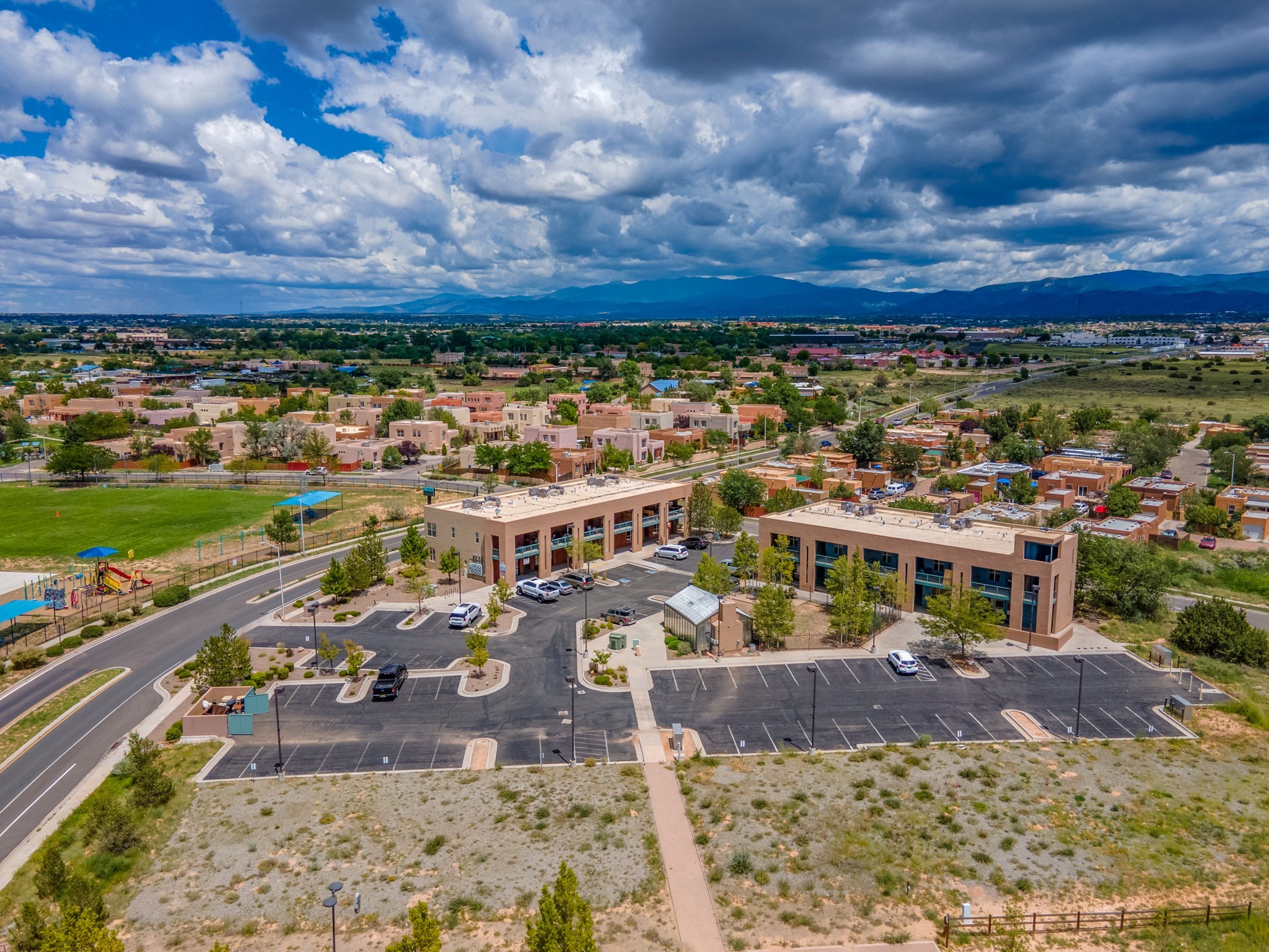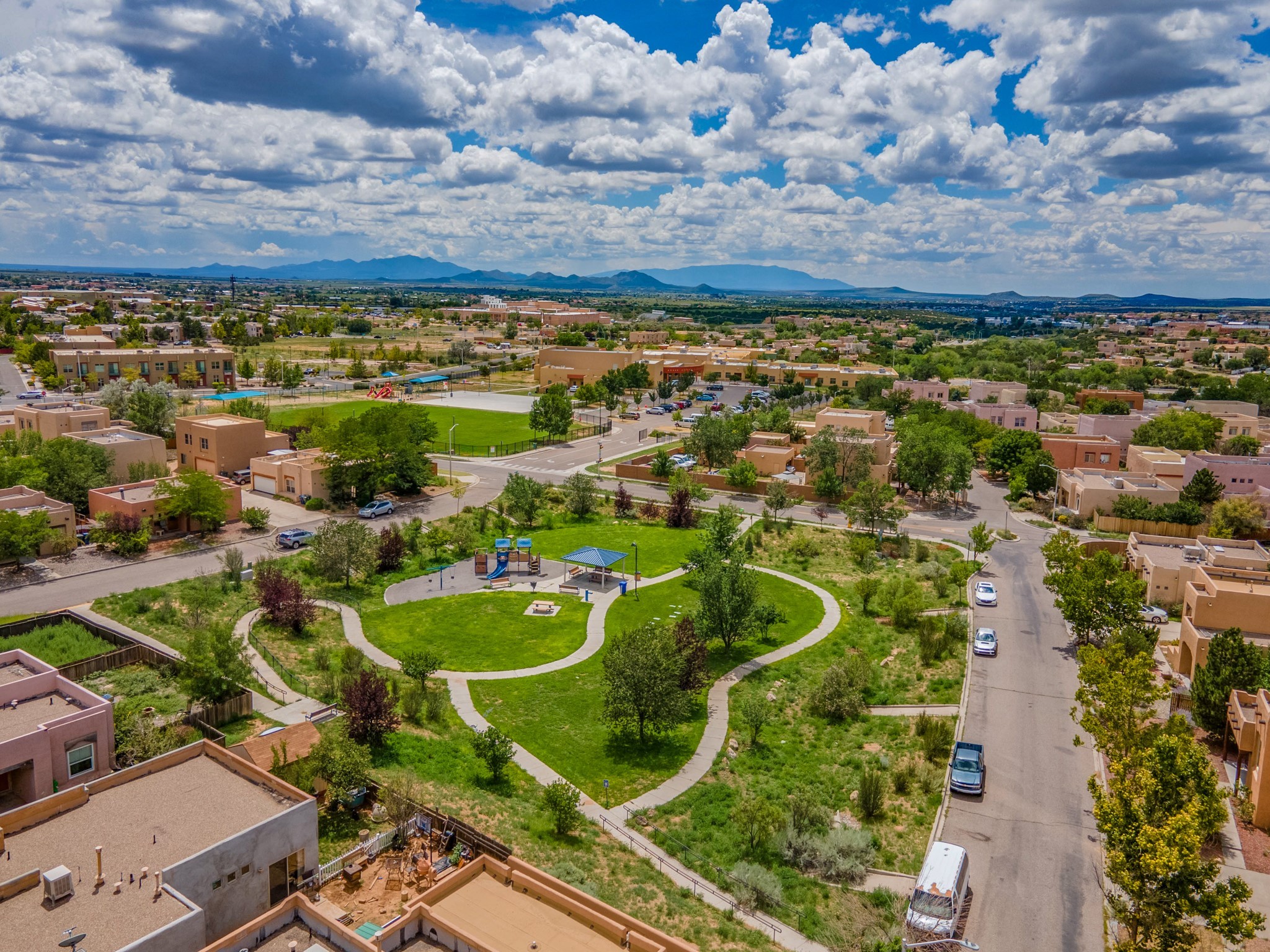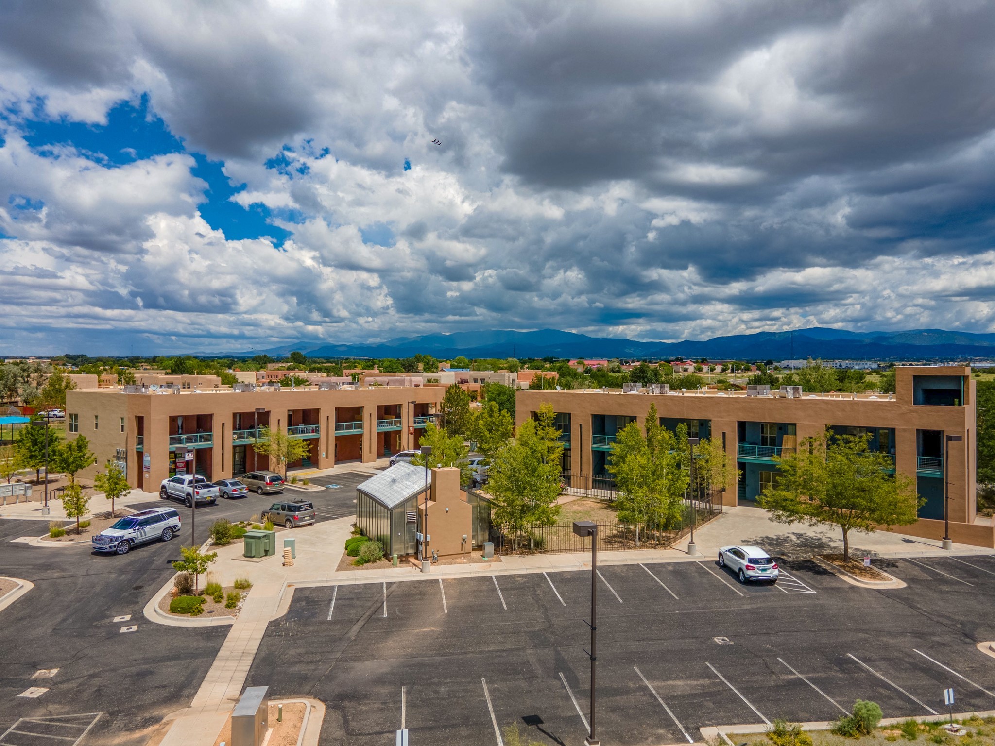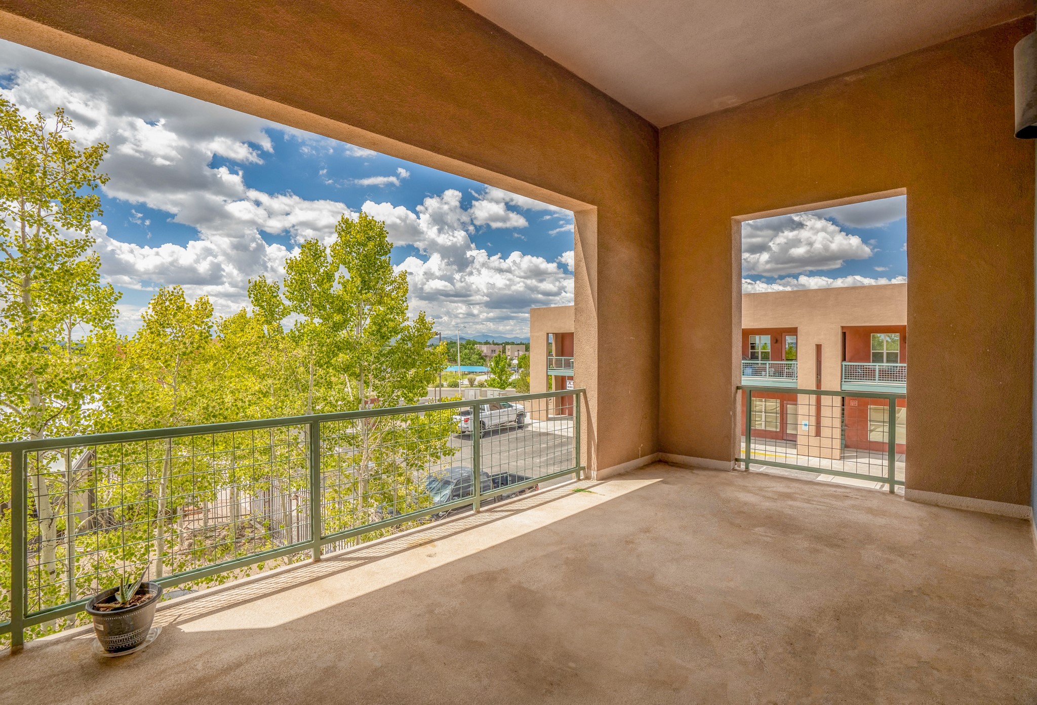 Bright, open second floor condominium with views of Sangre De Cristos and Sandias, end/corner unit with almost 200 sq ft of covered balcony. This stylish one bedroom features an updated kitchen, refrigerated air and a stackable washer/dryer. HOA pays for garbage, roof, stucco and HVAC maintenance. Owner is a NM Real Estate Broker.