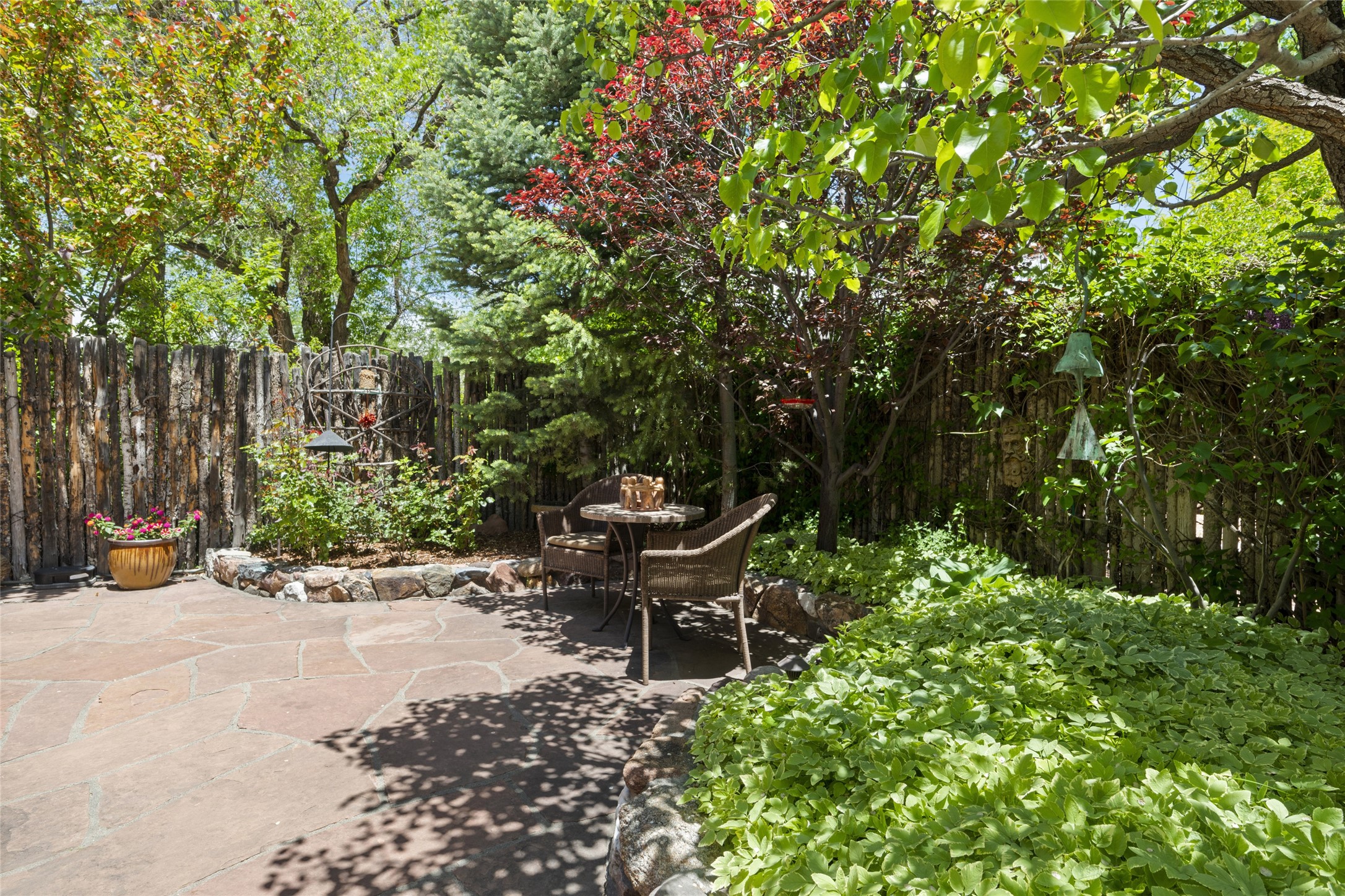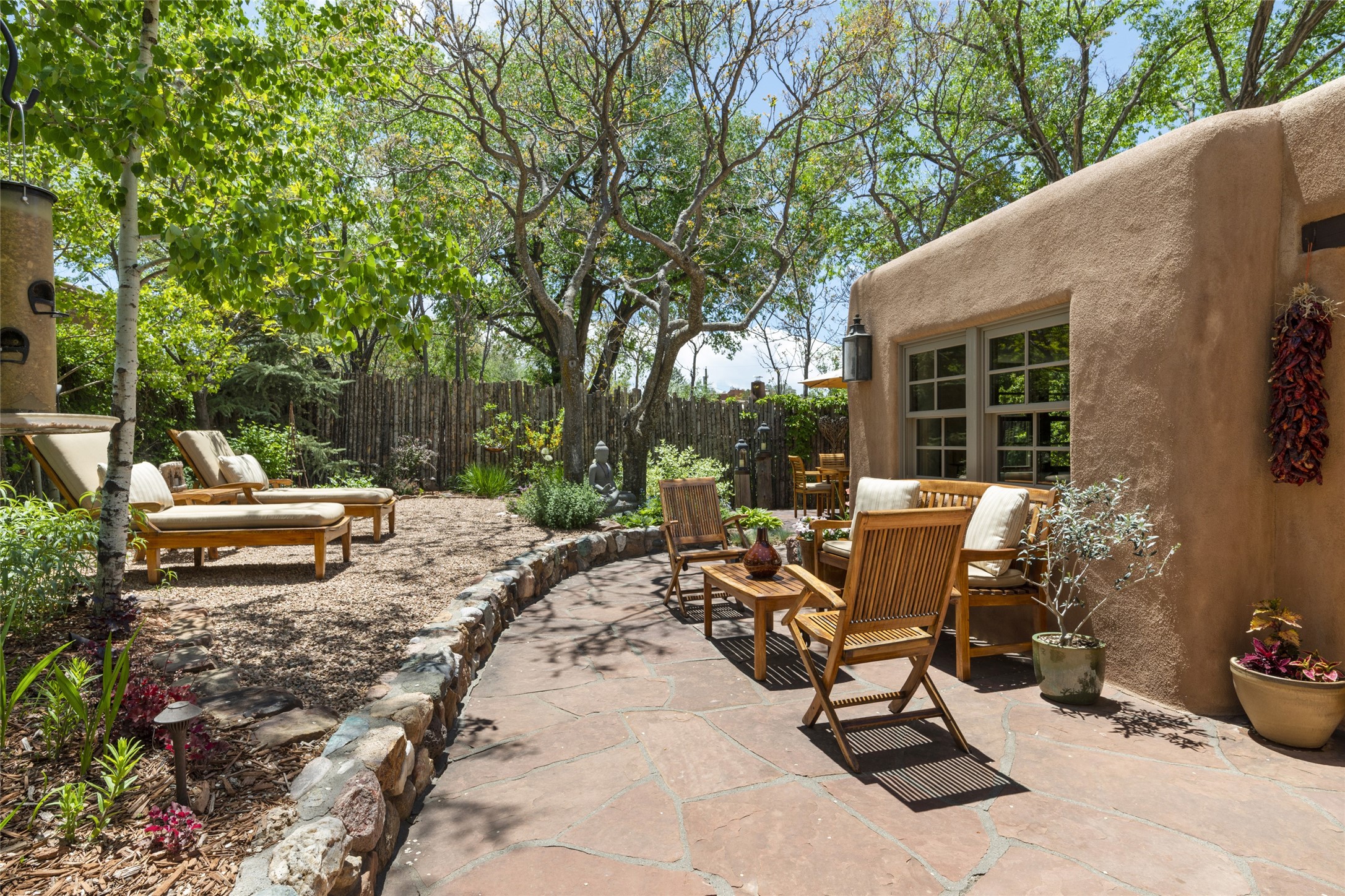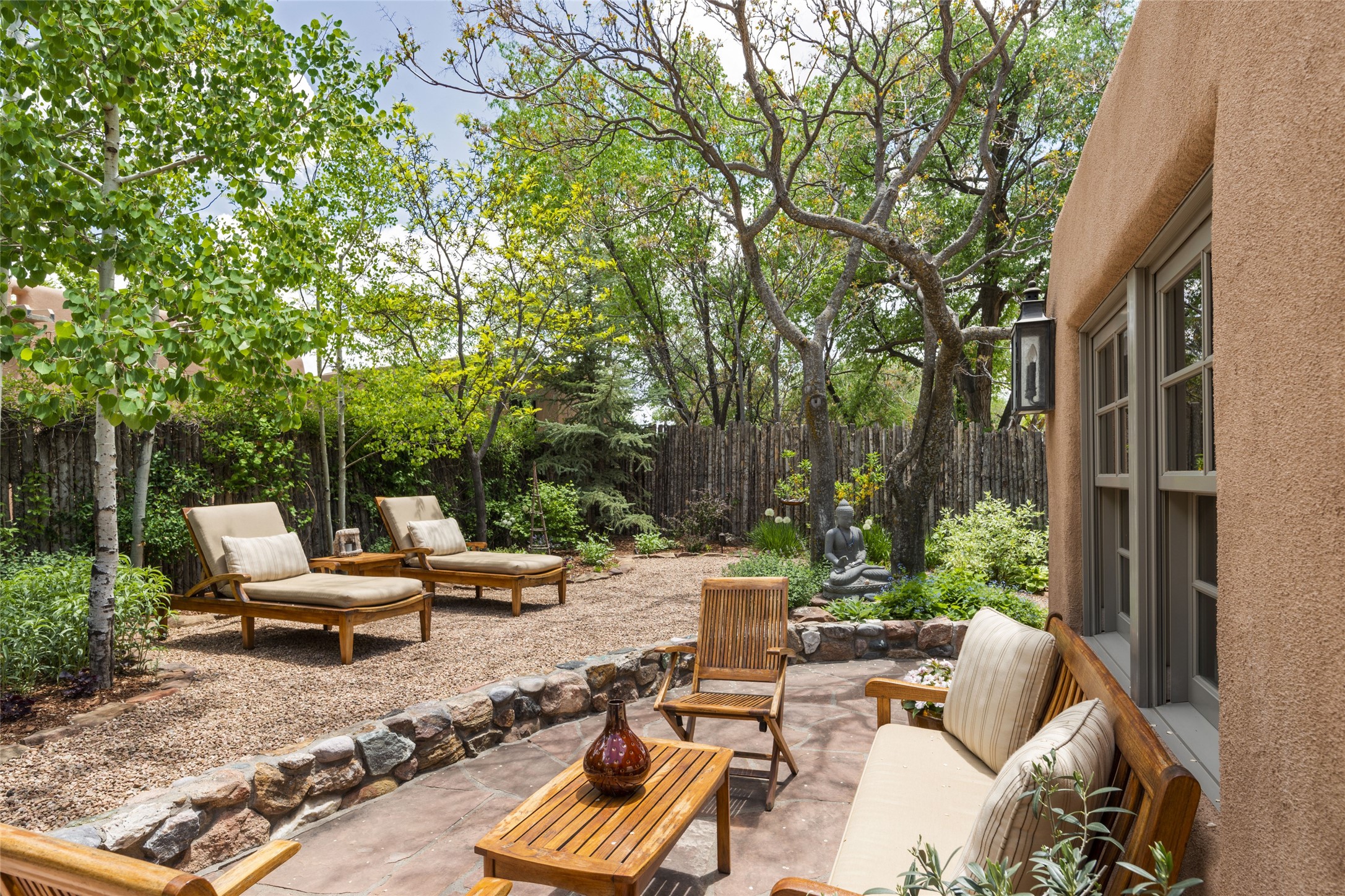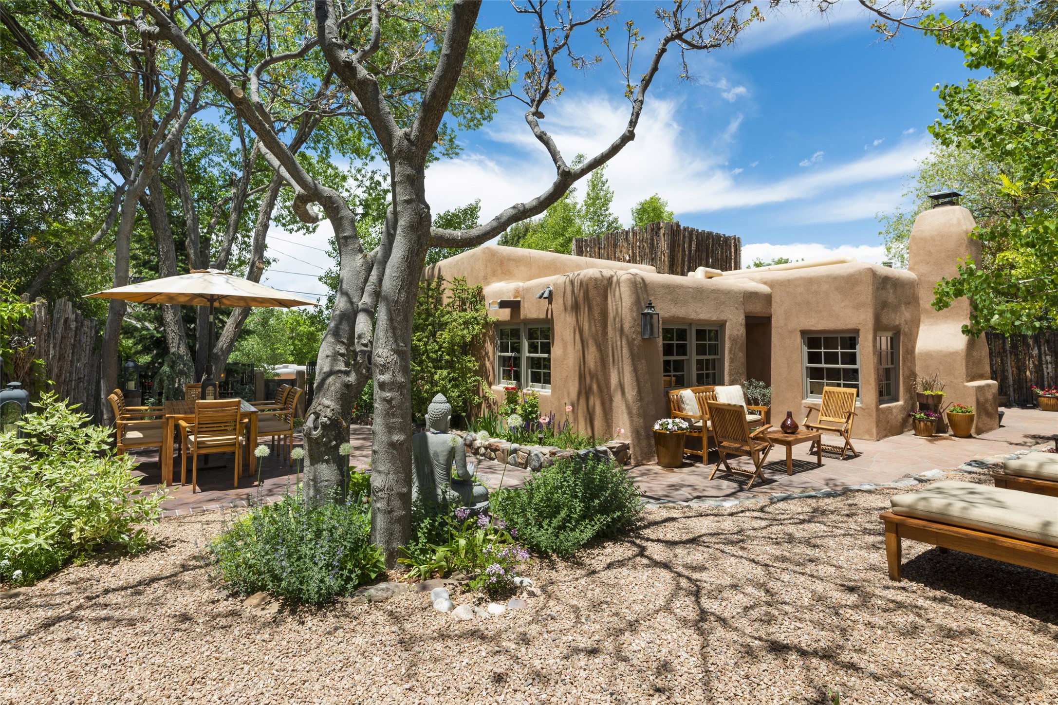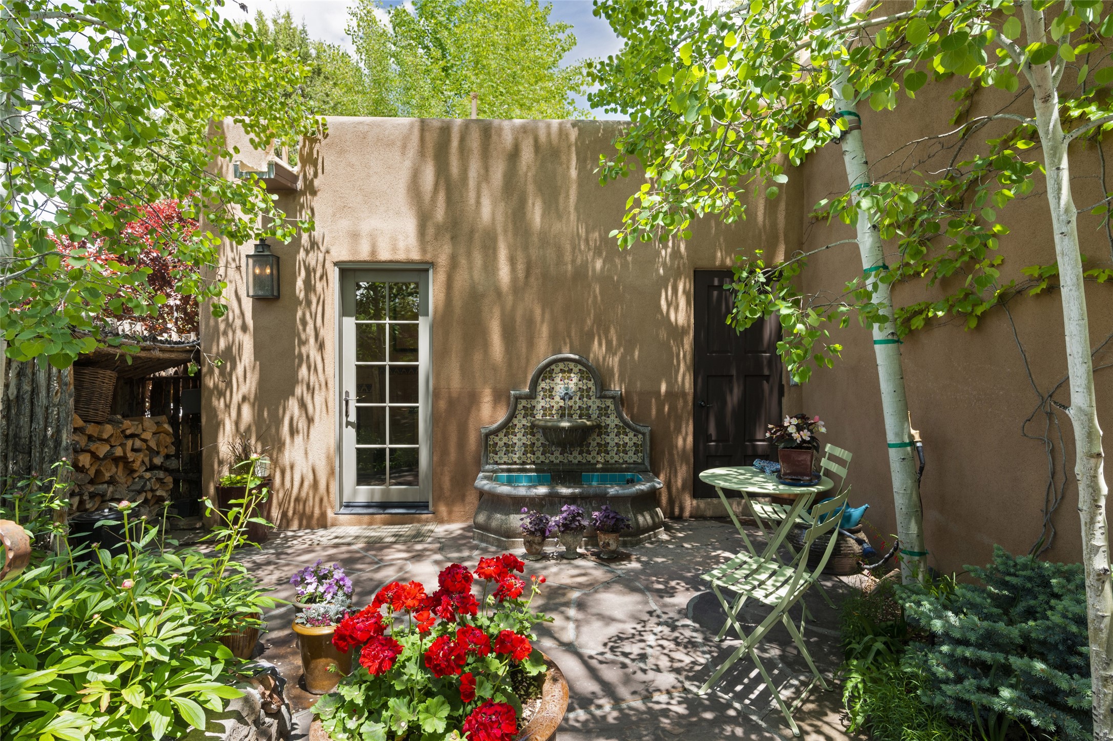 Reminiscent of Old World charm, this Eastside Santa Fe property is situated in a private and quiet location close to Canyon Road. Comprising 1,249 sq. ft., a single-story adobe and frame constructed home has been completely updated yet maintaining its classic Santa Fe style. Completely surrounded by year-long seasonal, lush and mature landscaping, two outdoor water features and lovely walled and gated spaces, the yard attracts a wide array of native birds and beneficial bees. Inside, there are 2 large bedrooms with their own sumptuous bathrooms. The primary suite is spa-like with with views onto the gardens from every window. Ideal for entertaining, the open-concept kitchen and living area has a sweet separation from the formal dining area. A large, bricked patio creates an open and airy place for guests and family to mingle and enjoy the expansive gardens and bubbling fountains. Smooth plaster walls, vigas, tile and wood floors, as well as custom wood detailing throughout, help to exude a refined and sophisticated lifestyle. There are two dedicated off-street parking spots in this small four-unit complex. A new roof was installed in 2022 with a transferrable warranty in place. On-Demand hot water heating, forced air heating and AC, as well as extensively zoned irrigation and landscape lighting systems are just some of the special details of this property that should be experienced in person.