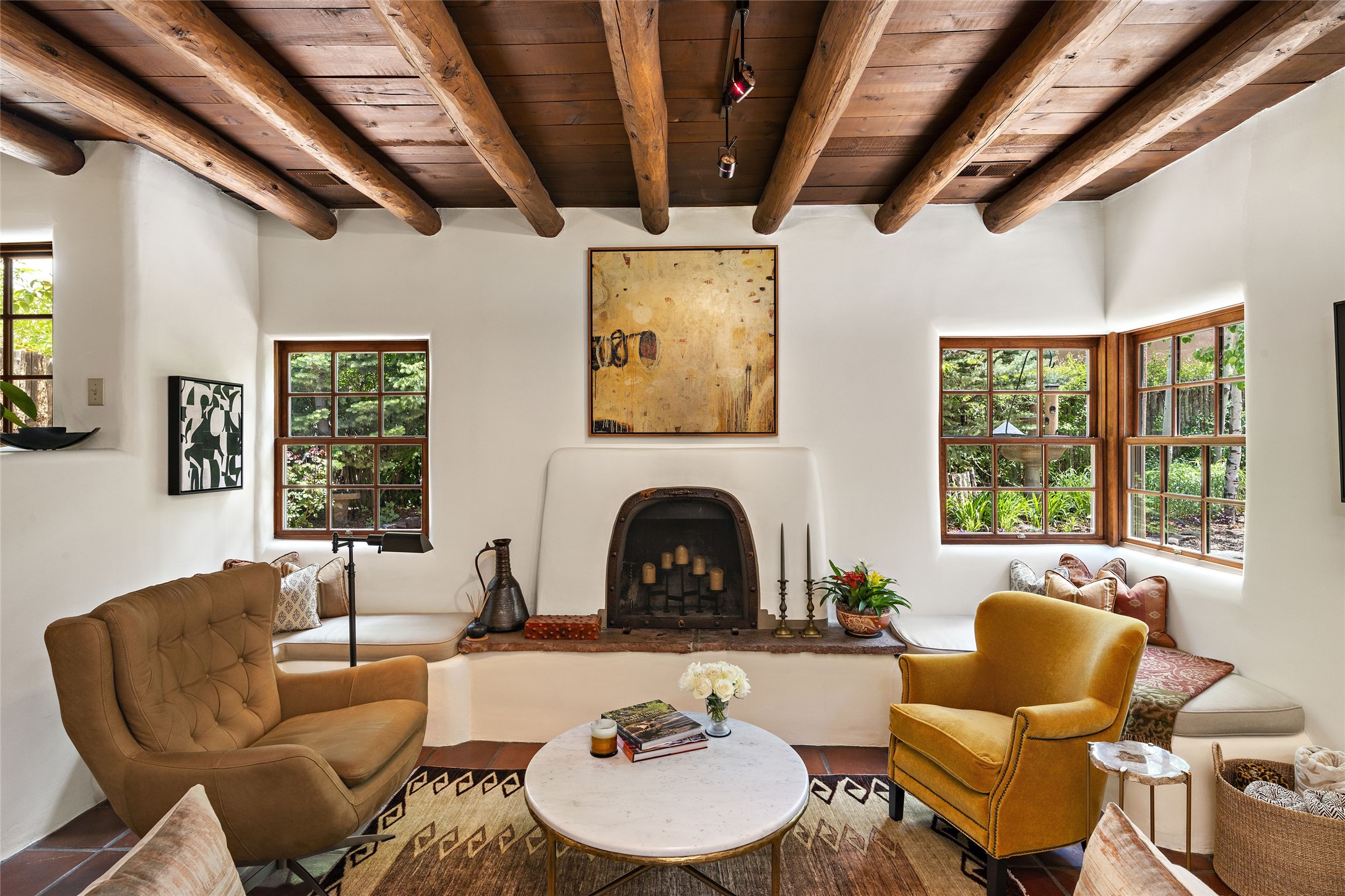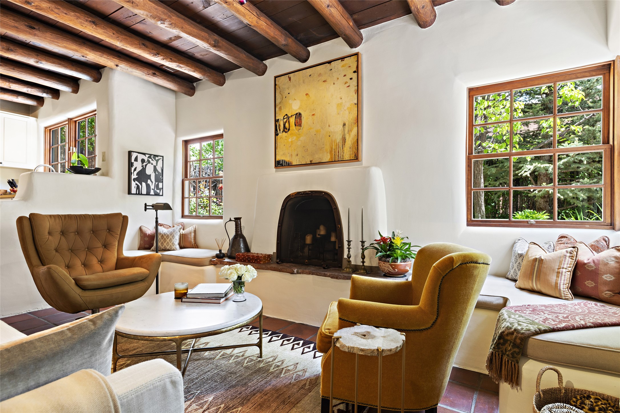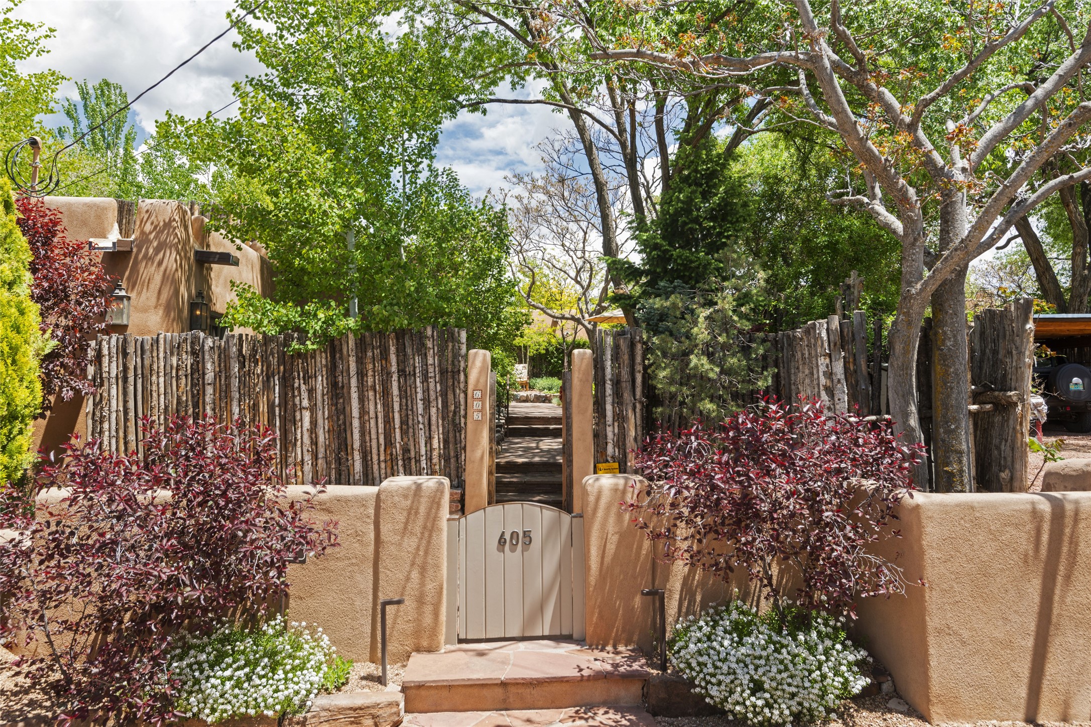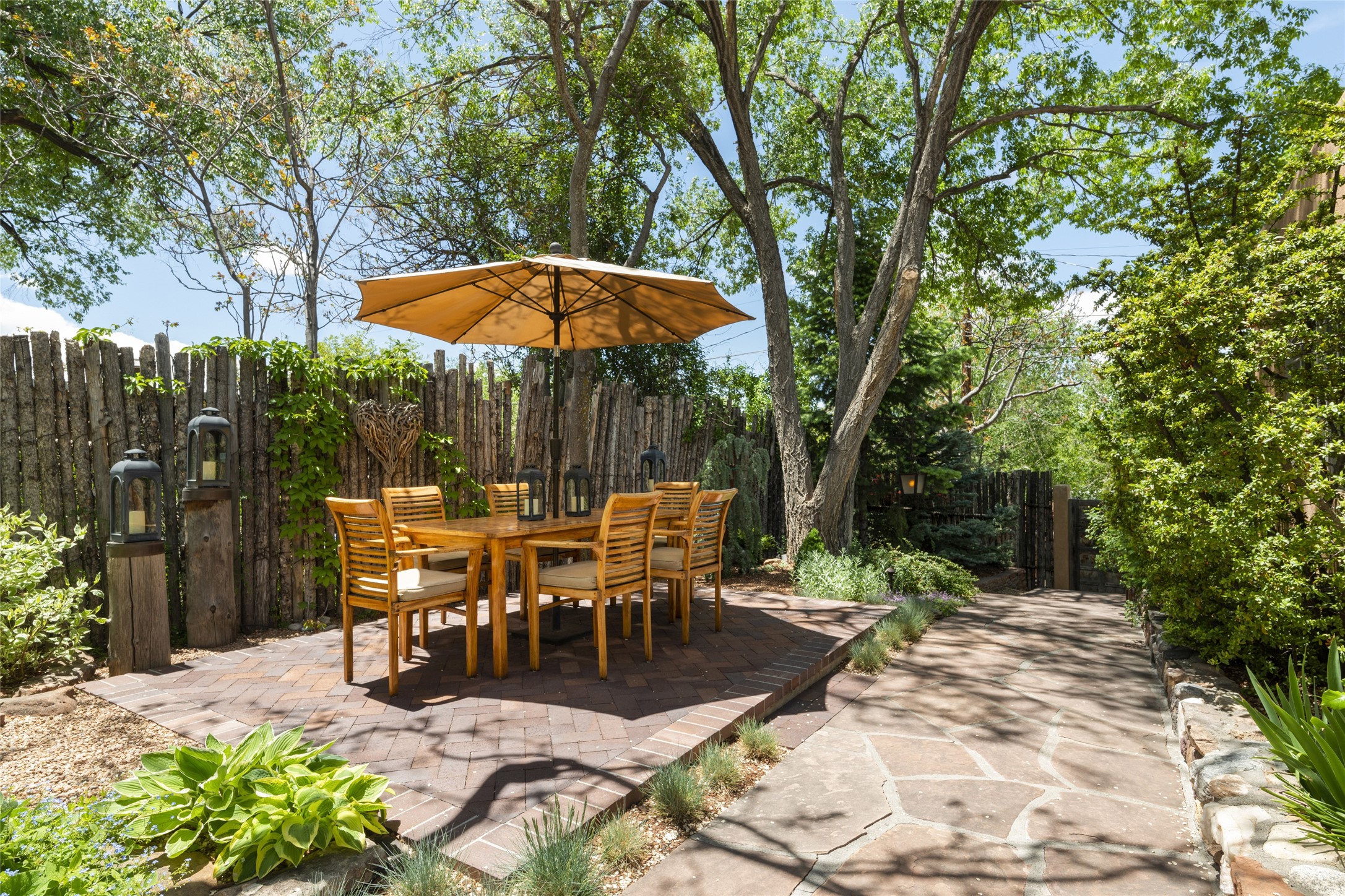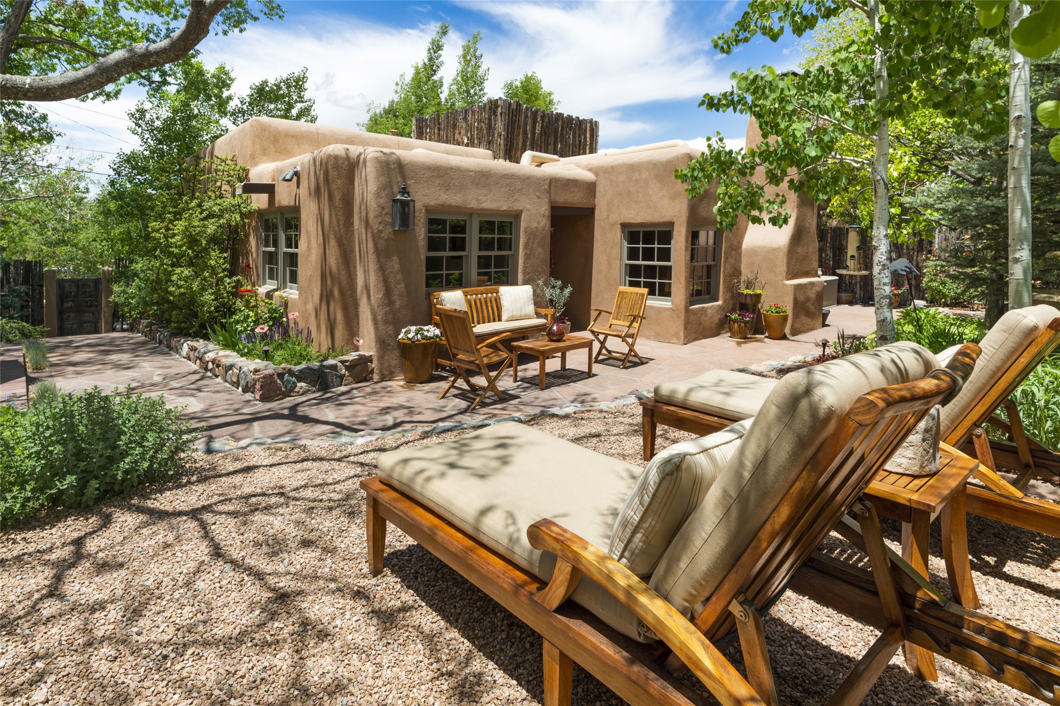 Reminiscent of Old World charm, this Eastside Santa Fe property is situated in a private and quiet location close to Canyon Road. Comprising 1,249 sq. ft., a single-story adobe and frame constructed home has been completely updated yet maintaining its classic Santa Fe style. Completely surrounded by year-long seasonal, lush and mature landscaping, two outdoor water features and lovely walled and gated spaces, the yard attracts a wide array of native birds and beneficial bees. Inside, there are 2 large bedrooms with their own sumptuous bathrooms. The primary suite is spa-like with with views onto the gardens from every window. Ideal for entertaining, the open-concept kitchen and living area has a sweet separation from the formal dining area. A large, bricked patio creates an open and airy place for guests and family to mingle and enjoy the expansive gardens and bubbling fountains. Smooth plaster walls, vigas, tile and wood floors, as well as custom wood detailing throughout, help to exude a refined and sophisticated lifestyle. There are two dedicated off-street parking spots in this small four-unit complex. A new roof was installed in 2022 with a transferrable warranty in place. On-Demand hot water heating, forced air heating and AC, as well as extensively zoned irrigation and landscape lighting systems are just some of the special details of this property that should be experienced in person.