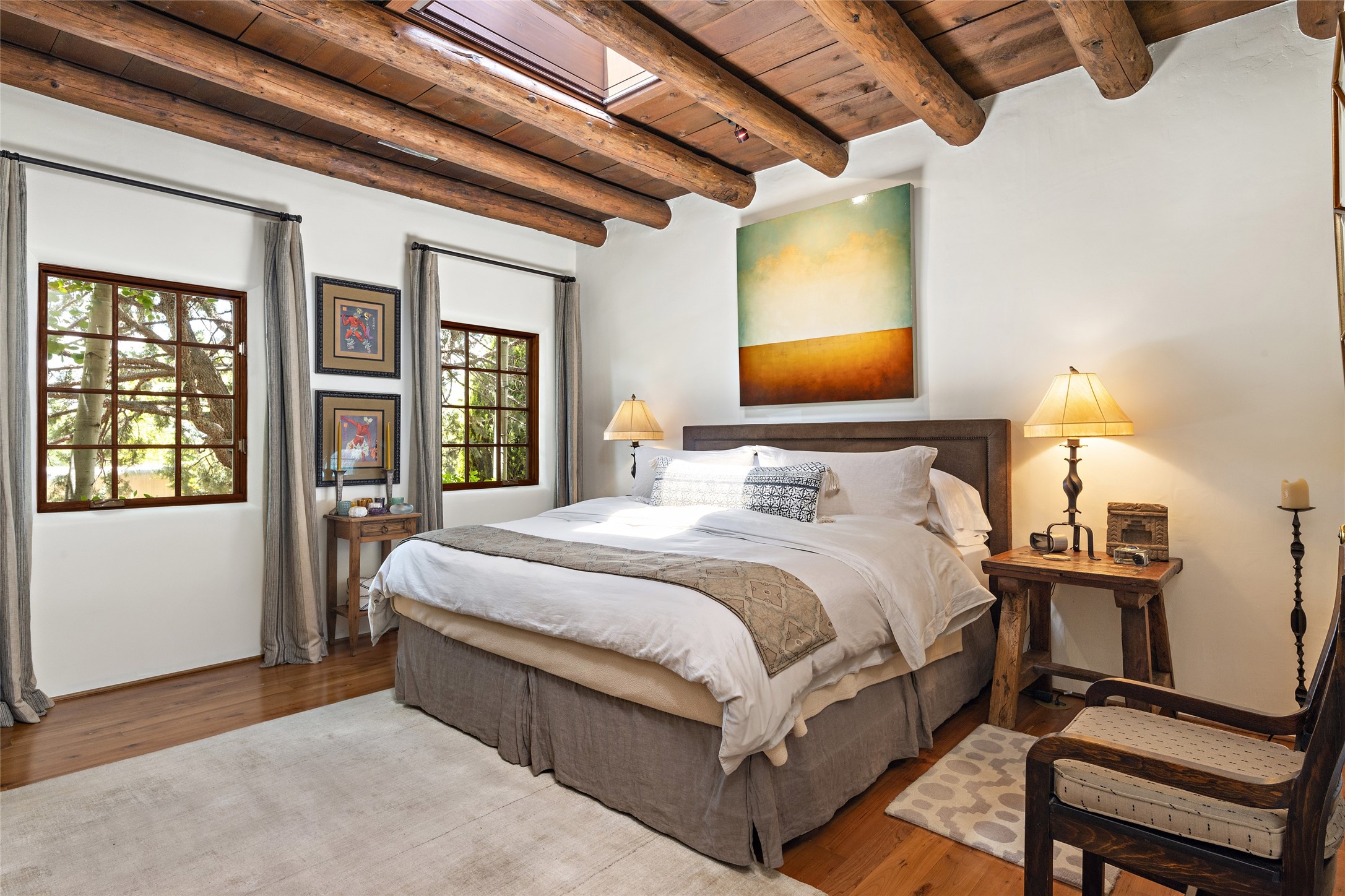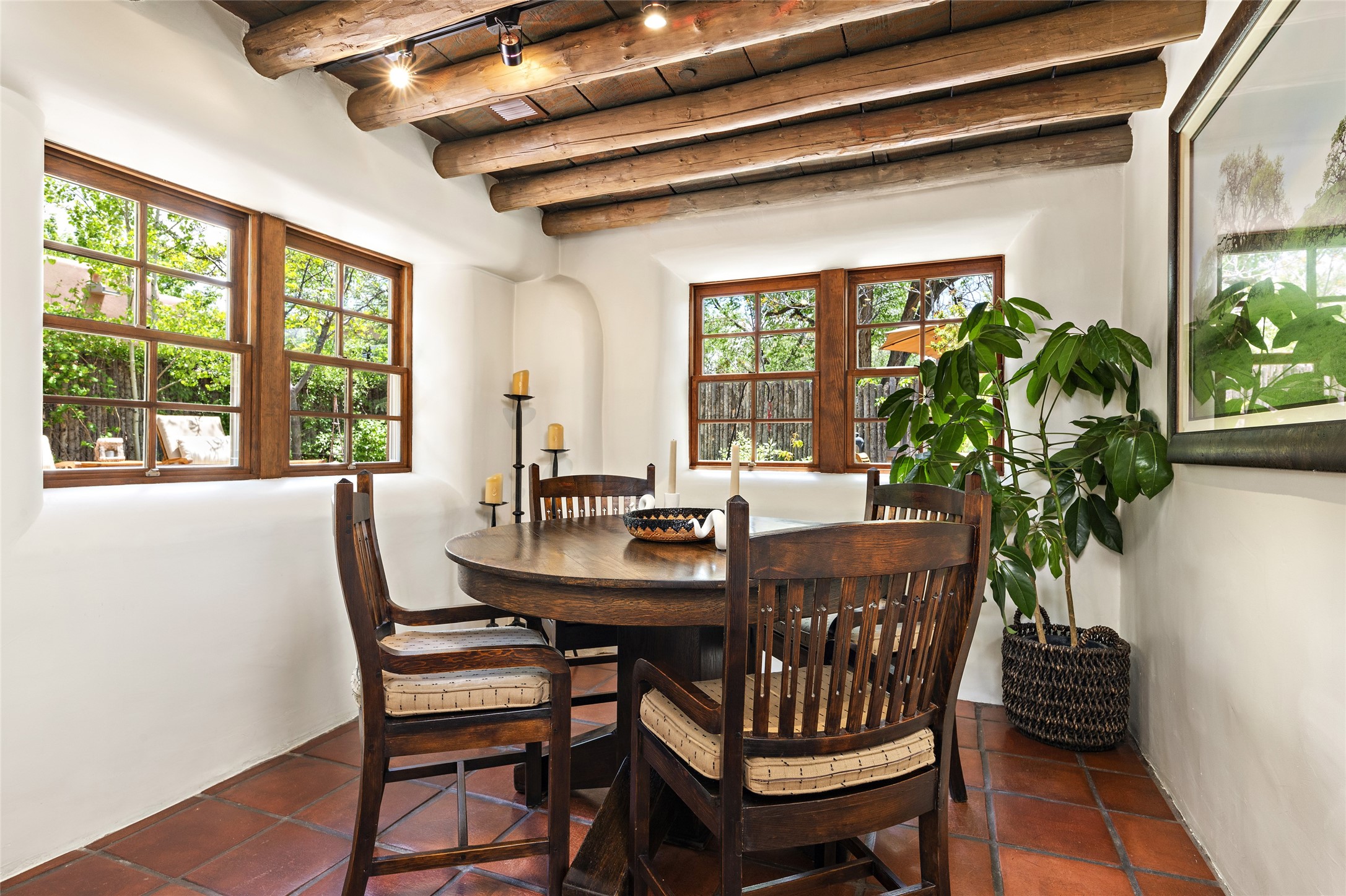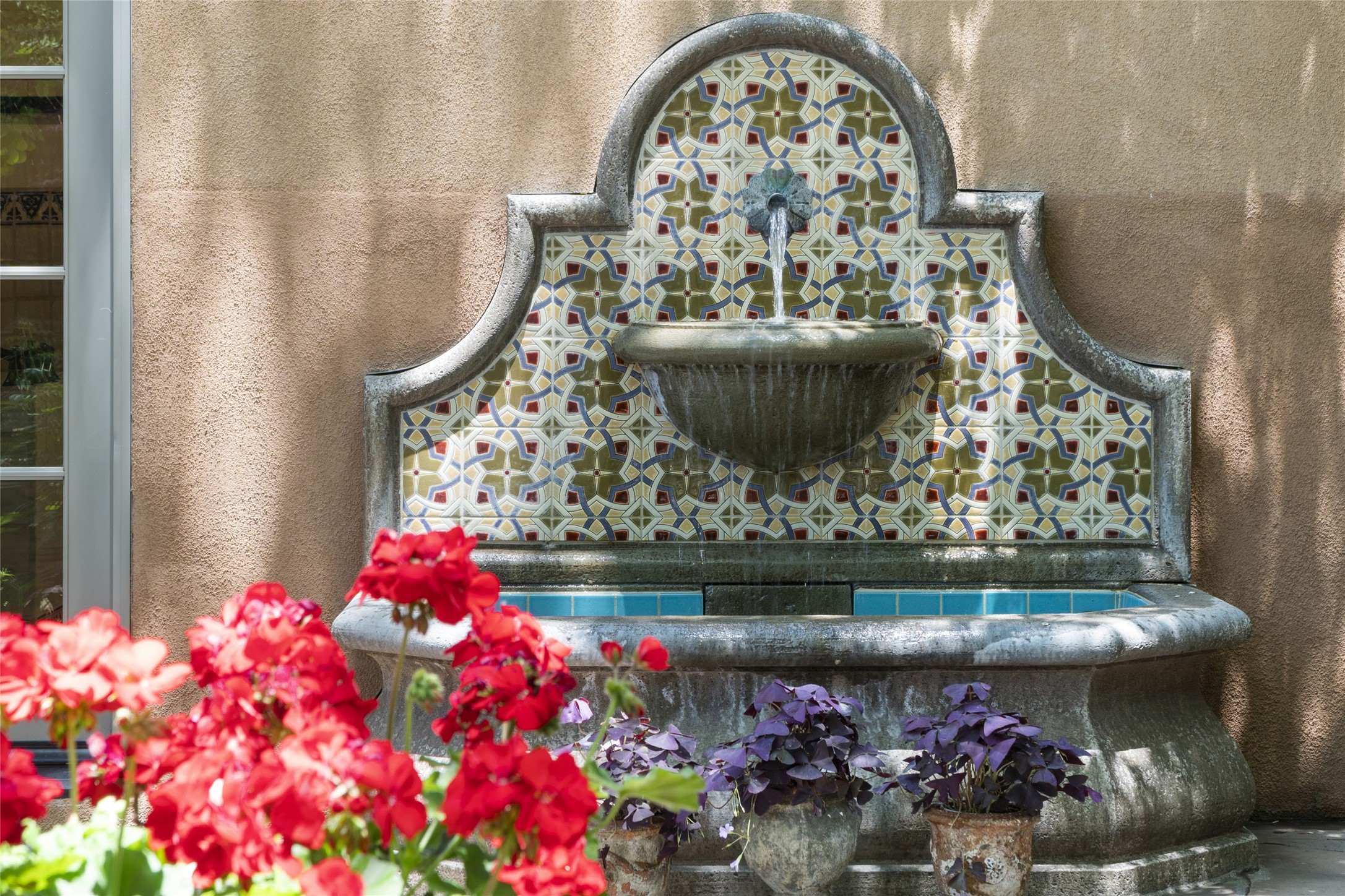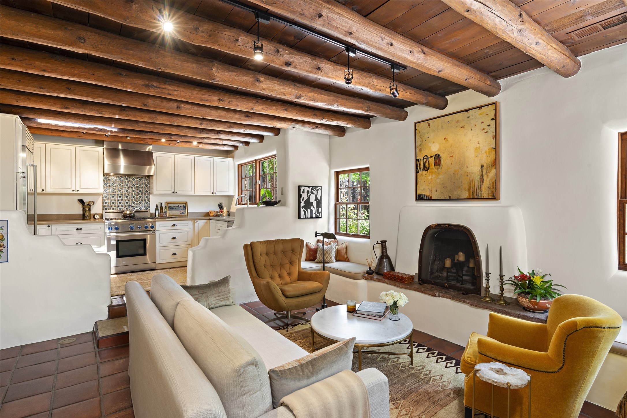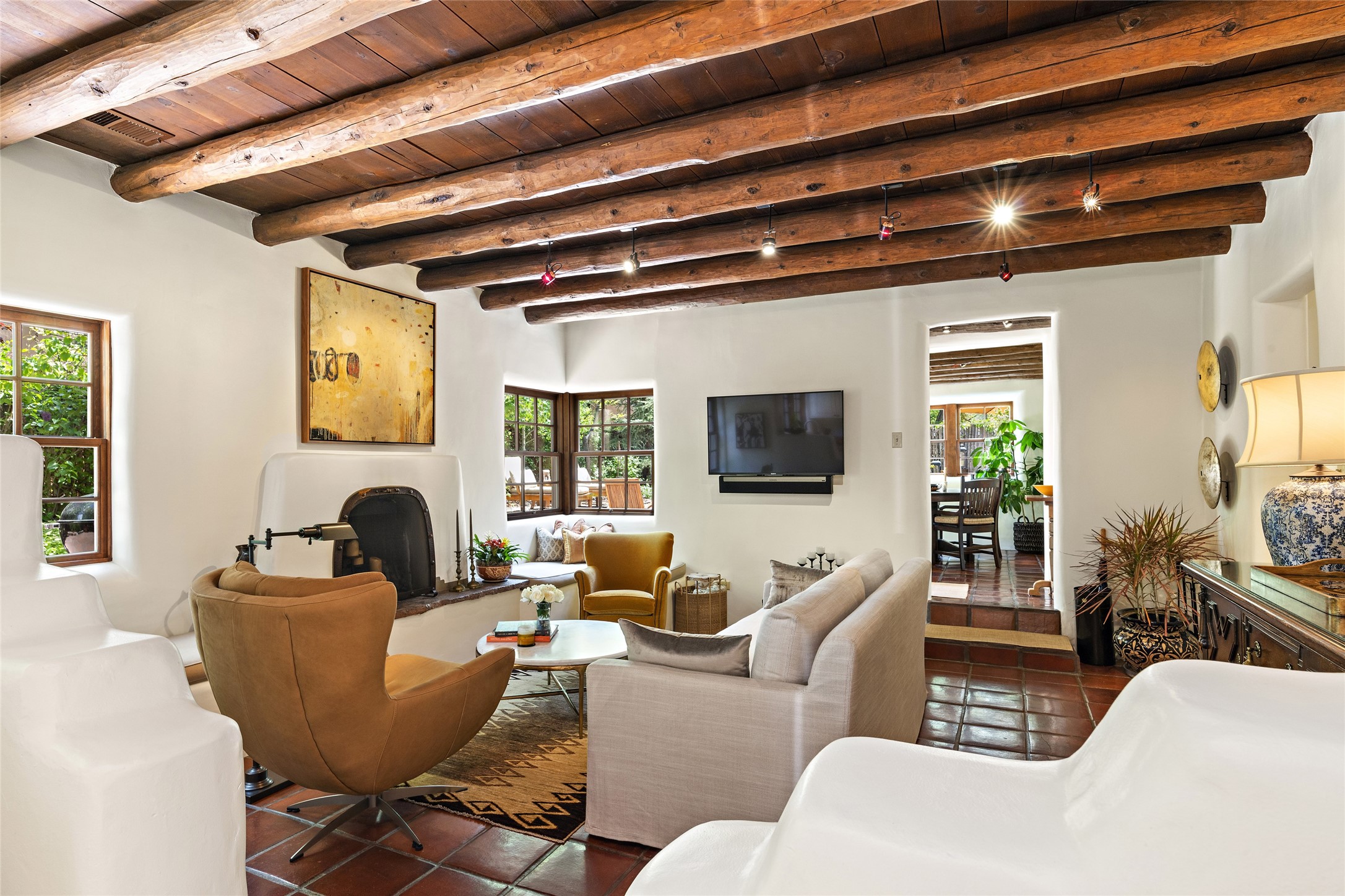 Reminiscent of Old World charm, this Eastside Santa Fe property is situated in a private and quiet location close to Canyon Road. Comprising 1,249 sq. ft., a single-story adobe and frame constructed home has been completely updated yet maintaining its classic Santa Fe style. Completely surrounded by year-long seasonal, lush and mature landscaping, two outdoor water features and lovely walled and gated spaces, the yard attracts a wide array of native birds and beneficial bees. Inside, there are 2 large bedrooms with their own sumptuous bathrooms. The primary suite is spa-like with with views onto the gardens from every window. Ideal for entertaining, the open-concept kitchen and living area has a sweet separation from the formal dining area. A large, bricked patio creates an open and airy place for guests and family to mingle and enjoy the expansive gardens and bubbling fountains. Smooth plaster walls, vigas, tile and wood floors, as well as custom wood detailing throughout, help to exude a refined and sophisticated lifestyle. There are two dedicated off-street parking spots in this small four-unit complex. A new roof was installed in 2022 with a transferrable warranty in place. On-Demand hot water heating, forced air heating and AC, as well as extensively zoned irrigation and landscape lighting systems are just some of the special details of this property that should be experienced in person.