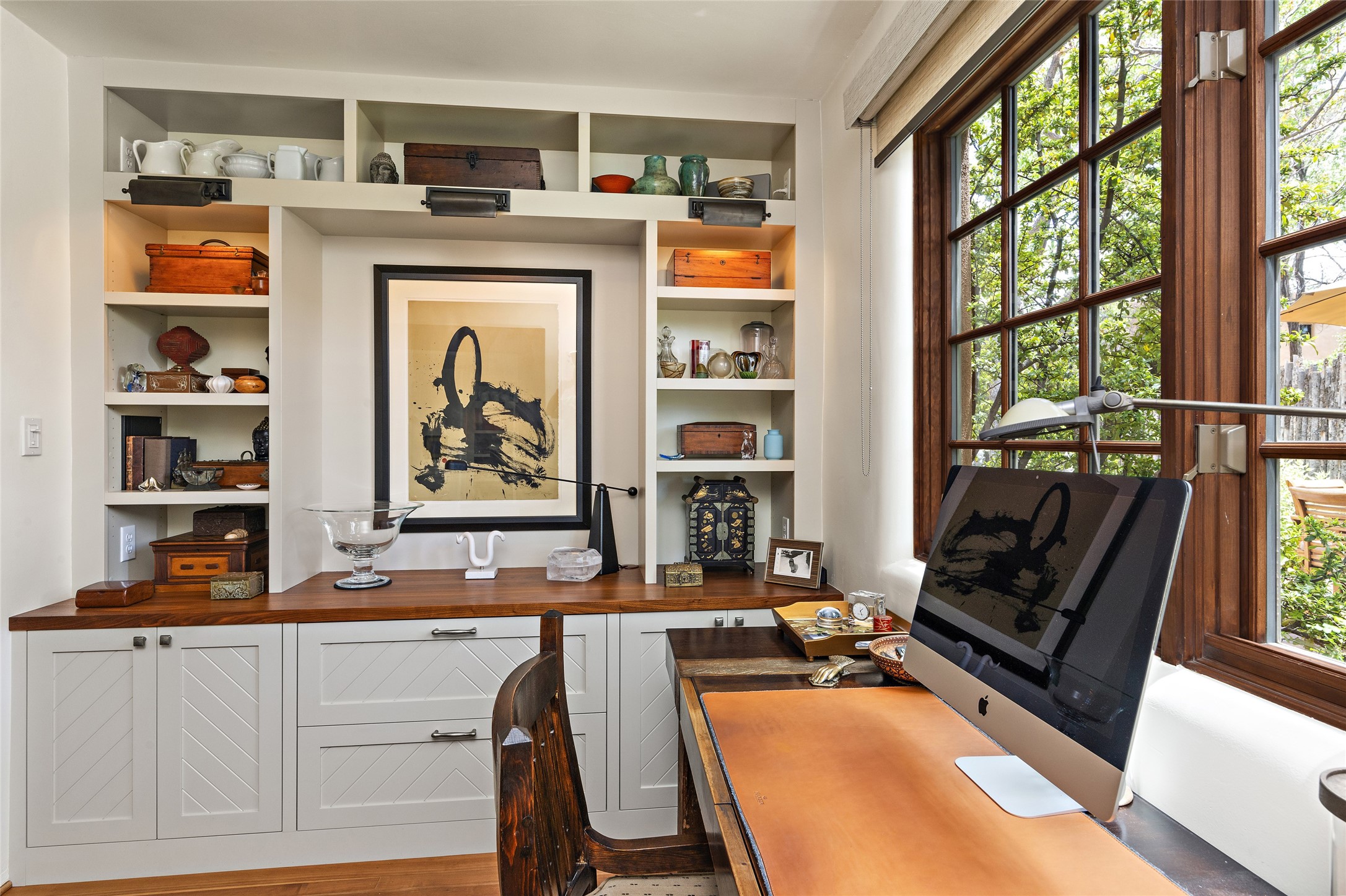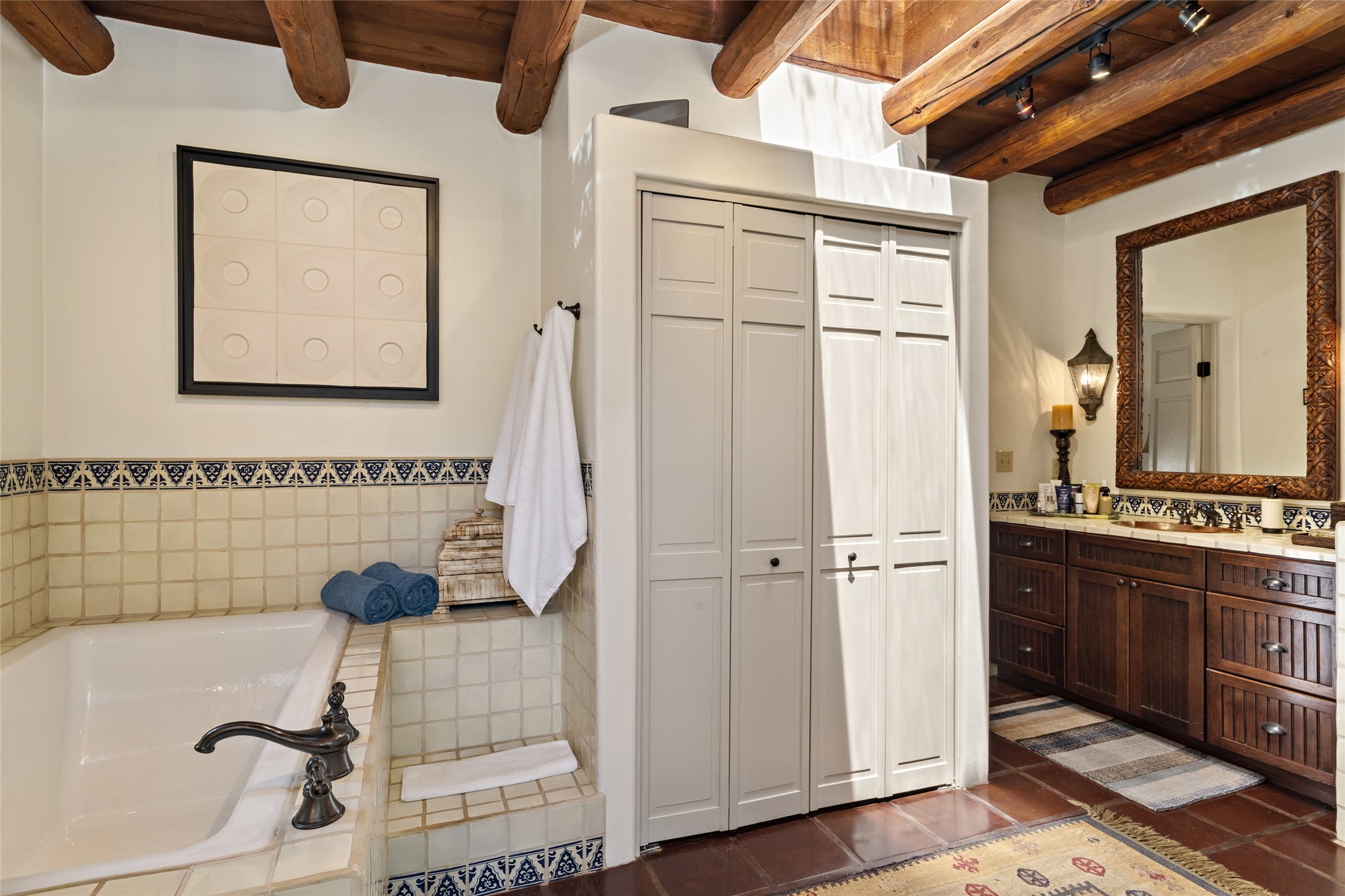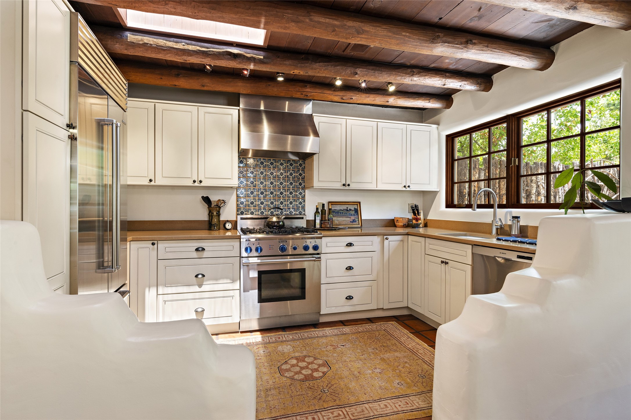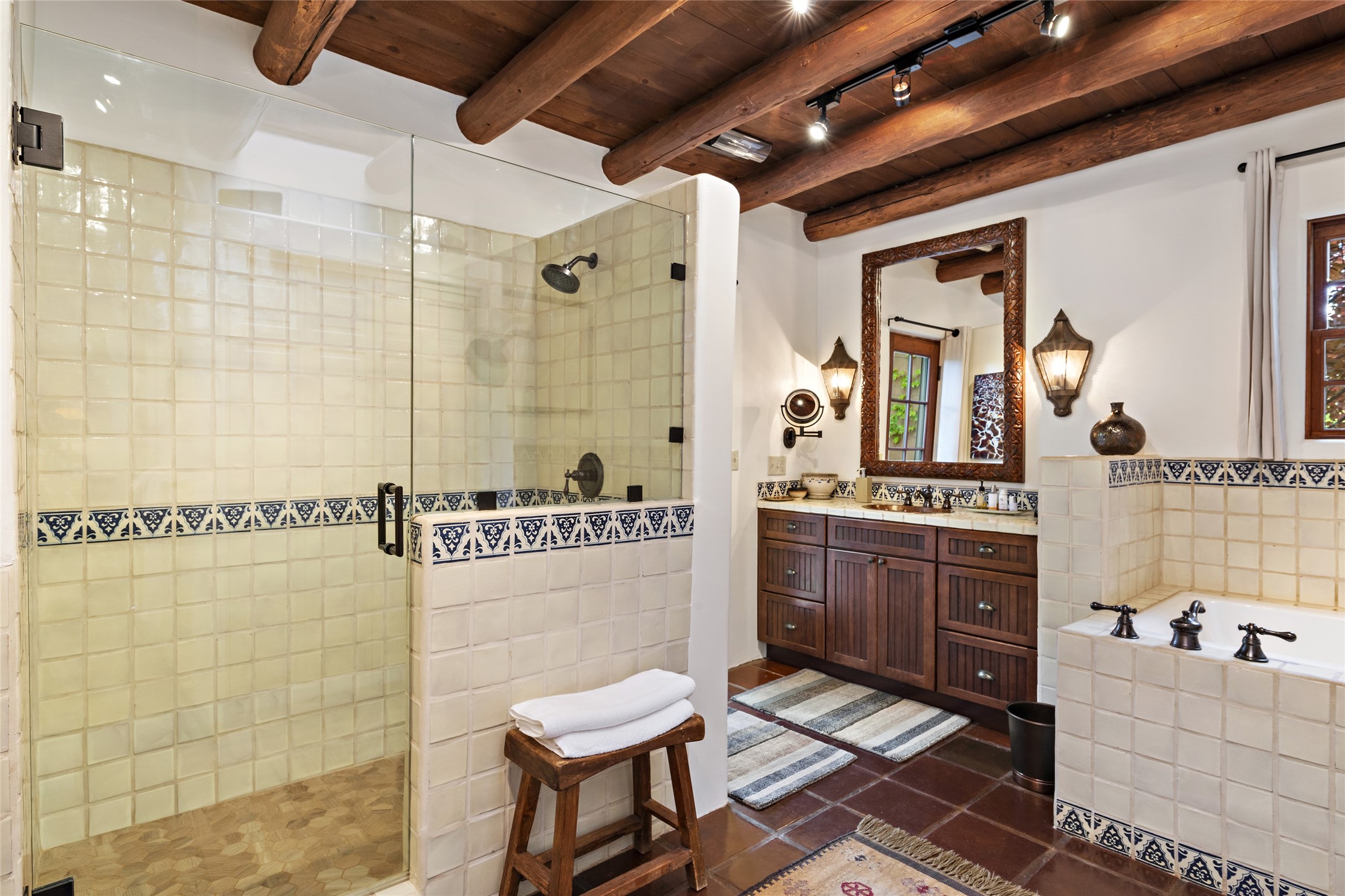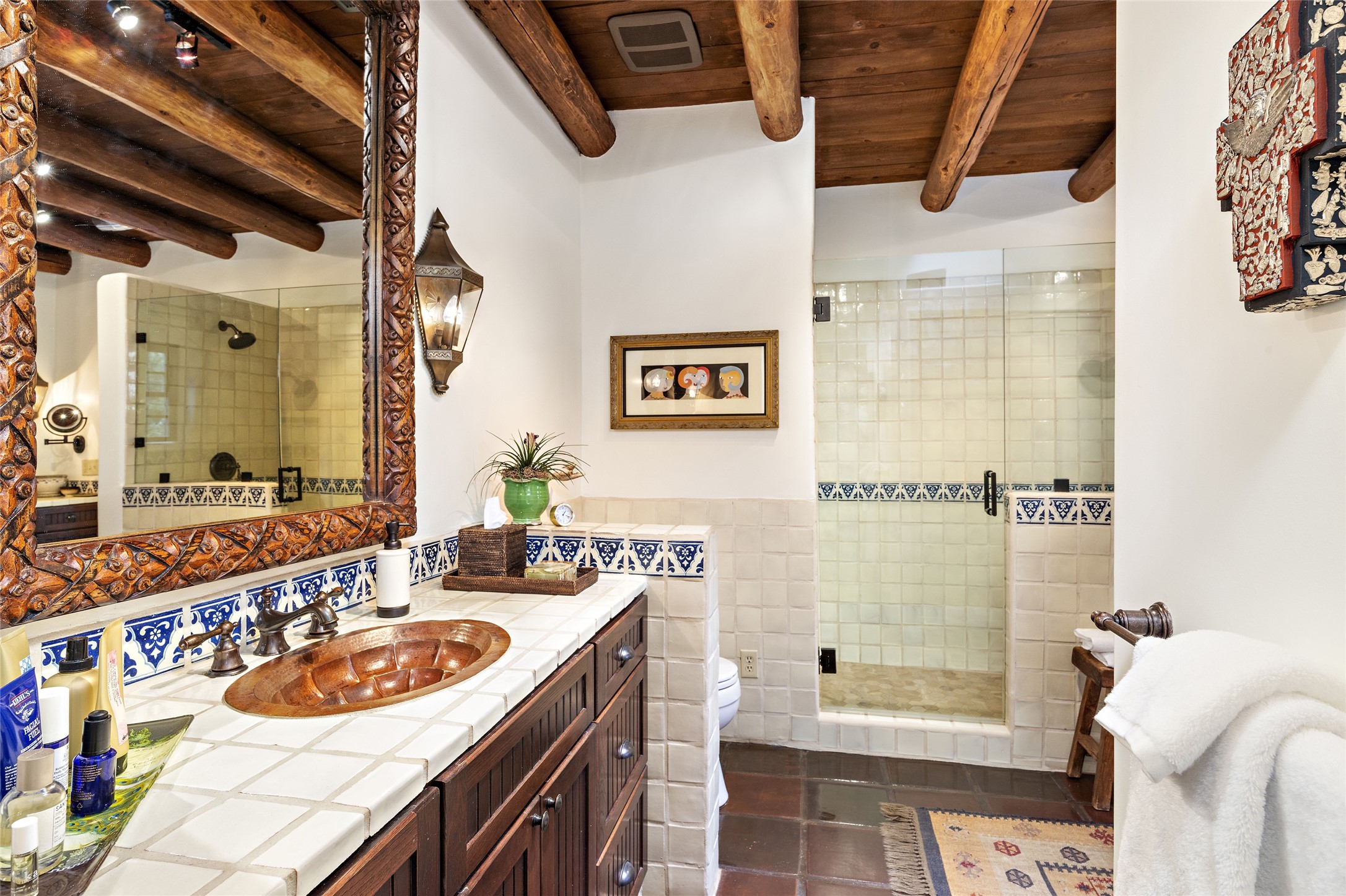Reminiscent of Old World charm, this Eastside Santa Fe property is situated in a private and quiet location close to Canyon Road. Comprising 1,249 sq. ft., a single-story adobe and frame constructed home has been completely updated yet maintaining its classic Santa Fe style. Completely surrounded by year-long seasonal, lush and mature landscaping, two outdoor water features and lovely walled and gated spaces, the yard attracts a wide array of native birds and beneficial bees. Inside, there are 2 large bedrooms with their own sumptuous bathrooms. The primary suite is spa-like with with views onto the gardens from every window. Ideal for entertaining, the open-concept kitchen and living area has a sweet separation from the formal dining area. A large, bricked patio creates an open and airy place for guests and family to mingle and enjoy the expansive gardens and bubbling fountains. Smooth plaster walls, vigas, tile and wood floors, as well as custom wood detailing throughout, help to exude a refined and sophisticated lifestyle. There are two dedicated off-street parking spots in this small four-unit complex. A new roof was installed in 2022 with a transferrable warranty in place. On-Demand hot water heating, forced air heating and AC, as well as extensively zoned irrigation and landscape lighting systems are just some of the special details of this property that should be experienced in person.