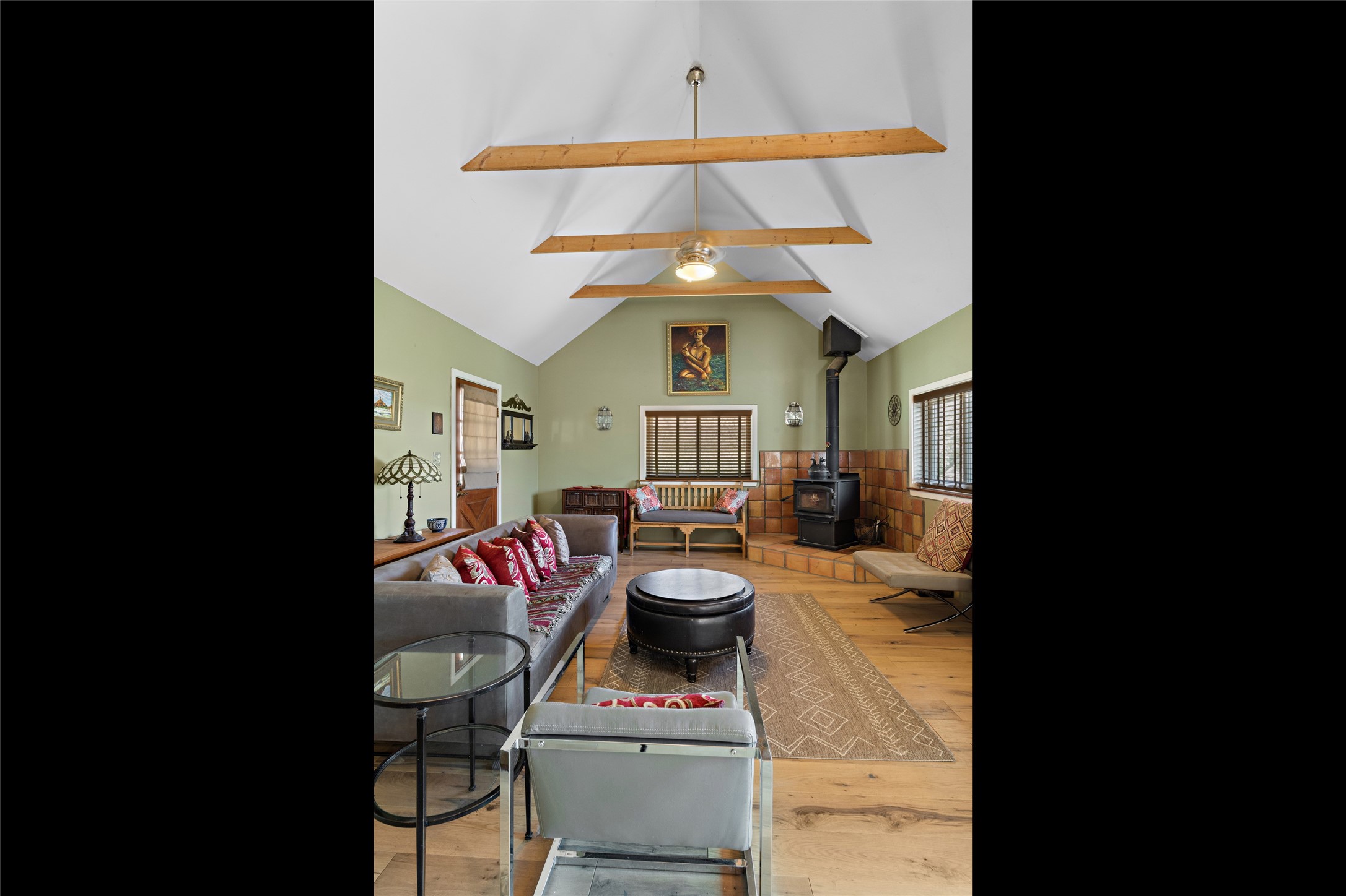 Sitting above the vibrant and historic village of Madrid, this newer home is full of natural light with multiple covered patios, beautifully updated kitchen, and soaring ceilings. Enter through the covered porch with views to the Sangre de Cristos to the open great room with engineered hardwood and Saltillo tile floors, all recently installed. Newer wood stove adds to the warmth of this room open to the kitchen and dining area with access to the two, covered back patios. The kitchen is a cook's dream with amply counter and storage space, stainless steel farm sink, and stunning copper-topped eat-in island. Anderson high-quality windows installed throughout in 2020 all with custom wood blinds. Two back bedrooms, one with office area and walk-in closet and access to the back deck. The yard is fully-fenced with mature landscaping. Fully air conditioned and whole house water filtration system. Furnishings package negotiable. Owner/Broker.