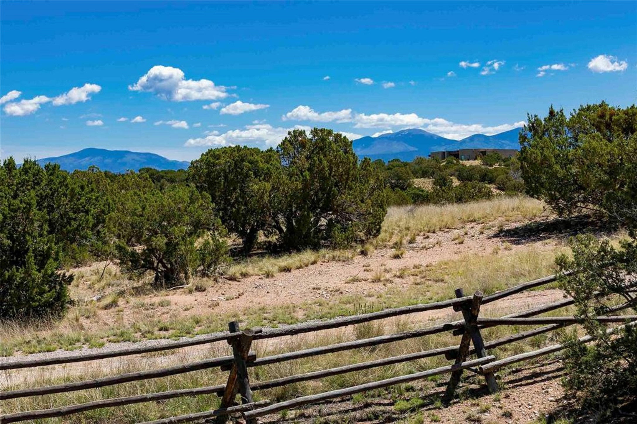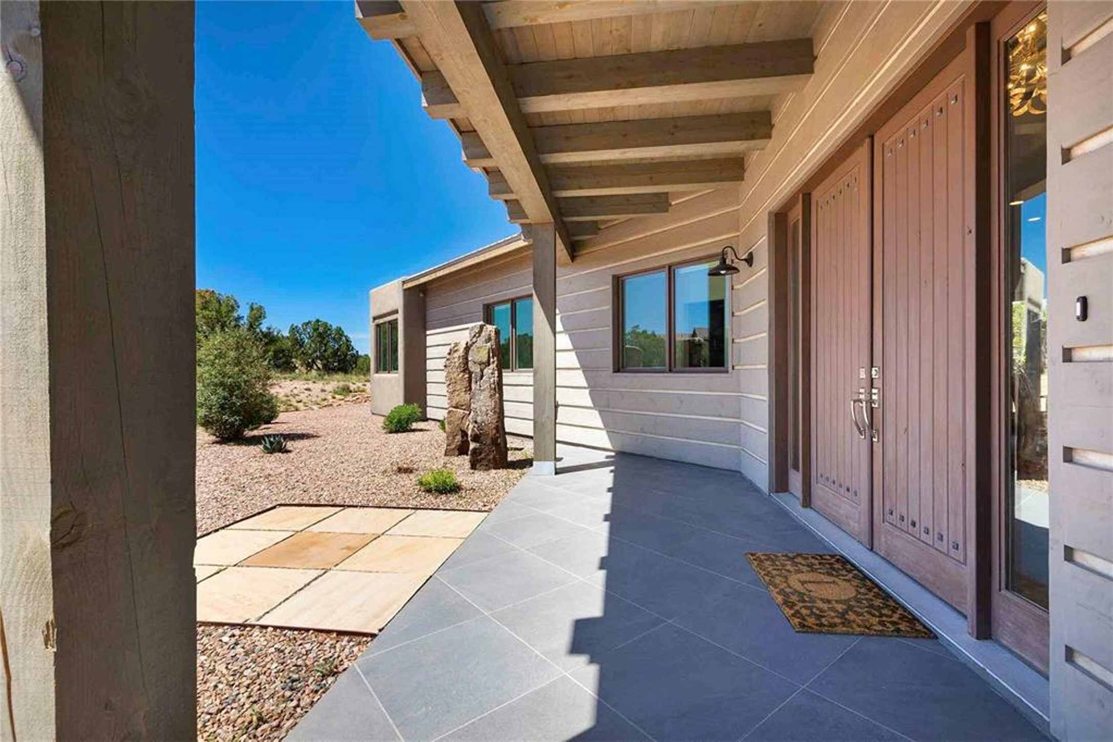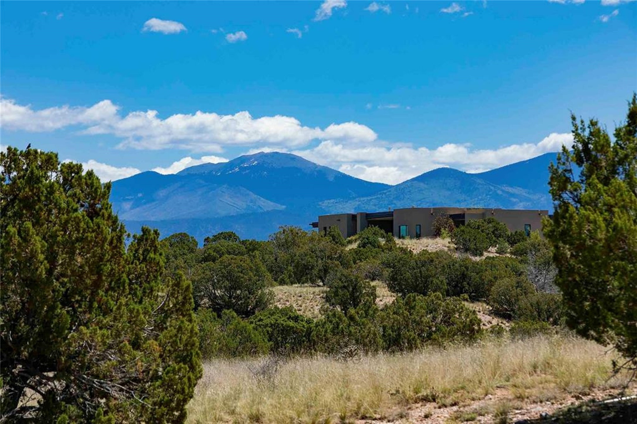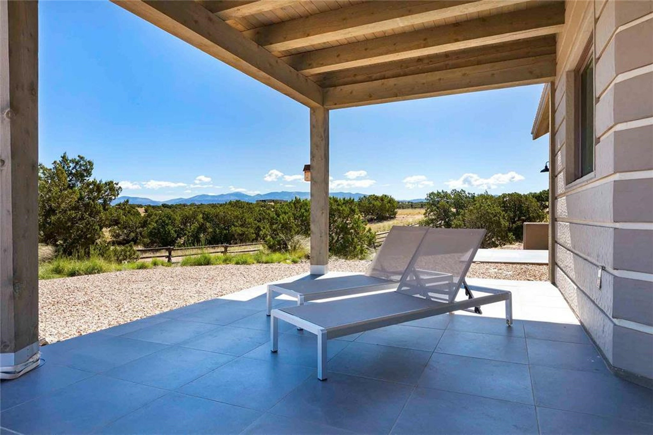 One of the rarest homes in all of Las Campanas, this exceptional contemporary, 2019-built home by Zachary & Sons, captivates with sophisticated log cabin architecture and stunning surround mountain views. Located within the Estancias of Las Campanas, this fabulous, single level home backs directly to BLM land and borders nearly 68,000 acres of open space, with endless Jemez Mountain and Sangre de Cristo Mountain views, and celebrates the true essence of the ultimate Santa Fe lifestyle. Design features include an open concept living room and dining room, ideal for entertaining with stunning views, back portal access through three sets of French doors, and a fireplace, all of which opens directly to the designer island kitchen with state of the art appliances, breakfast bar, views, and pantry. The owner's suite delights with portal access, Jemez views, an intimate seating area, and a modern bath complete with a walk-in shower, soaking tub, dual vanities and walk-in closet. Guests enjoy independence with a private ensuite bedroom and a secondary guest bedroom which is currently utilized as both a media room and office. Exceptional features include quality neutral finishes and soft natural light throughout, a generous two car garage with built-in storage, surround portals ideal for enjoying the ultimate outdoor living experience, and central air conditioning. Sited within close proximity to The Club at Las Campanas Clubhouse, (2) Jack Nicklaus Signature Golf Courses, Spa, Fitness and Tennis Center, and Equestrian Center, in addition to hiking trails and Diablo Canyon, this unique offering is truly a special opportunity. The owner's equity golf membership is available for purchase on a separate bill of sale.