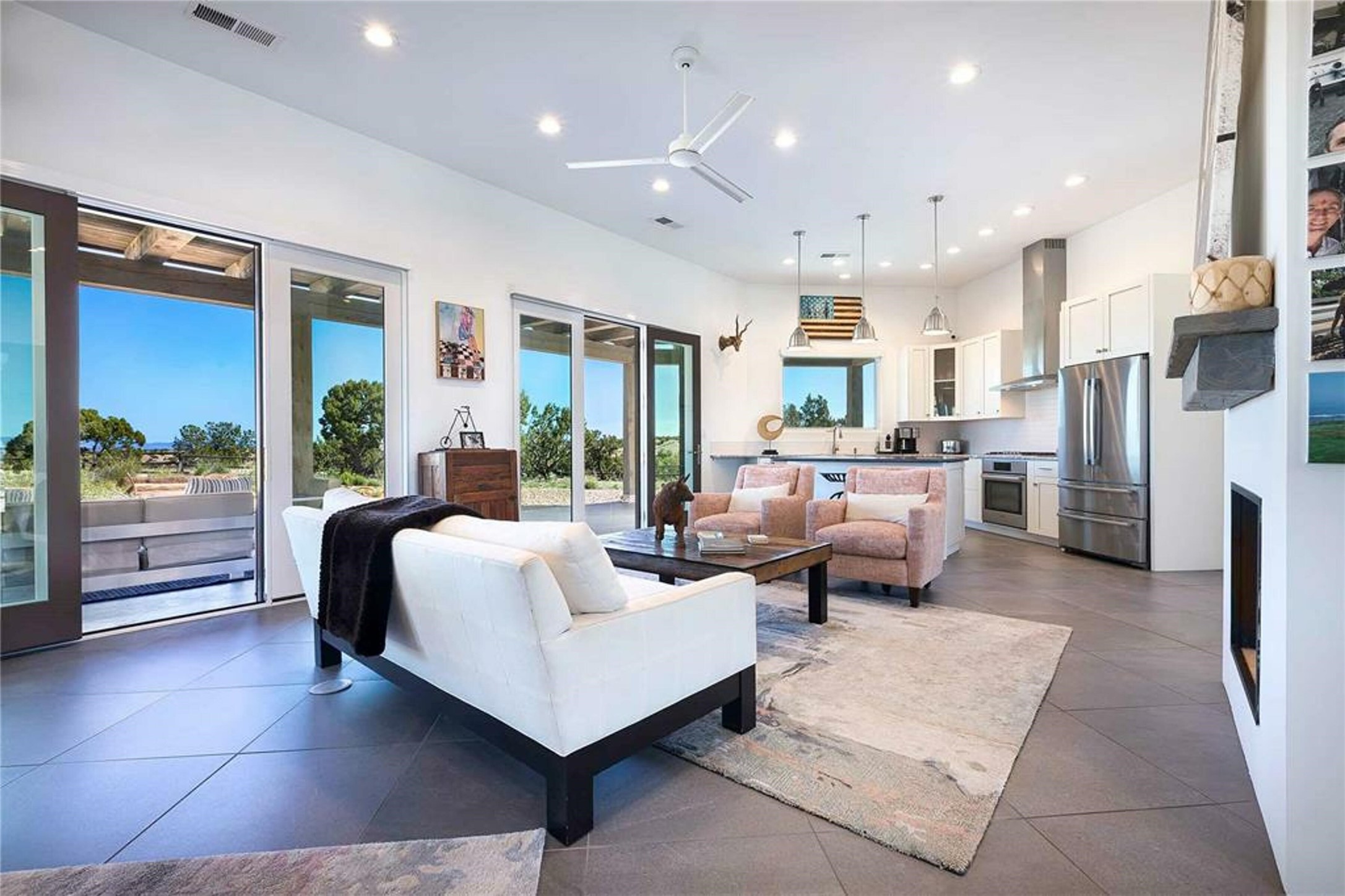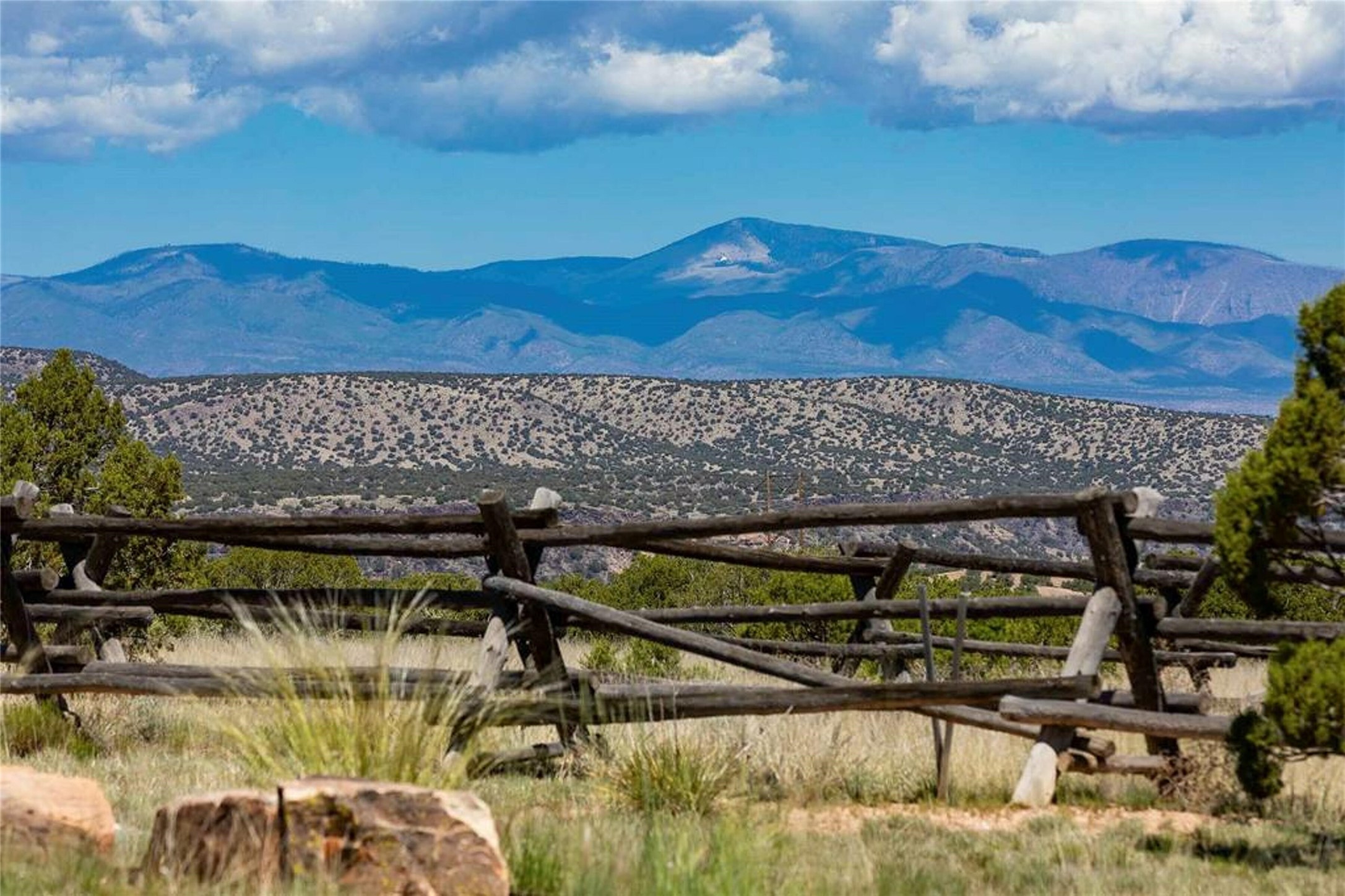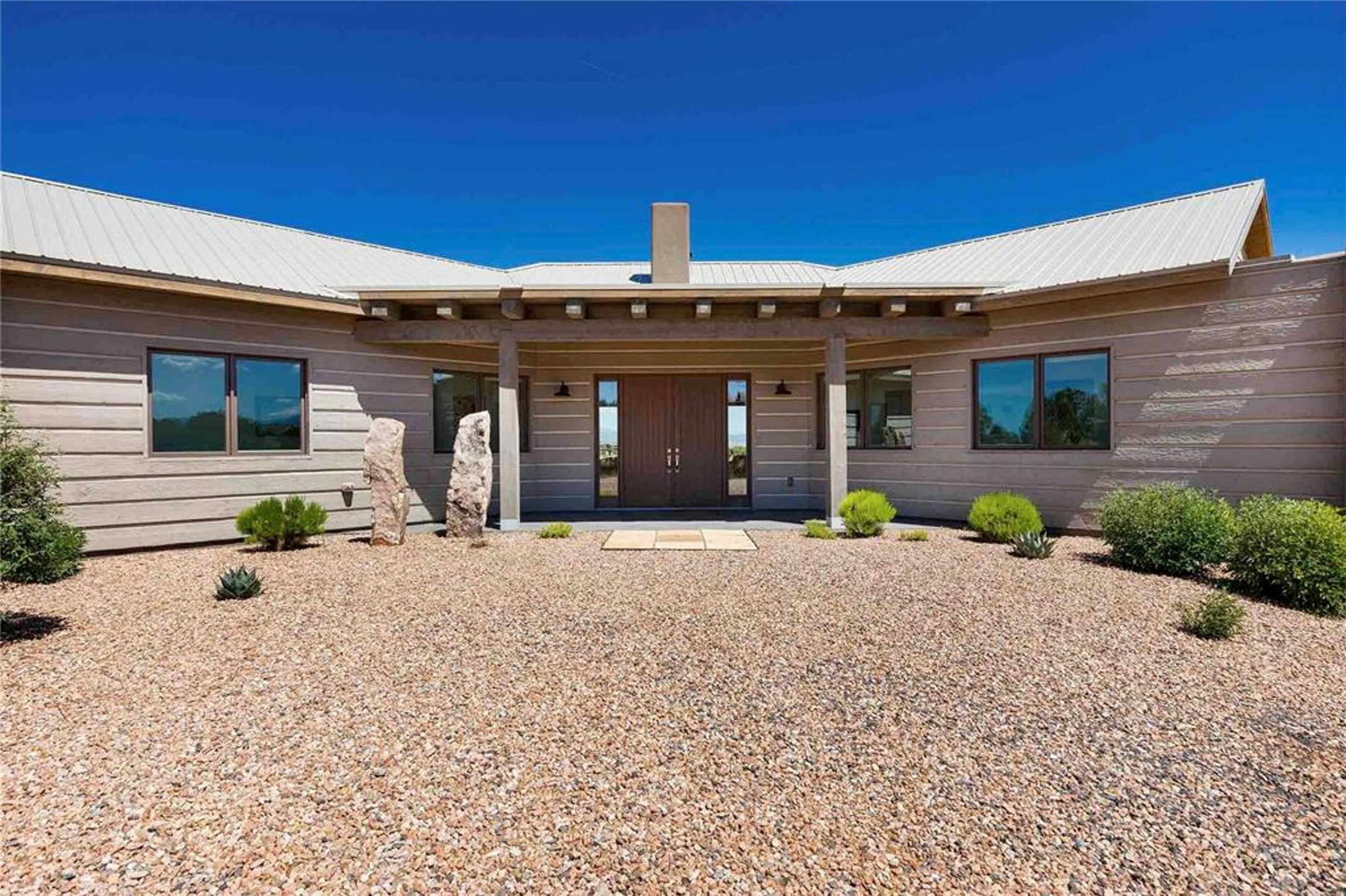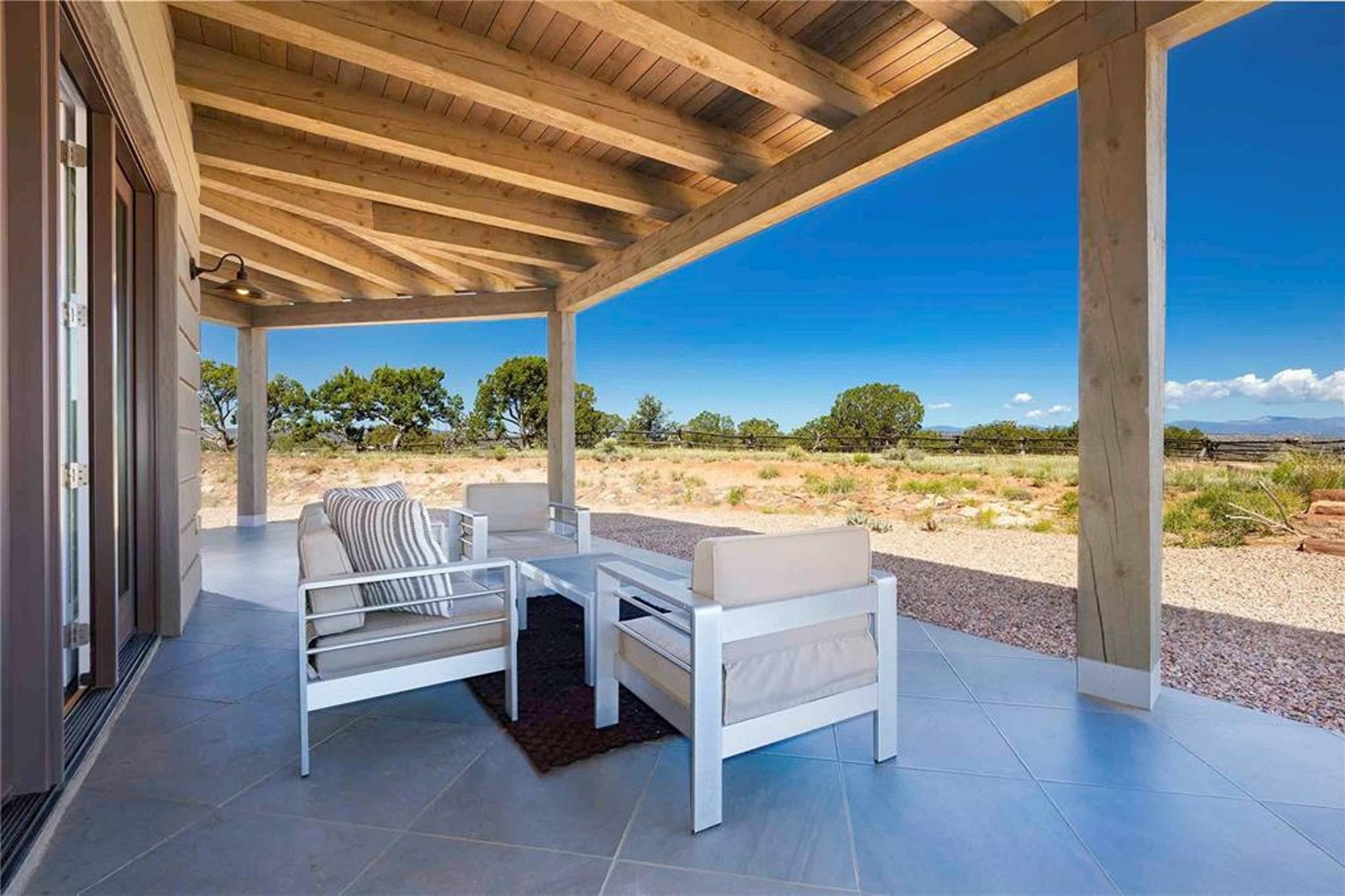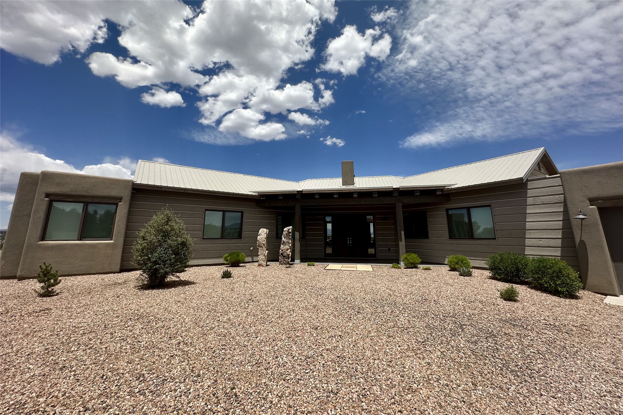 One of the rarest homes in all of Las Campanas, this exceptional contemporary, 2019-built home by Zachary & Sons, captivates with sophisticated log cabin architecture and stunning surround mountain views. Located within the Estancias of Las Campanas, this fabulous, single level home backs directly to BLM land and borders nearly 68,000 acres of open space, with endless Jemez Mountain and Sangre de Cristo Mountain views, and celebrates the true essence of the ultimate Santa Fe lifestyle. Design features include an open concept living room and dining room, ideal for entertaining with stunning views, back portal access through three sets of French doors, and a fireplace, all of which opens directly to the designer island kitchen with state of the art appliances, breakfast bar, views, and pantry. The owner's suite delights with portal access, Jemez views, an intimate seating area, and a modern bath complete with a walk-in shower, soaking tub, dual vanities and walk-in closet. Guests enjoy independence with a private ensuite bedroom and a secondary guest bedroom which is currently utilized as both a media room and office. Exceptional features include quality neutral finishes and soft natural light throughout, a generous two car garage with built-in storage, surround portals ideal for enjoying the ultimate outdoor living experience, and central air conditioning. Sited within close proximity to The Club at Las Campanas Clubhouse, (2) Jack Nicklaus Signature Golf Courses, Spa, Fitness and Tennis Center, and Equestrian Center, in addition to hiking trails and Diablo Canyon, this unique offering is truly a special opportunity. The owner's equity golf membership is available for purchase on a separate bill of sale.
