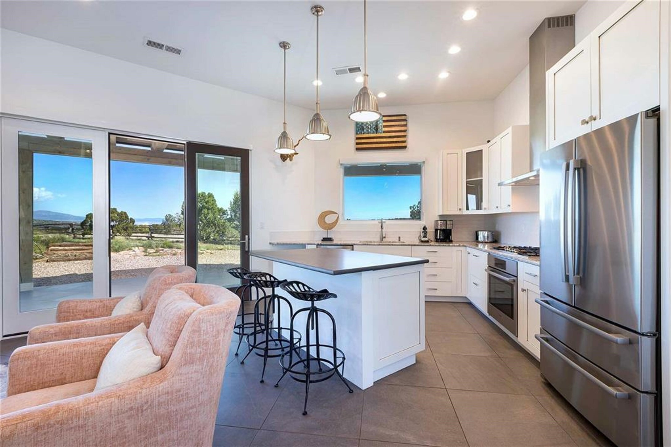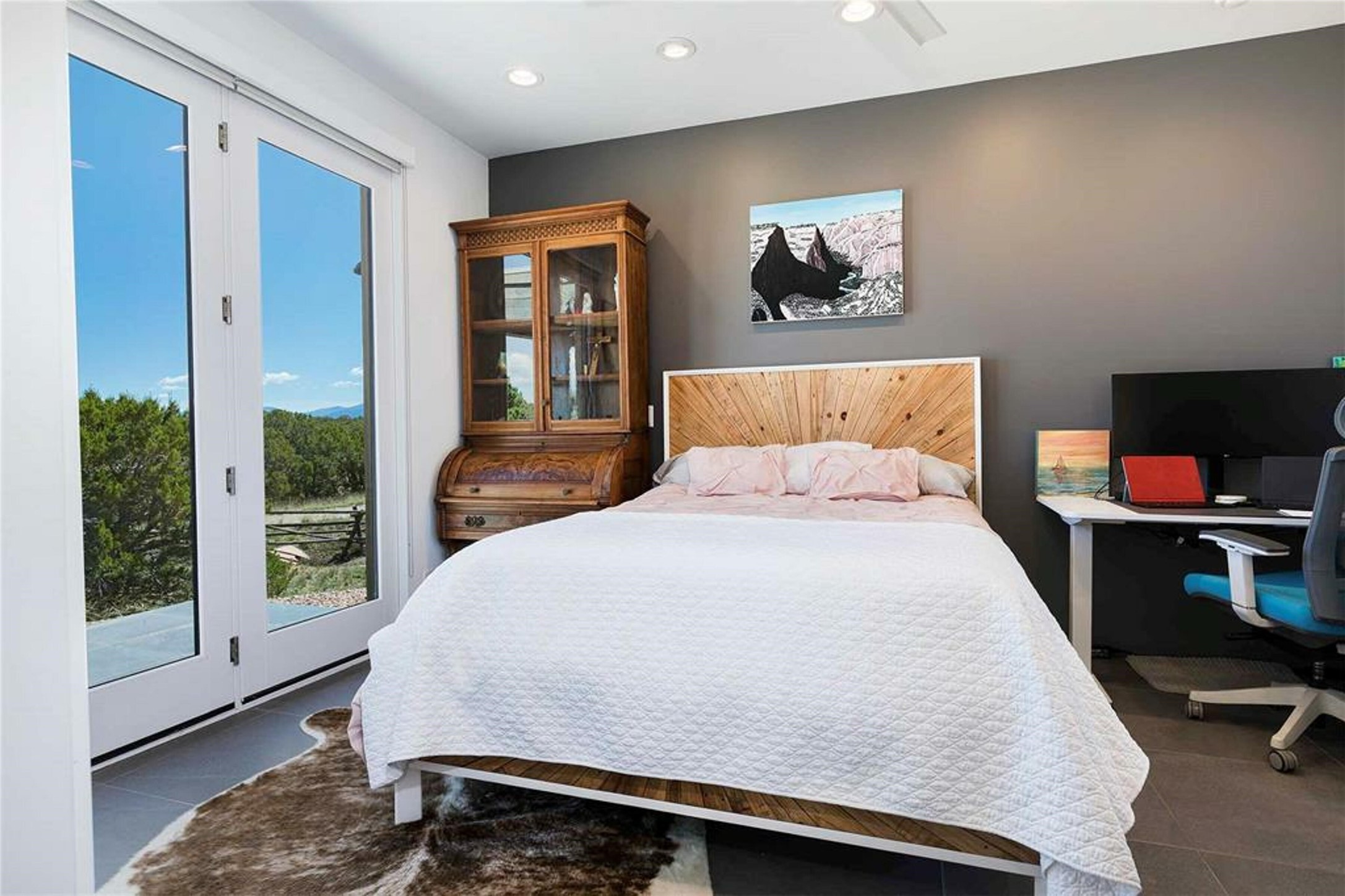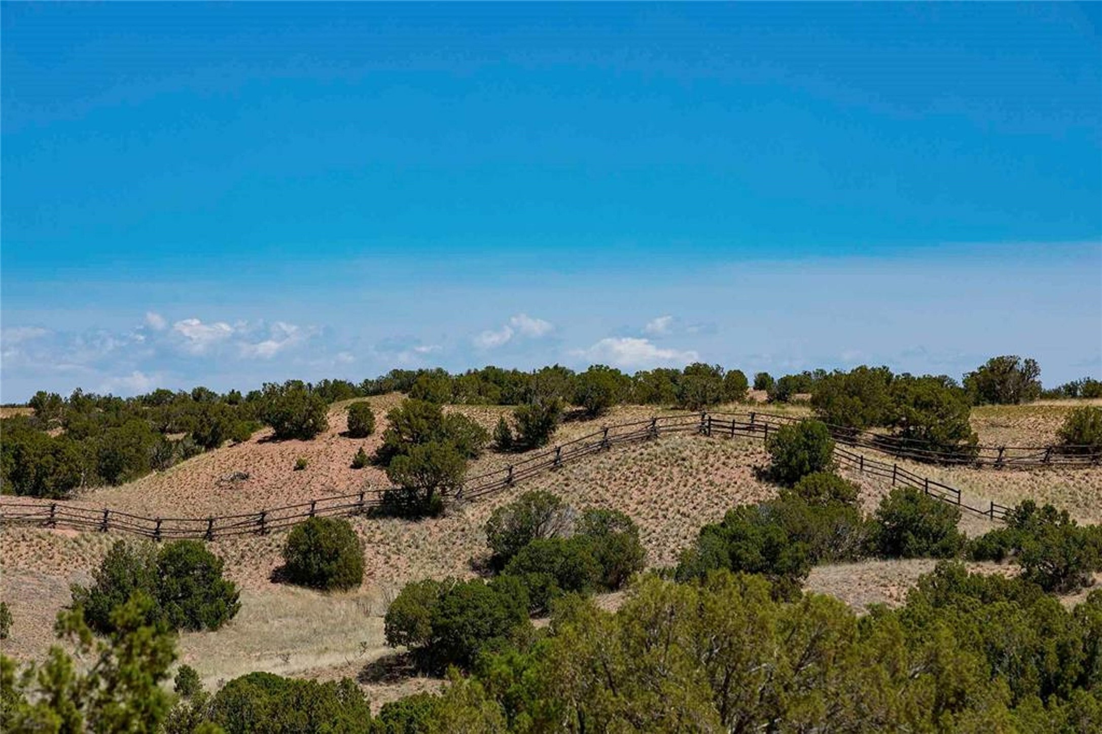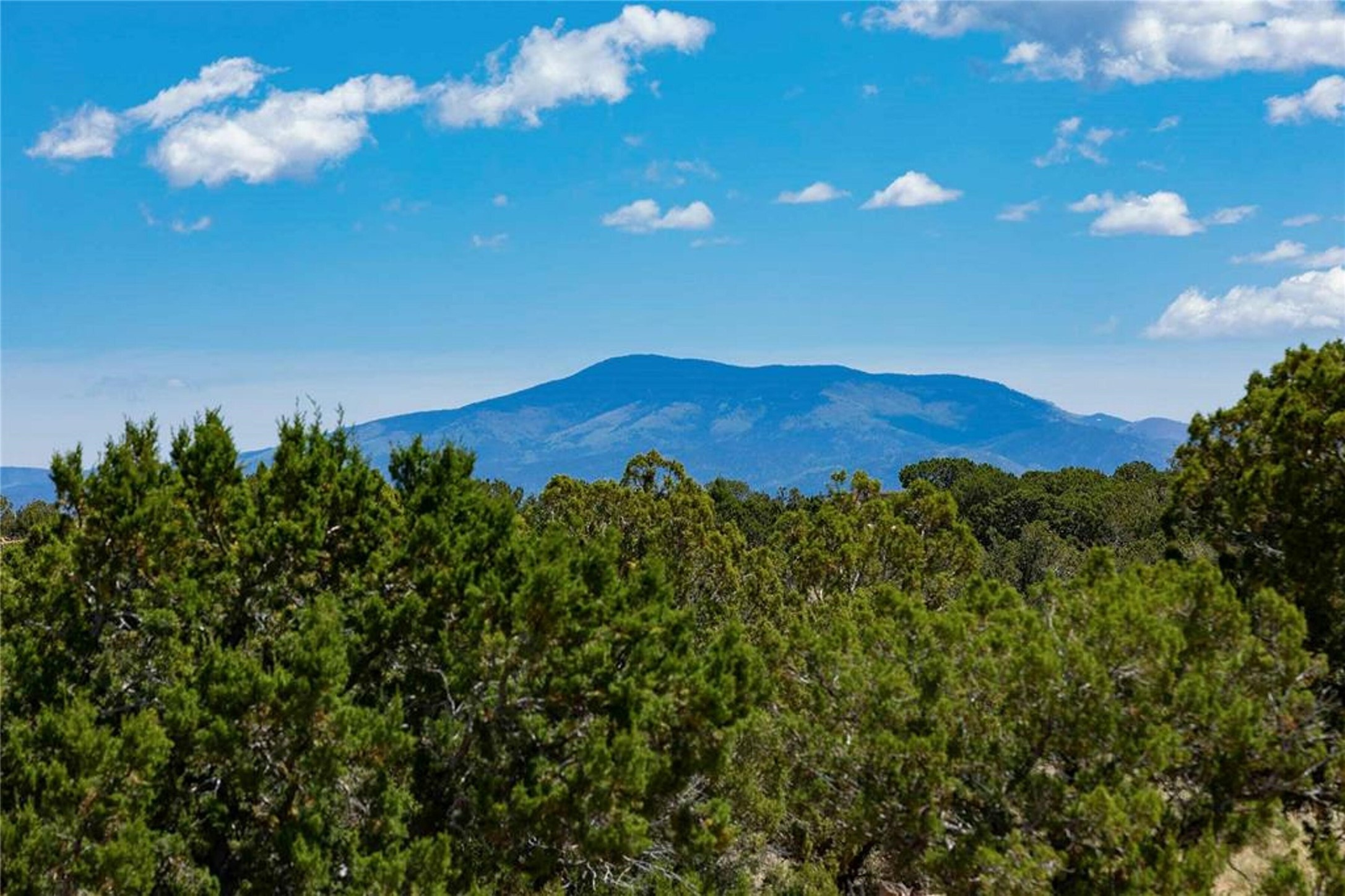 One of the rarest homes in all of Las Campanas, this exceptional contemporary, 2019-built home by Zachary & Sons, captivates with sophisticated log cabin architecture and stunning surround mountain views. Located within the Estancias of Las Campanas, this fabulous, single level home backs directly to BLM land and borders nearly 68,000 acres of open space, with endless Jemez Mountain and Sangre de Cristo Mountain views, and celebrates the true essence of the ultimate Santa Fe lifestyle. Design features include an open concept living room and dining room, ideal for entertaining with stunning views, back portal access through three sets of French doors, and a fireplace, all of which opens directly to the designer island kitchen with state of the art appliances, breakfast bar, views, and pantry. The owner's suite delights with portal access, Jemez views, an intimate seating area, and a modern bath complete with a walk-in shower, soaking tub, dual vanities and walk-in closet. Guests enjoy independence with a private ensuite bedroom and a secondary guest bedroom which is currently utilized as both a media room and office. Exceptional features include quality neutral finishes and soft natural light throughout, a generous two car garage with built-in storage, surround portals ideal for enjoying the ultimate outdoor living experience, and central air conditioning. Sited within close proximity to The Club at Las Campanas Clubhouse, (2) Jack Nicklaus Signature Golf Courses, Spa, Fitness and Tennis Center, and Equestrian Center, in addition to hiking trails and Diablo Canyon, this unique offering is truly a special opportunity. The owner's equity golf membership is available for purchase on a separate bill of sale.