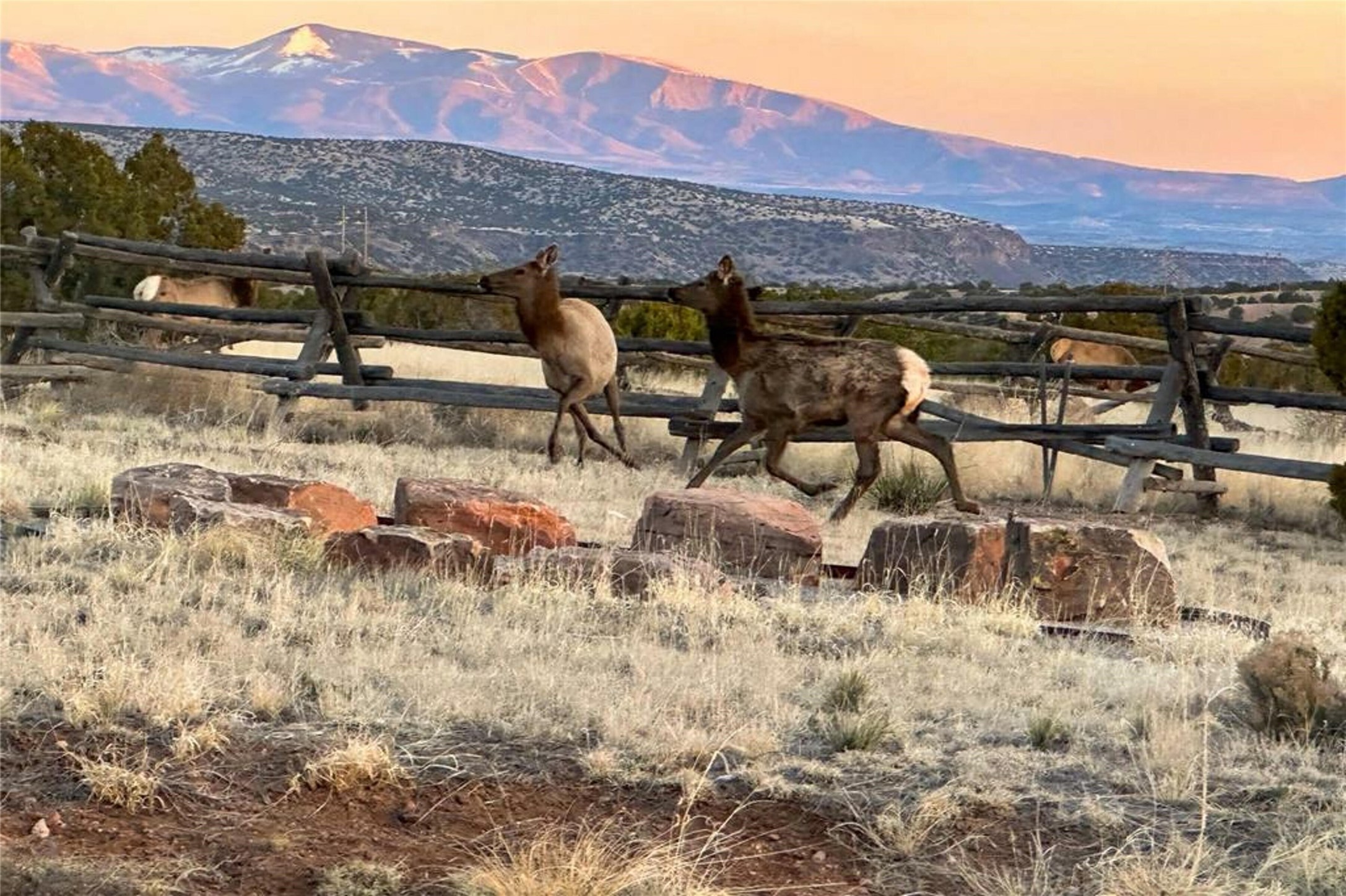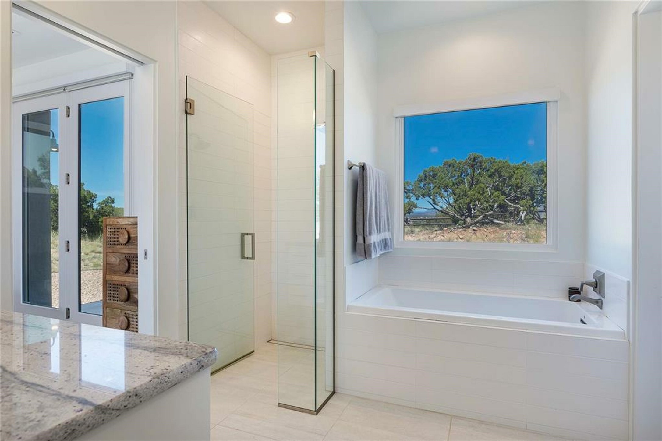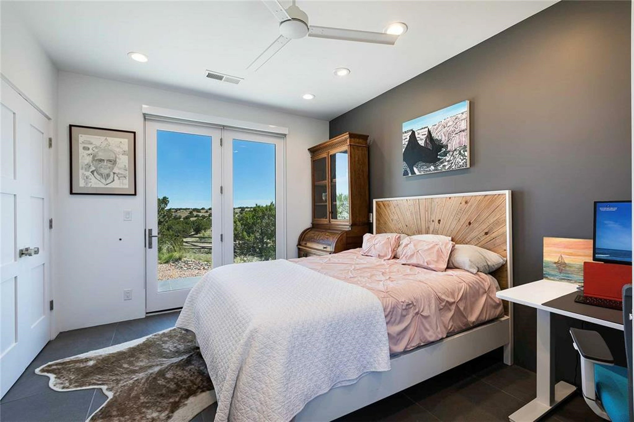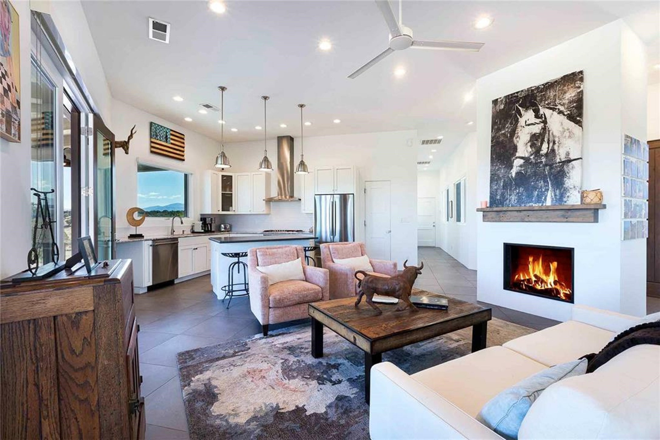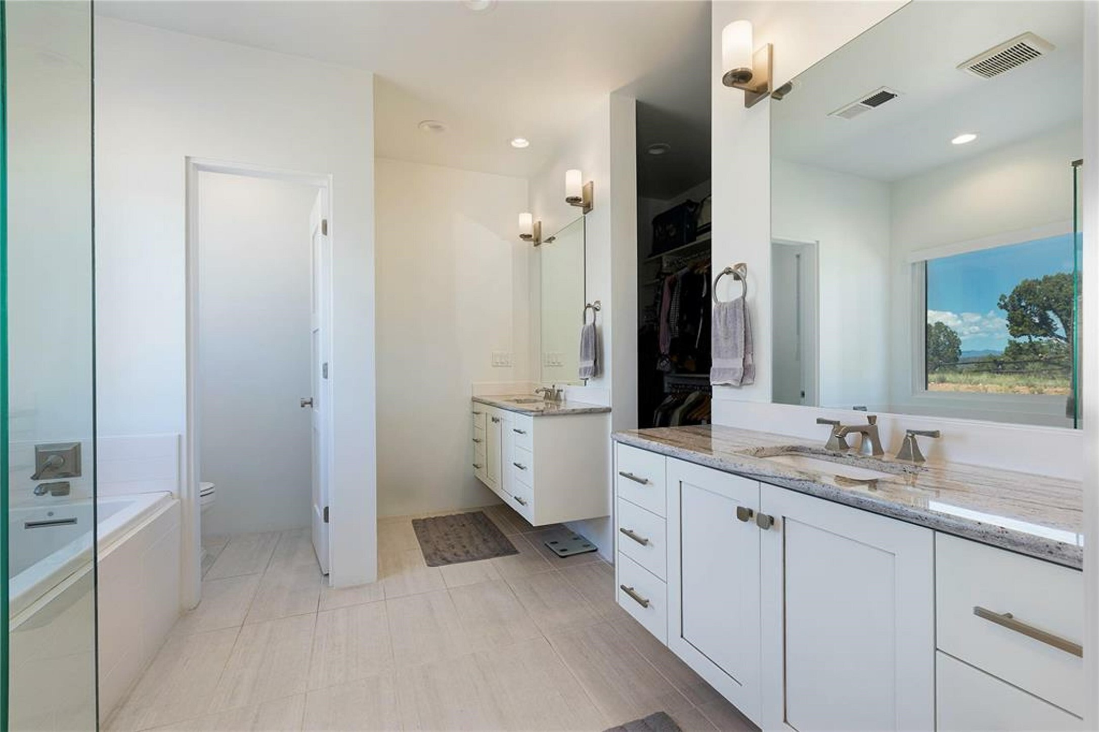 One of the rarest homes in all of Las Campanas, this exceptional contemporary, 2019-built home by Zachary & Sons, captivates with sophisticated log cabin architecture and stunning surround mountain views. Located within the Estancias of Las Campanas, this fabulous, single level home backs directly to BLM land and borders nearly 68,000 acres of open space, with endless Jemez Mountain and Sangre de Cristo Mountain views, and celebrates the true essence of the ultimate Santa Fe lifestyle. Design features include an open concept living room and dining room, ideal for entertaining with stunning views, back portal access through three sets of French doors, and a fireplace, all of which opens directly to the designer island kitchen with state of the art appliances, breakfast bar, views, and pantry. The owner's suite delights with portal access, Jemez views, an intimate seating area, and a modern bath complete with a walk-in shower, soaking tub, dual vanities and walk-in closet. Guests enjoy independence with a private ensuite bedroom and a secondary guest bedroom which is currently utilized as both a media room and office. Exceptional features include quality neutral finishes and soft natural light throughout, a generous two car garage with built-in storage, surround portals ideal for enjoying the ultimate outdoor living experience, and central air conditioning. Sited within close proximity to The Club at Las Campanas Clubhouse, (2) Jack Nicklaus Signature Golf Courses, Spa, Fitness and Tennis Center, and Equestrian Center, in addition to hiking trails and Diablo Canyon, this unique offering is truly a special opportunity. The owner's equity golf membership is available for purchase on a separate bill of sale.