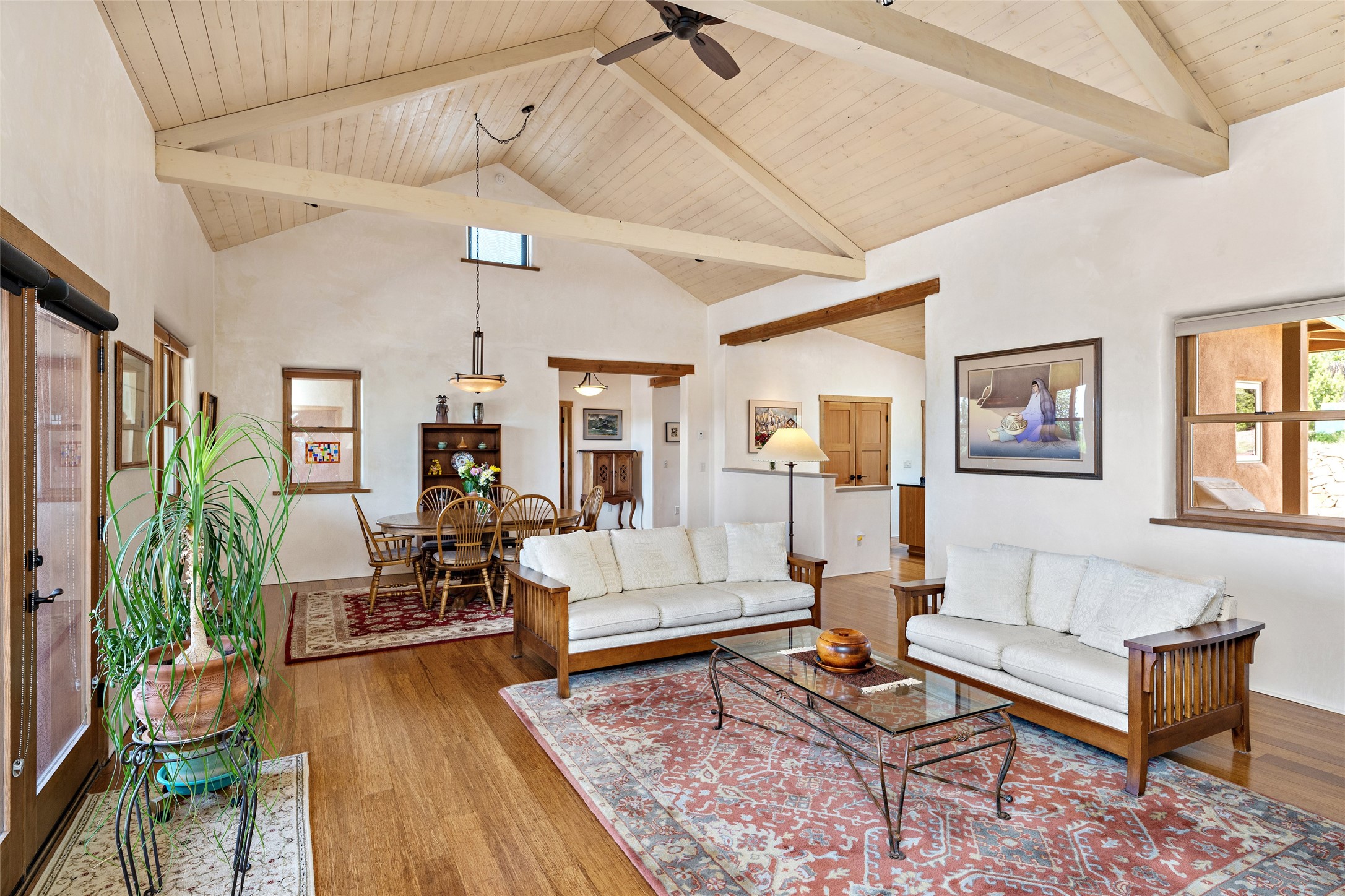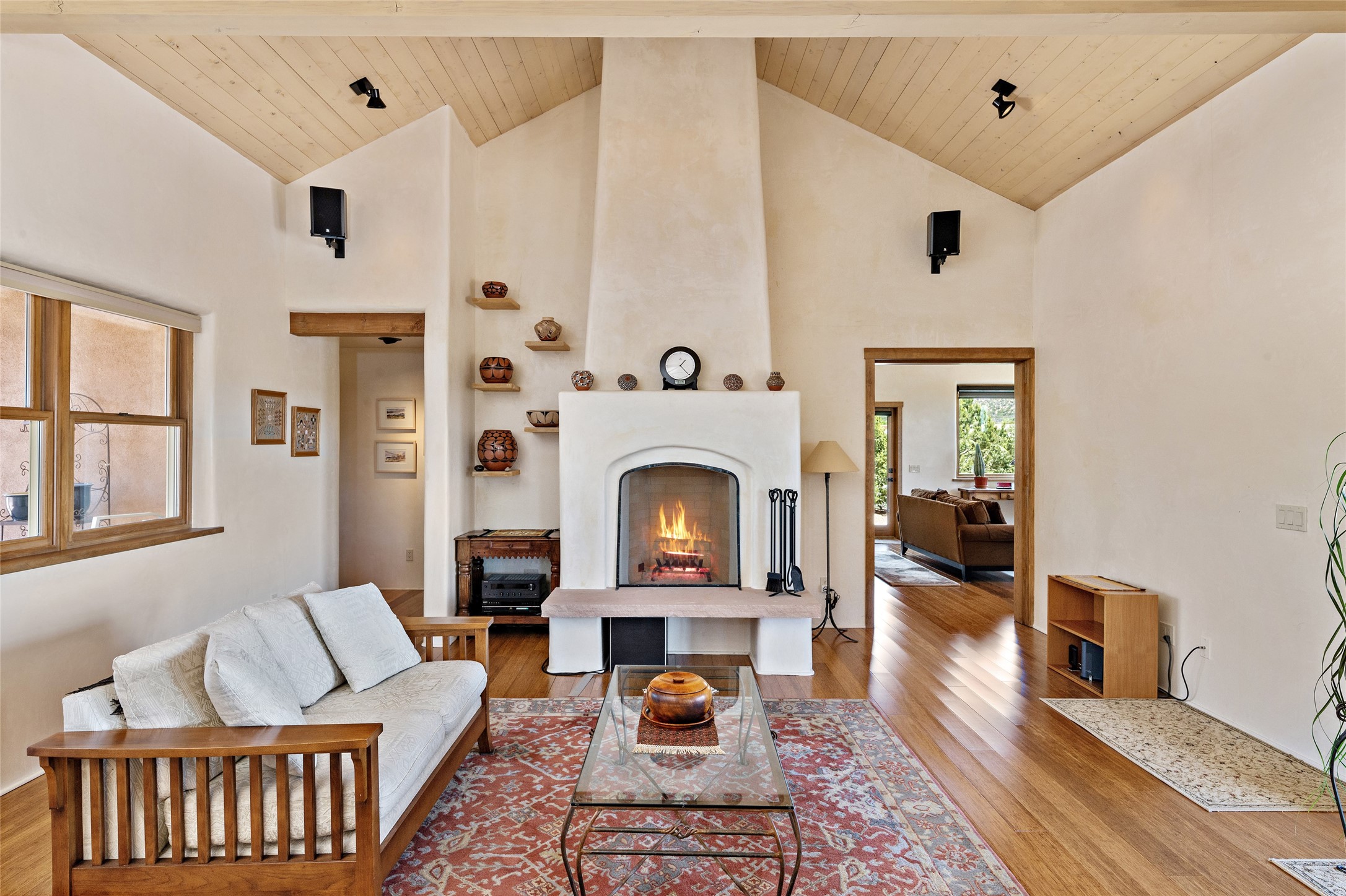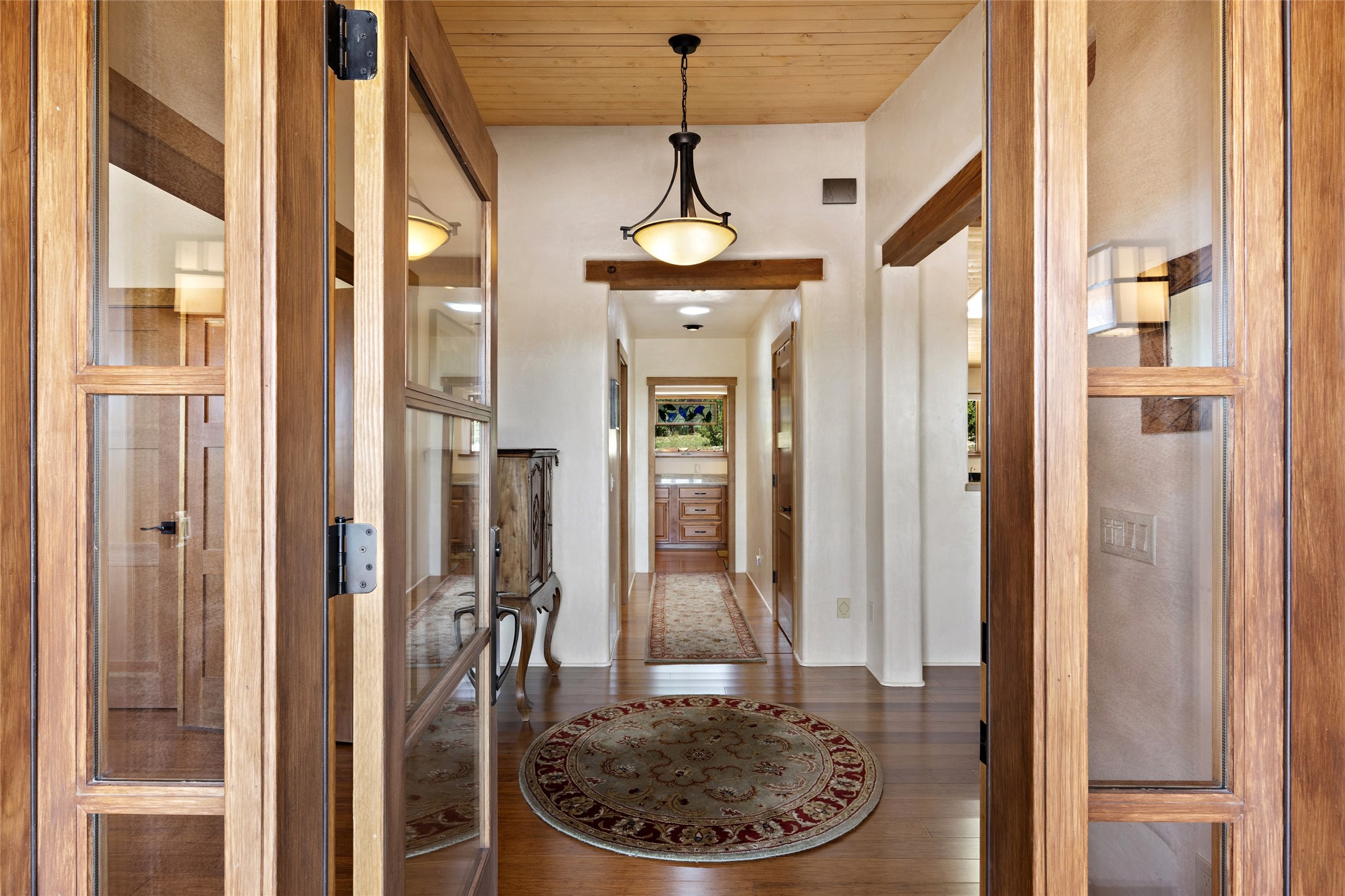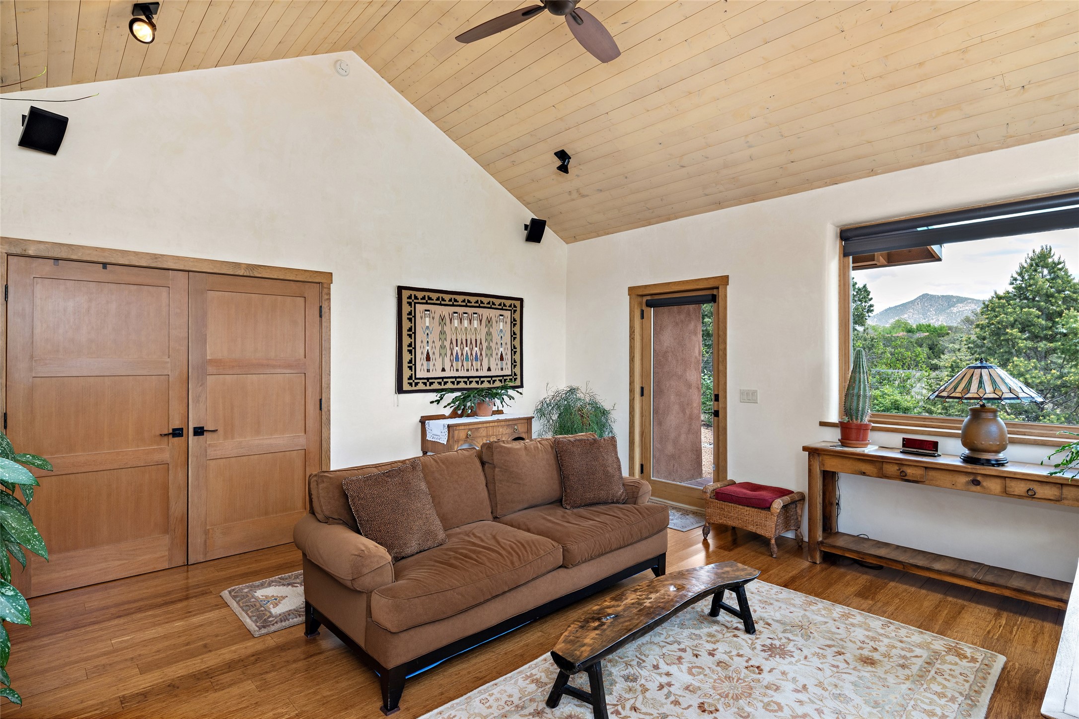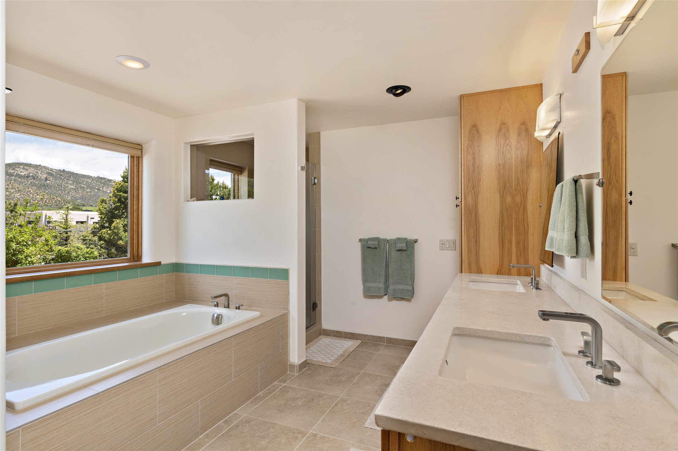 Sited on a prime larger lot in Museum Hill Estates subdivision, this custom designed newer Northern New Mexico-style home is meticulous and light-filed with stunning views of Atalaya, Sun and Moon mountains. The easy access kitchen is thoughtfully designed with plentiful custom cabinets, pantry, and island storage, under counter sink, and built in microwave. Bedroom separation is excellent with versatile use options, mountain views, and well designed closet storage. The heated 2-car garage can be directly accessed through the spacious laundry room with under counter sink and custom cabinetry. Three covered patio areas serve as delightful outdoor retreats. Numerous features include: superior insulation throughout for temperature control; seven-zone radiant floor heating; sub-slab ventilation; central vacuum system; large, finished storage attic with pull-down stairs; low-maintenance metal pitched roof, and drip system for landscaping. HOA fee of $300 per year covers maintenance of walking trail and open space areas. Wood Gormley school district.