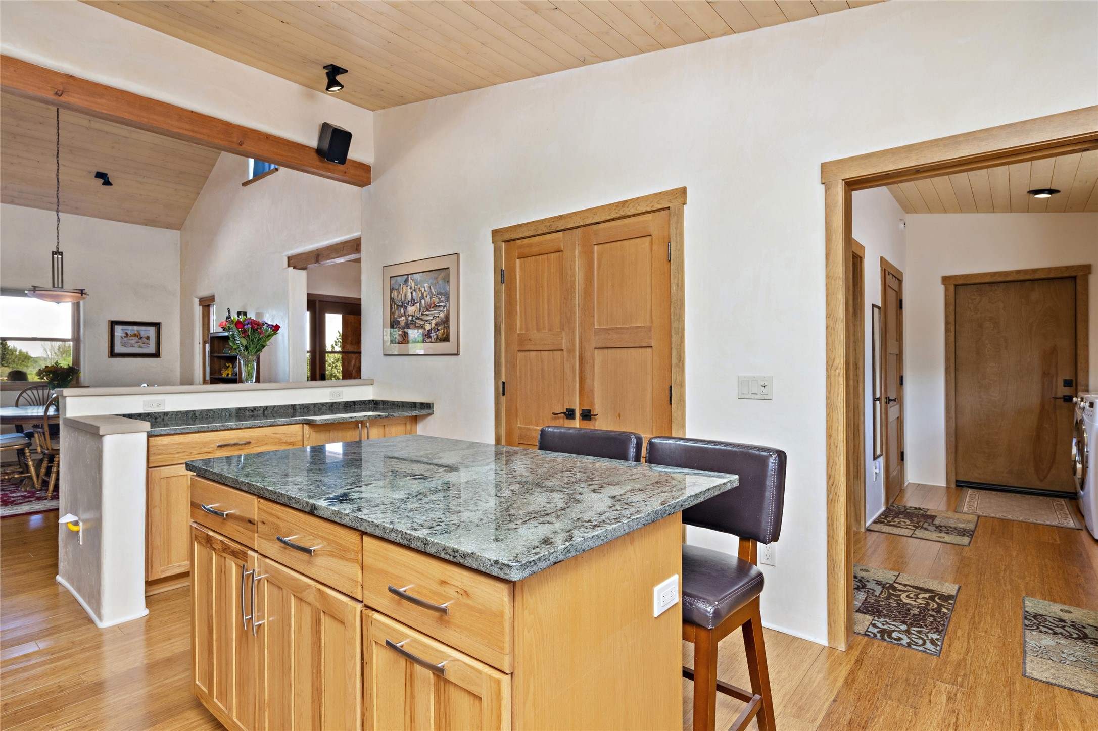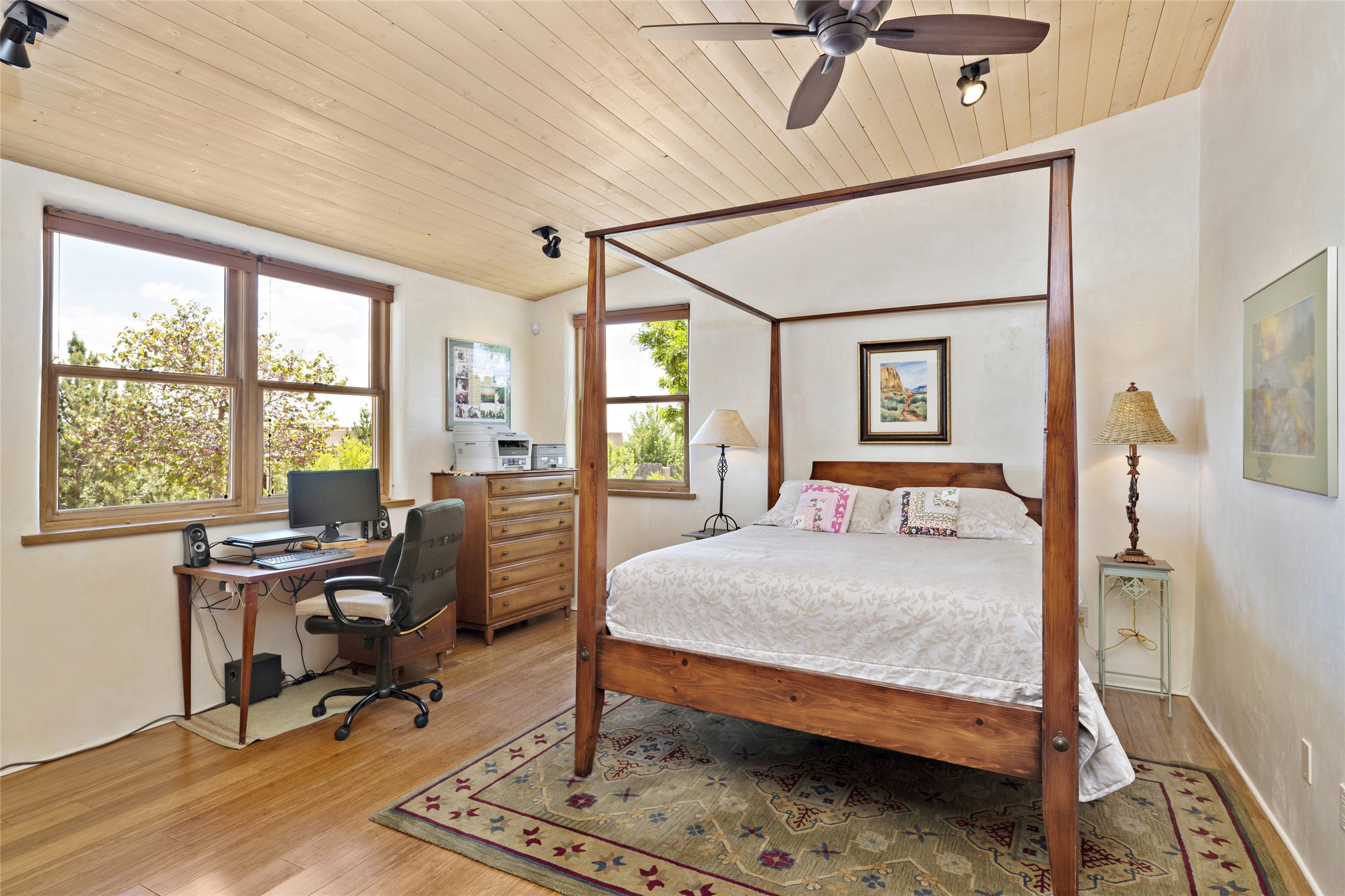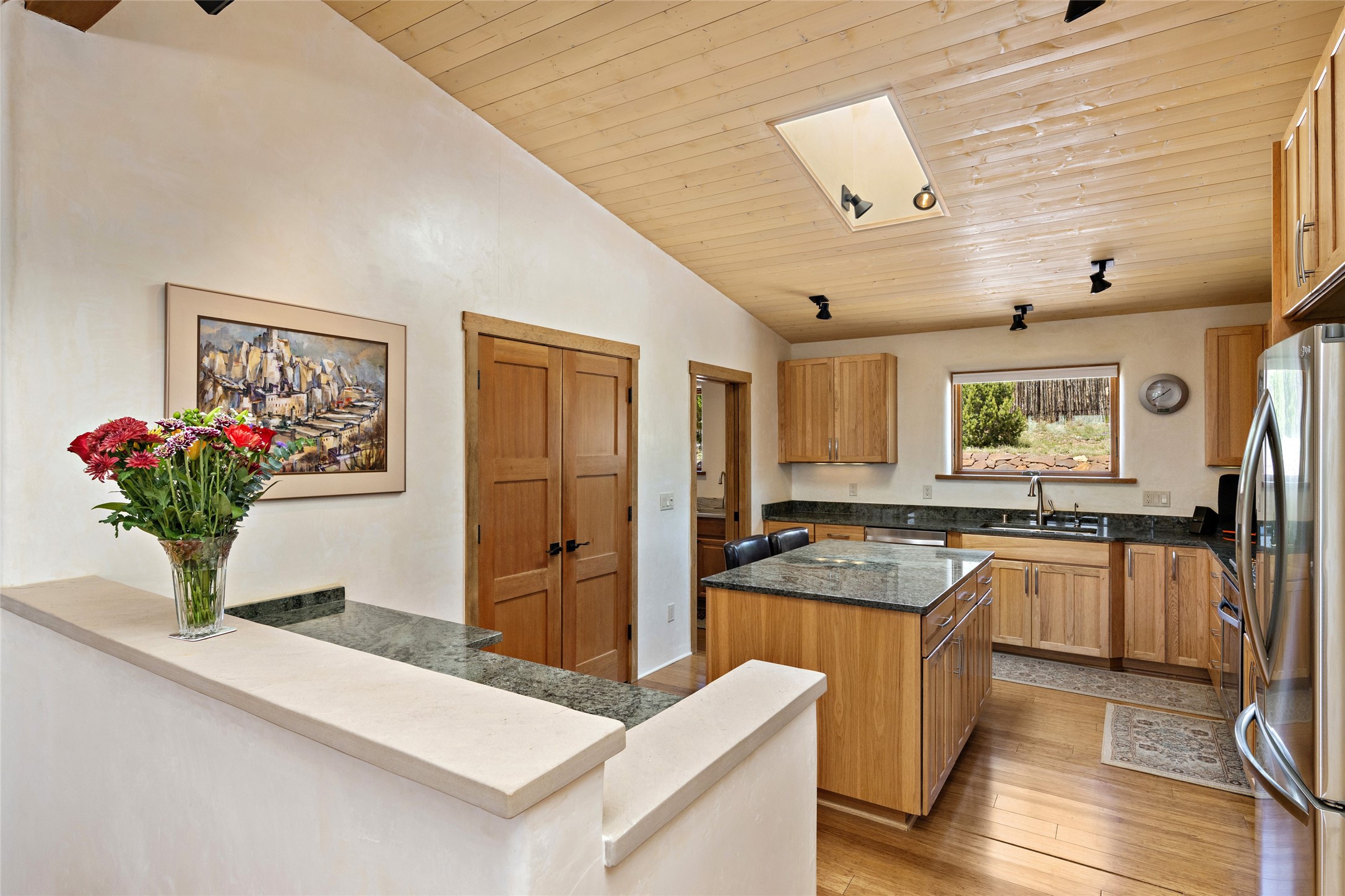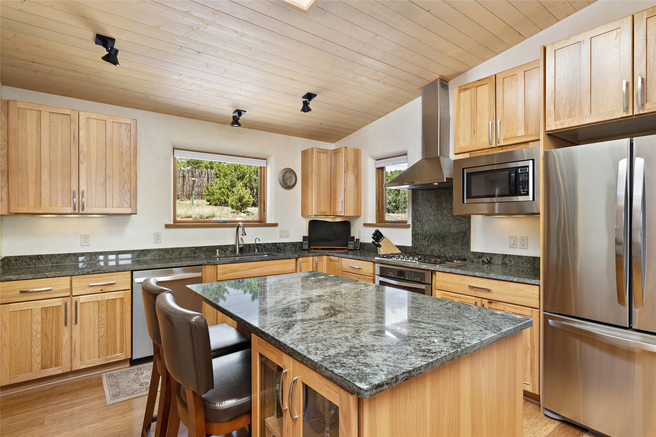 Sited on a prime larger lot in Museum Hill Estates subdivision, this custom designed newer Northern New Mexico-style home is meticulous and light-filed with stunning views of Atalaya, Sun and Moon mountains. The easy access kitchen is thoughtfully designed with plentiful custom cabinets, pantry, and island storage, under counter sink, and built in microwave. Bedroom separation is excellent with versatile use options, mountain views, and well designed closet storage. The heated 2-car garage can be directly accessed through the spacious laundry room with under counter sink and custom cabinetry. Three covered patio areas serve as delightful outdoor retreats. Numerous features include: superior insulation throughout for temperature control; seven-zone radiant floor heating; sub-slab ventilation; central vacuum system; large, finished storage attic with pull-down stairs; low-maintenance metal pitched roof, and drip system for landscaping. HOA fee of $300 per year covers maintenance of walking trail and open space areas. Wood Gormley school district.