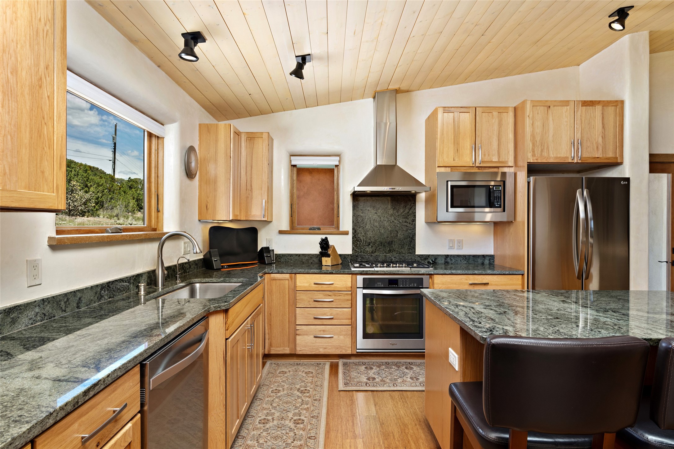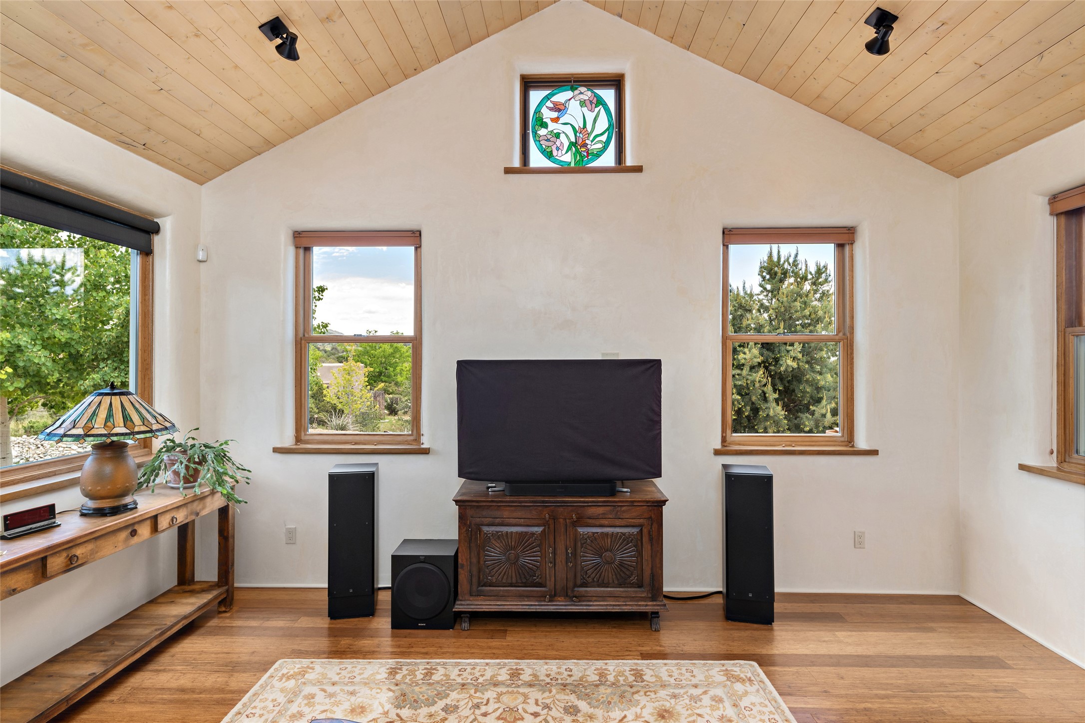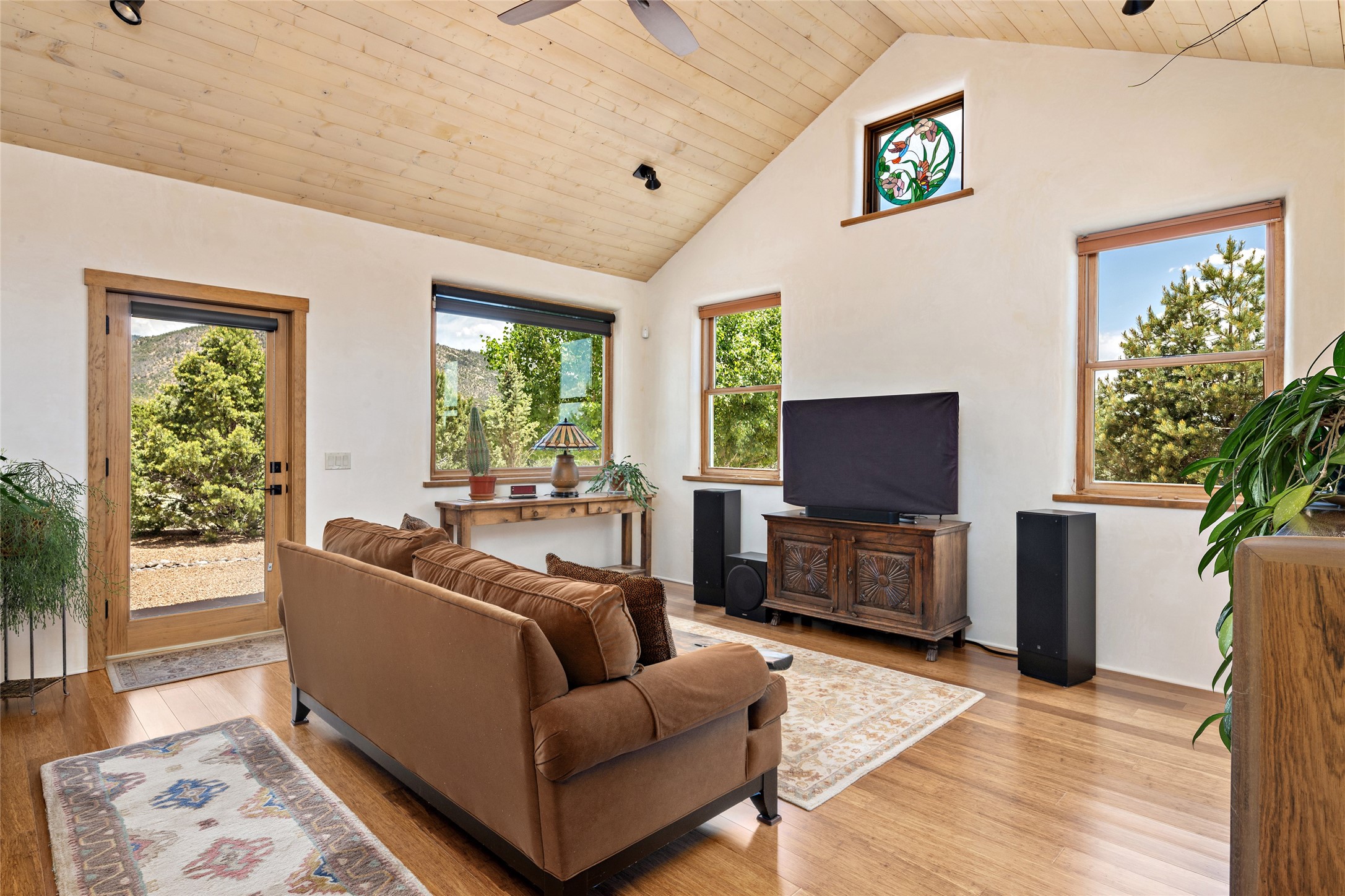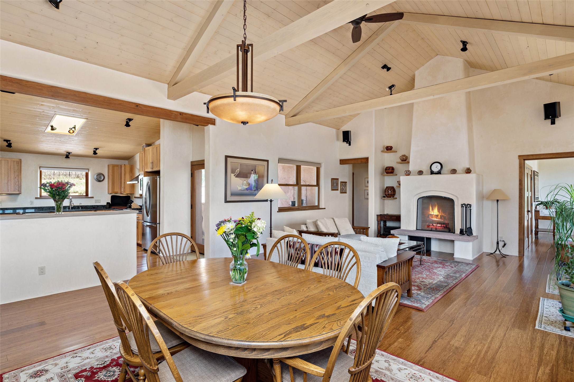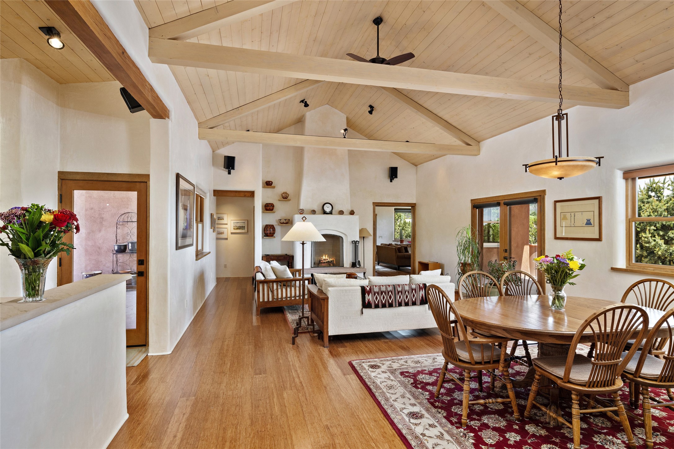 Sited on a prime larger lot in Museum Hill Estates subdivision, this custom designed newer Northern New Mexico-style home is meticulous and light-filed with stunning views of Atalaya, Sun and Moon mountains. The easy access kitchen is thoughtfully designed with plentiful custom cabinets, pantry, and island storage, under counter sink, and built in microwave. Bedroom separation is excellent with versatile use options, mountain views, and well designed closet storage. The heated 2-car garage can be directly accessed through the spacious laundry room with under counter sink and custom cabinetry. Three covered patio areas serve as delightful outdoor retreats. Numerous features include: superior insulation throughout for temperature control; seven-zone radiant floor heating; sub-slab ventilation; central vacuum system; large, finished storage attic with pull-down stairs; low-maintenance metal pitched roof, and drip system for landscaping. HOA fee of $300 per year covers maintenance of walking trail and open space areas. Wood Gormley school district.