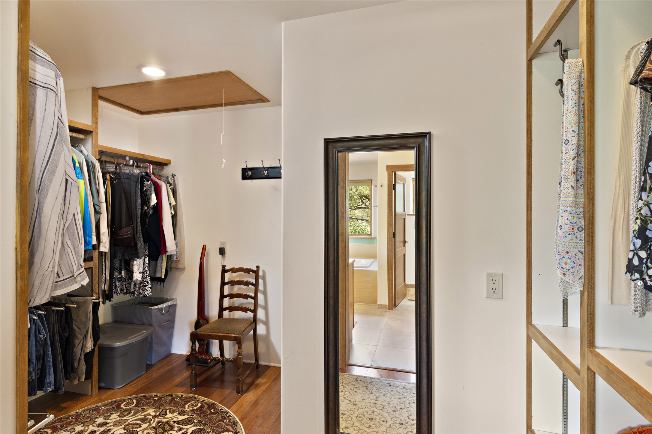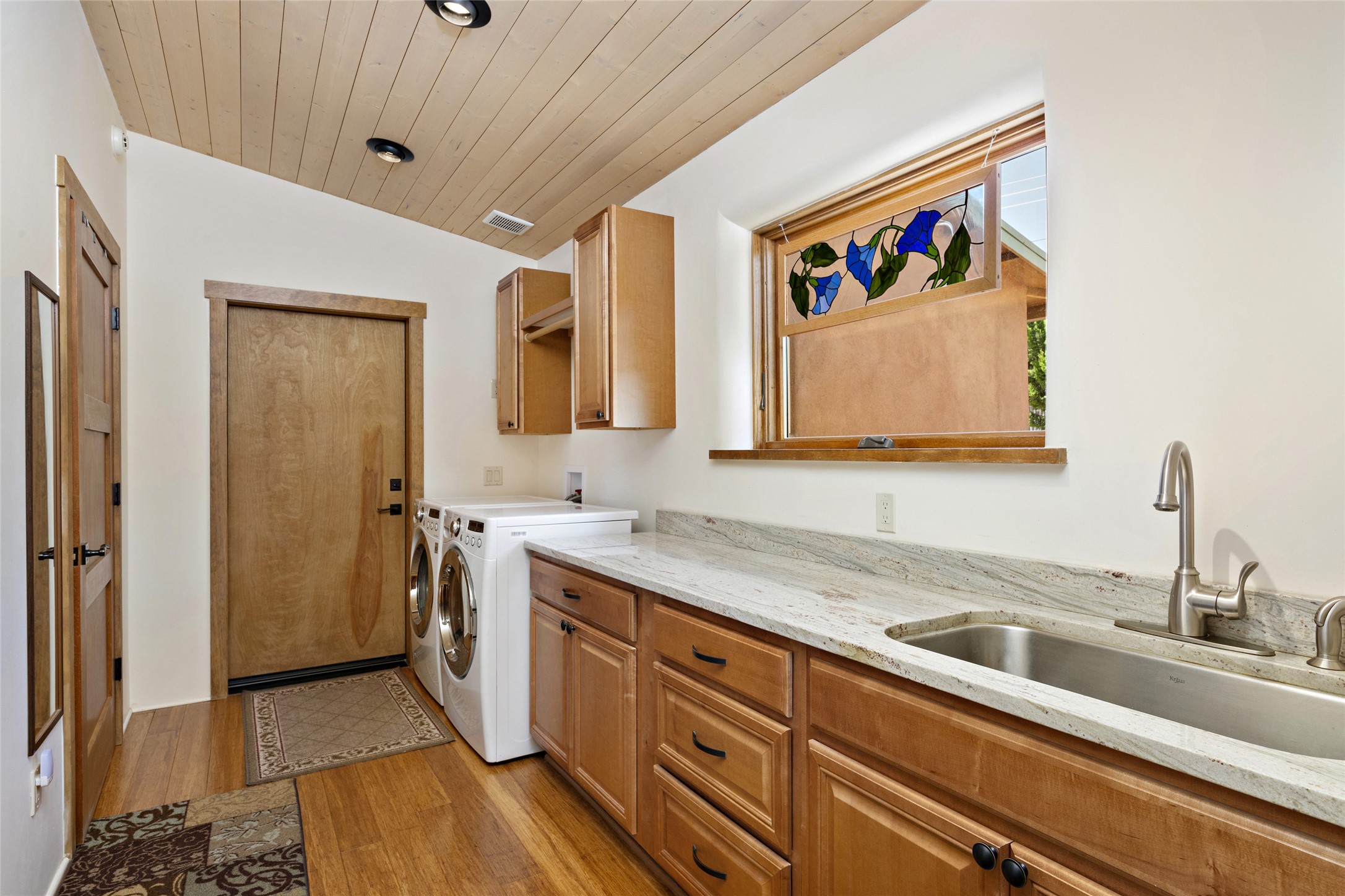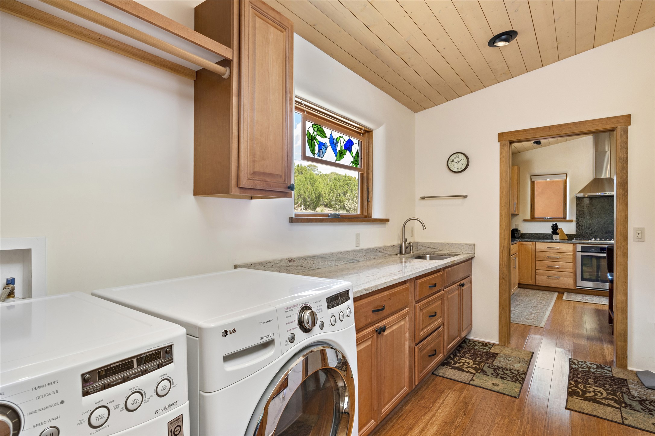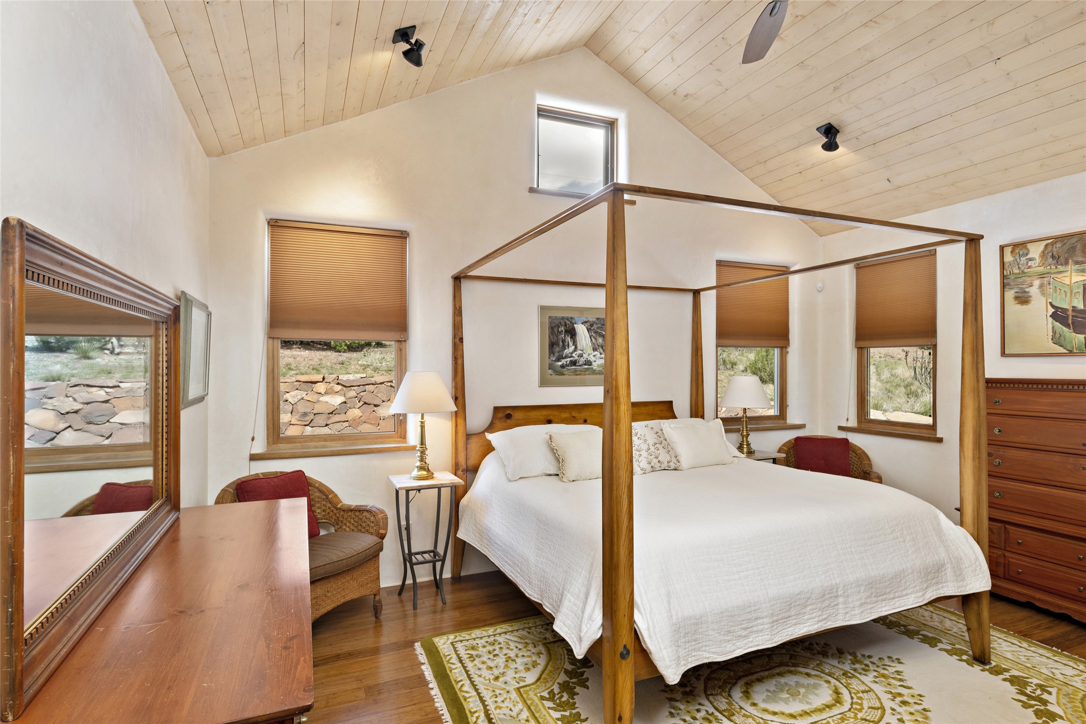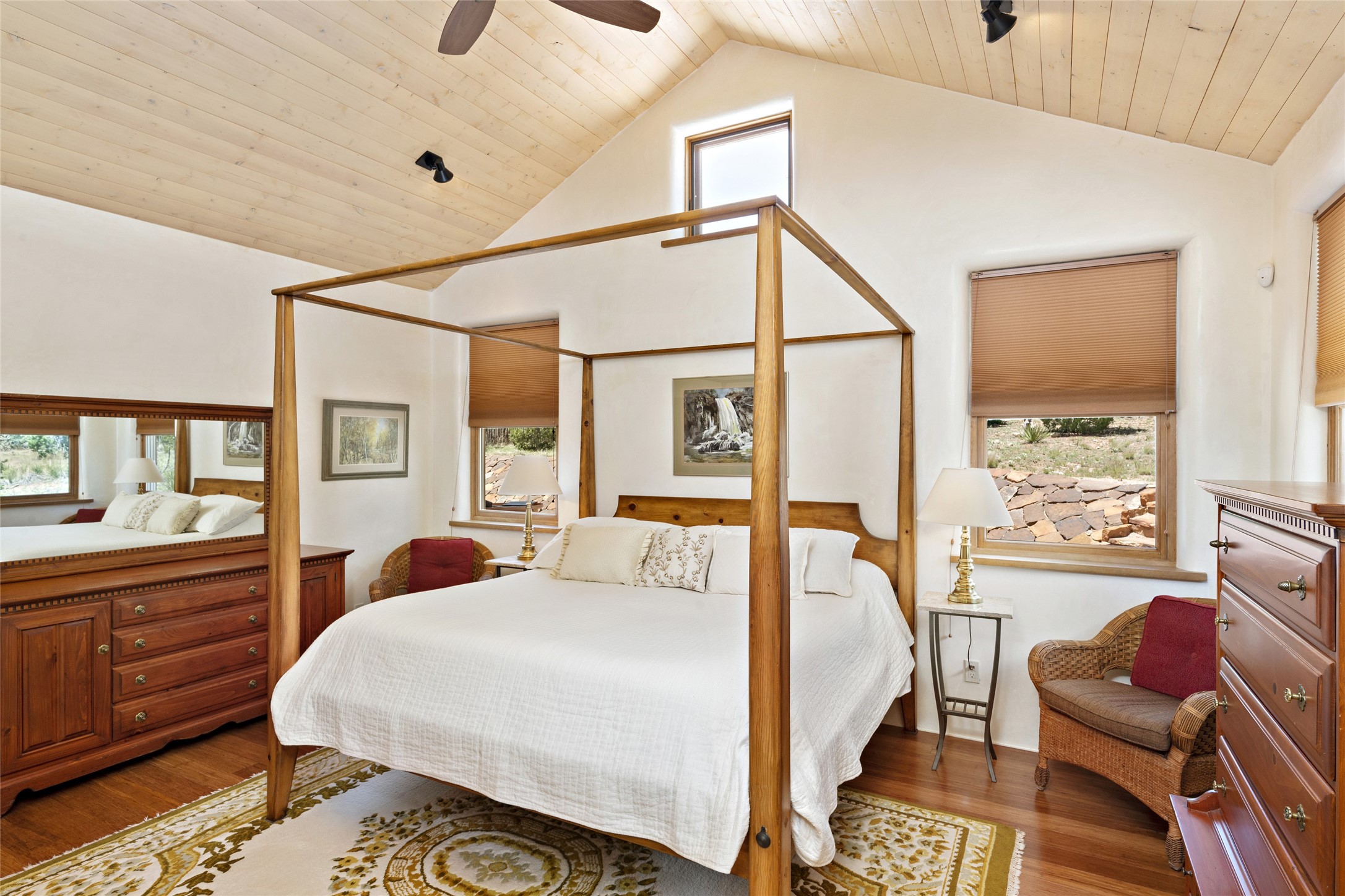 Sited on a prime larger lot in Museum Hill Estates subdivision, this custom designed newer Northern New Mexico-style home is meticulous and light-filed with stunning views of Atalaya, Sun and Moon mountains. The easy access kitchen is thoughtfully designed with plentiful custom cabinets, pantry, and island storage, under counter sink, and built in microwave. Bedroom separation is excellent with versatile use options, mountain views, and well designed closet storage. The heated 2-car garage can be directly accessed through the spacious laundry room with under counter sink and custom cabinetry. Three covered patio areas serve as delightful outdoor retreats. Numerous features include: superior insulation throughout for temperature control; seven-zone radiant floor heating; sub-slab ventilation; central vacuum system; large, finished storage attic with pull-down stairs; low-maintenance metal pitched roof, and drip system for landscaping. HOA fee of $300 per year covers maintenance of walking trail and open space areas. Wood Gormley school district.