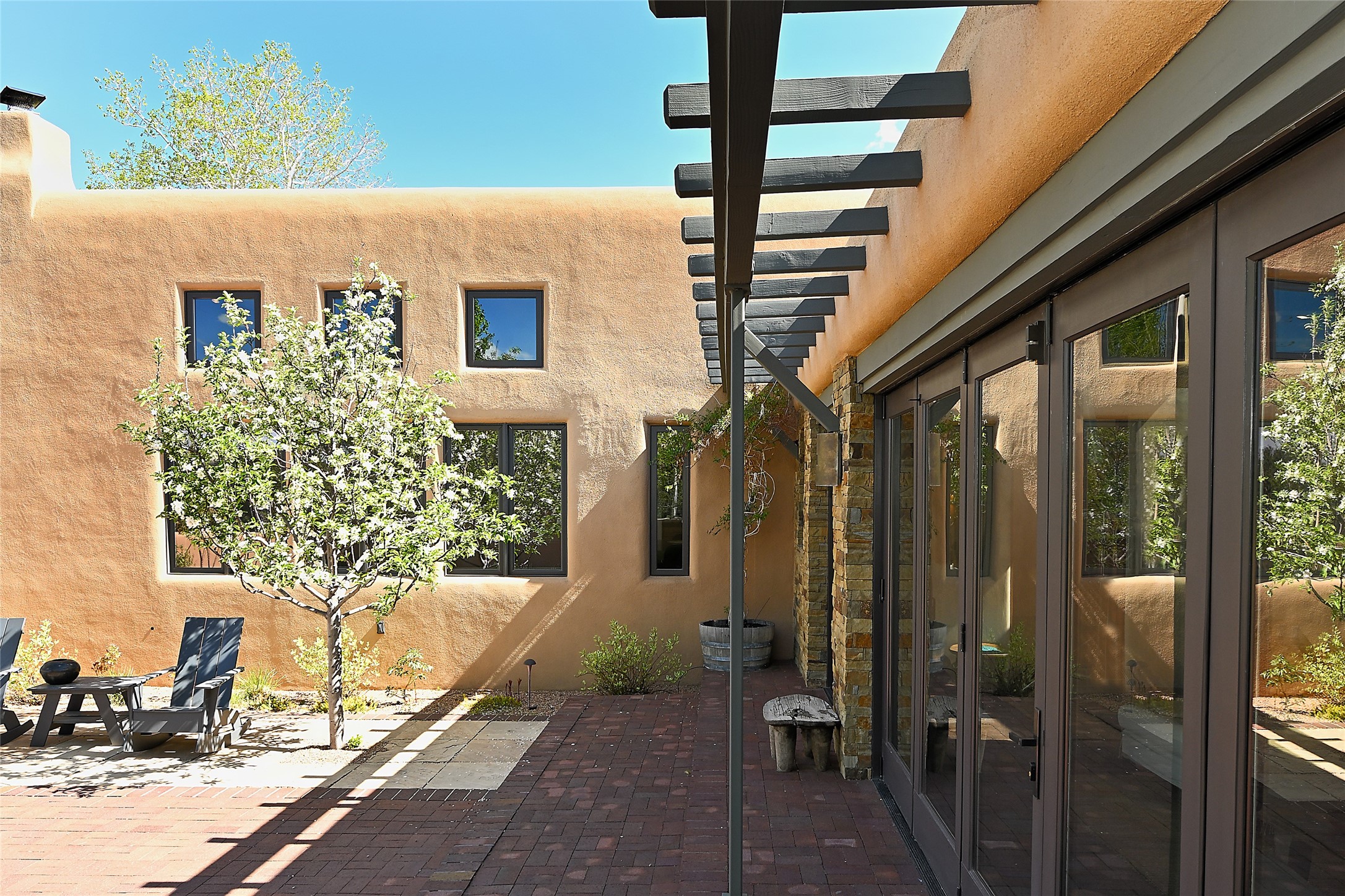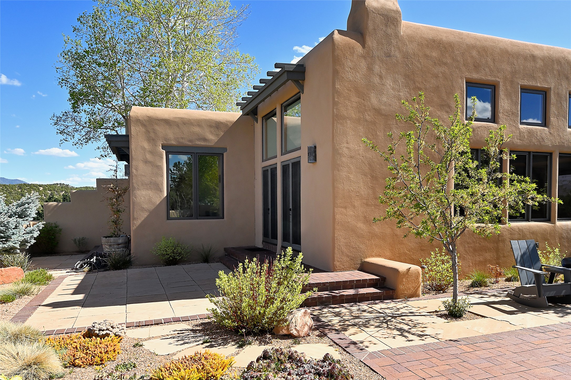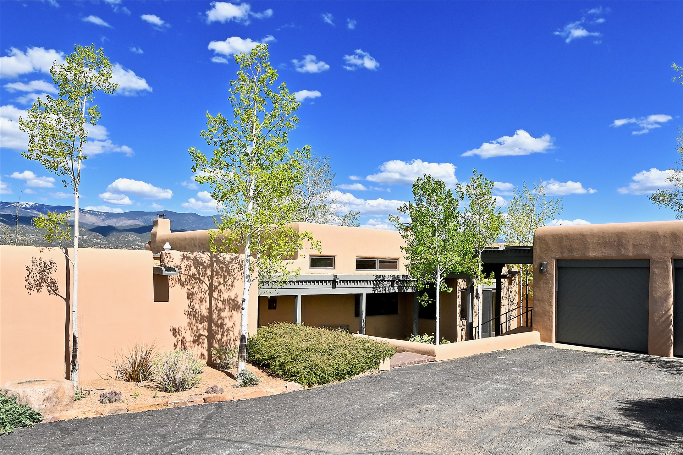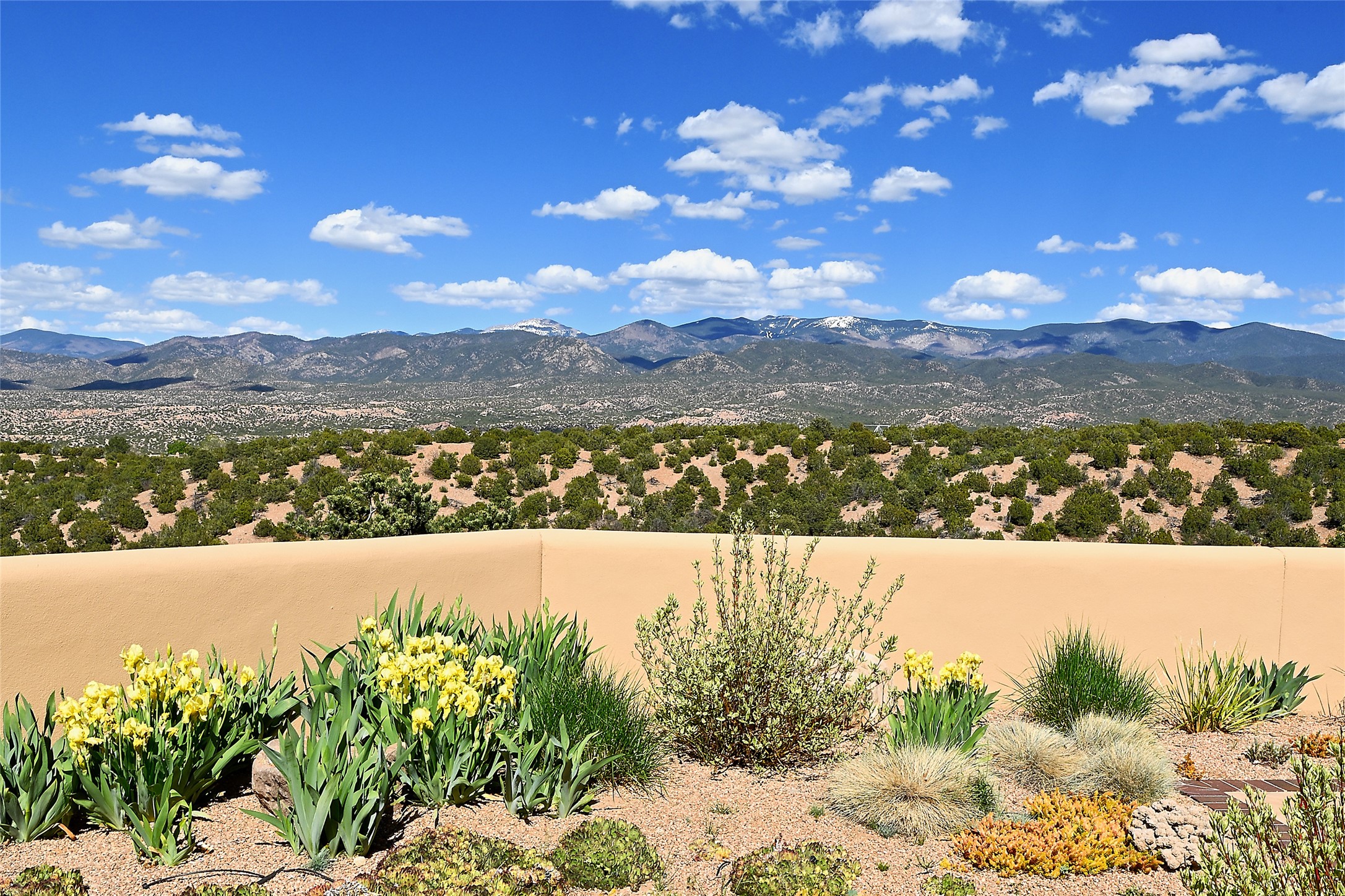 Located in the private gated community of Casas de San Juan--in the foothills adjacent to the renowned Santa Fe Opera and only minutes north of the historic Plaza, Canyon Road, and Museum Hill--this stunning four-bedroom four-bath retreat with new roof in November 2023 enjoys spectacular views from nearly every room. Robert Zachry designed the contemporary condominium, which encourages year-round indoor-outdoor living and is accompanied by a two-car garage. The open concept living, dining, and kitchen area has an easy flow and French doors opening to a brick and flagstone terrace, xeriscaped gardens, and basalt stone fountains. Transom windows and tall ceilings with vigas and beams create a bright, expansive ambience. The chef's kitchen features alder cabinets, superior appliances, and a casual breakfast bar. The gracious primary suite boasts custom closets and French doors to a terrace with panoramic views. One guest bedroom is warmed by a kiva fireplace and is adjoined by a sunroom or living area, while the third bedroom in the main house could also serve as an office, a media room, or a study. Secluded from the main residence is a one-room guest house with a kiva fireplace, a bath, and its own patio. The gated community is securely staffed. New roof in November 2023.
