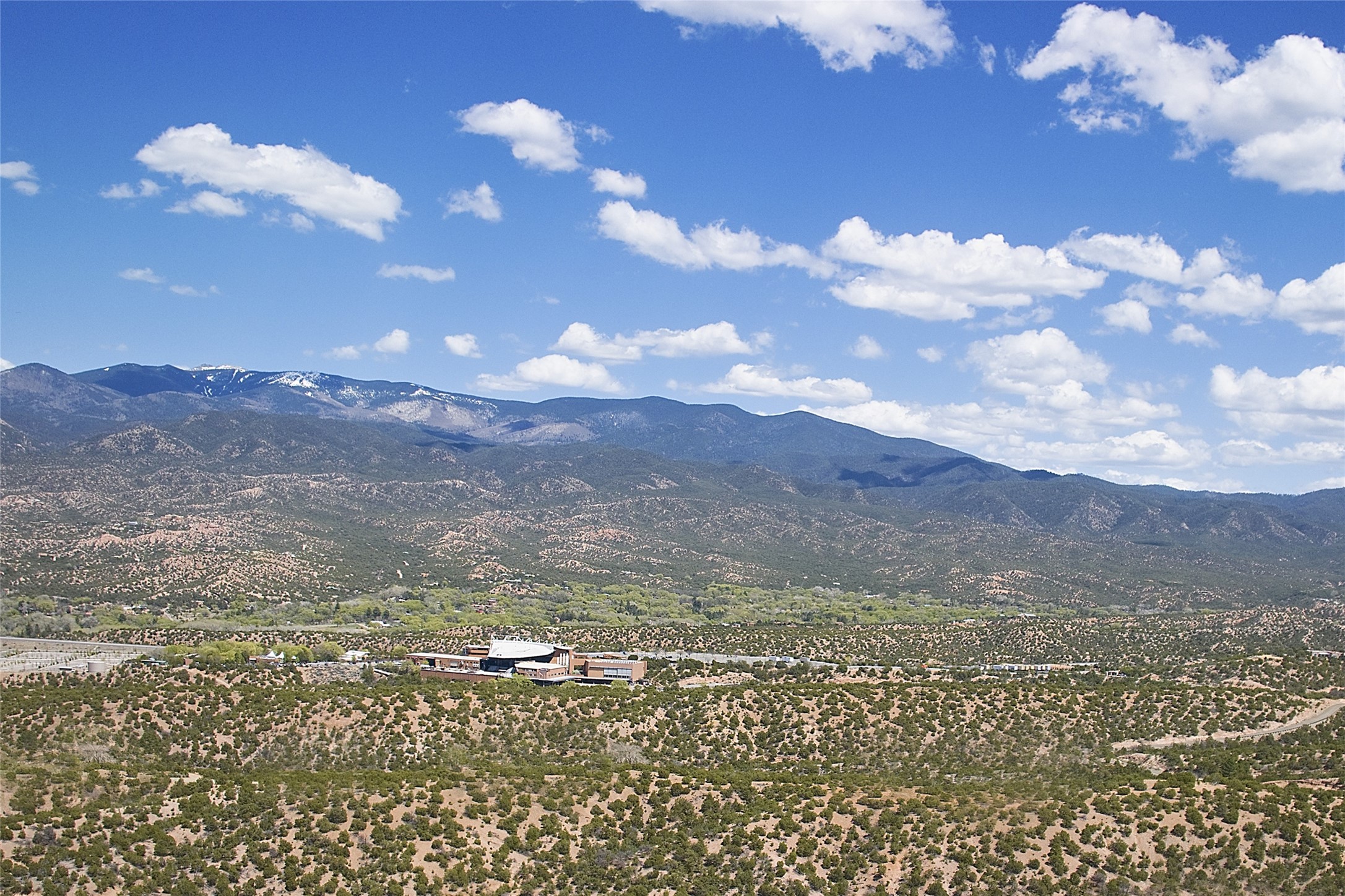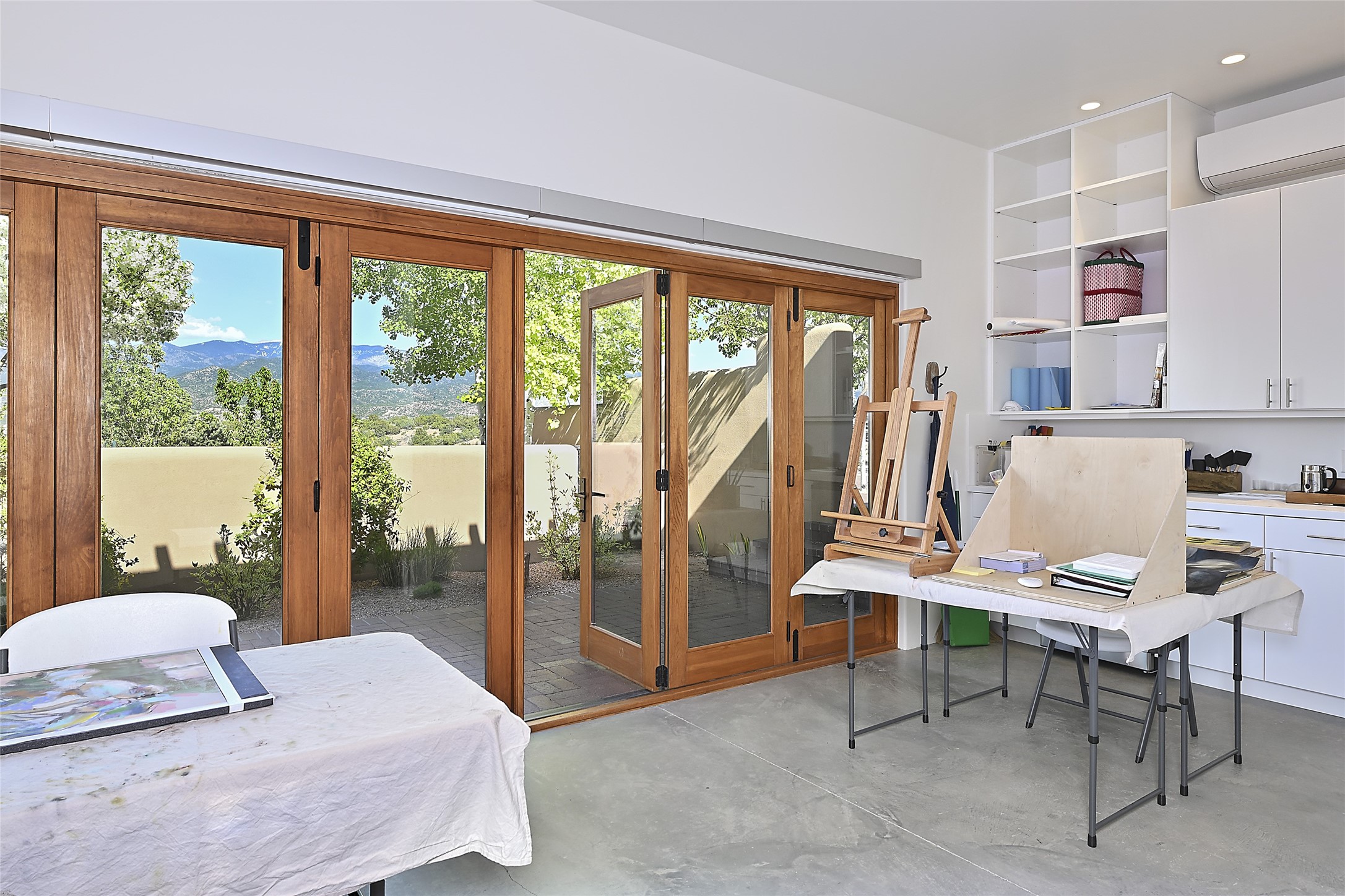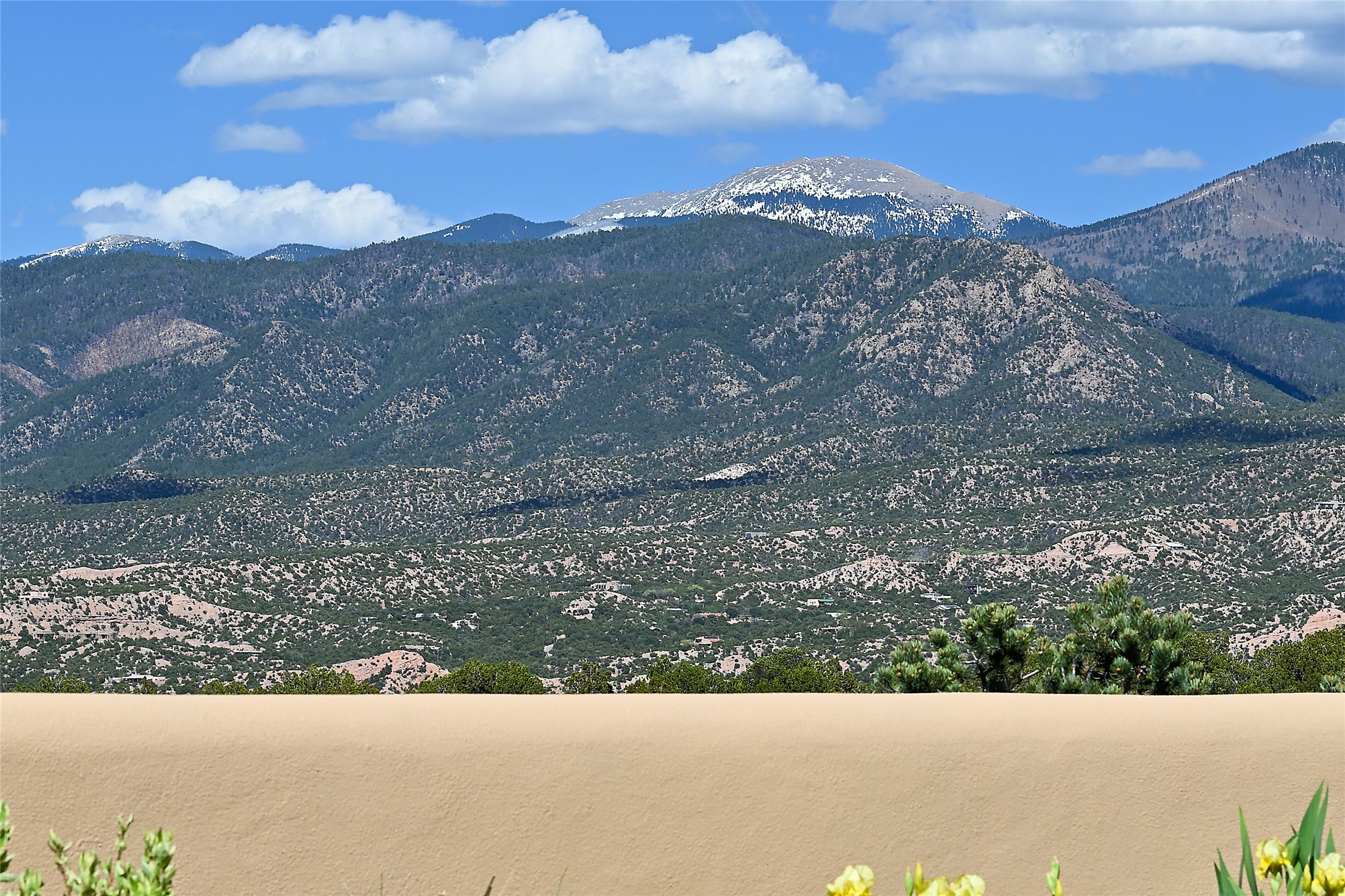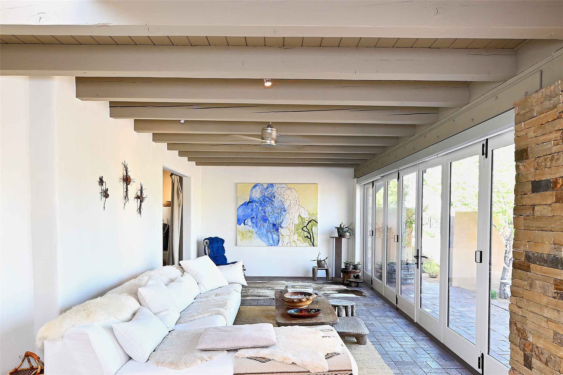 Located in the private gated community of Casas de San Juan--in the foothills adjacent to the renowned Santa Fe Opera and only minutes north of the historic Plaza, Canyon Road, and Museum Hill--this stunning four-bedroom four-bath retreat with new roof in November 2023 enjoys spectacular views from nearly every room. Robert Zachry designed the contemporary condominium, which encourages year-round indoor-outdoor living and is accompanied by a two-car garage. The open concept living, dining, and kitchen area has an easy flow and French doors opening to a brick and flagstone terrace, xeriscaped gardens, and basalt stone fountains. Transom windows and tall ceilings with vigas and beams create a bright, expansive ambience. The chef's kitchen features alder cabinets, superior appliances, and a casual breakfast bar. The gracious primary suite boasts custom closets and French doors to a terrace with panoramic views. One guest bedroom is warmed by a kiva fireplace and is adjoined by a sunroom or living area, while the third bedroom in the main house could also serve as an office, a media room, or a study. Secluded from the main residence is a one-room guest house with a kiva fireplace, a bath, and its own patio. The gated community is securely staffed. New roof in November 2023.