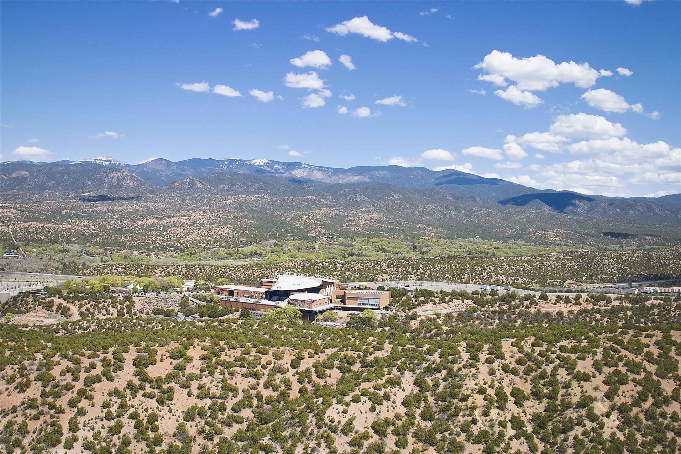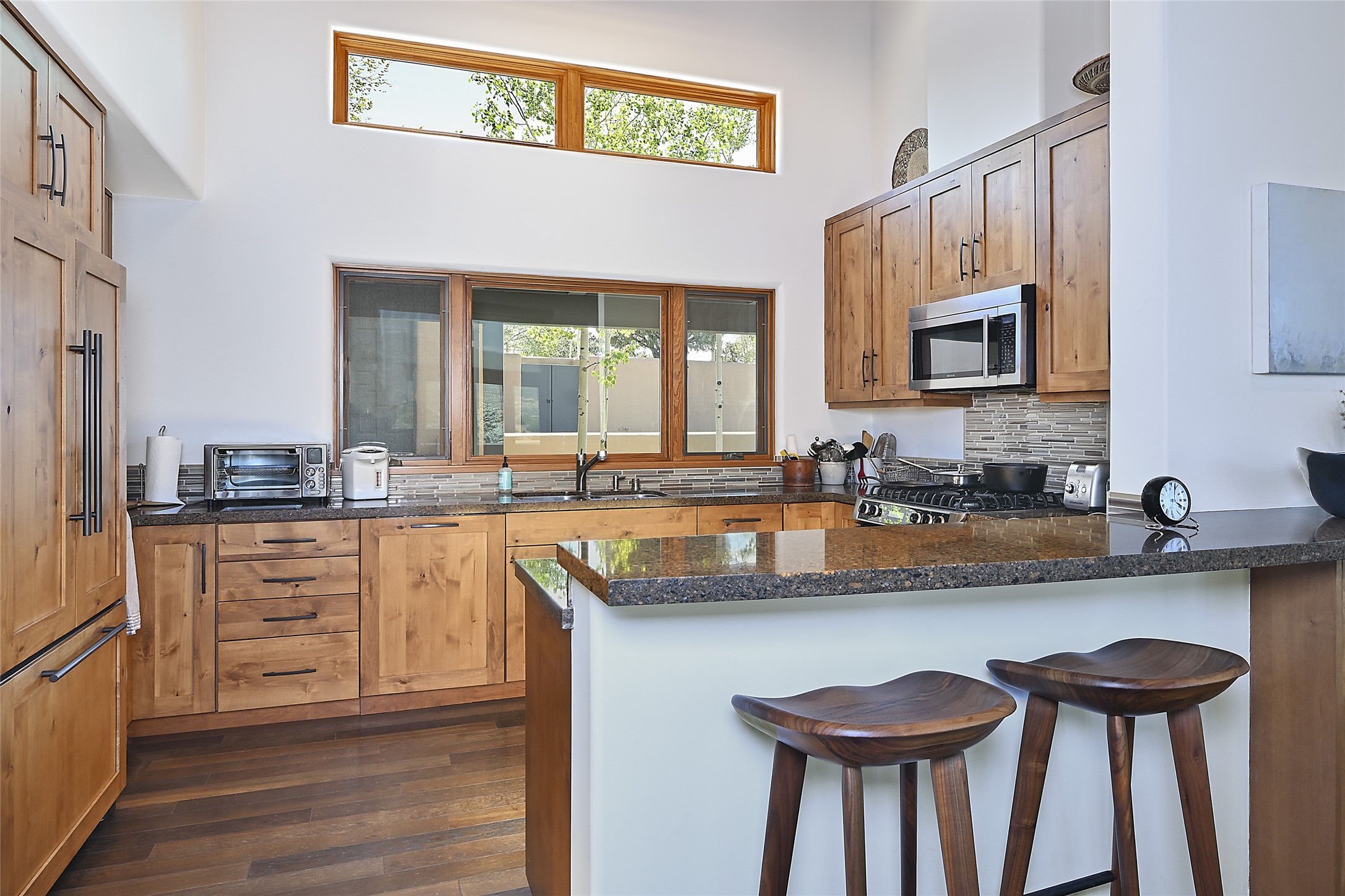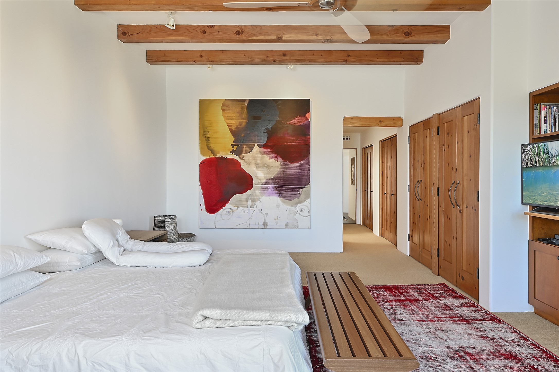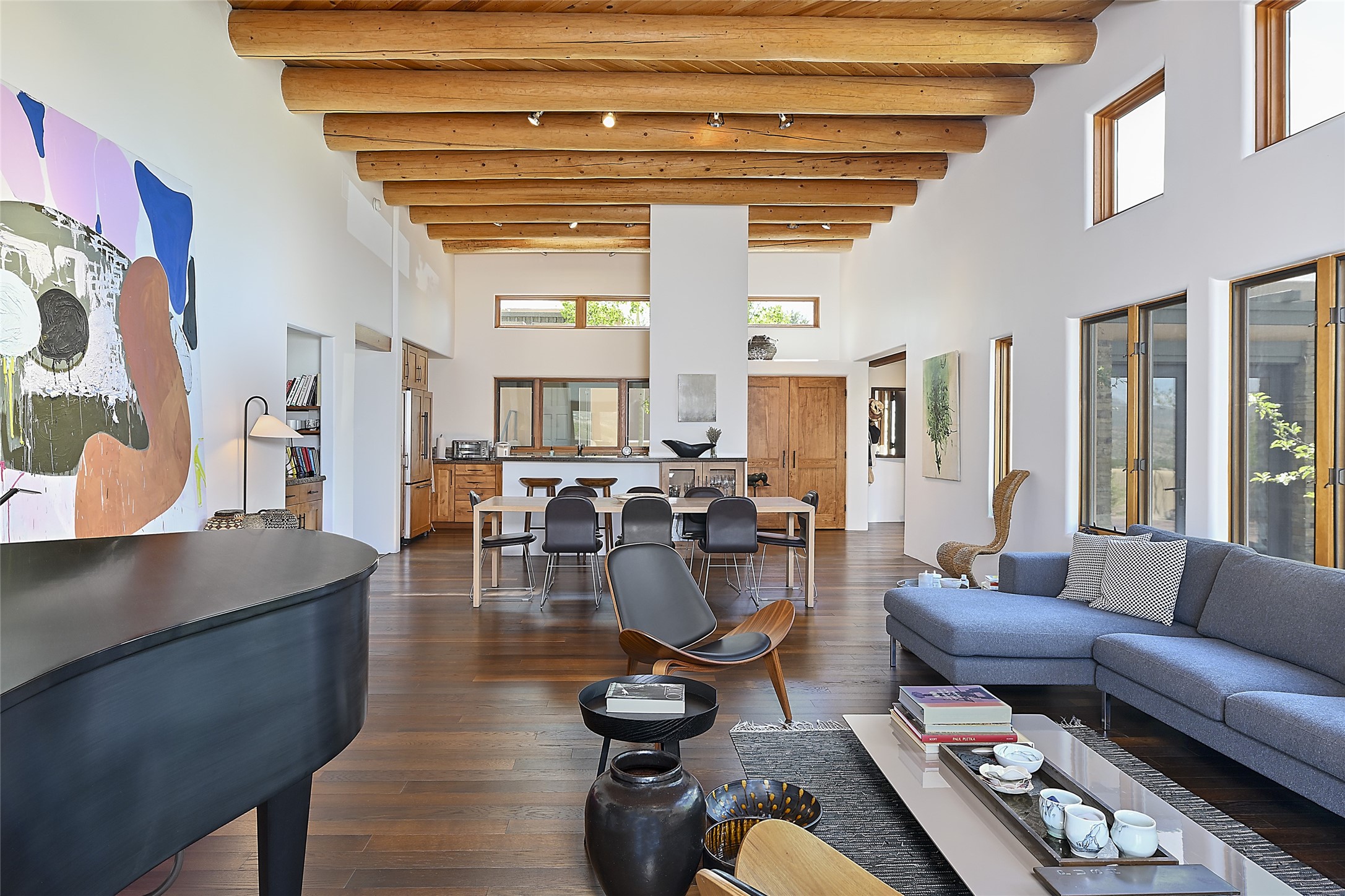 Located in the private gated community of Casas de San Juan--in the foothills adjacent to the renowned Santa Fe Opera and only minutes north of the historic Plaza, Canyon Road, and Museum Hill--this stunning four-bedroom four-bath retreat with new roof in November 2023 enjoys spectacular views from nearly every room. Robert Zachry designed the contemporary condominium, which encourages year-round indoor-outdoor living and is accompanied by a two-car garage. The open concept living, dining, and kitchen area has an easy flow and French doors opening to a brick and flagstone terrace, xeriscaped gardens, and basalt stone fountains. Transom windows and tall ceilings with vigas and beams create a bright, expansive ambience. The chef's kitchen features alder cabinets, superior appliances, and a casual breakfast bar. The gracious primary suite boasts custom closets and French doors to a terrace with panoramic views. One guest bedroom is warmed by a kiva fireplace and is adjoined by a sunroom or living area, while the third bedroom in the main house could also serve as an office, a media room, or a study. Secluded from the main residence is a one-room guest house with a kiva fireplace, a bath, and its own patio. The gated community is securely staffed. New roof in November 2023.