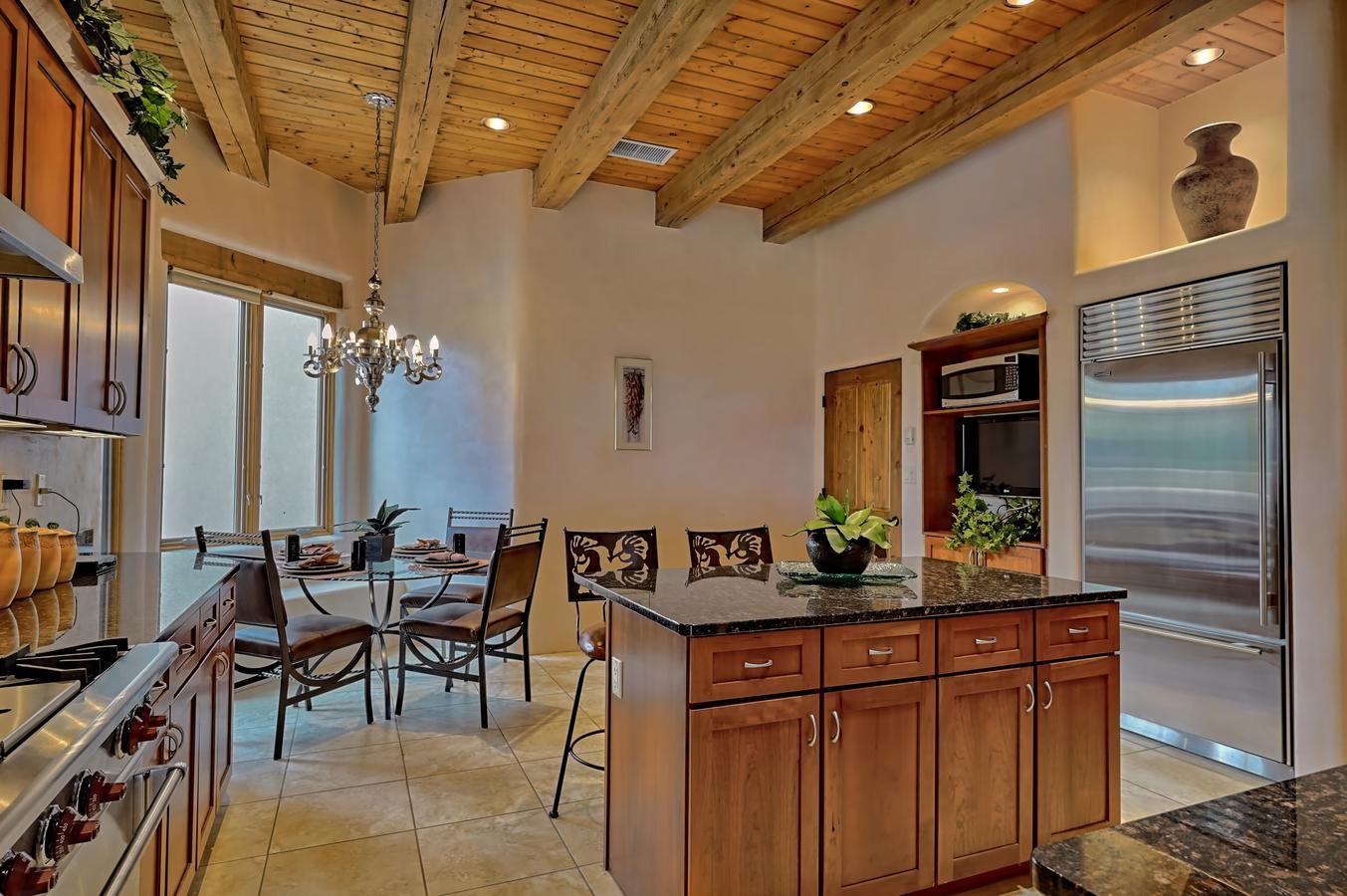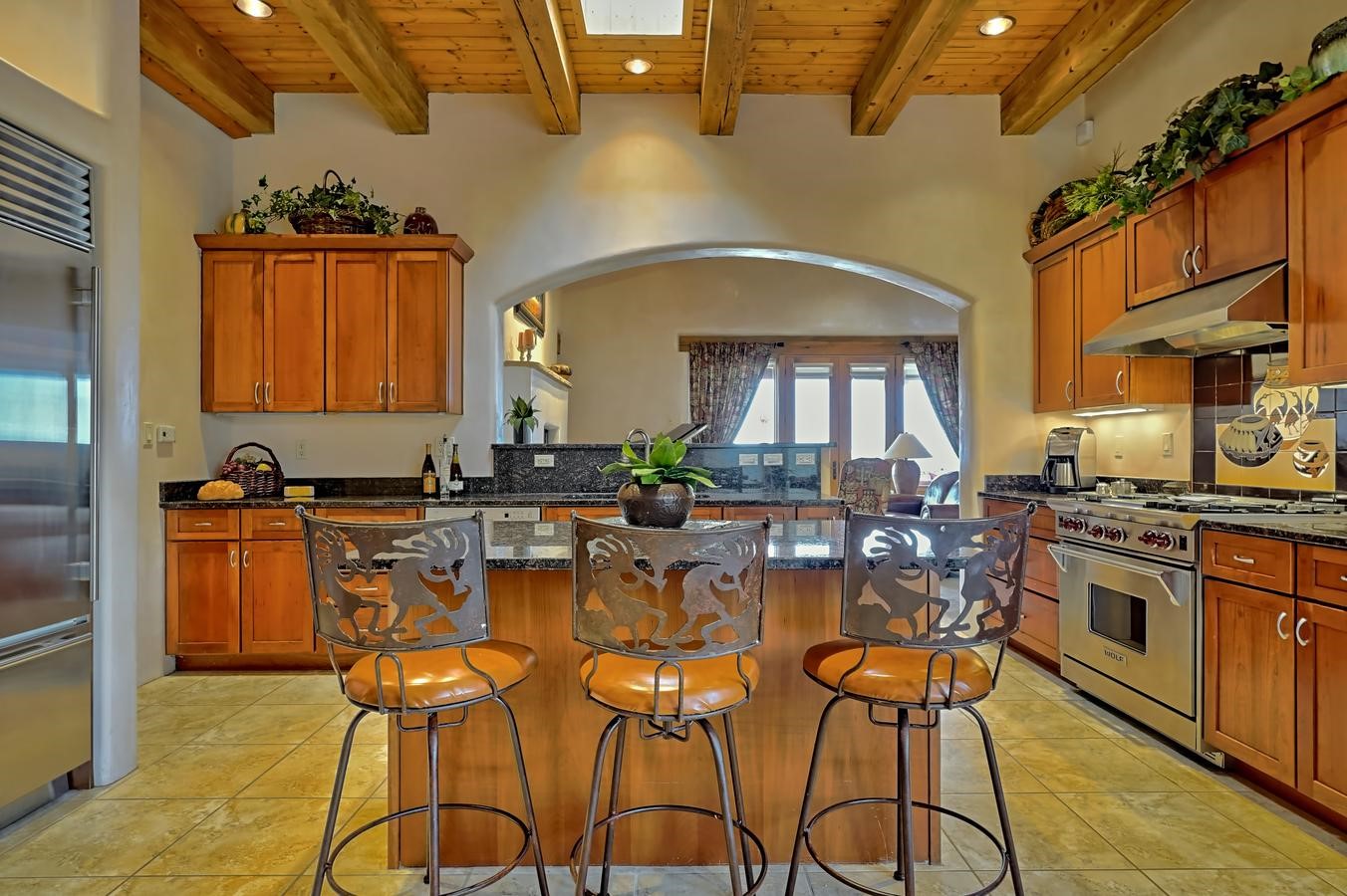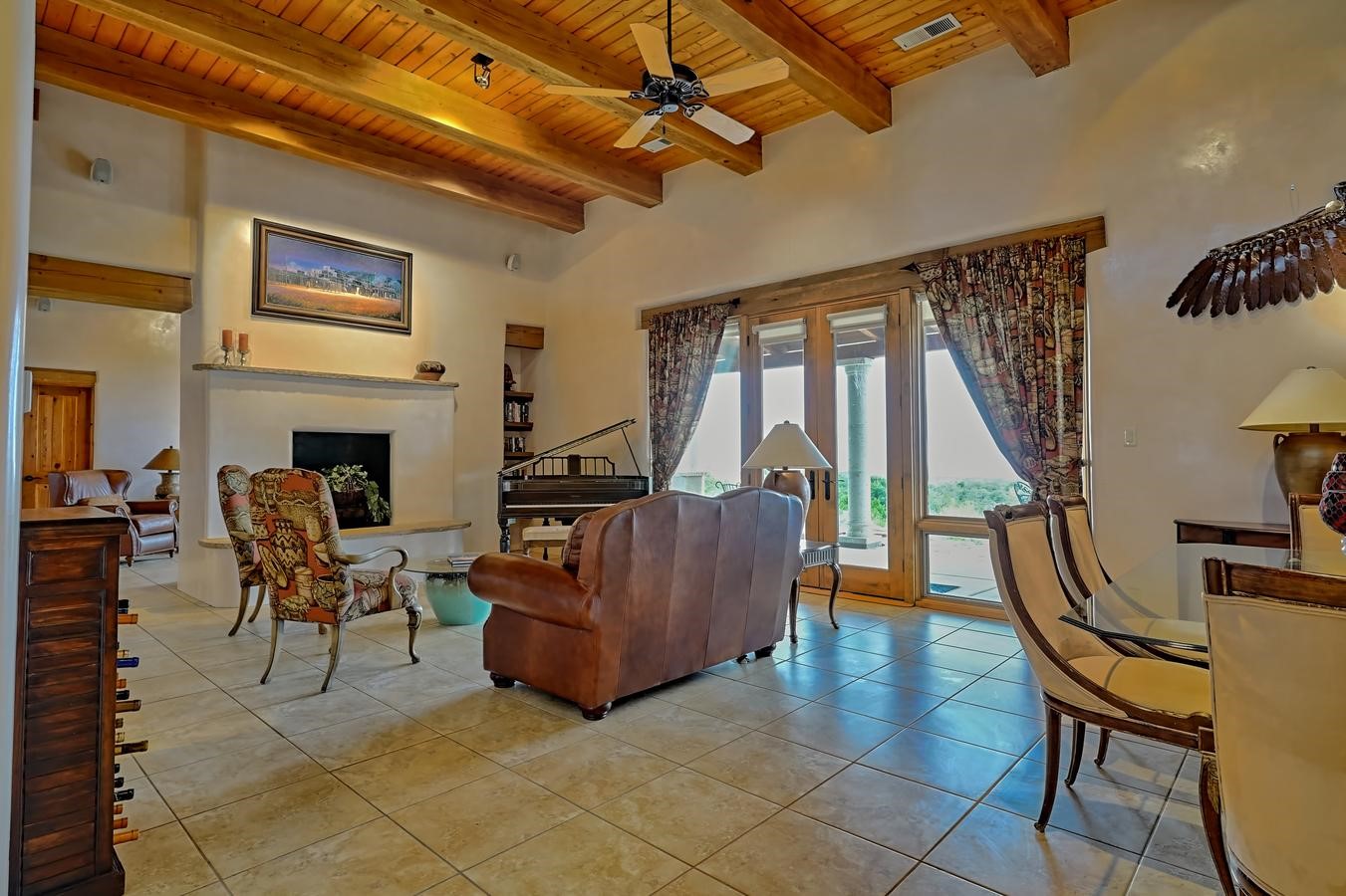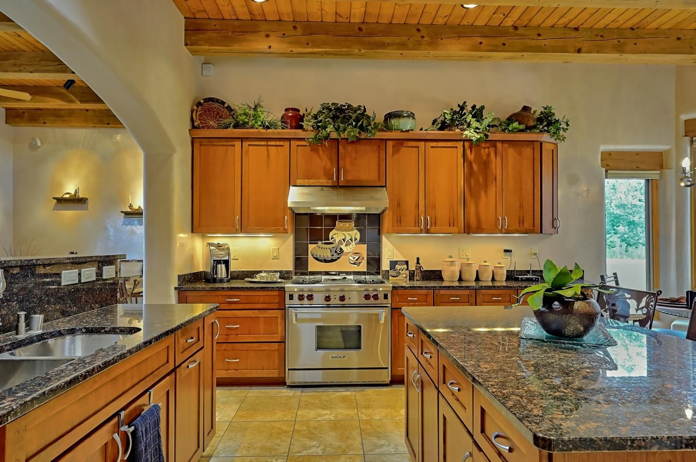 Million Dollar Views from this Exceptional Custom Home nestled on a 5-acre private homesite! Contemporary Southwest Santa Fe Architecture is the Perfect Merger of Santa Fe Charm and Luxurious Amenities! The seller has invested $100,000+ in the last 90 days on Upgrades and Updates! New TPO Roof! 3 New Refrigerated Air/Heat units! Stucco! Plus more! Fabulous Great Room and Elegant Dining Area! Great Room offers a Wall of Windows focused on the View/Plaster Fireplace with Stone Mantle and Banco! Tongue and Groove Beam Ceilings! Plaster Walls! Gourmet Kitchen Boasts Stainless Steel Luxury Appliances! Wolf Gas Range, Subzero Refrigerator/Freezer, and Bosch Dishwasher! Abundant Cherry look Cabinets and Granite Counters! Casual Dining area and Island Breakfast Bar! Walk In Pantry! Dual Living areas, with a Flexible Space Library/TV room/Home Office or Studio area separating the Great Room and the Guest Bedroom Suites! Relax by the Fireplace and enjoy your favorite Book!Remarkable Owner's Retreat featuring a Romantic Fireplace! Luxurious Spa spa-style bath w Vessel Sinks/Kohler Jet Tub/Decorator Tile Walk-In Shower! French Doors to Courtyard with a Relaxing Water Feature! Custom Walk-In Closet! Two Spacious Bedroom Suites on the opposite side of the Home! Front Bedroom offers Private Exterior Entrance and Courtyard! Upgraded Full Hall Bath has a Jet Tub and Separate Shower! Powder Bath with Vessel Sink! Pella Wood Windows! Designer Lighting Throughout! No Carpet! Bask In the NM Sunshine! Spacious Covered and Open Flagstone Patio flows from the Great Room and focuses on the Incredible Views! Outdoor Wolf BBQ and Fireplace! Multiple Private Courtyards! Extensive Stucco Privacy Walls and Custom Wood Gates! Radiant Floor Heat! Three Refrigerated Air CFA Heat Combo Units! New TPO Roof in Process! Truly a Distinctive Property! Ideally Located, only 10-12 Minutes to the Plaza! Close to Hiking and Open Space! One mile to the Private El Gancho Swim and Tennis Club! One mile to Dinner at Harry's Roadhouse or The Bourbon Grill!