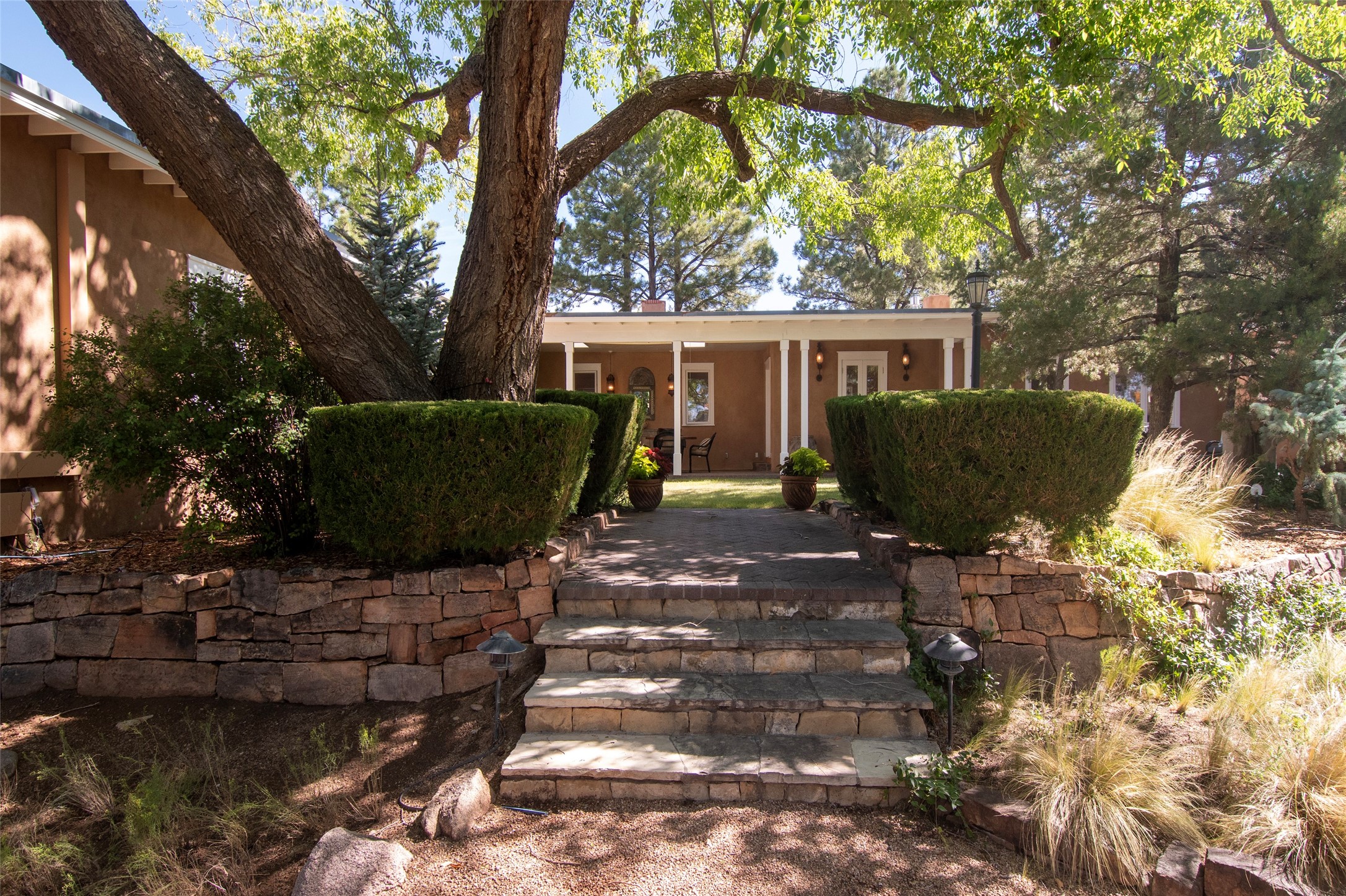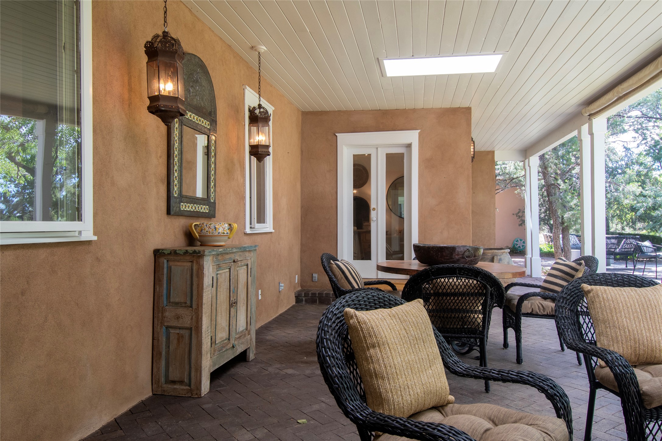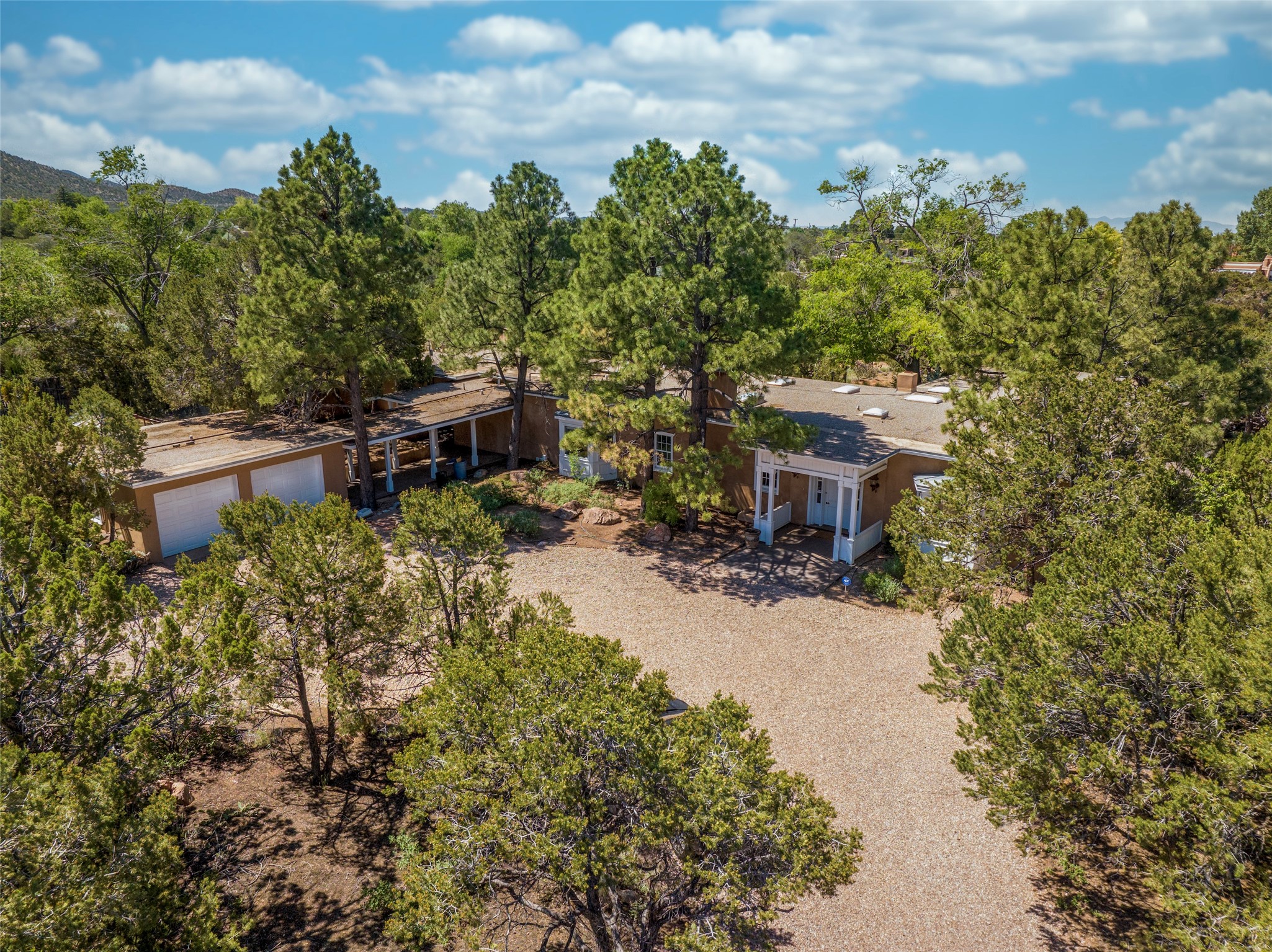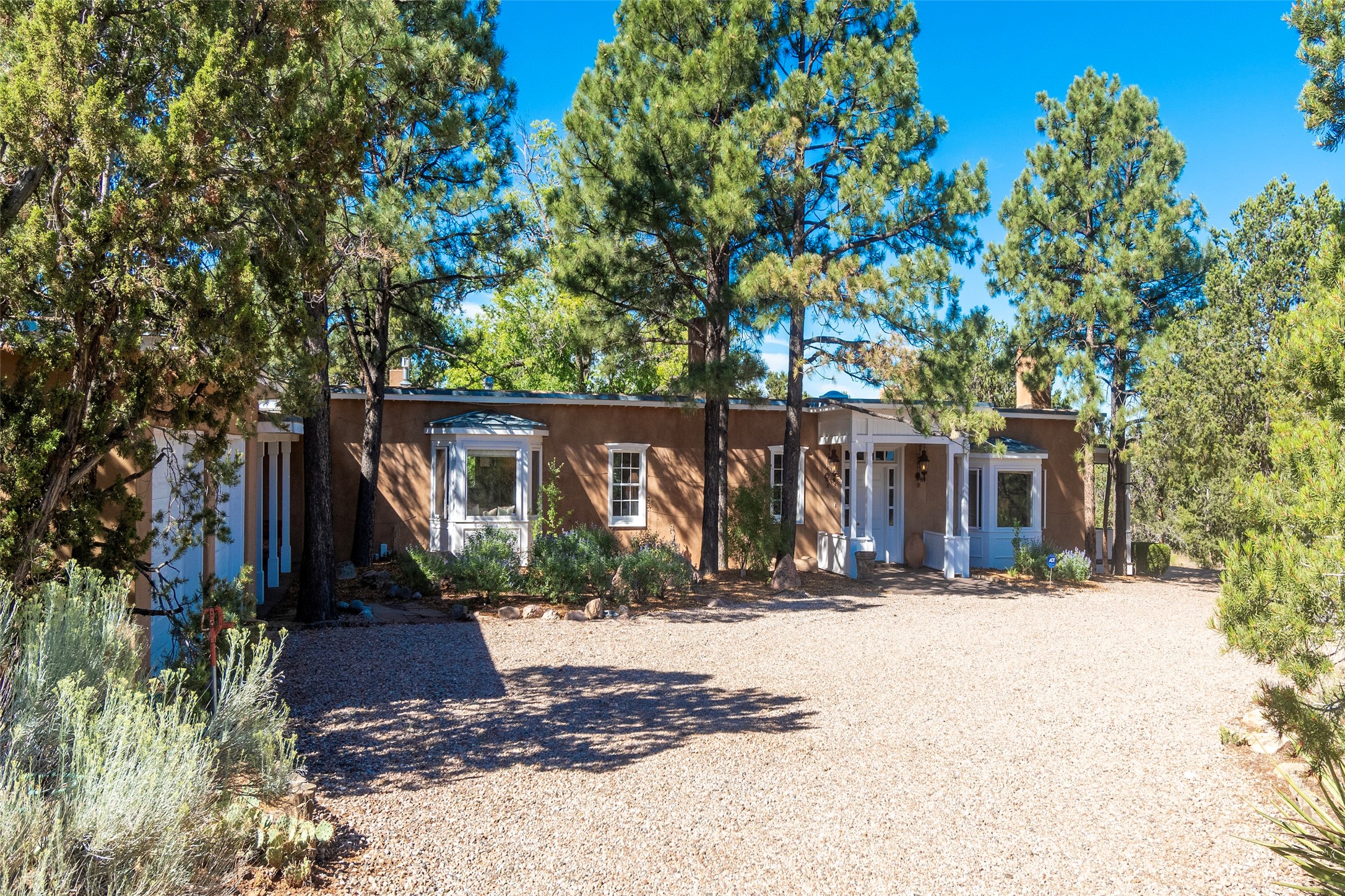 Nestled among mature trees, this classic New Mexico Territorial-style home rests on 2.788 acres of beautiful land with stellar views of Sangre de Cristo, Sandia and Ortiz Mountains. In the 3,600 sq. ft. main house a long, lovely, bricked entry hallway connects many of the rooms. Here there are 3 bedrooms, 4 bathrooms, separate office, living room, formal dining room, and a good-sized eat-in kitchen. The quiet, primary bedroom suite has a media room, full walk-in closet and private portal. There are 6 fireplaces, including one on a wide portal off the living room, so nearly every room is warm and inviting on cold winter nights. There are several portals to enjoy the views and the great Northern New Mexico weather. The guest house (753 sq. ft.) is a one bedroom, one bath home with a living/dining room, separate kitchen, and private patio. A covered brick walkway leads from the two houses to a 2-car garage. Nearby, a 1,059 sq. ft. detached garage/studio stands alone just waiting to make your dreams come true as a studio, shop, or an antique car showroom. Privately located in the historic Eastside of Santa Fe this home is just minutes from hiking trails, Museum Hill, Canyon Road and the Downtown Plaza.
