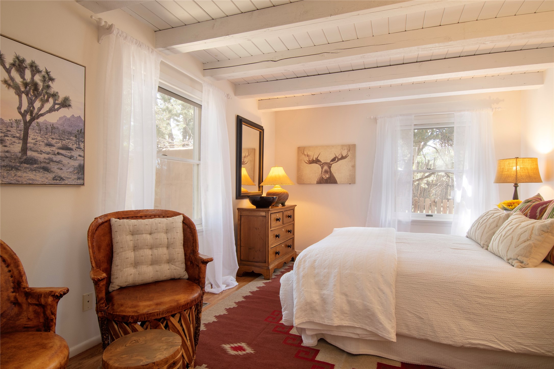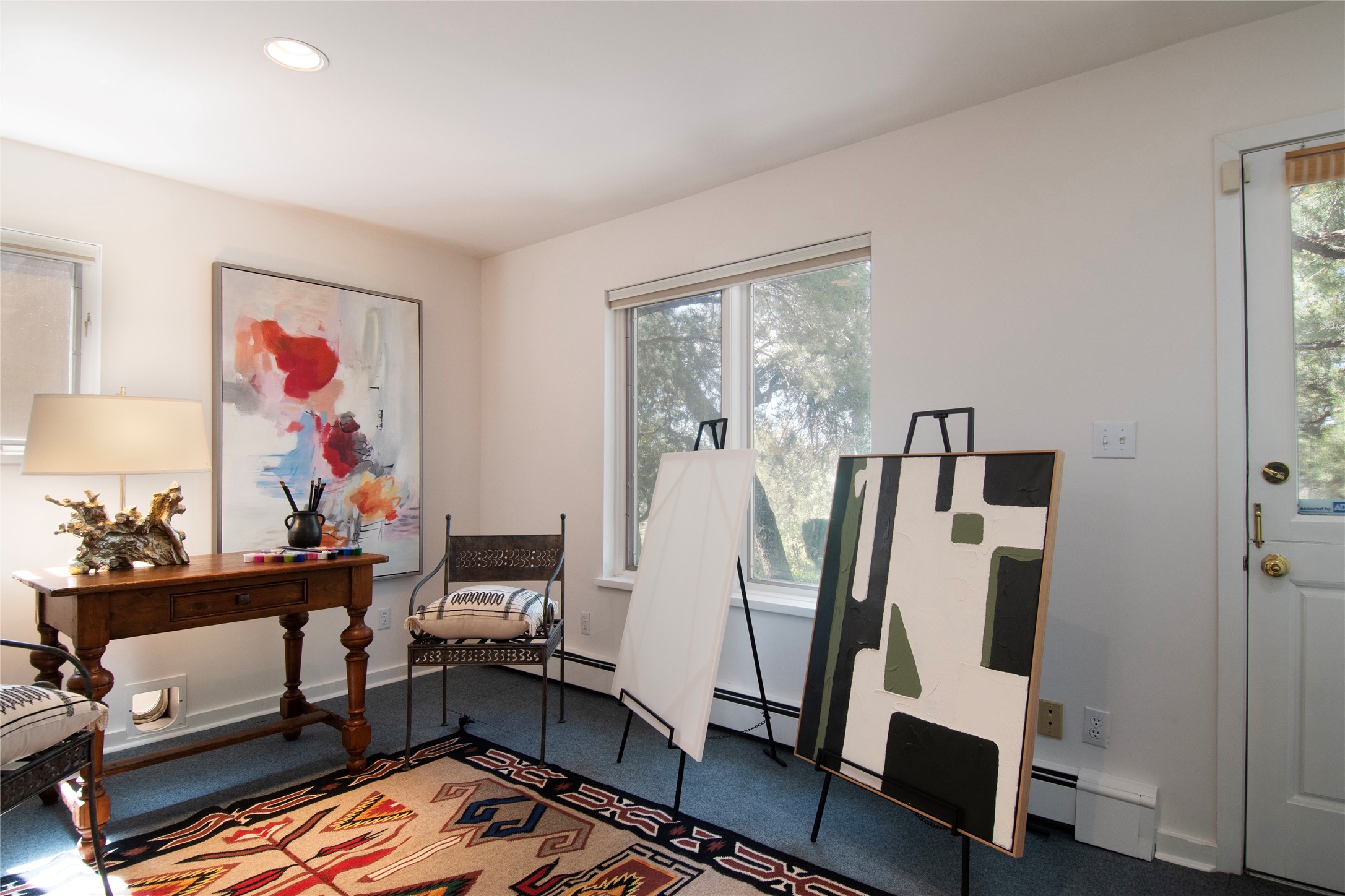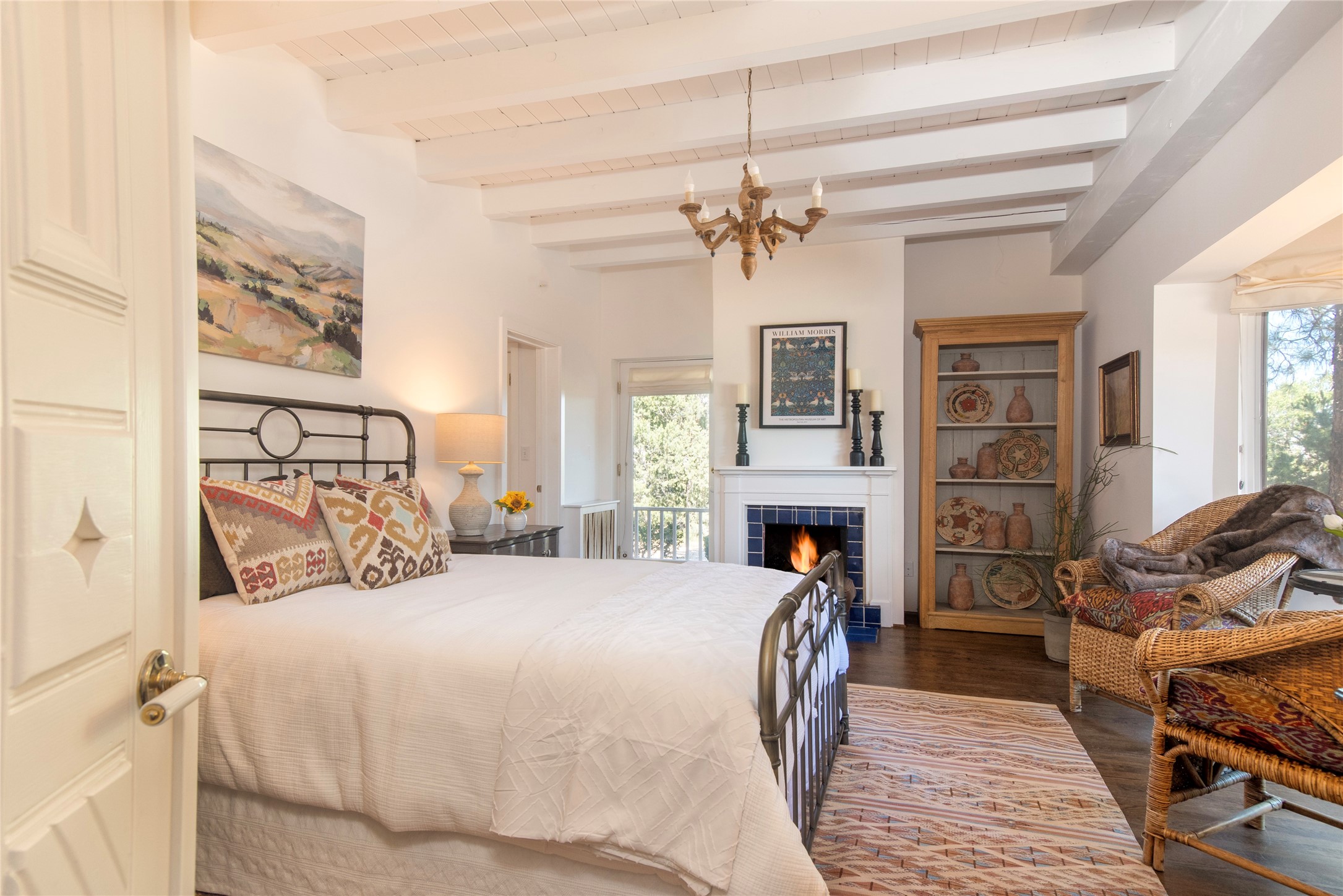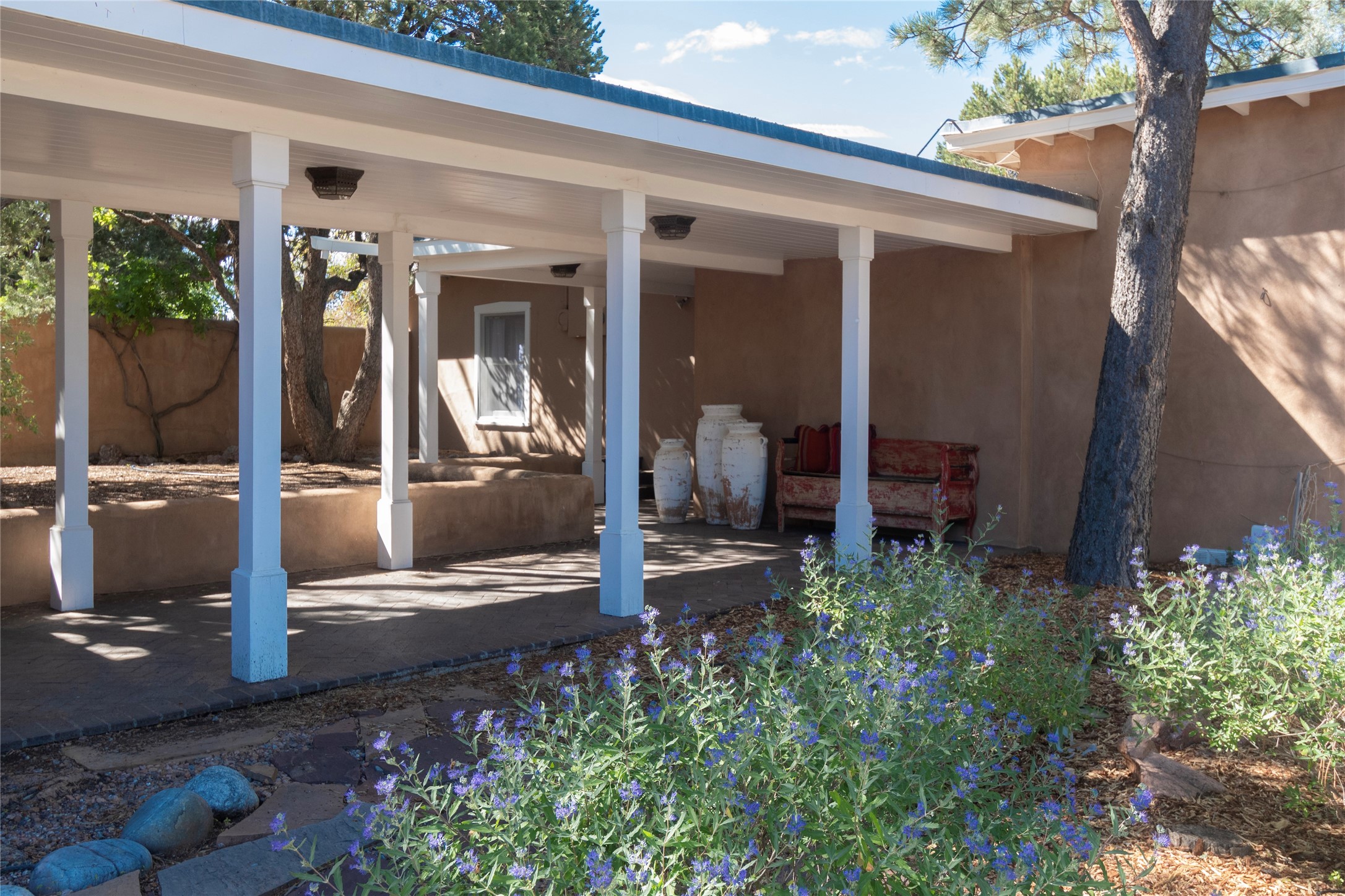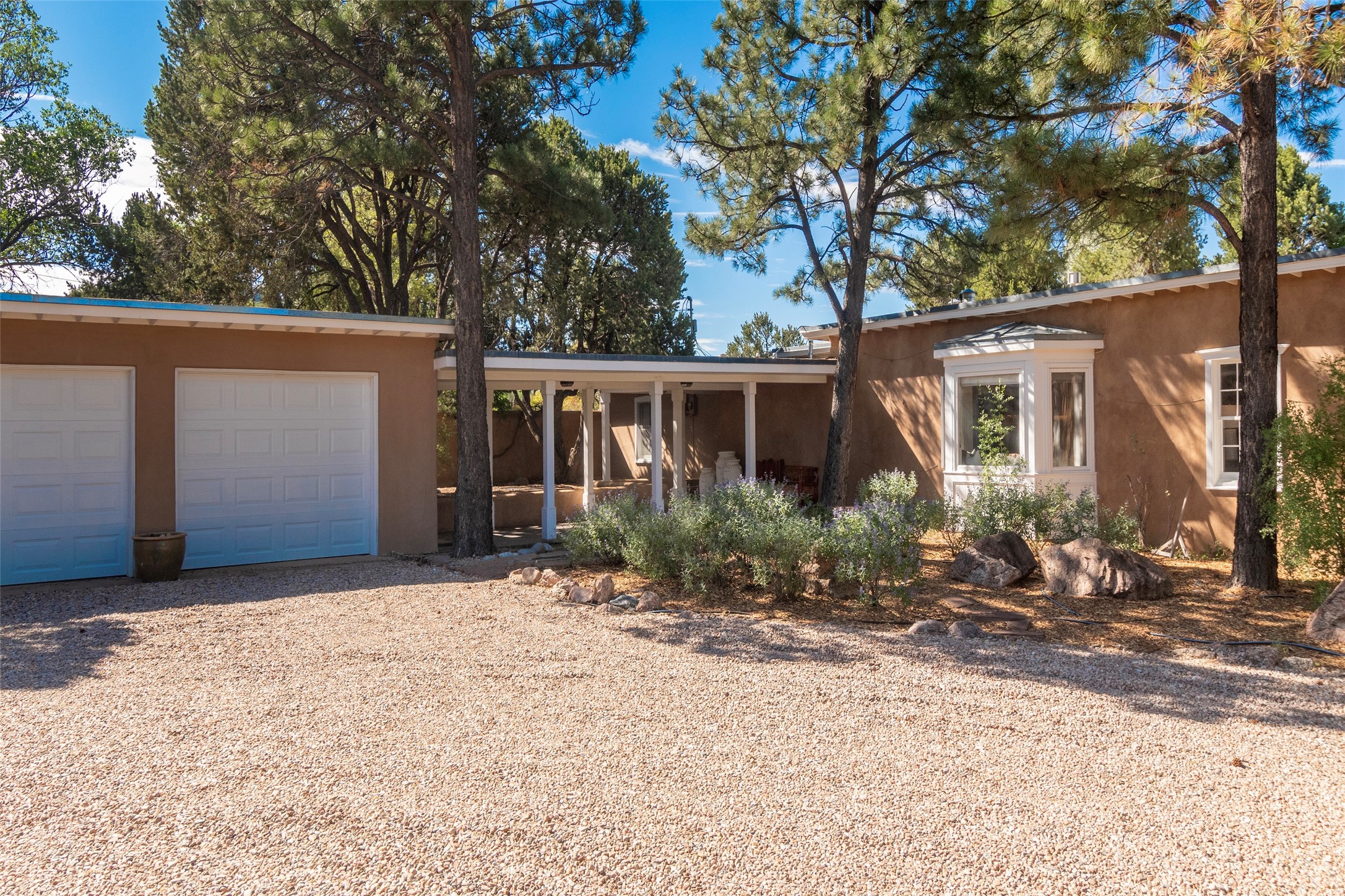 Nestled among mature trees, this classic New Mexico Territorial-style home rests on 2.788 acres of beautiful land with stellar views of Sangre de Cristo, Sandia and Ortiz Mountains. In the 3,600 sq. ft. main house a long, lovely, bricked entry hallway connects many of the rooms. Here there are 3 bedrooms, 4 bathrooms, separate office, living room, formal dining room, and a good-sized eat-in kitchen. The quiet, primary bedroom suite has a media room, full walk-in closet and private portal. There are 6 fireplaces, including one on a wide portal off the living room, so nearly every room is warm and inviting on cold winter nights. There are several portals to enjoy the views and the great Northern New Mexico weather. The guest house (753 sq. ft.) is a one bedroom, one bath home with a living/dining room, separate kitchen, and private patio. A covered brick walkway leads from the two houses to a 2-car garage. Nearby, a 1,059 sq. ft. detached garage/studio stands alone just waiting to make your dreams come true as a studio, shop, or an antique car showroom. Privately located in the historic Eastside of Santa Fe this home is just minutes from hiking trails, Museum Hill, Canyon Road and the Downtown Plaza.